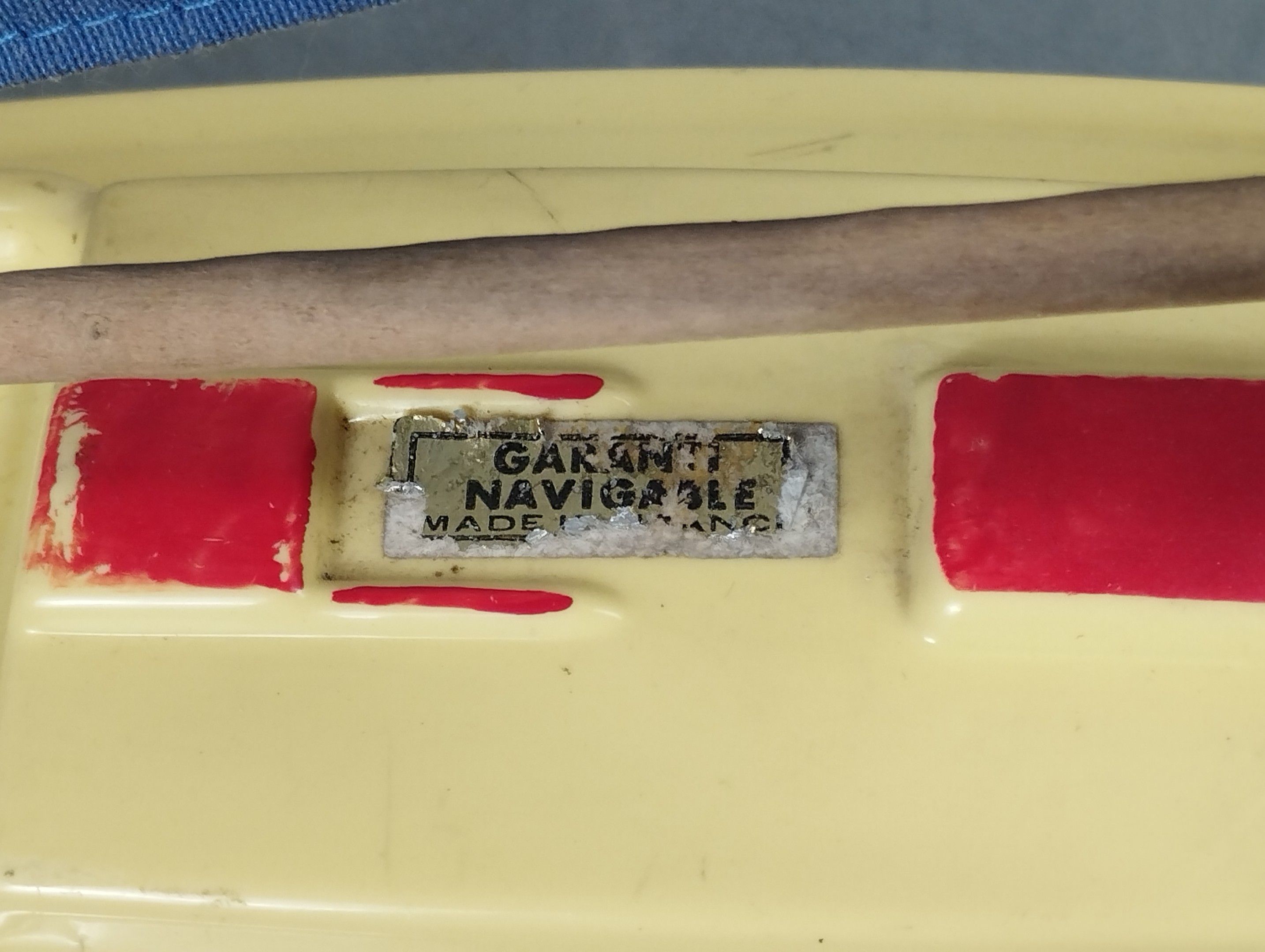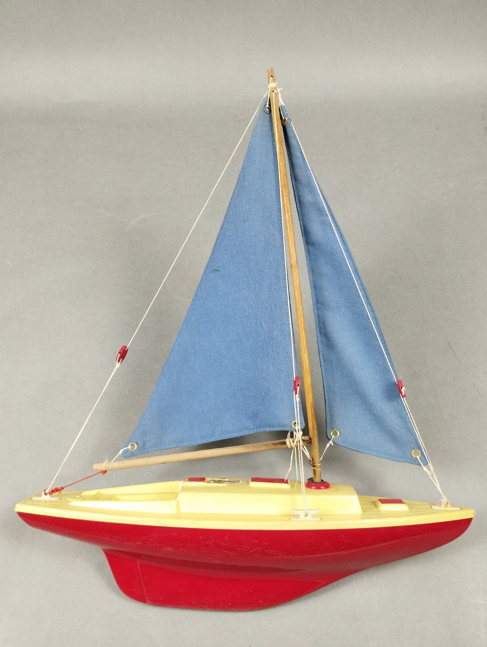 Small dock sailboat "made in France", red plastic hull, blue sails. Length = 40 cm.