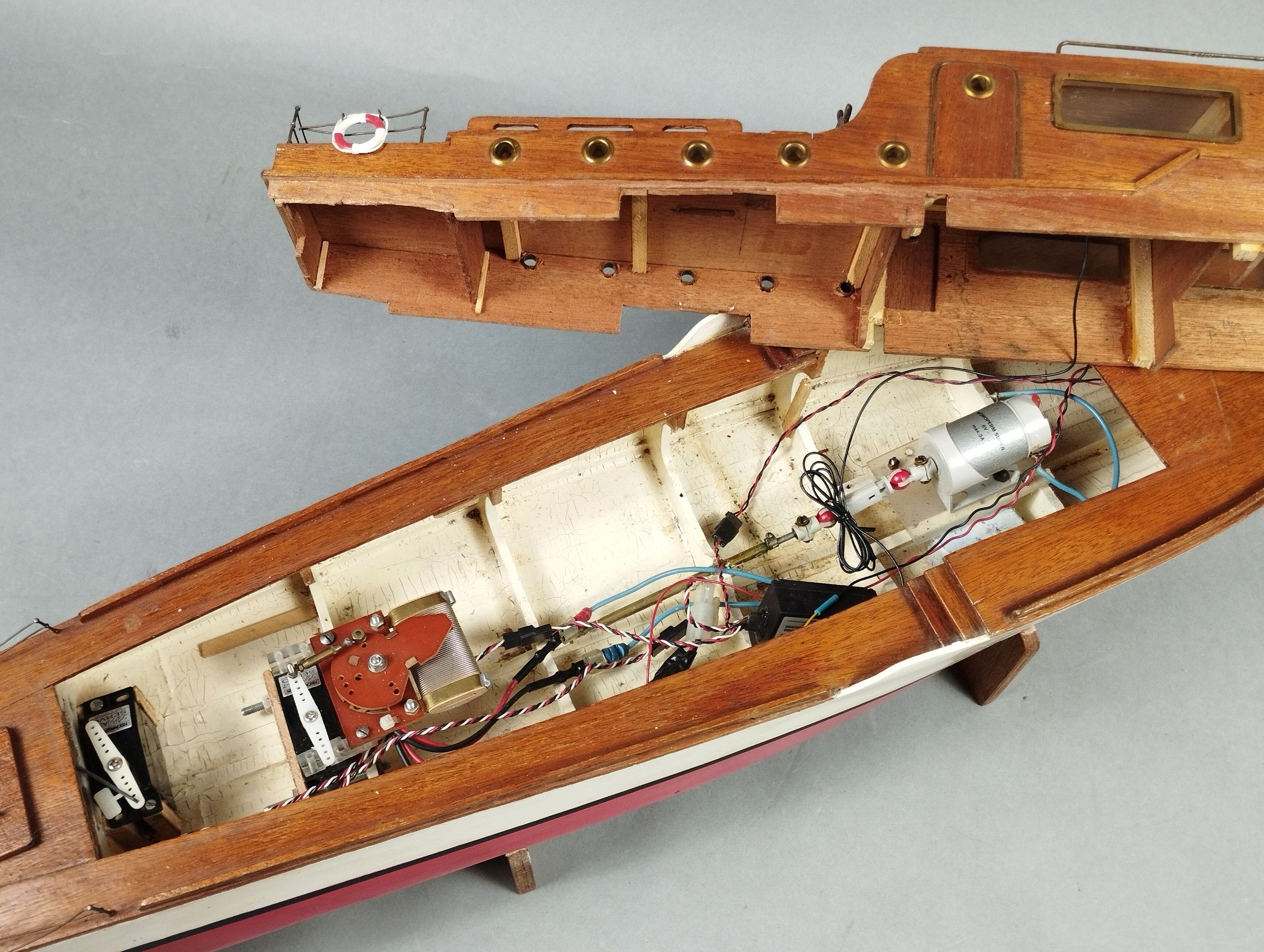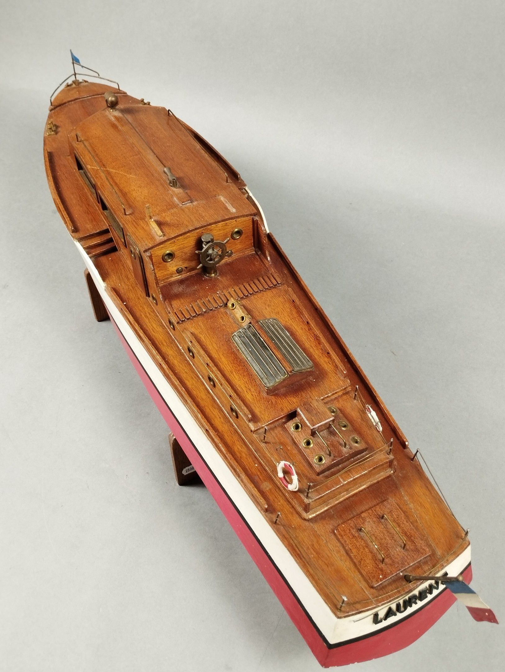 Laurent" radio-controlled speedboat, complete with remote control. In working order. Minor damage to the rail and a small wooden piece missing from the roof. L. = 72 cm.