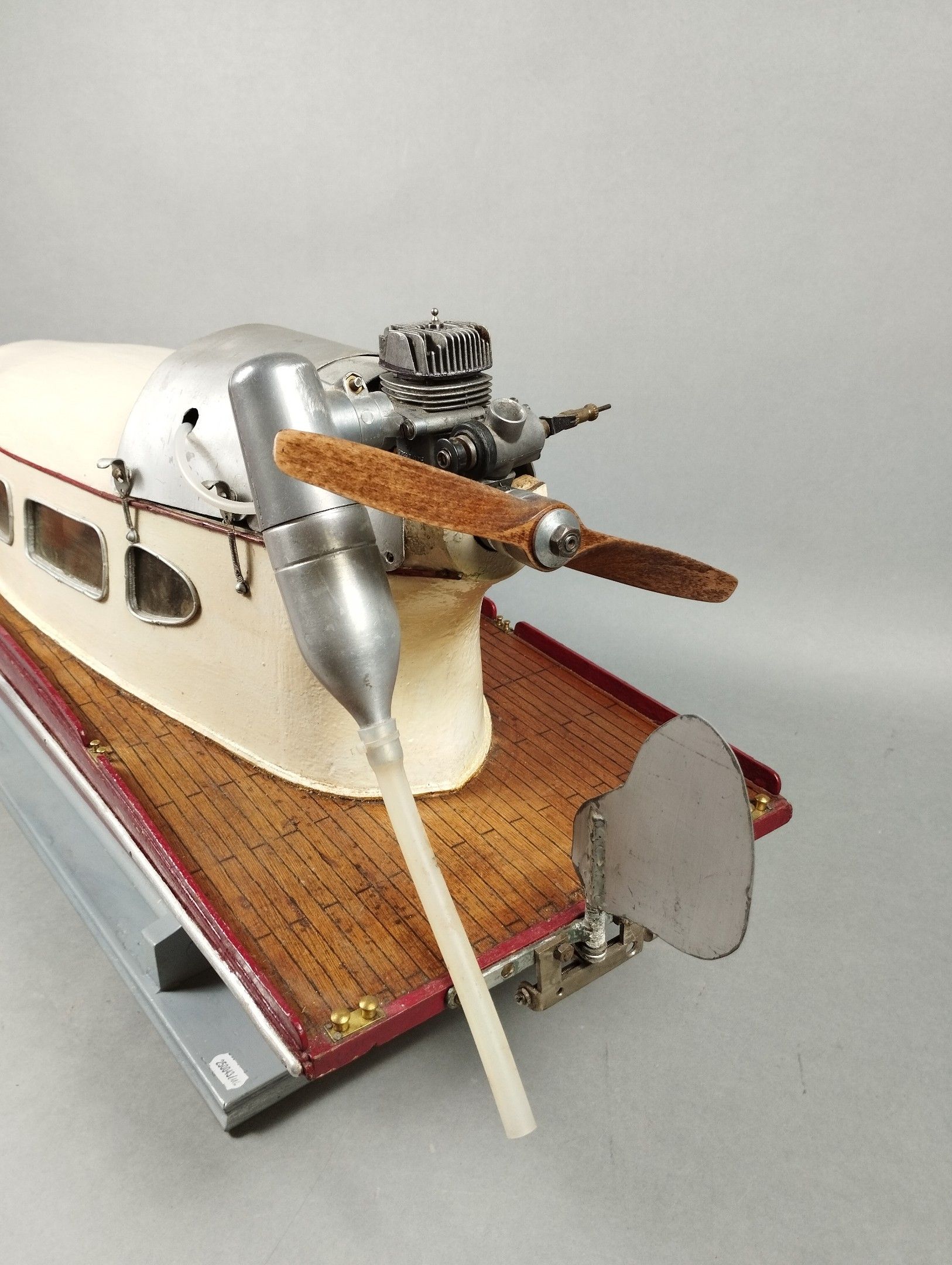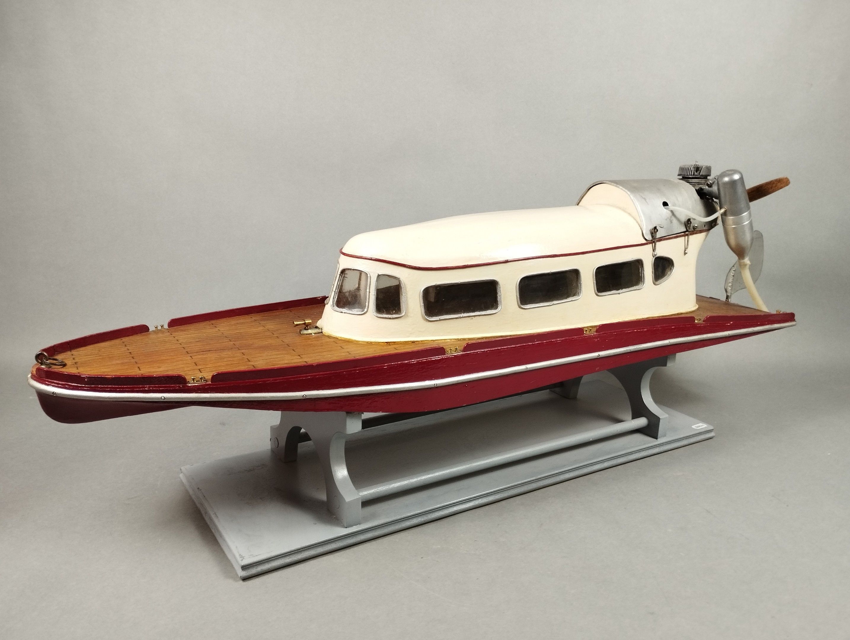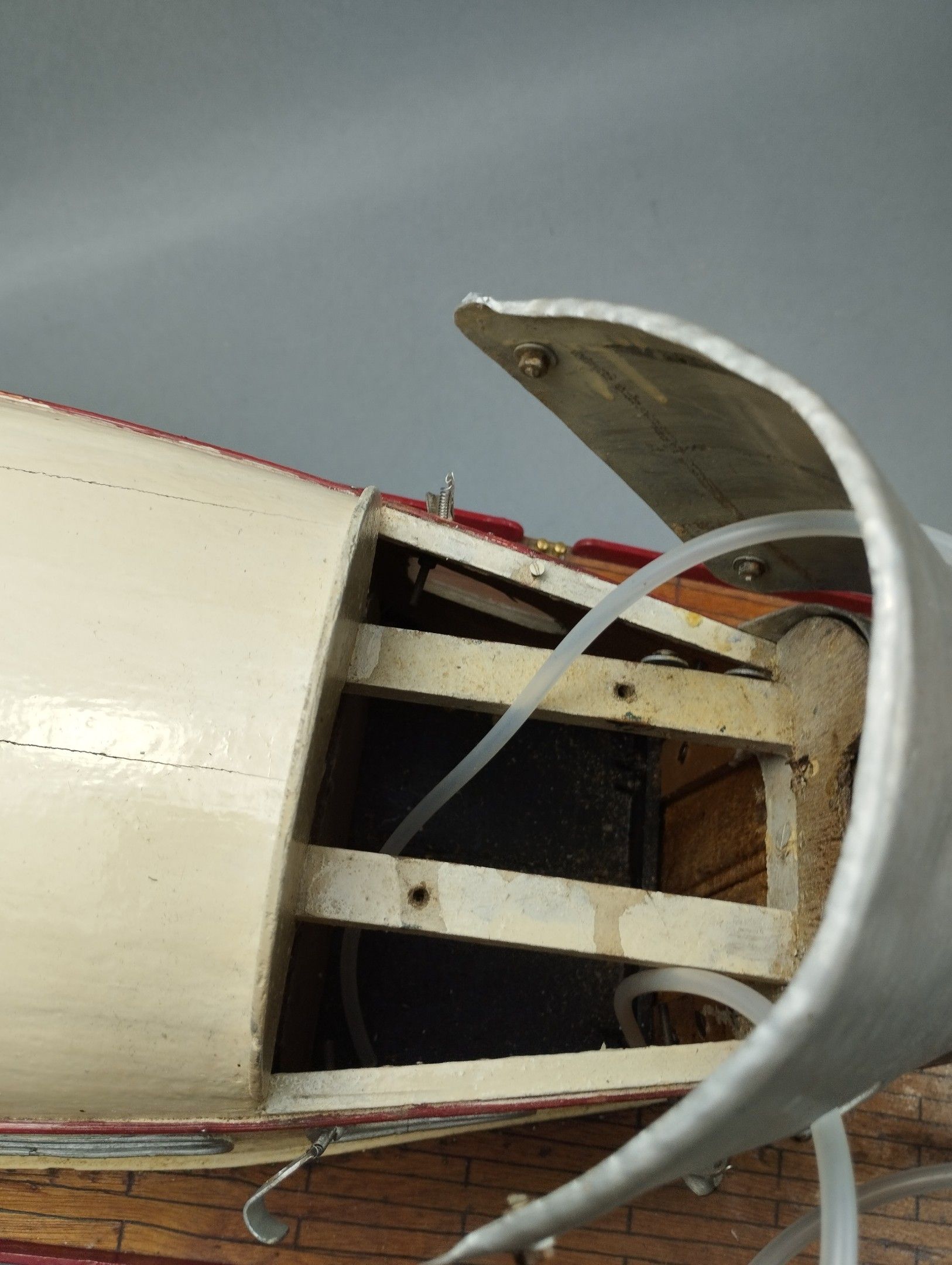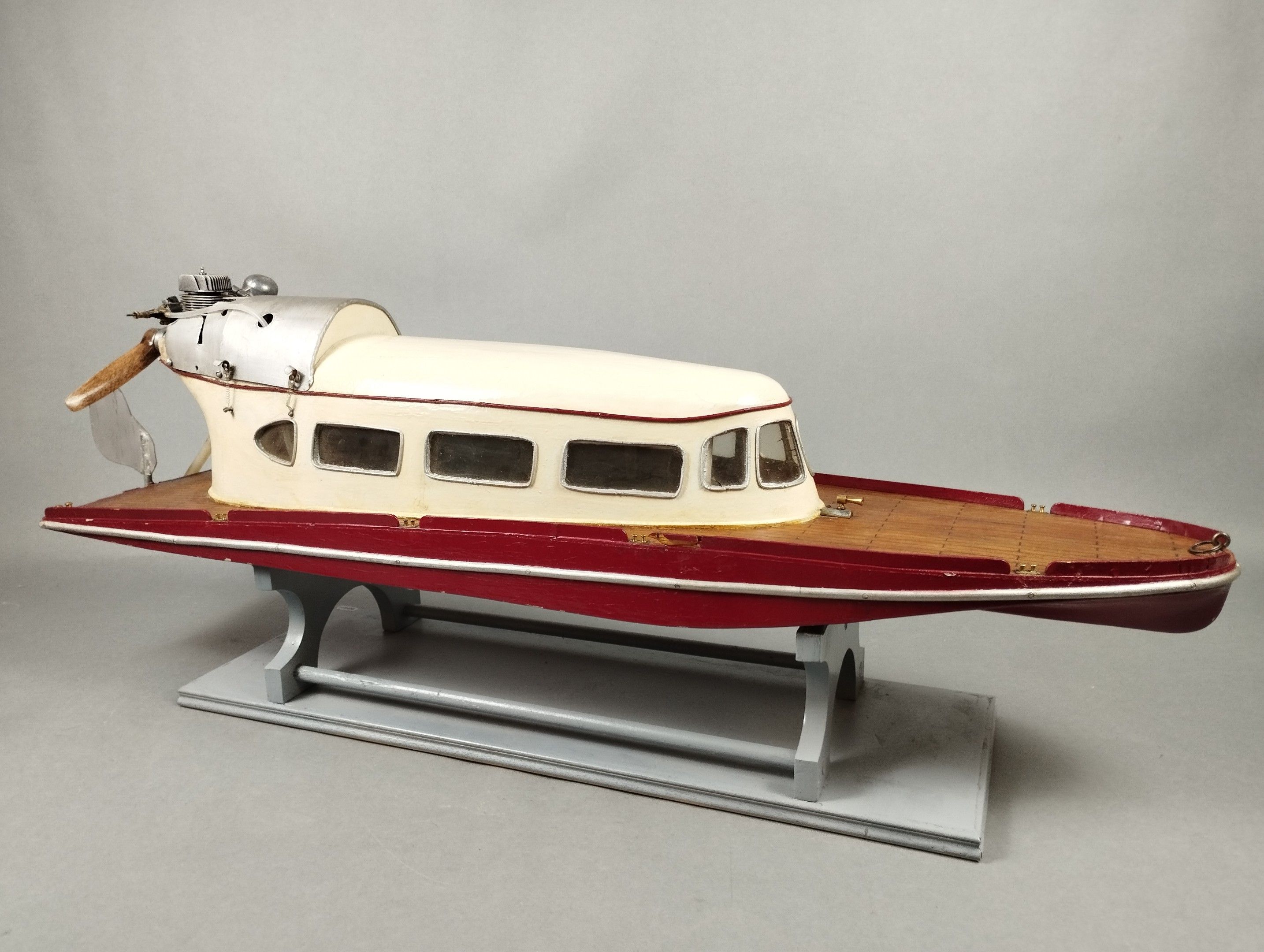 Everglade-style flat-bottomed hovercraft, internal combustion engine with small compression. Two screws missing from the cylinder head. L. = 110 cm. Not common.