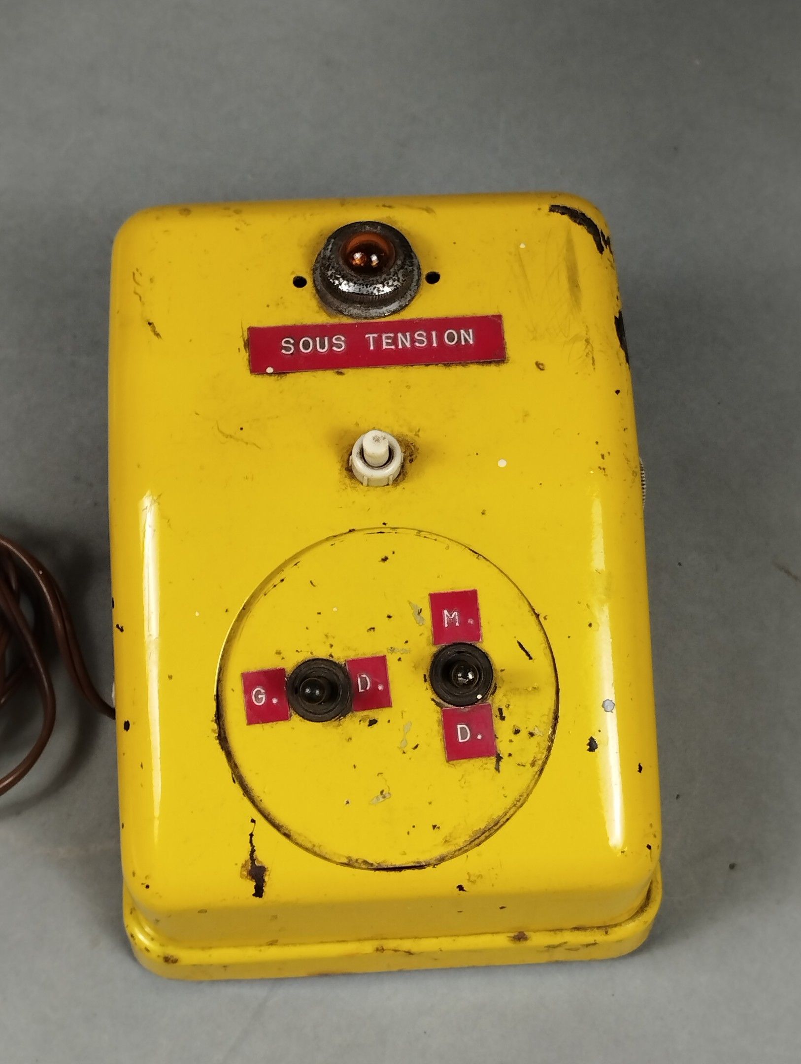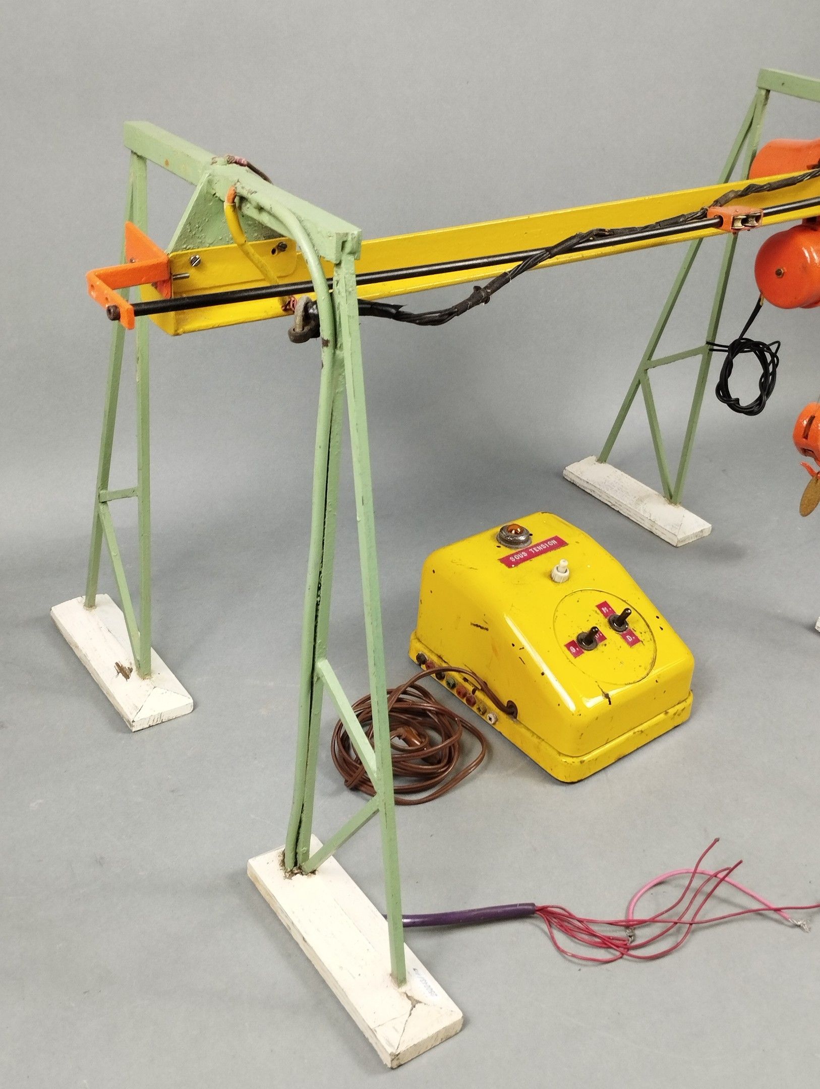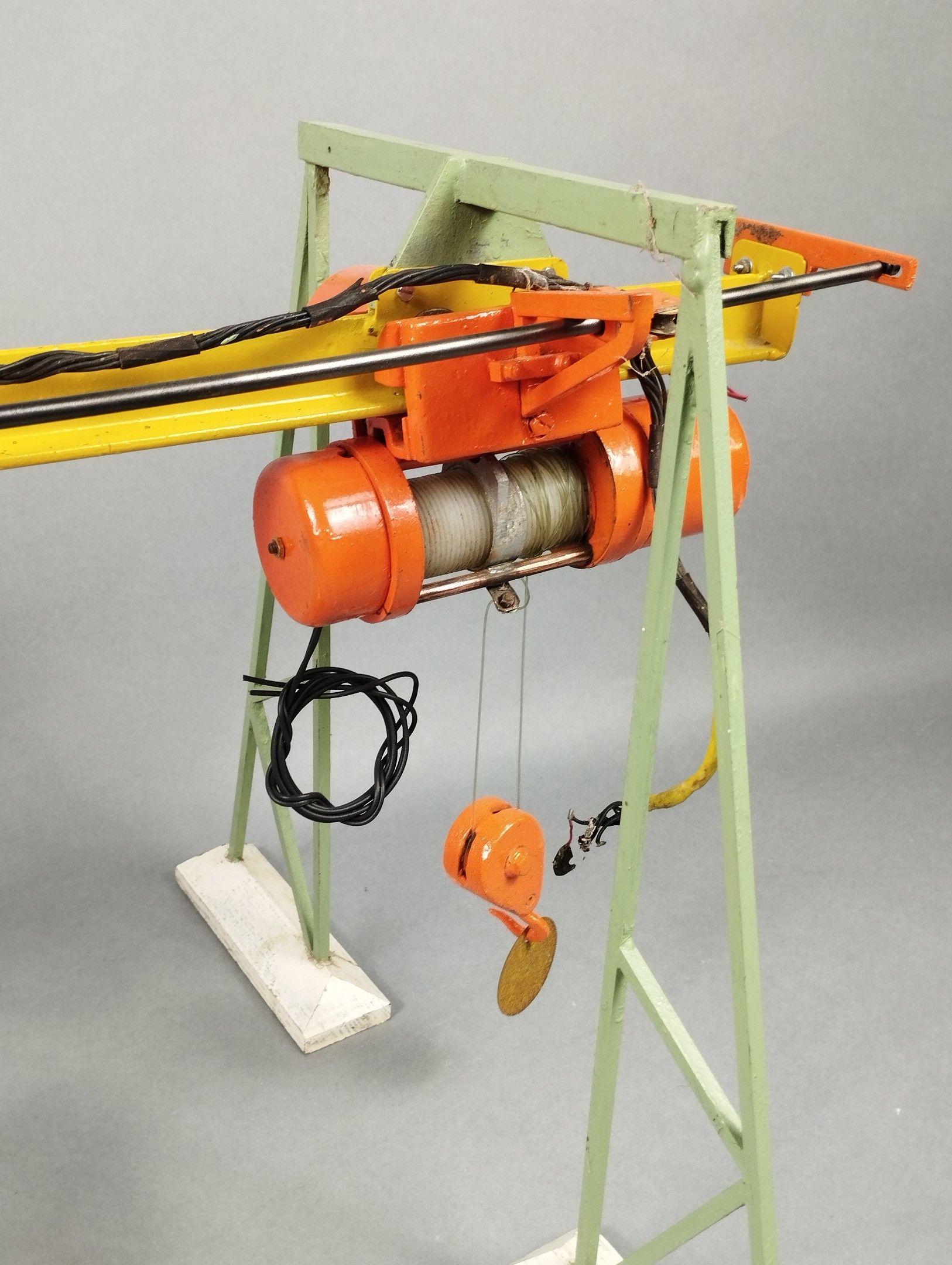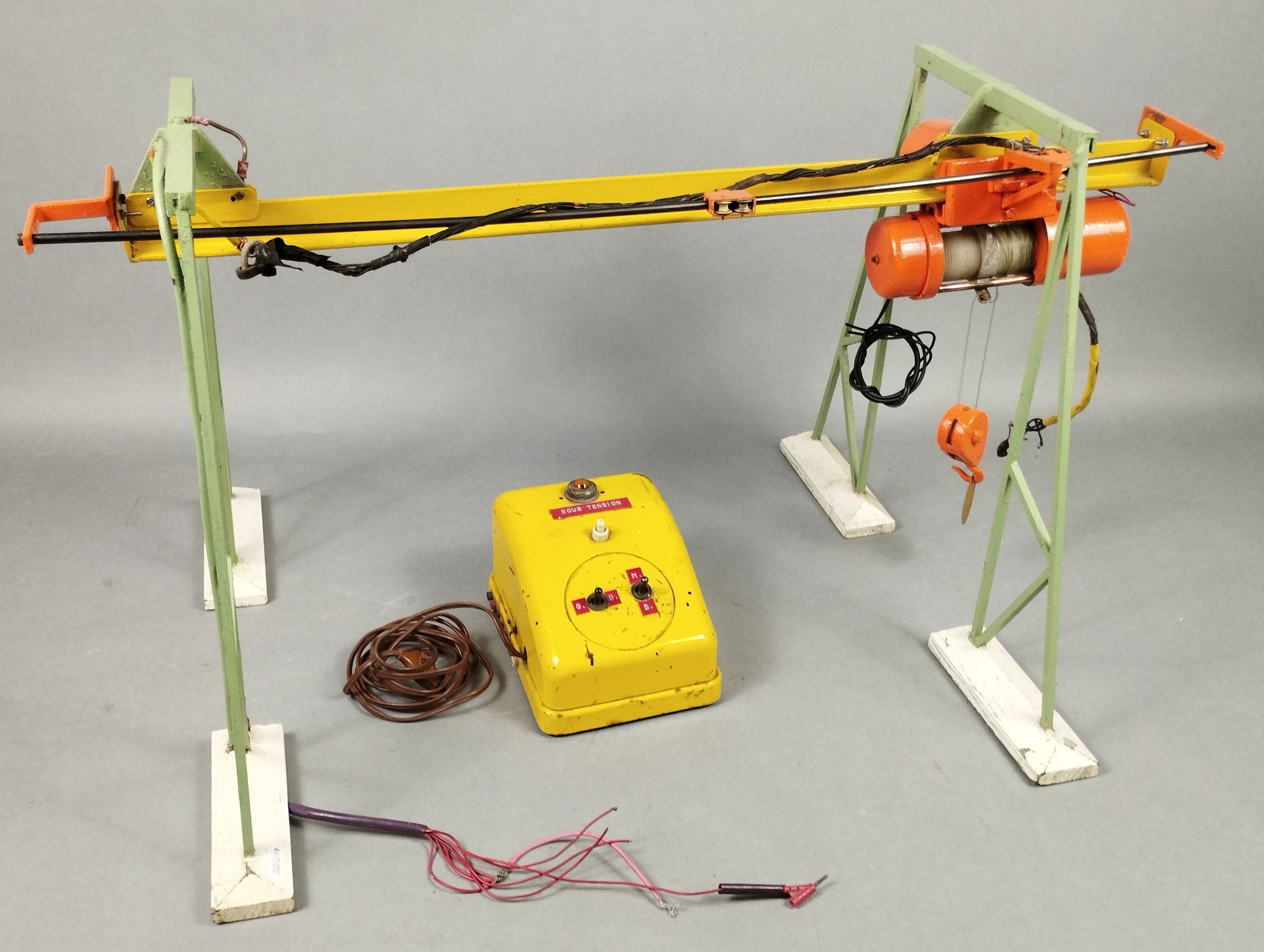 Working model of an overhead travelling crane (electricity to be revised), 2 motors (lowering and transverse). L. = 76 cm; H. = 42 cm.
