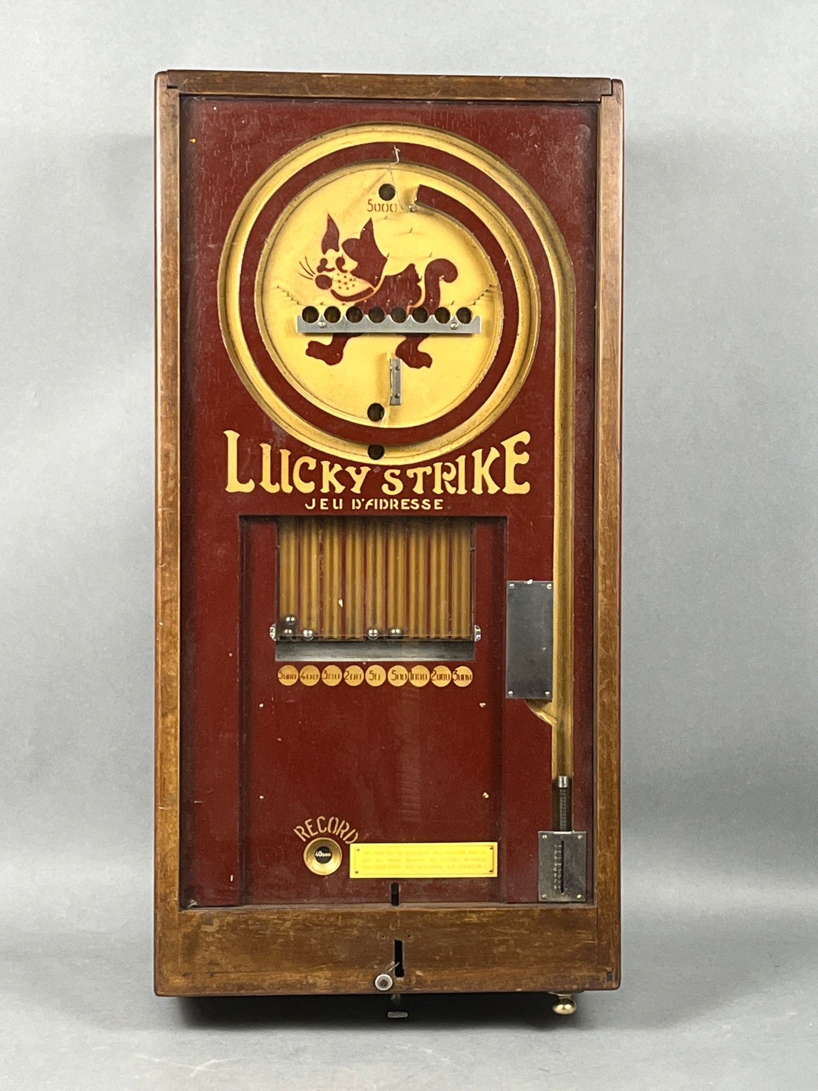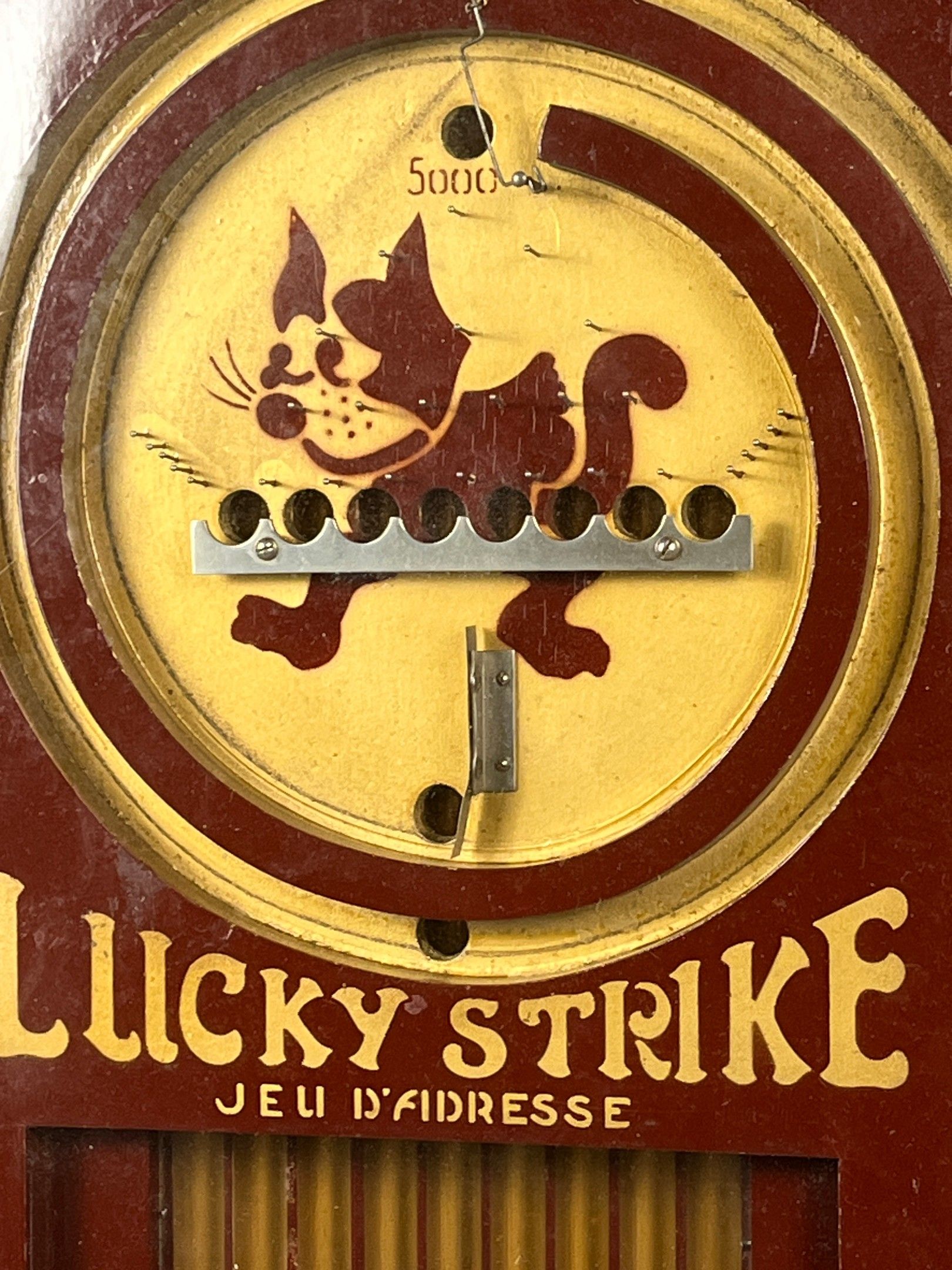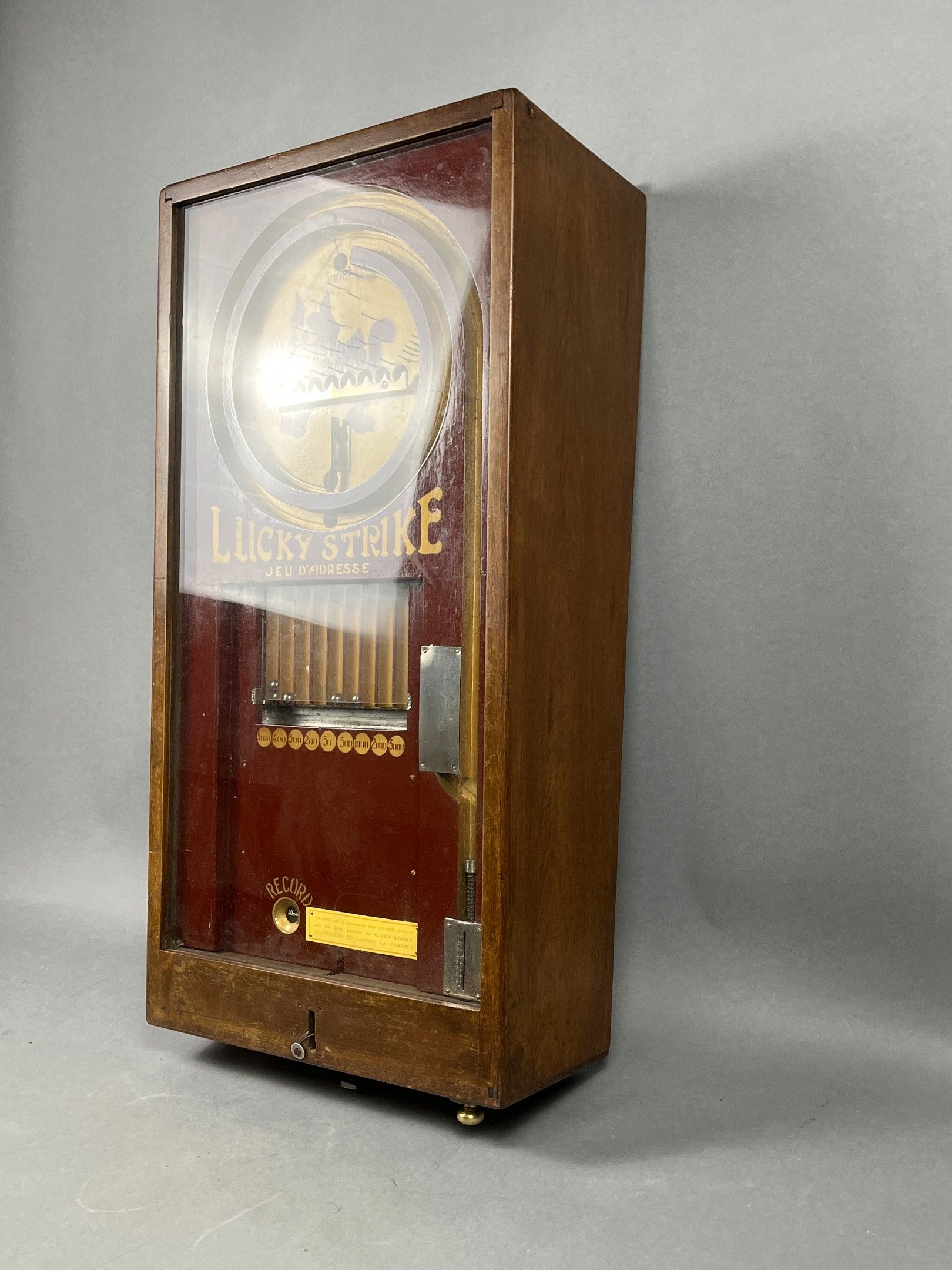 Lucky Strike" skill game in wooden box. With 8 marbles. Max. height: 21.5 cm; length: 78 cm; width: 39 cm. Works well.