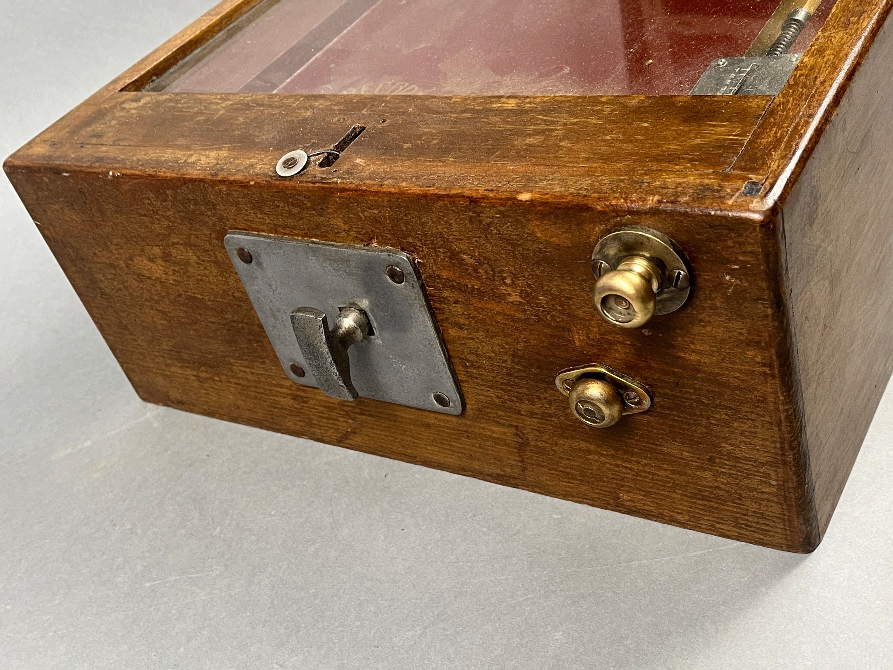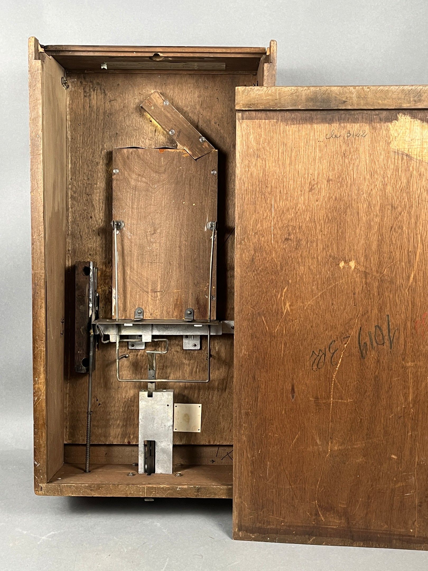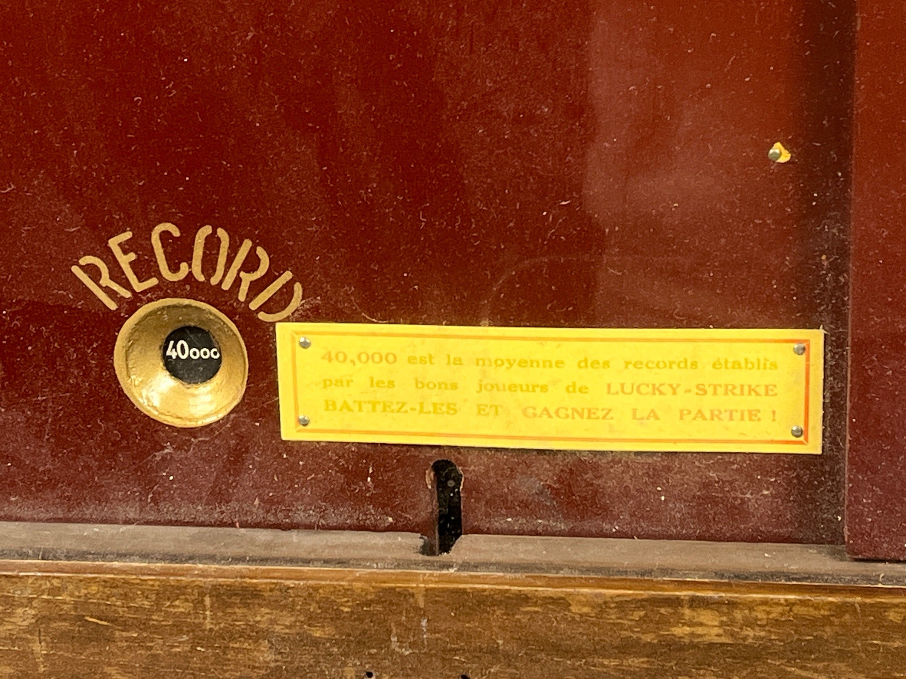 Lucky Strike" skill game in wooden box. With 8 marbles. Max. height: 21.5 cm; length: 78 cm; width: 39 cm. Works well.