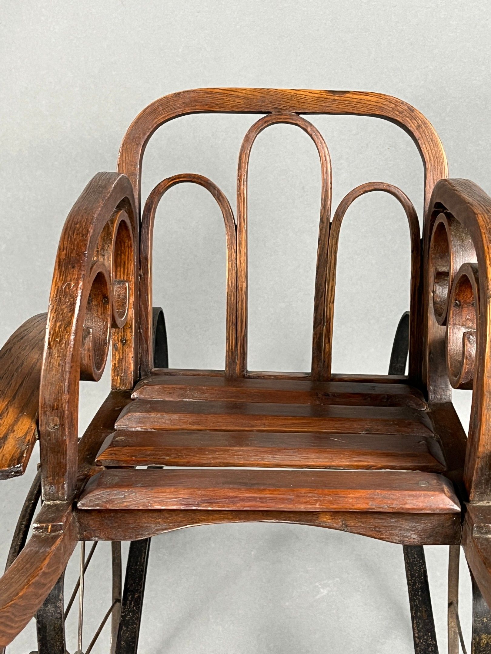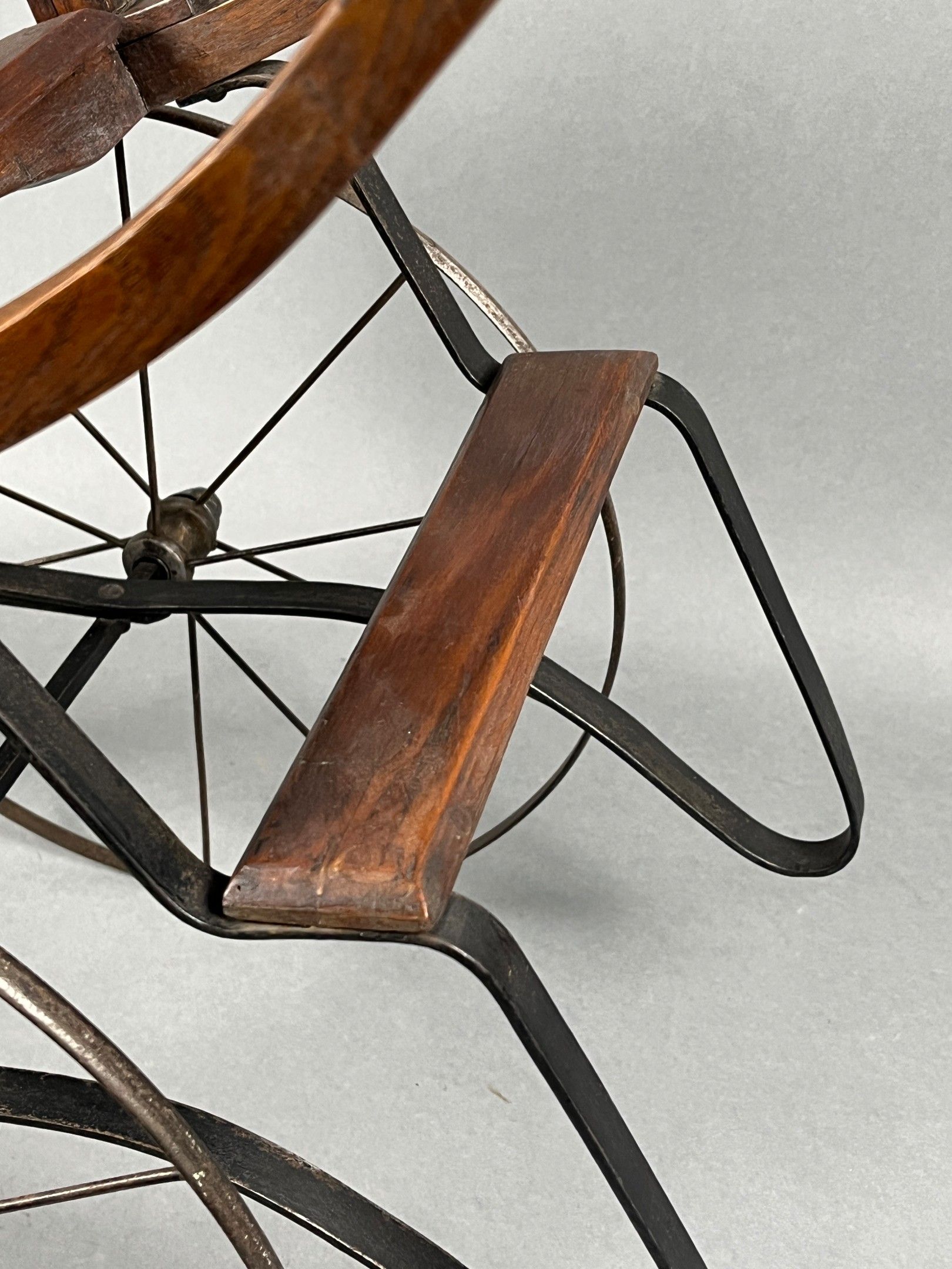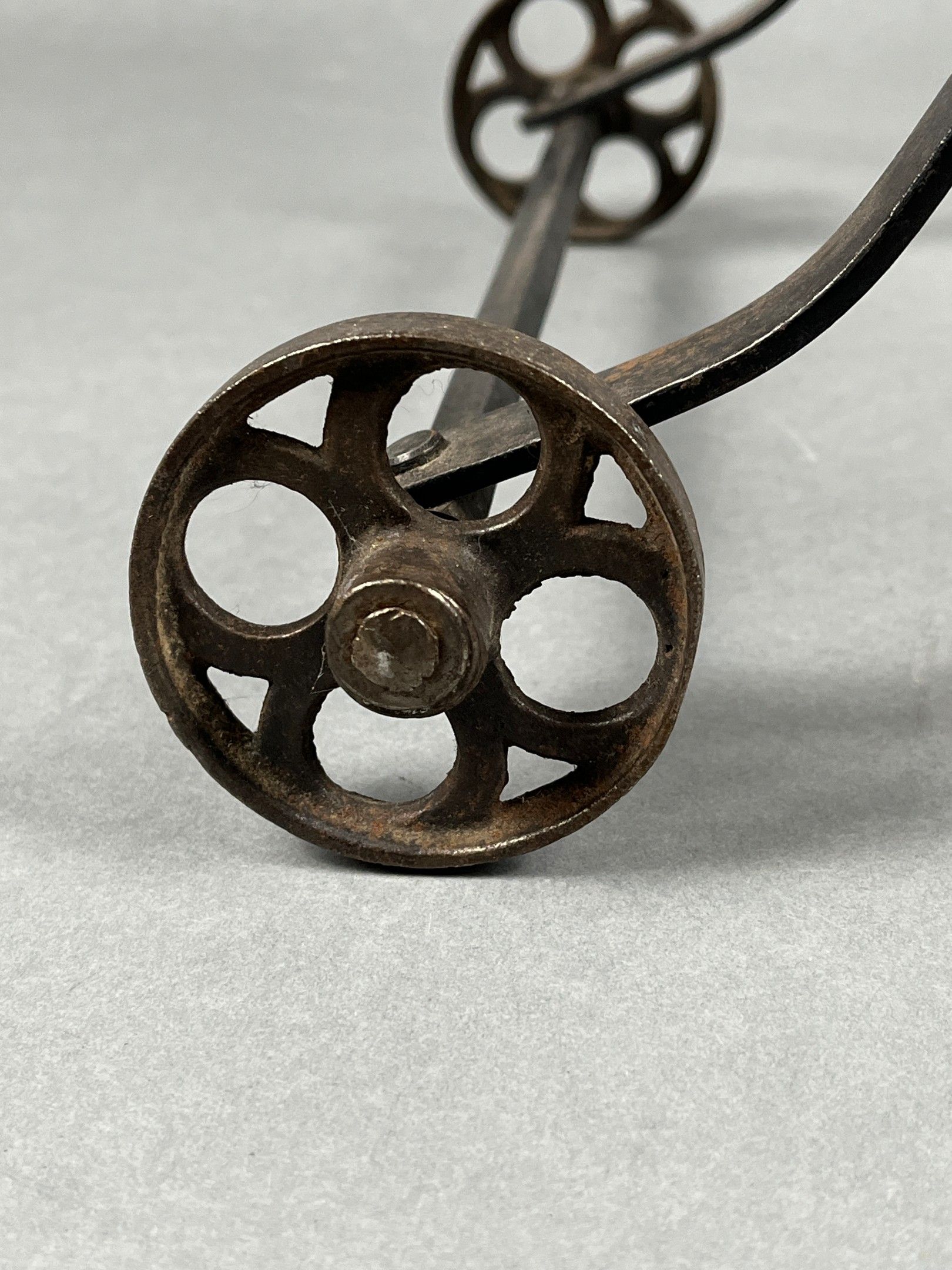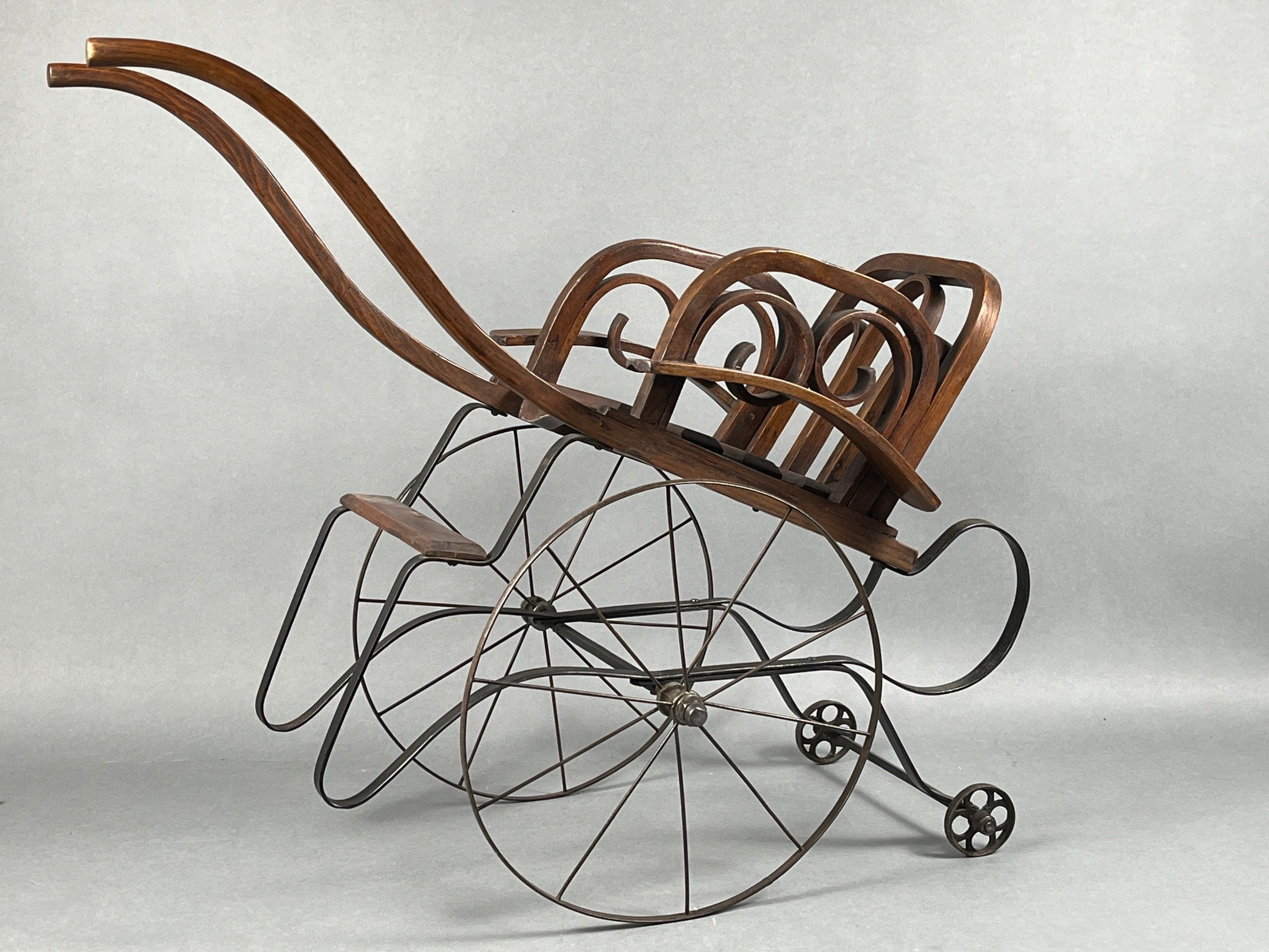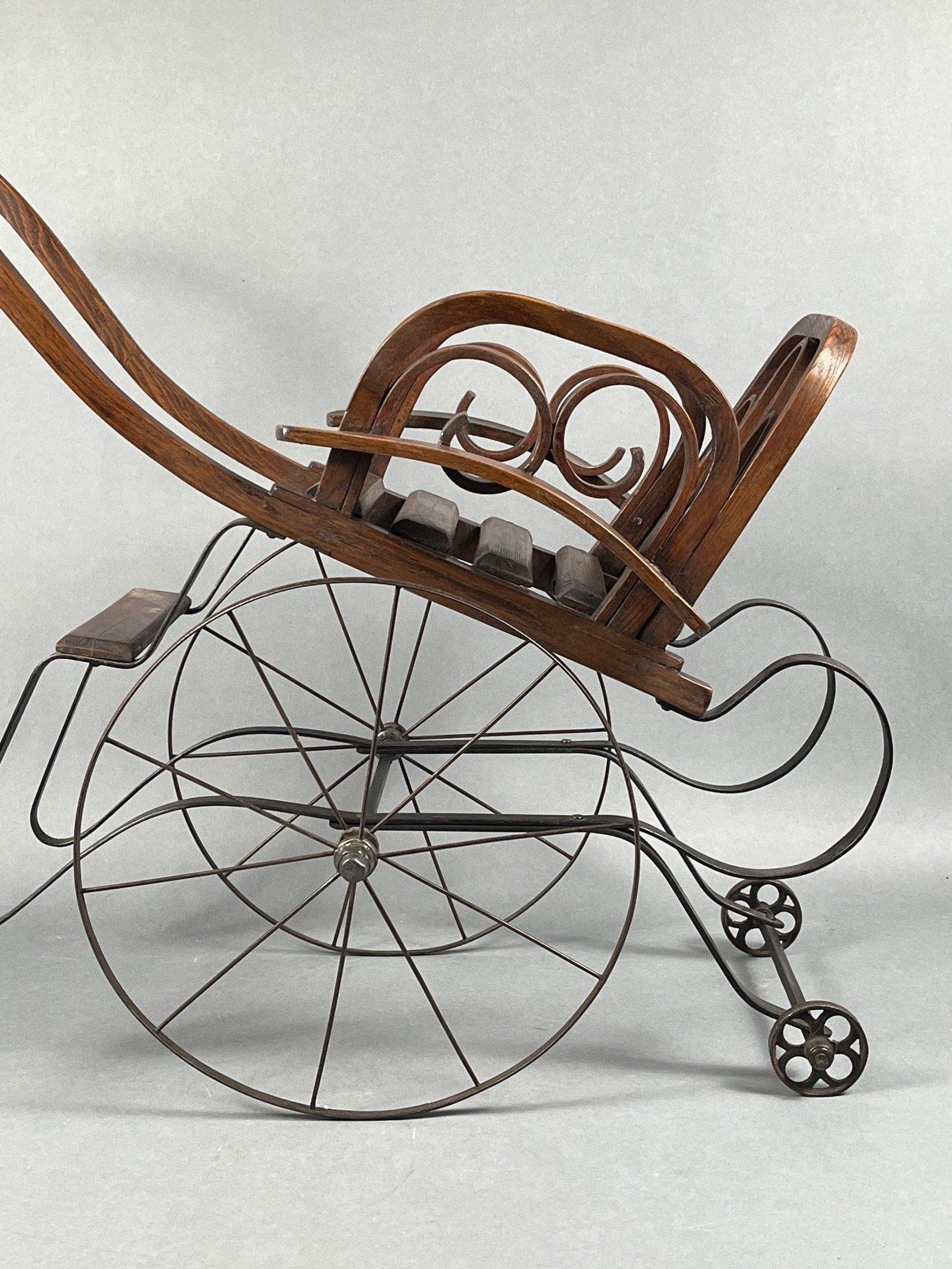 Wooden and metal doll carriage with four wheels. L. = 80 cm; max. height: 66 cm.