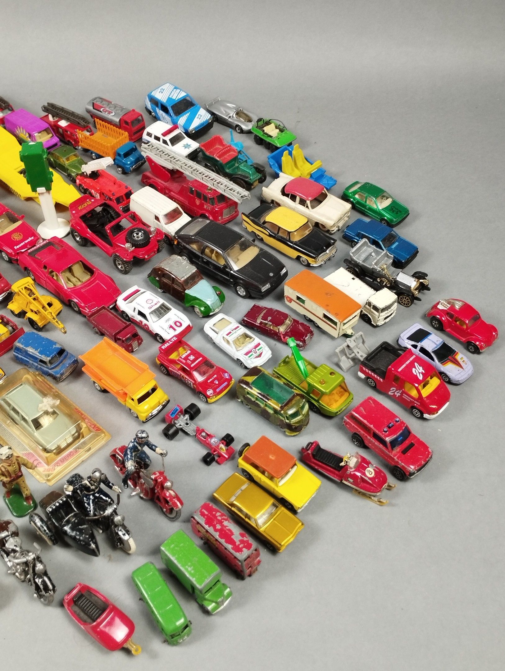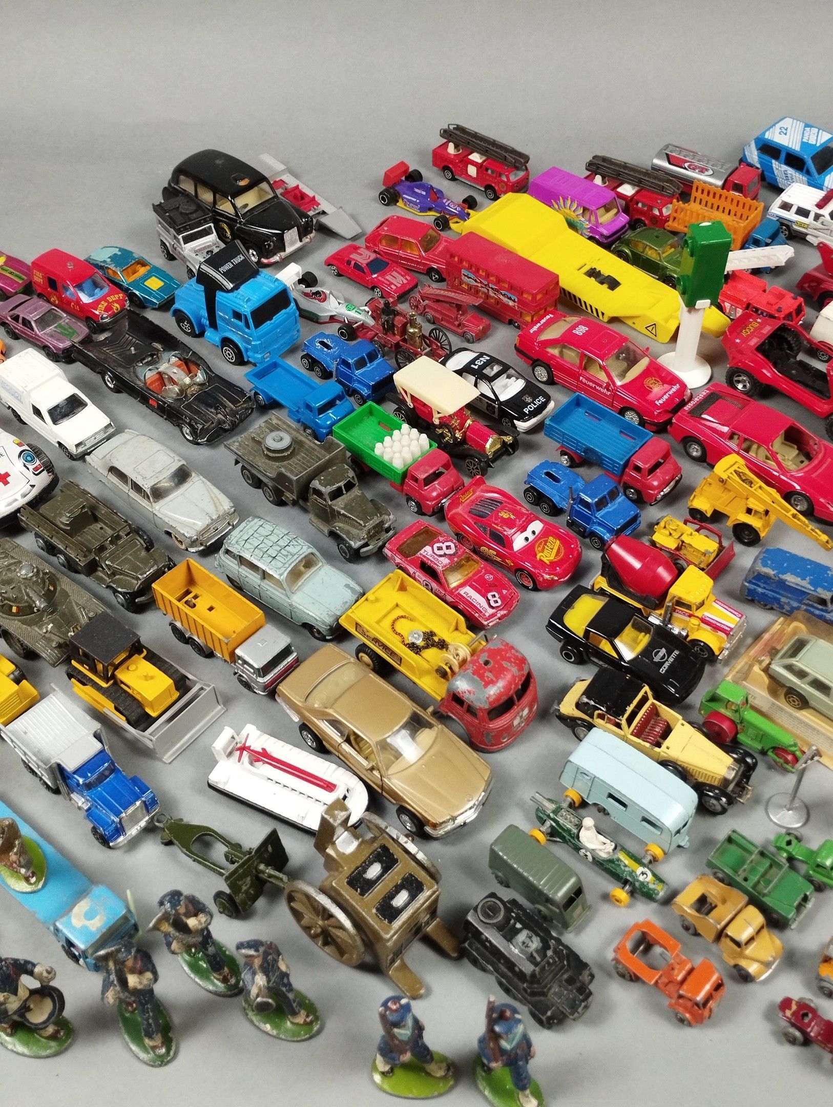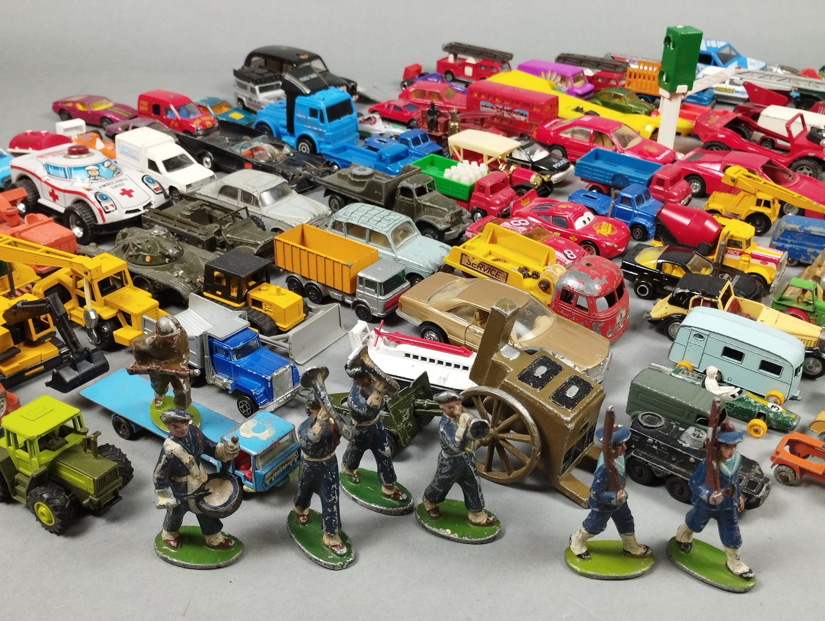 Large lot of small cars from Dinky Toys, Majorette, Matchbox, etc. A few QUIRALU soldiers (sailors, Chasseurs Alpins brass band...) are attached. As is.