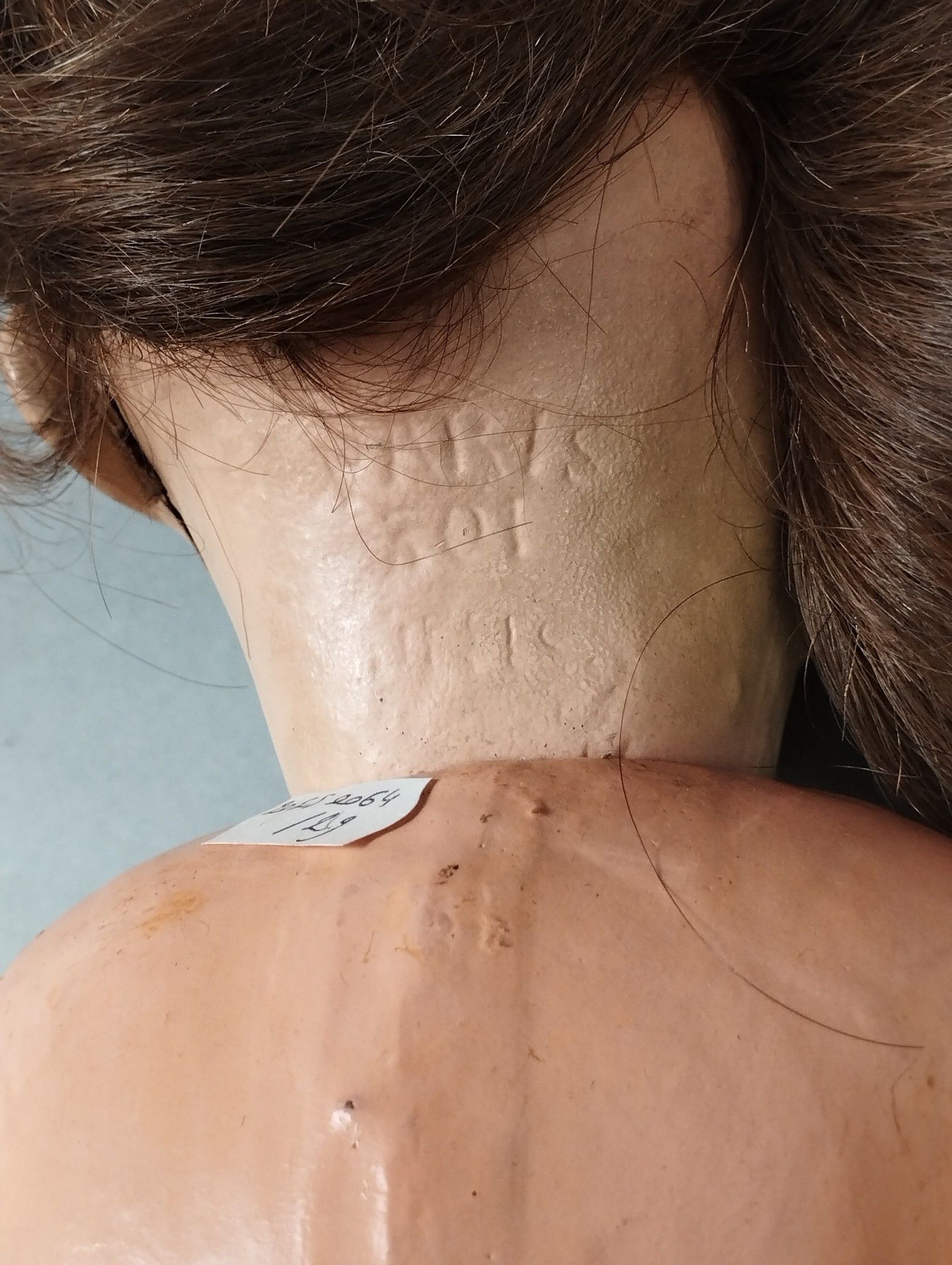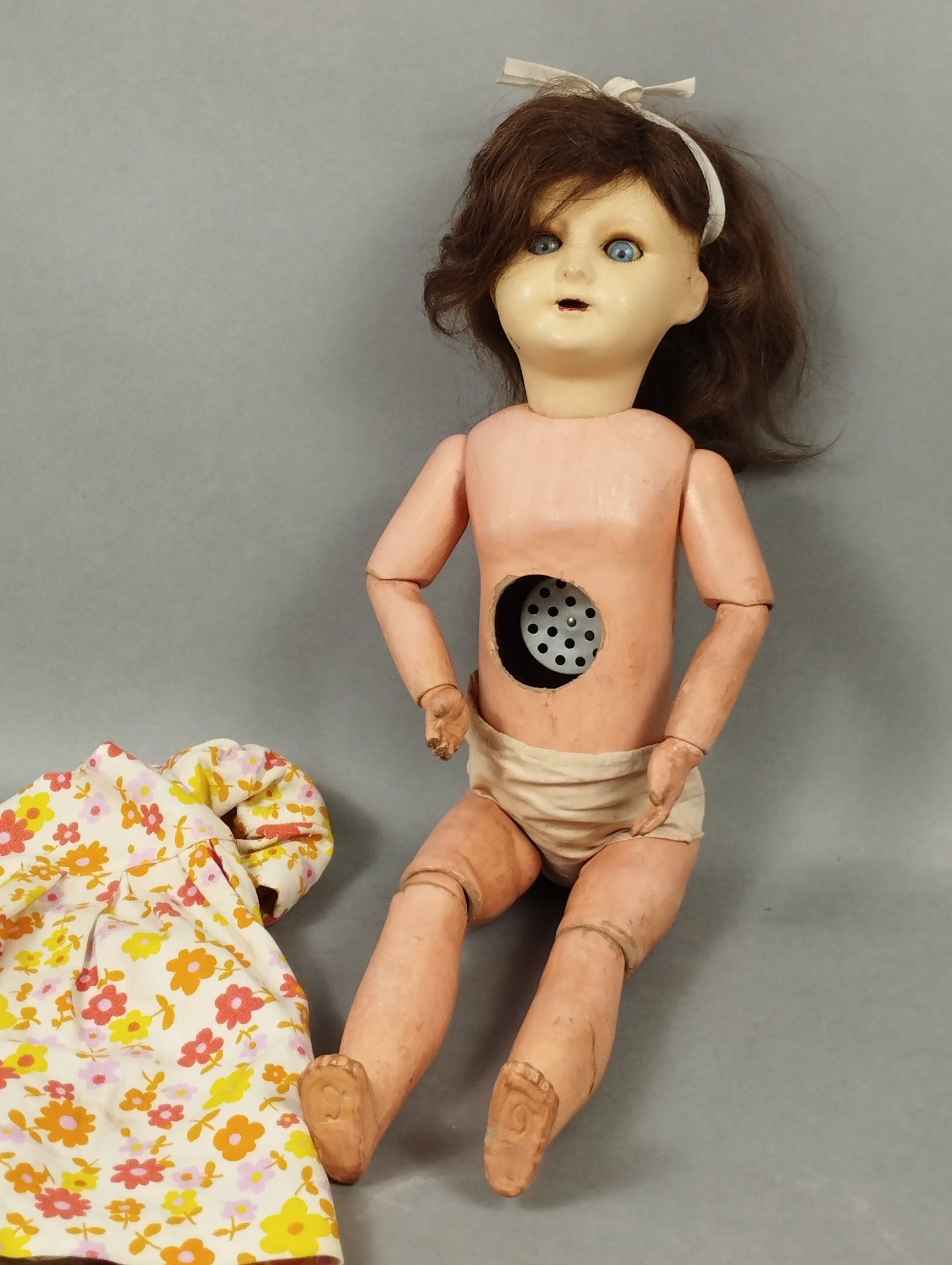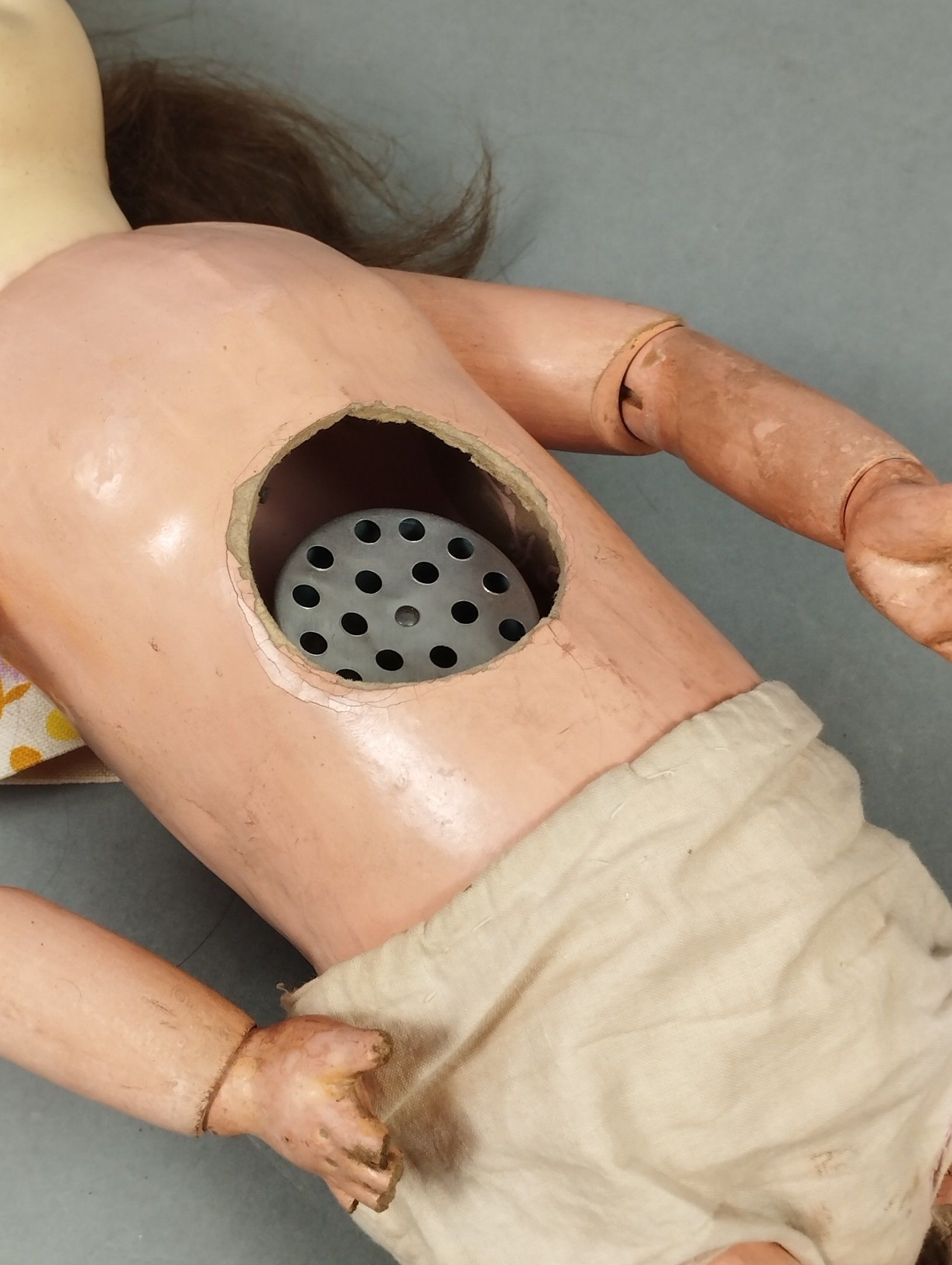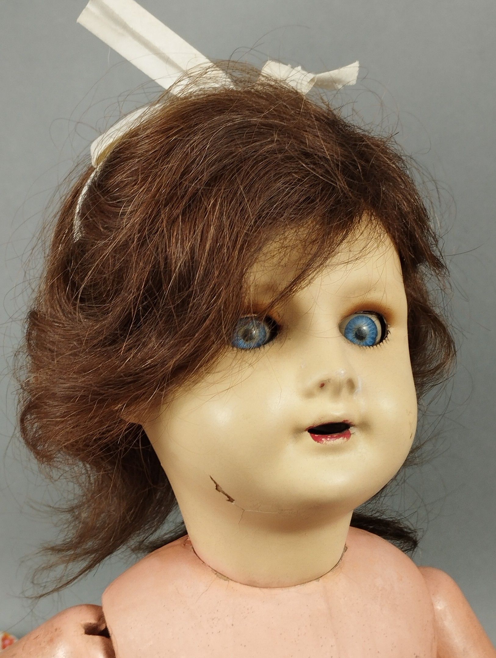 UNIS FRANCE. Doll with body and head in lacquered boiled cardboard, sleeping eyes, open mouth (painted teeth). Torso with music box. Circa 1920-1930. Height 60 cm. Damage to the fingers of the right hand and to the head.