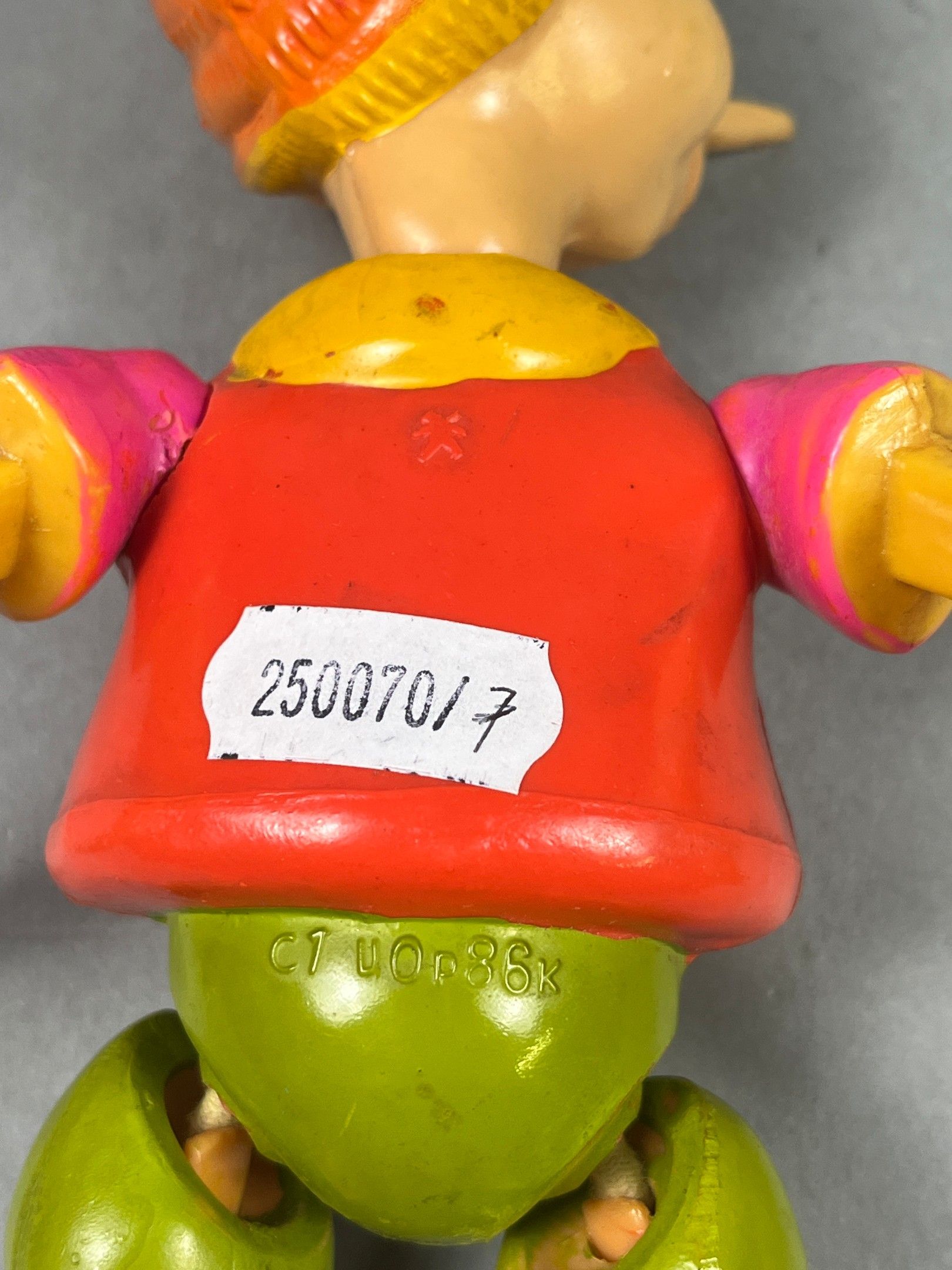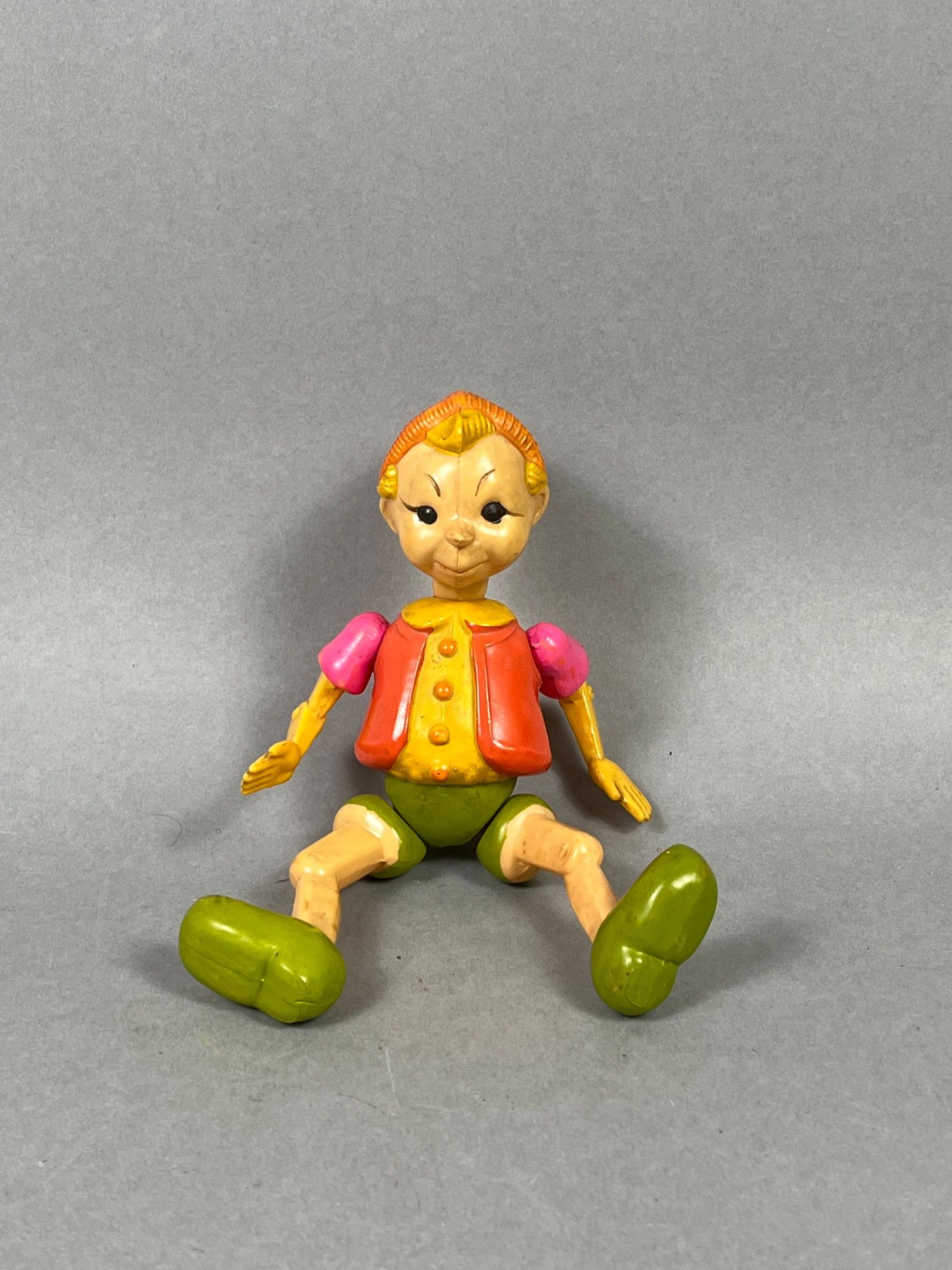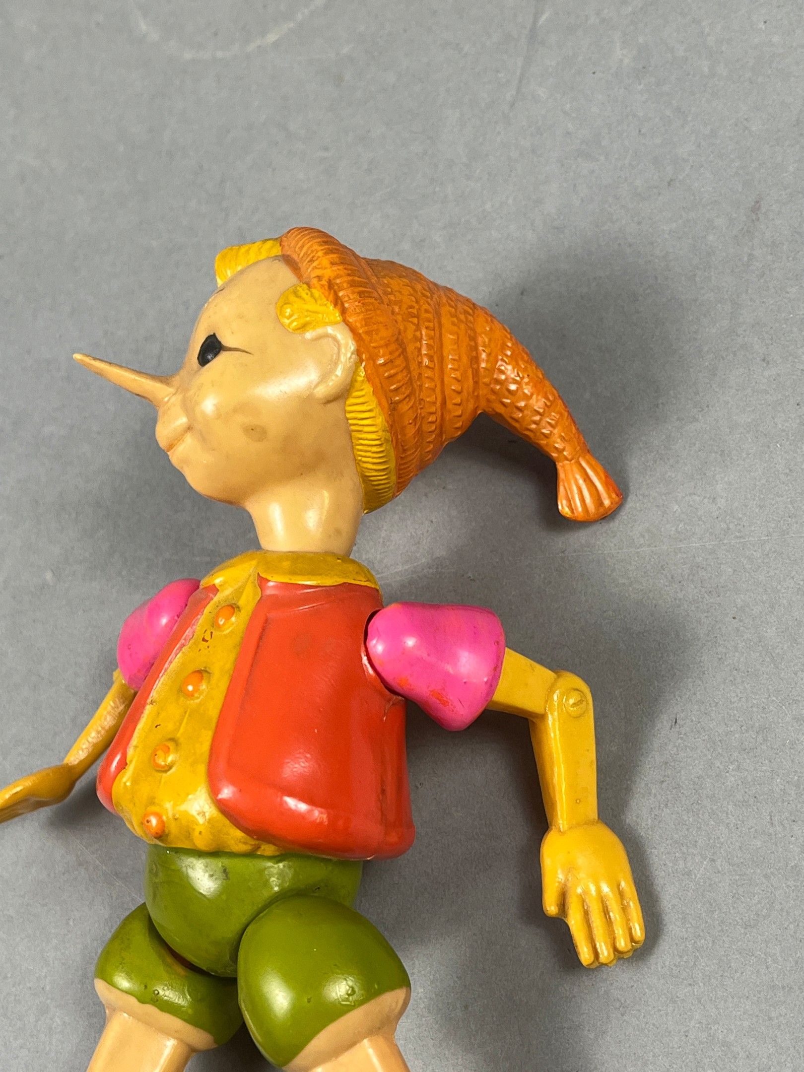 Antique Pinocchio toy in polychrome moulded plastic. Articulated limbs. Ex-USSR, 1960s. Bear mark on reverse. Height = 22 cm.