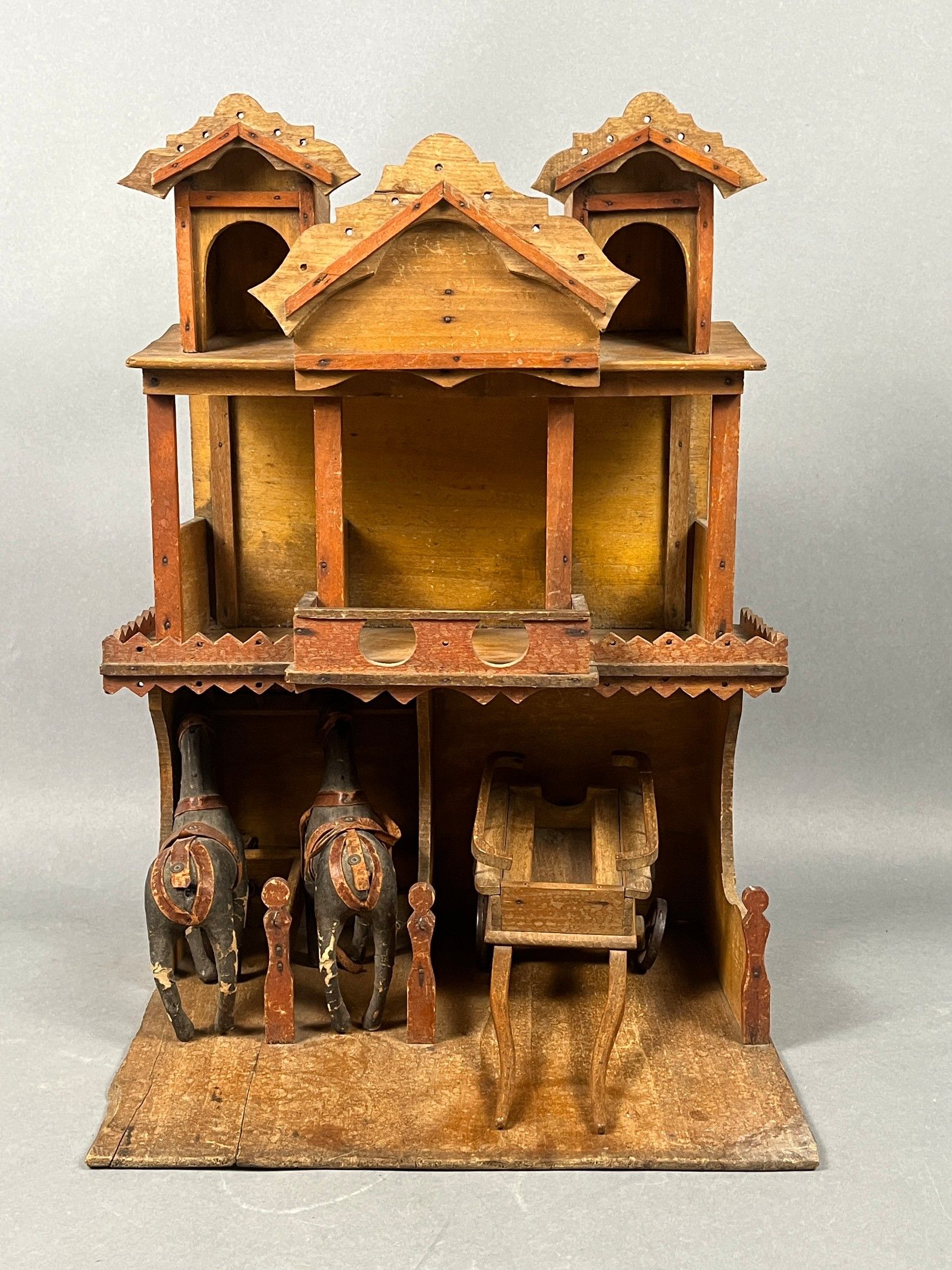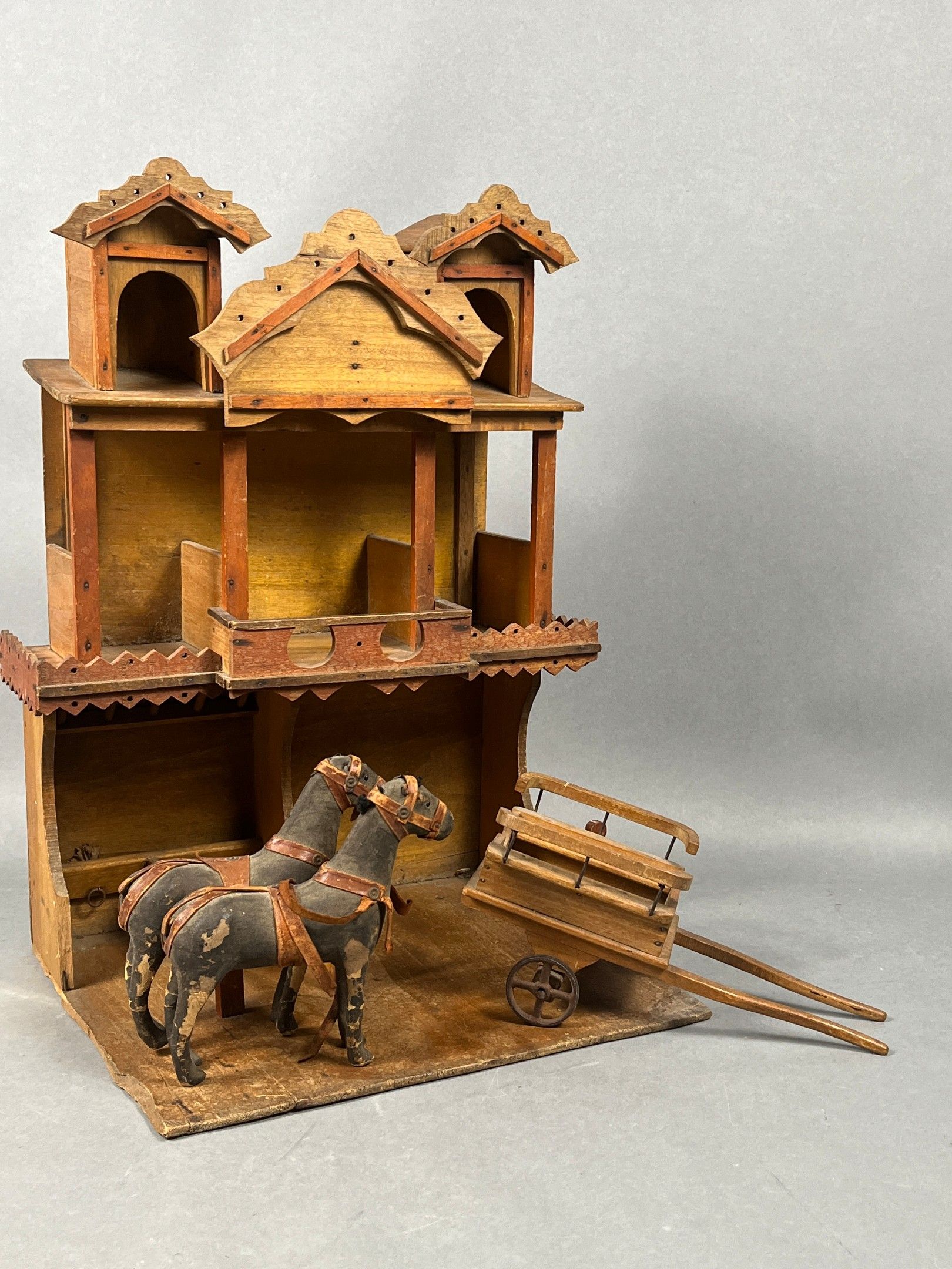 LENOBLE. Wooden stable with two horses covered in skins, harnessed, and cart to pull. Early 20th century. Stable height: 51 cm. Minor accidents.