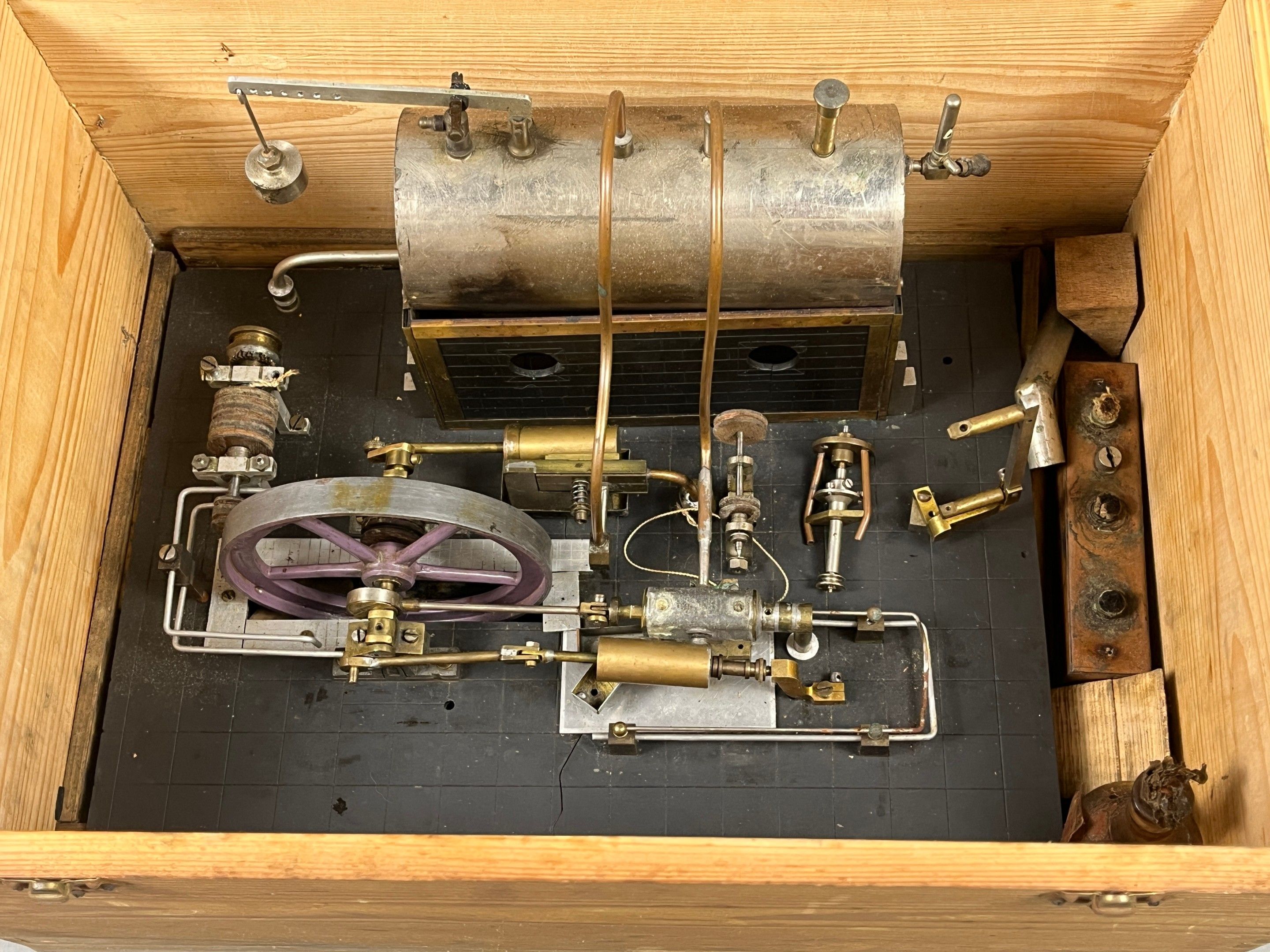 Old steam engine, in its carrying case. As is (not tested). Size of base: 34 x 24 cm.