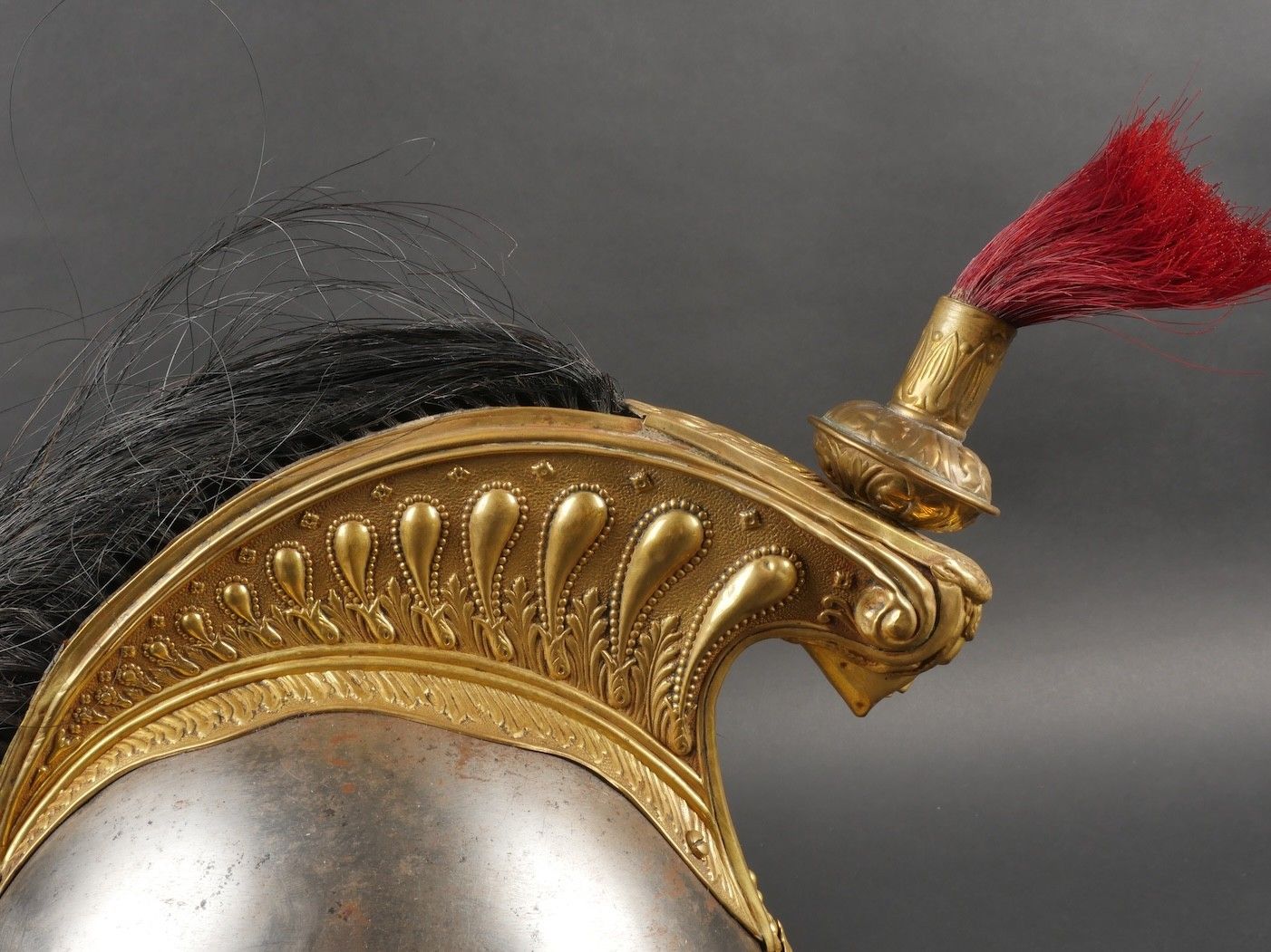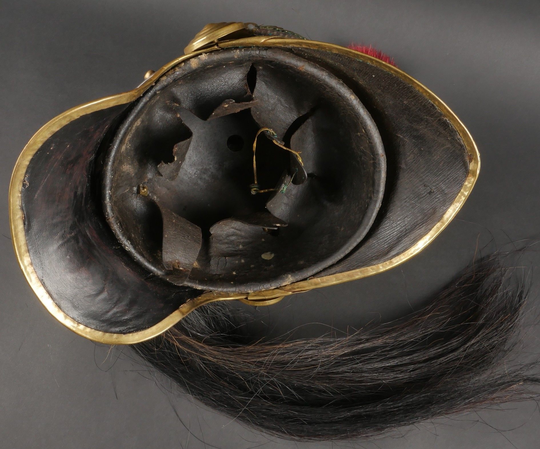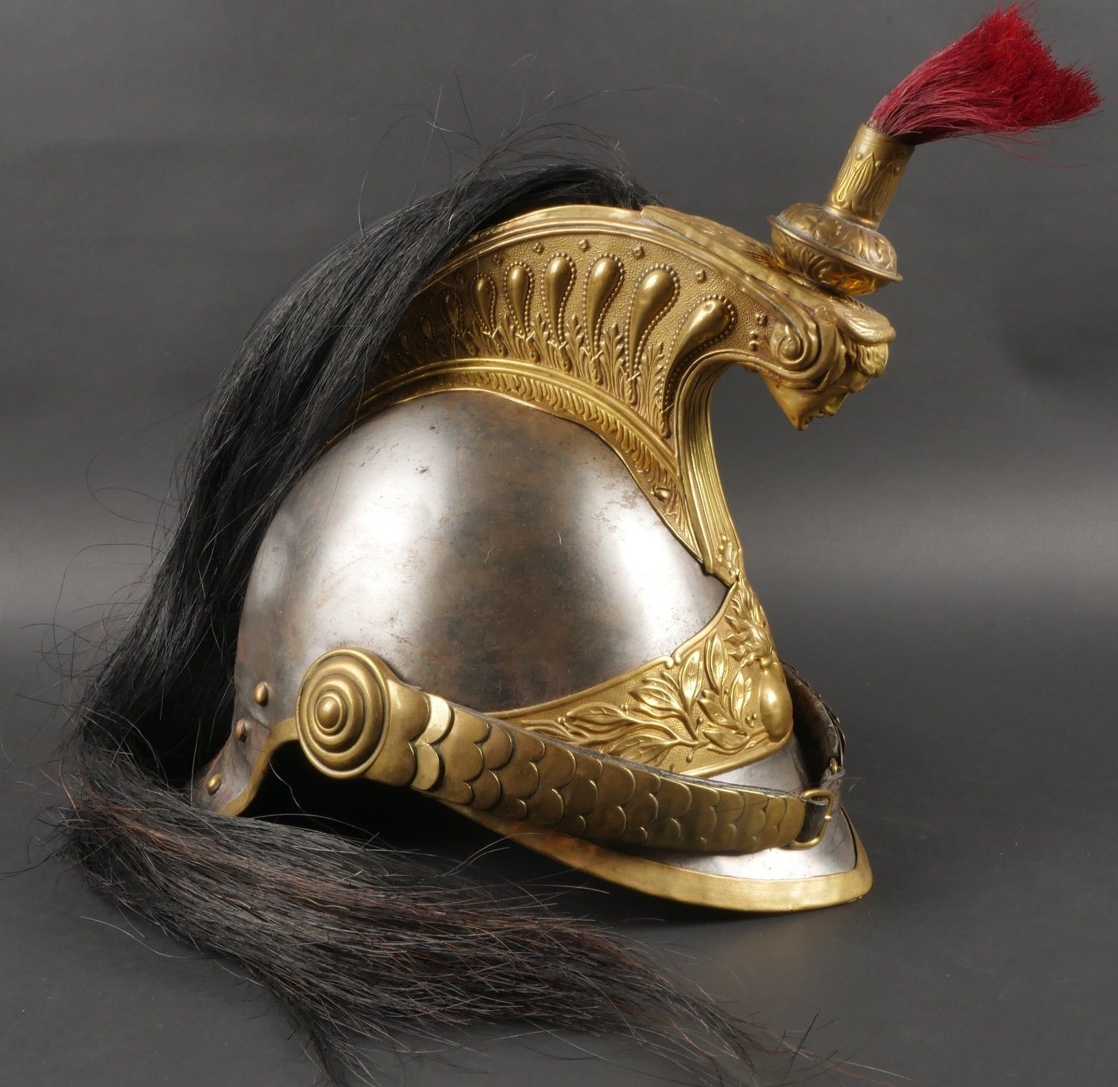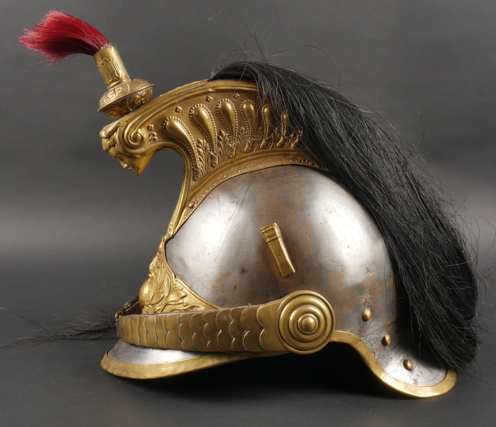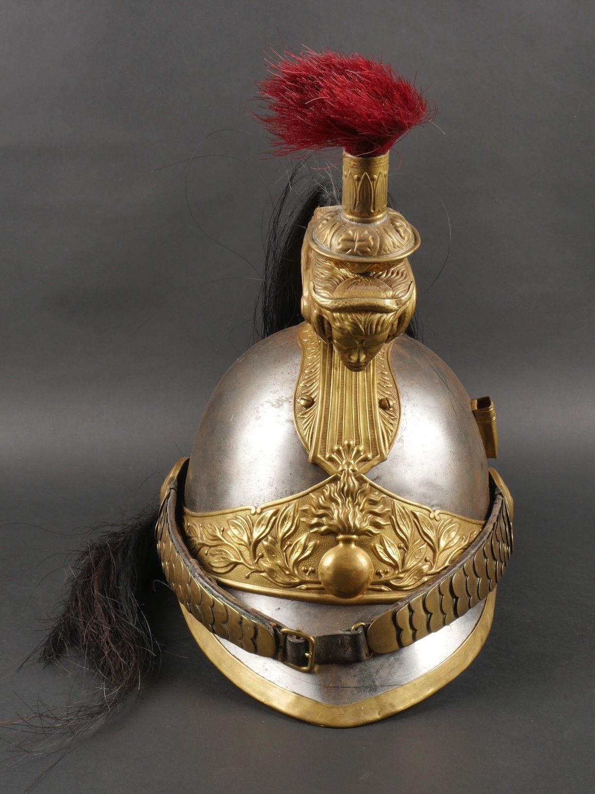 Cuirassier helmet 187274. Troop helmet model 1872 modified in 1874. Steel shell, brass band embossed with grenade attribute. Crest ending in a minerva head topped by its marmoset in red horsehair and supporting a mane in black horsehair. The rear is marked D143. Lobster-tail nape-cap with three rivets and covered in black leather, as is the visor. Original greased leather cap with seven wolf teeth, four eyelets damaged. Troop-style leather chinstrap in its original length covered with scales. Plumet missing. Cuirassier helmet 187274