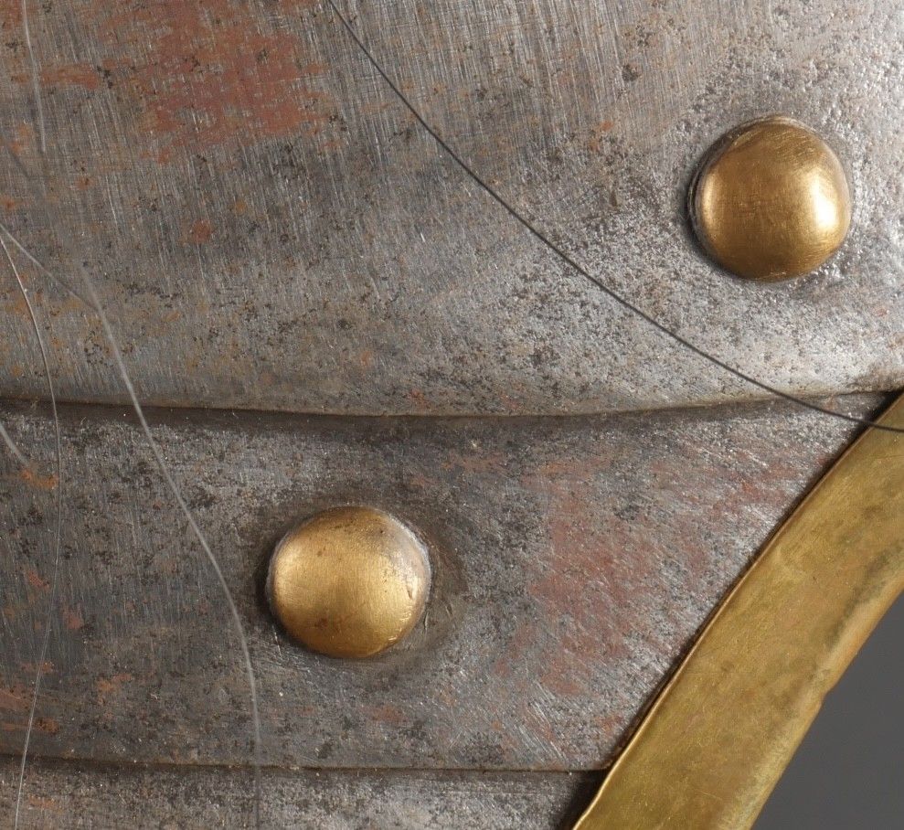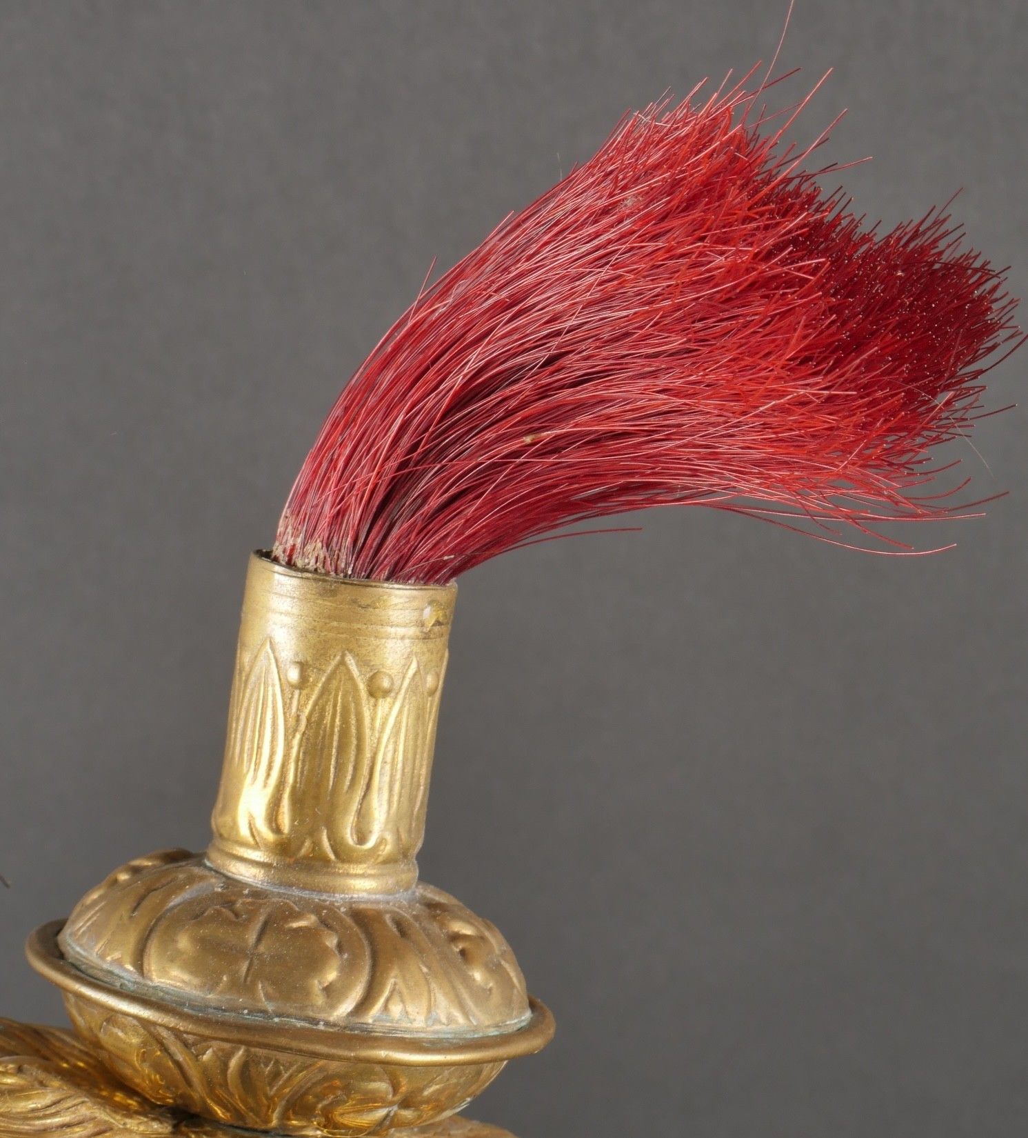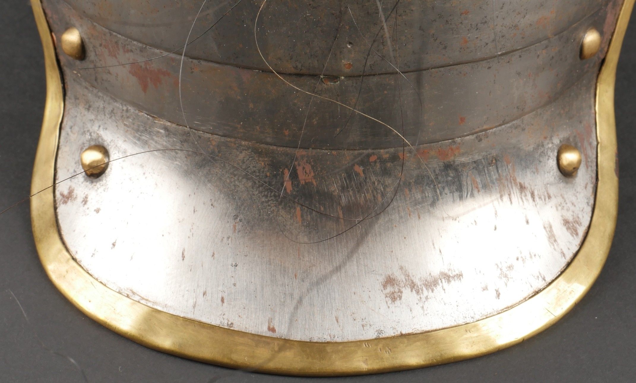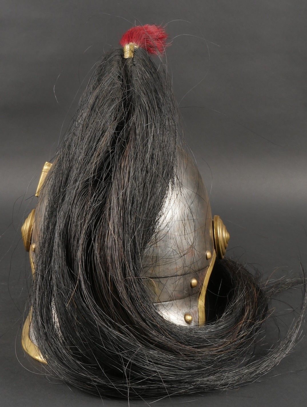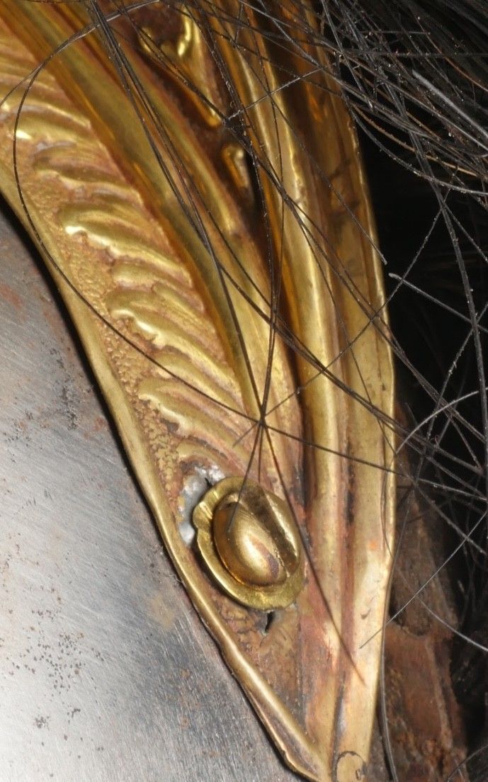 Cuirassier helmet 187274. Troop helmet model 1872 modified in 1874. Steel shell, brass band embossed with grenade attribute. Crest ending in a minerva head topped by its marmoset in red horsehair and supporting a mane in black horsehair. The rear is marked D143. Lobster-tail nape-cap with three rivets and covered in black leather, as is the visor. Original greased leather cap with seven wolf teeth, four eyelets damaged. Troop-style leather chinstrap in its original length covered with scales. Plumet missing. Cuirassier helmet 187274