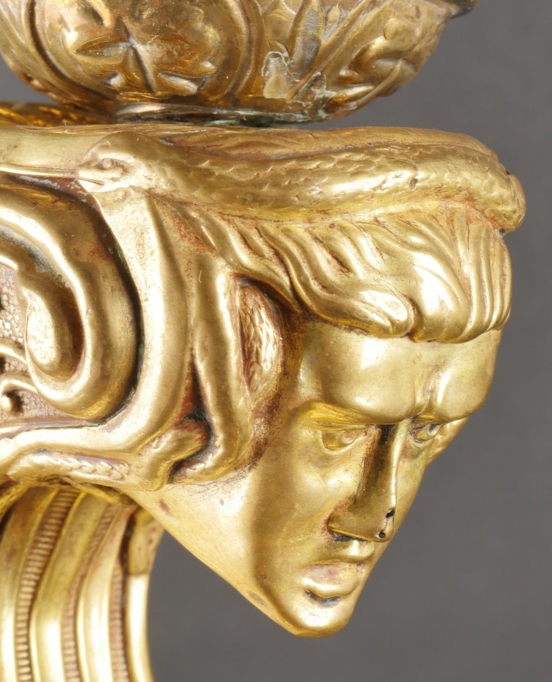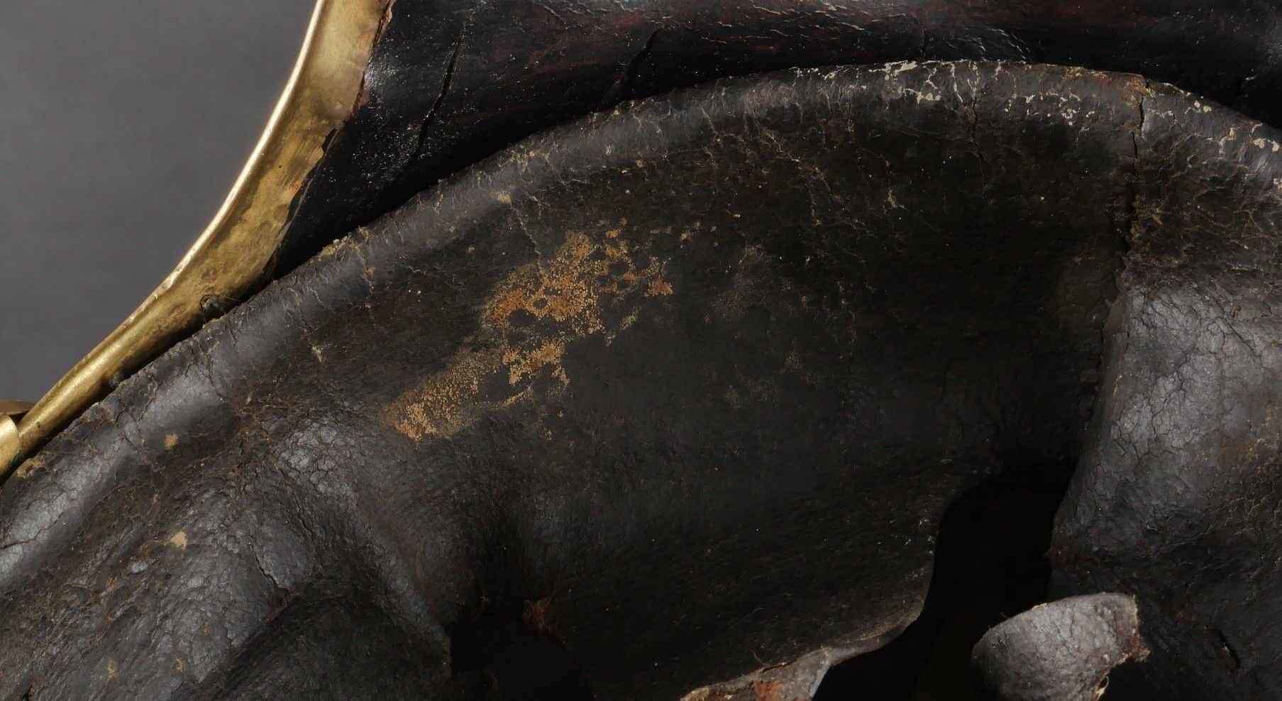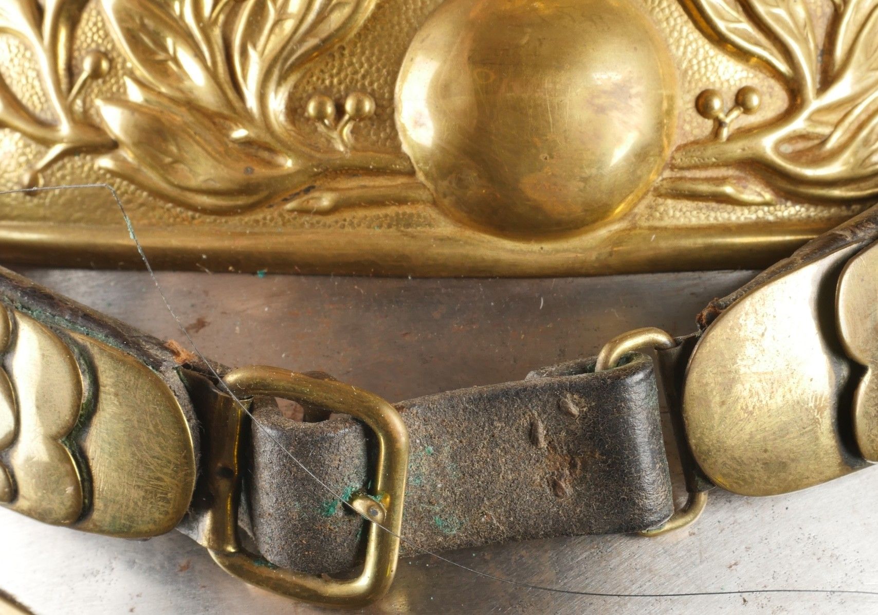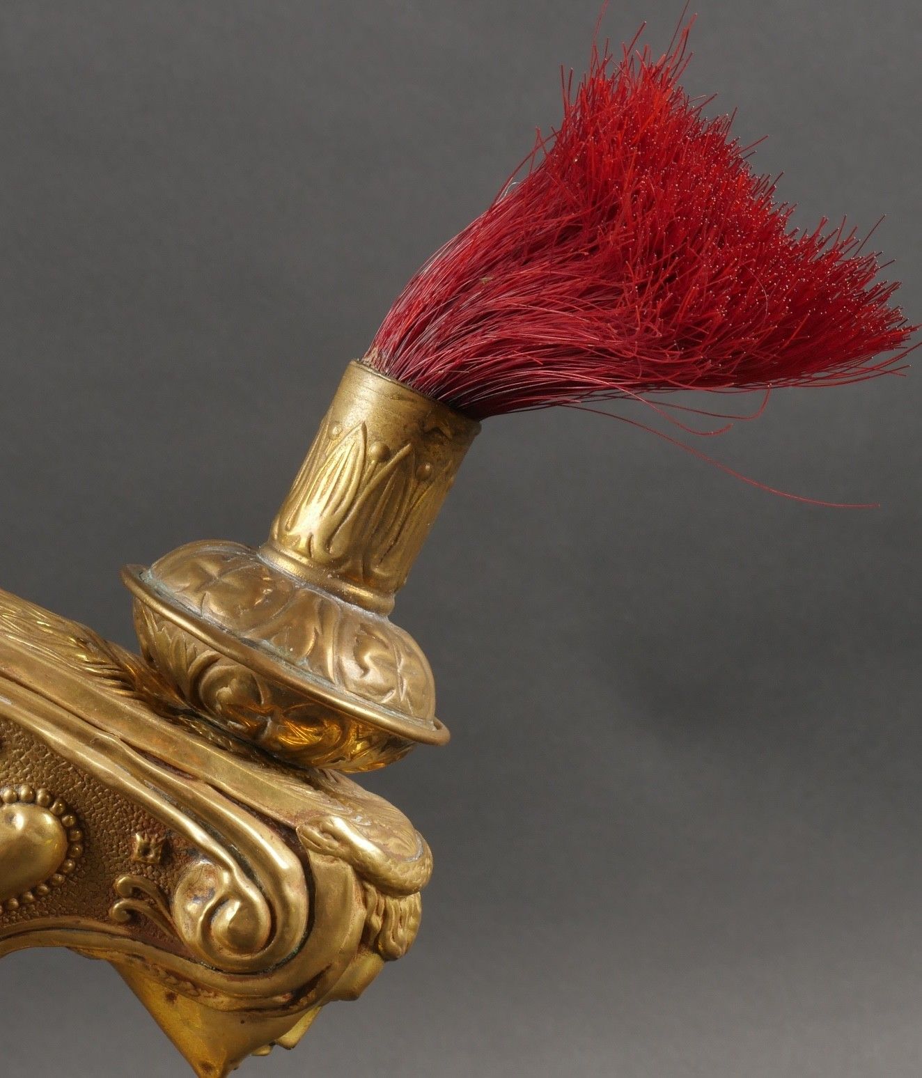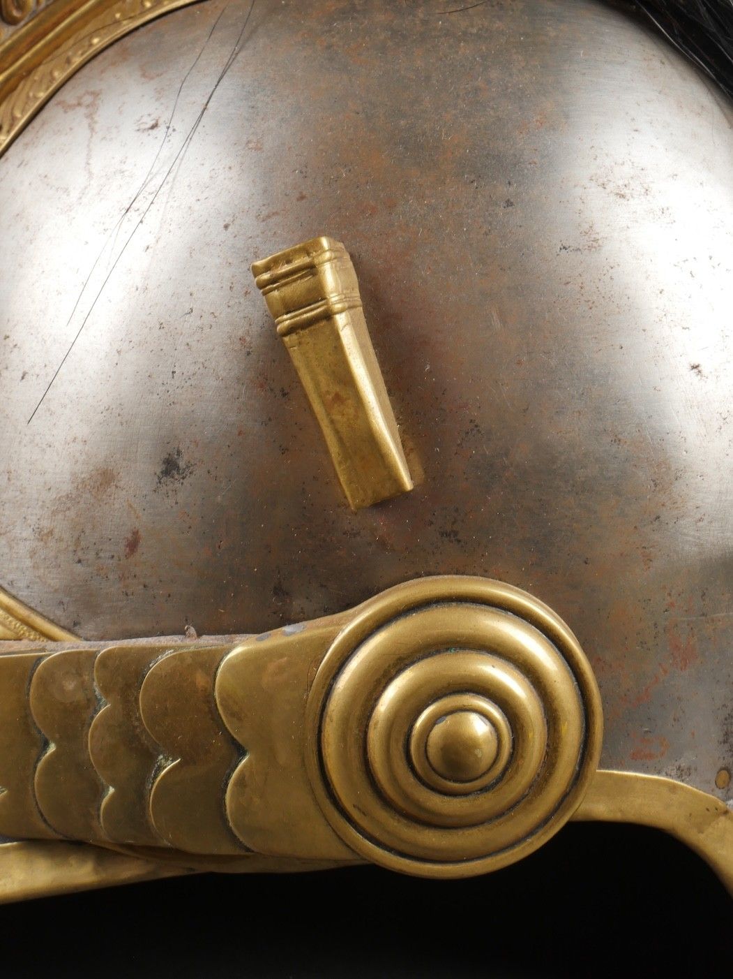 Cuirassier helmet 187274. Troop helmet model 1872 modified in 1874. Steel shell, brass band embossed with grenade attribute. Crest ending in a minerva head topped by its marmoset in red horsehair and supporting a mane in black horsehair. The rear is marked D143. Lobster-tail nape-cap with three rivets and covered in black leather, as is the visor. Original greased leather cap with seven wolf teeth, four eyelets damaged. Troop-style leather chinstrap in its original length covered with scales. Plumet missing. Cuirassier helmet 187274