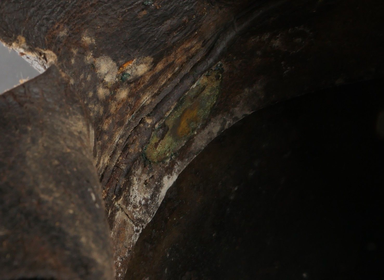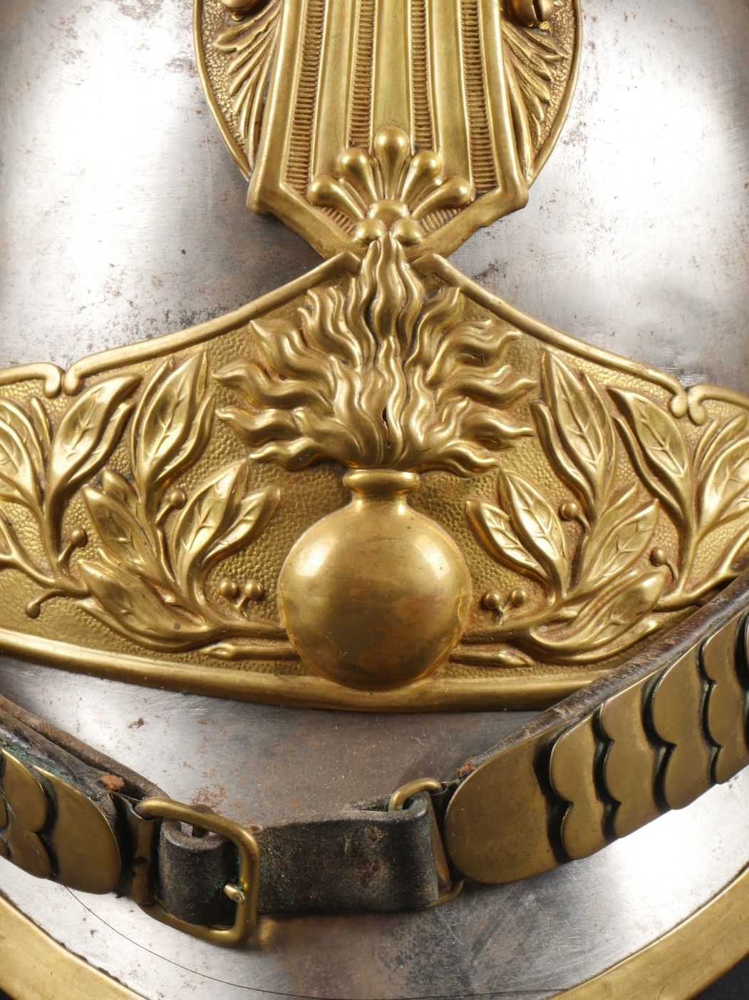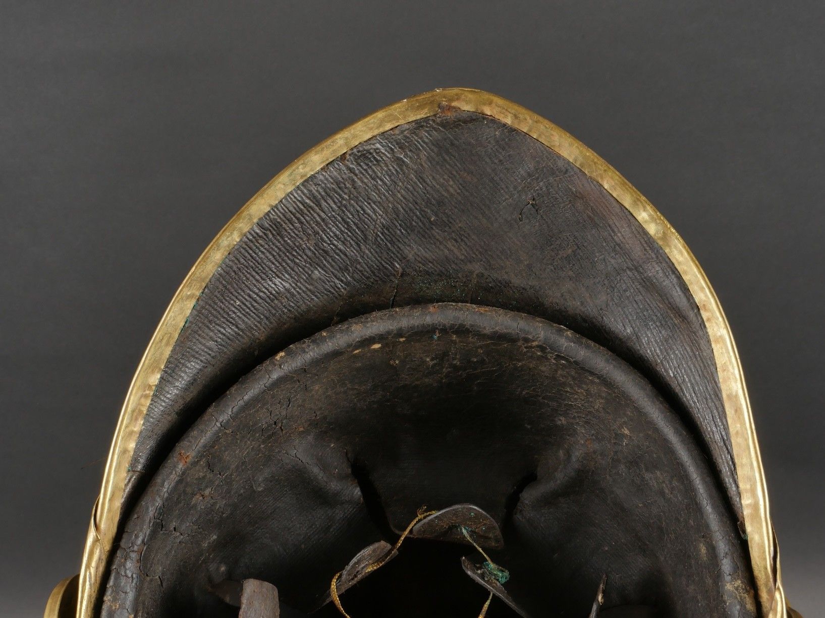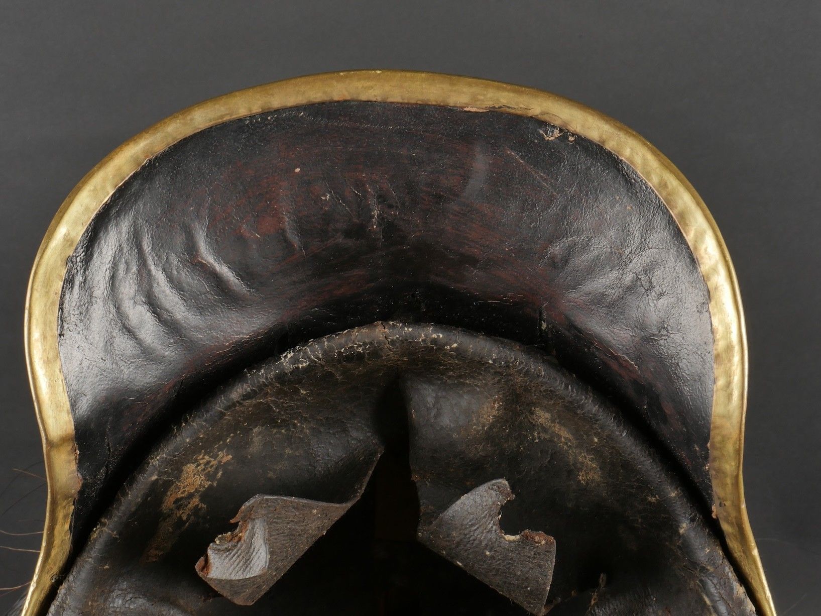 Helmet for troop model 1872 modified in 1874. Steel shell with a brass band stamped with a grenade emblem. Crest ending in a Minerva head topped with a red horsehair tuft and supporting a black horsehair mane. Marking D143 on the back. Lobster tail neck guard with three rivets covered in black leather like the visor. Original leather liner greased with seven tongue segments, four eyelets damaged. Leather chinstrap of the troop model in original length covered with brass scales. Absence of plume.