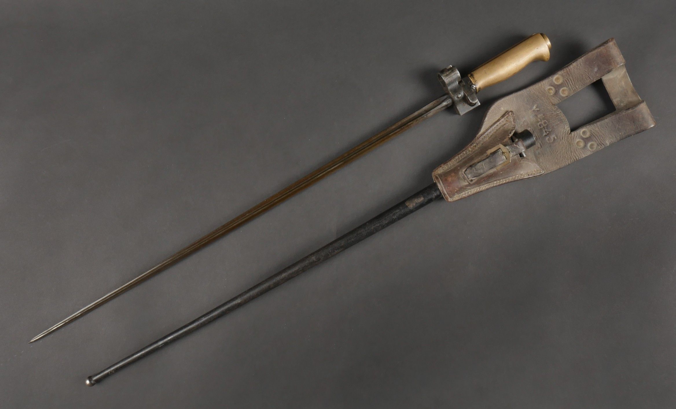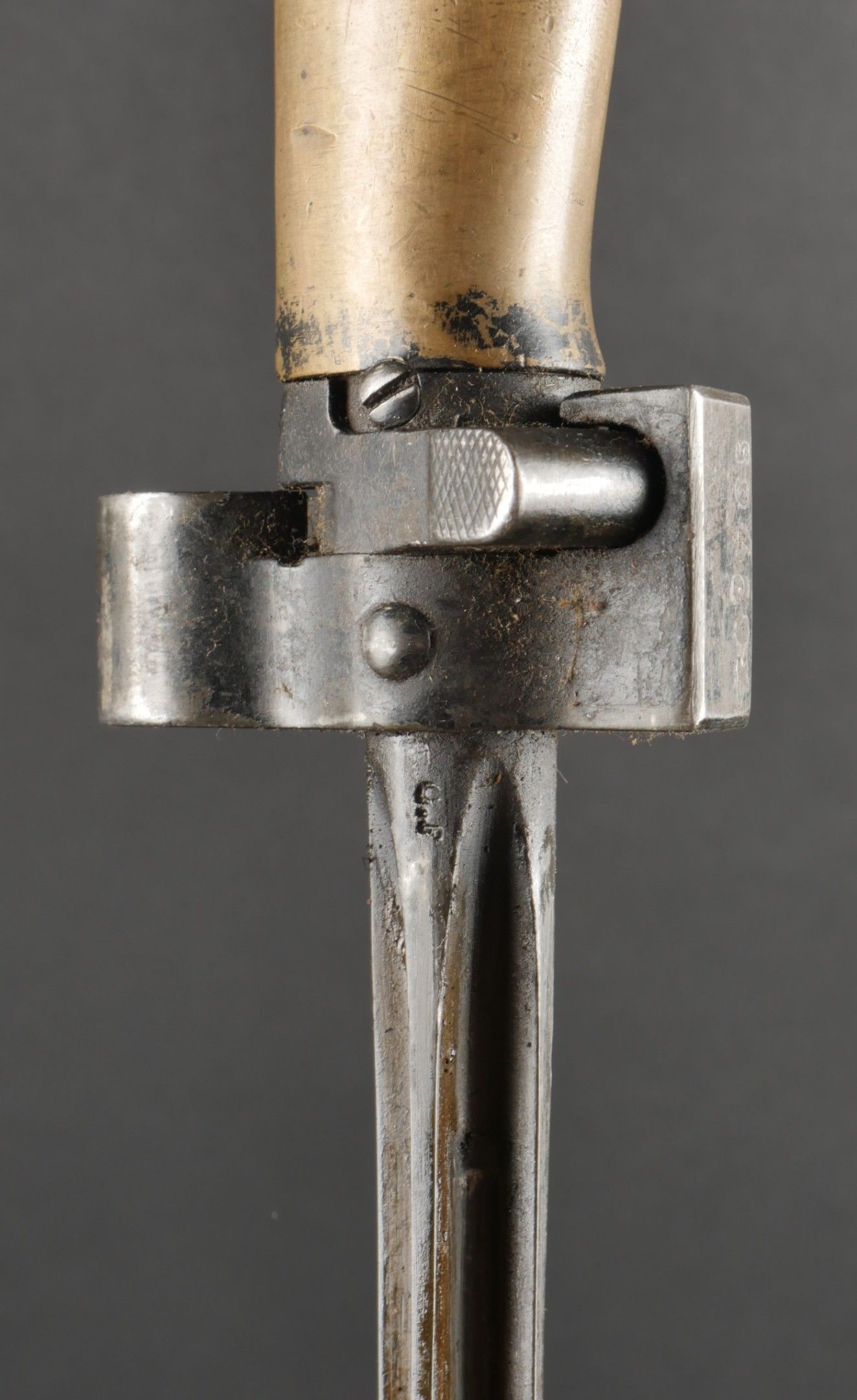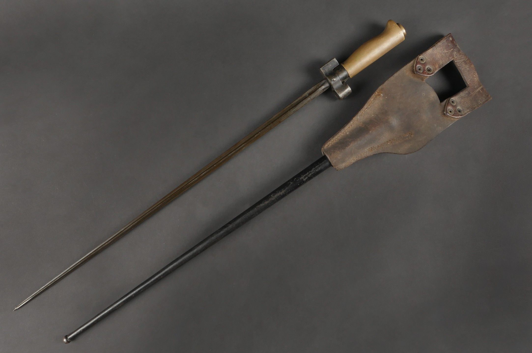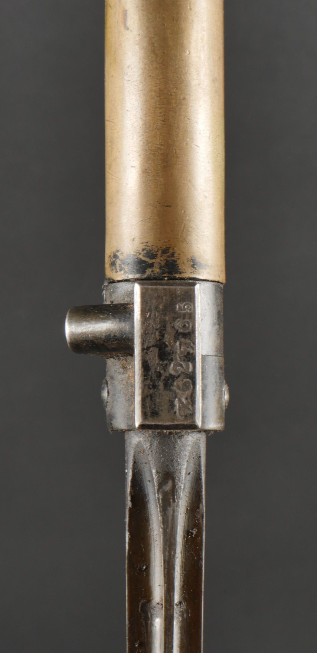 Lebel 1886 bayonet. Simplified model, brass grip, blade in its original length and tanning. Number 62765, functional push button. Black painted scabbard originally mounted on its brown leather scabbard holder, clamp a little dry not allowing to check the number of the scabbard, riveted leather bearing the serial number Y5845. Lebel bayonet 1886. Simplified model with brass handle, blade in its original length and finish. Number 62765, functional push button. Blackpainted scabbard originally mounted on its brown leather frog, fastening strap slightly dry preventing verification of the scabbard number, leather strap riveted and marked Y5845.