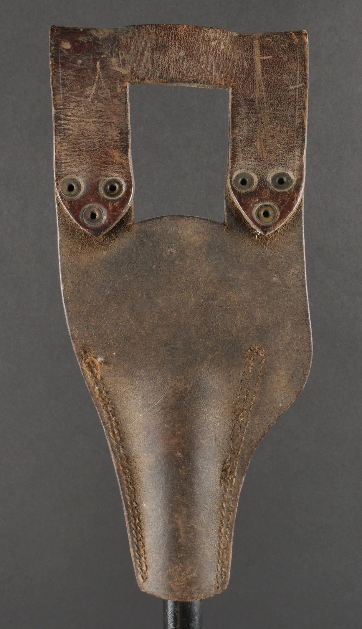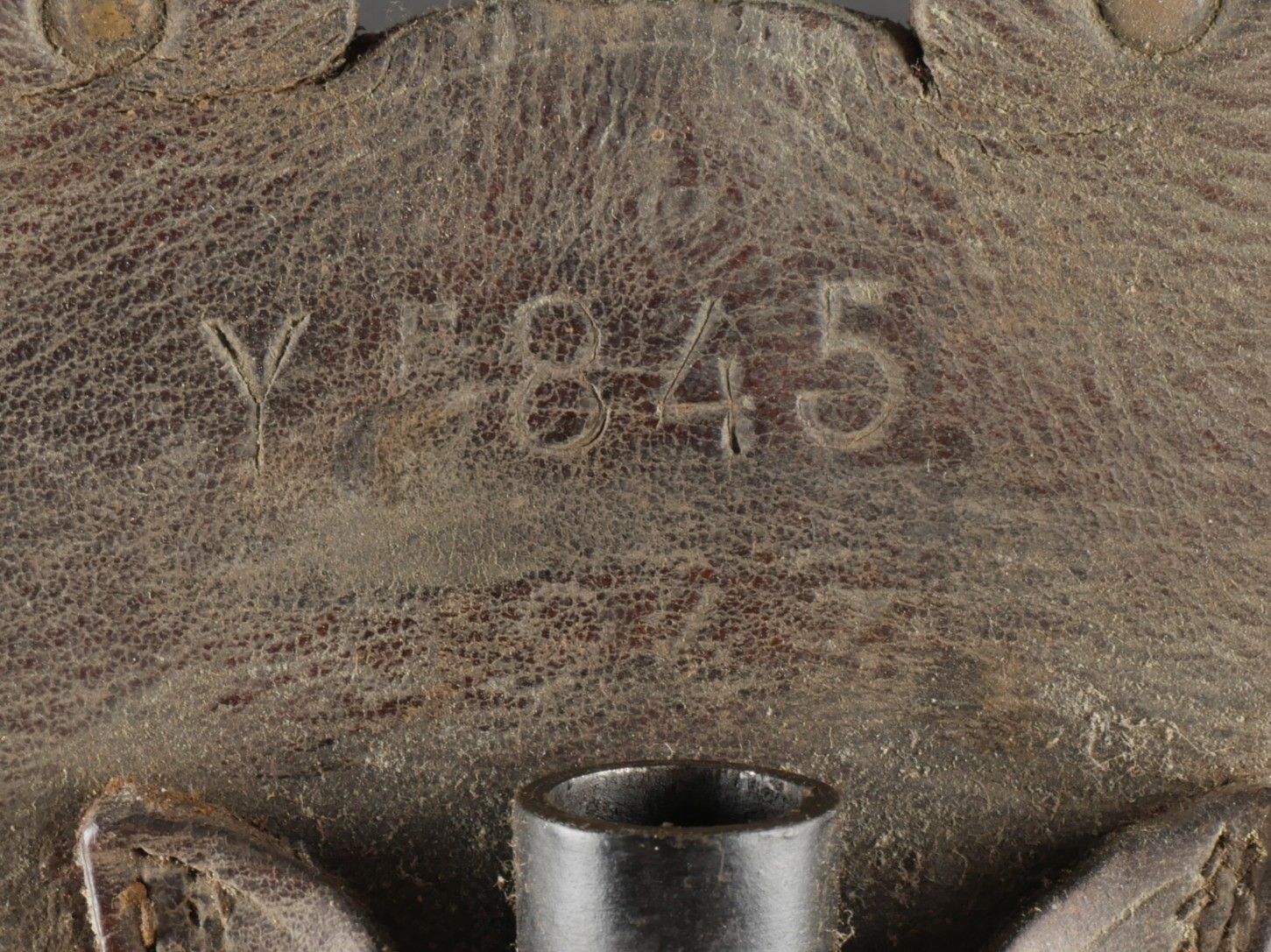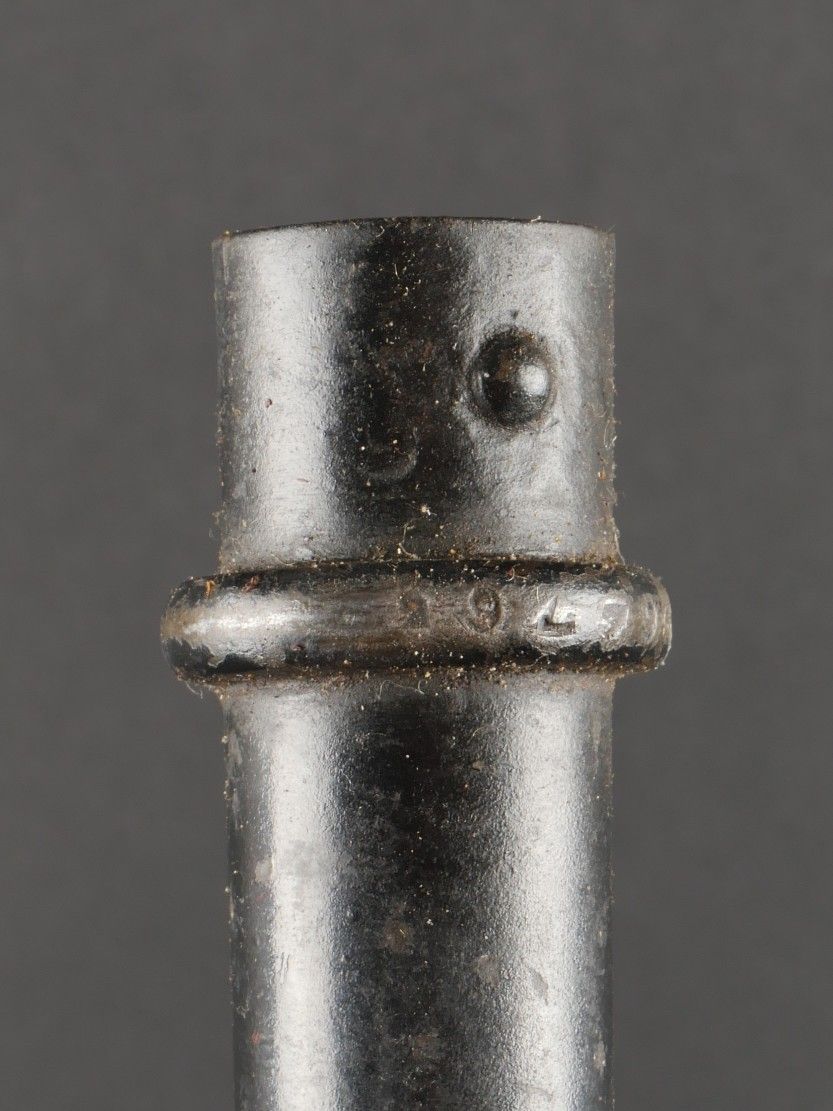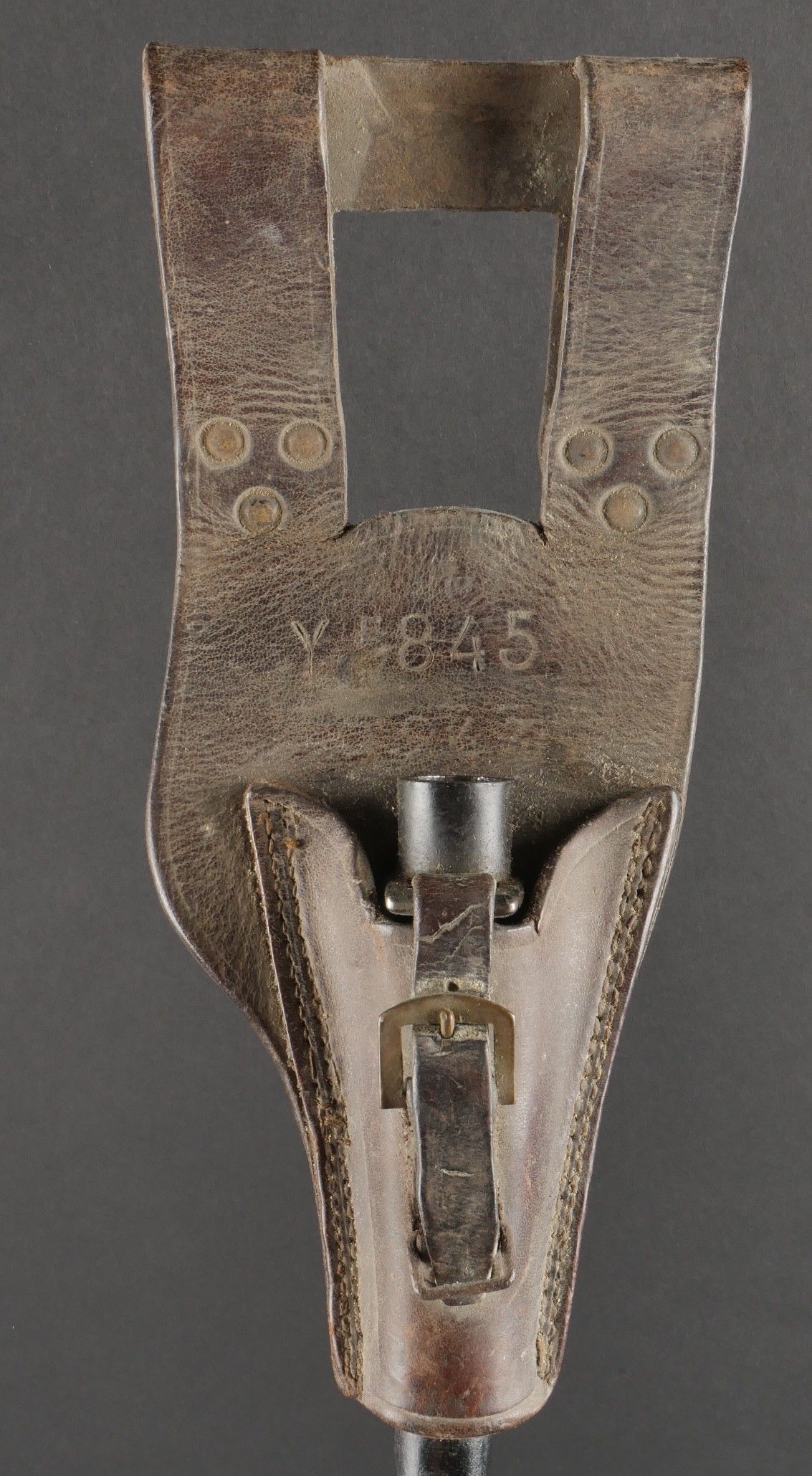 Lebel 1886 bayonet. Simplified model, brass grip, blade in its original length and tanning. Number 62765, functional push button. Black painted scabbard originally mounted on its brown leather scabbard holder, clamp a little dry not allowing to check the number of the scabbard, riveted leather bearing the serial number Y5845. Lebel bayonet 1886. Simplified model with brass handle, blade in its original length and finish. Number 62765, functional push button. Blackpainted scabbard originally mounted on its brown leather frog, fastening strap slightly dry preventing verification of the scabbard number, leather strap riveted and marked Y5845.
