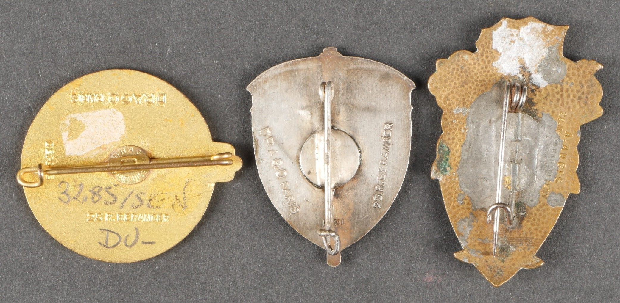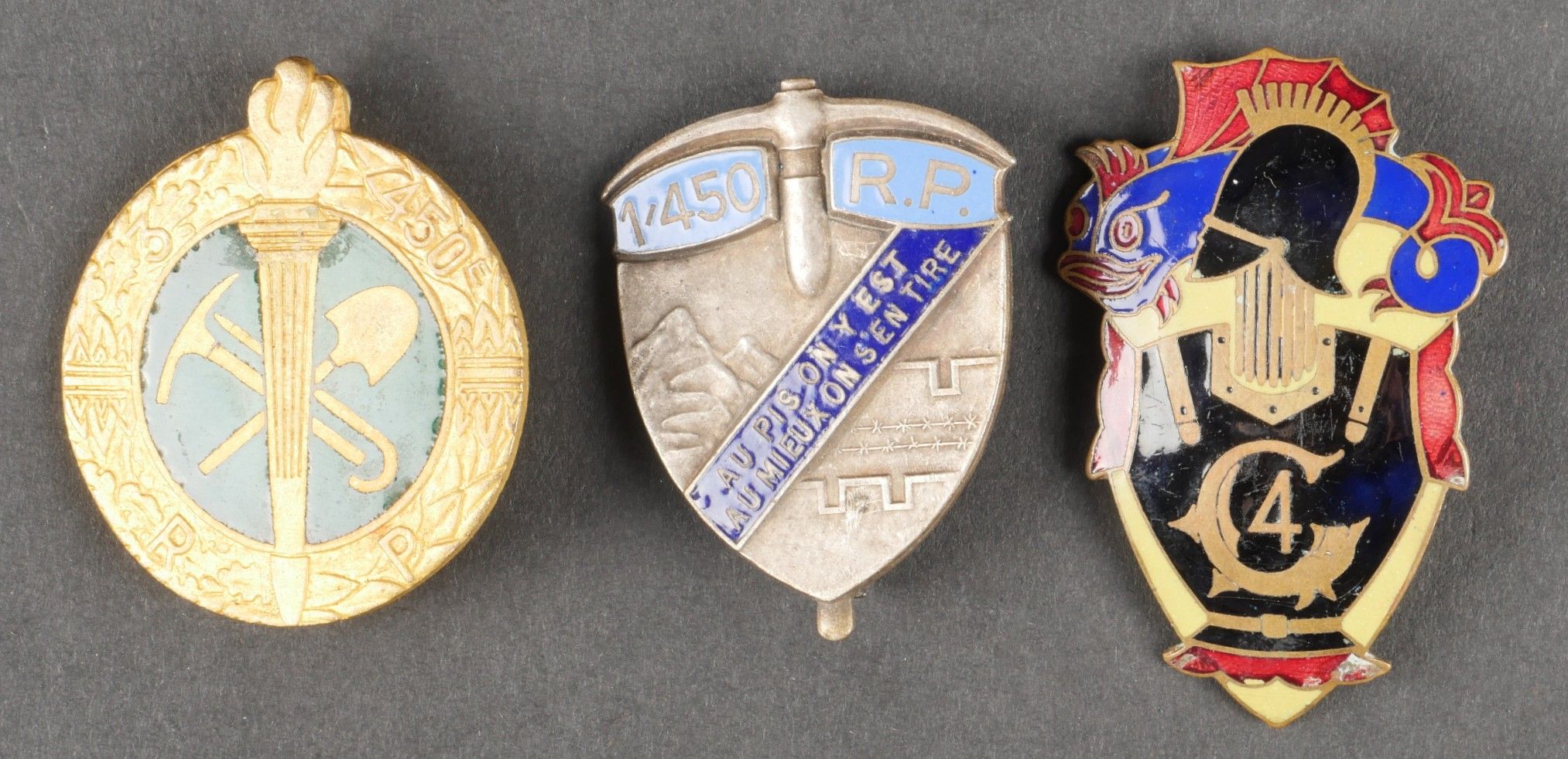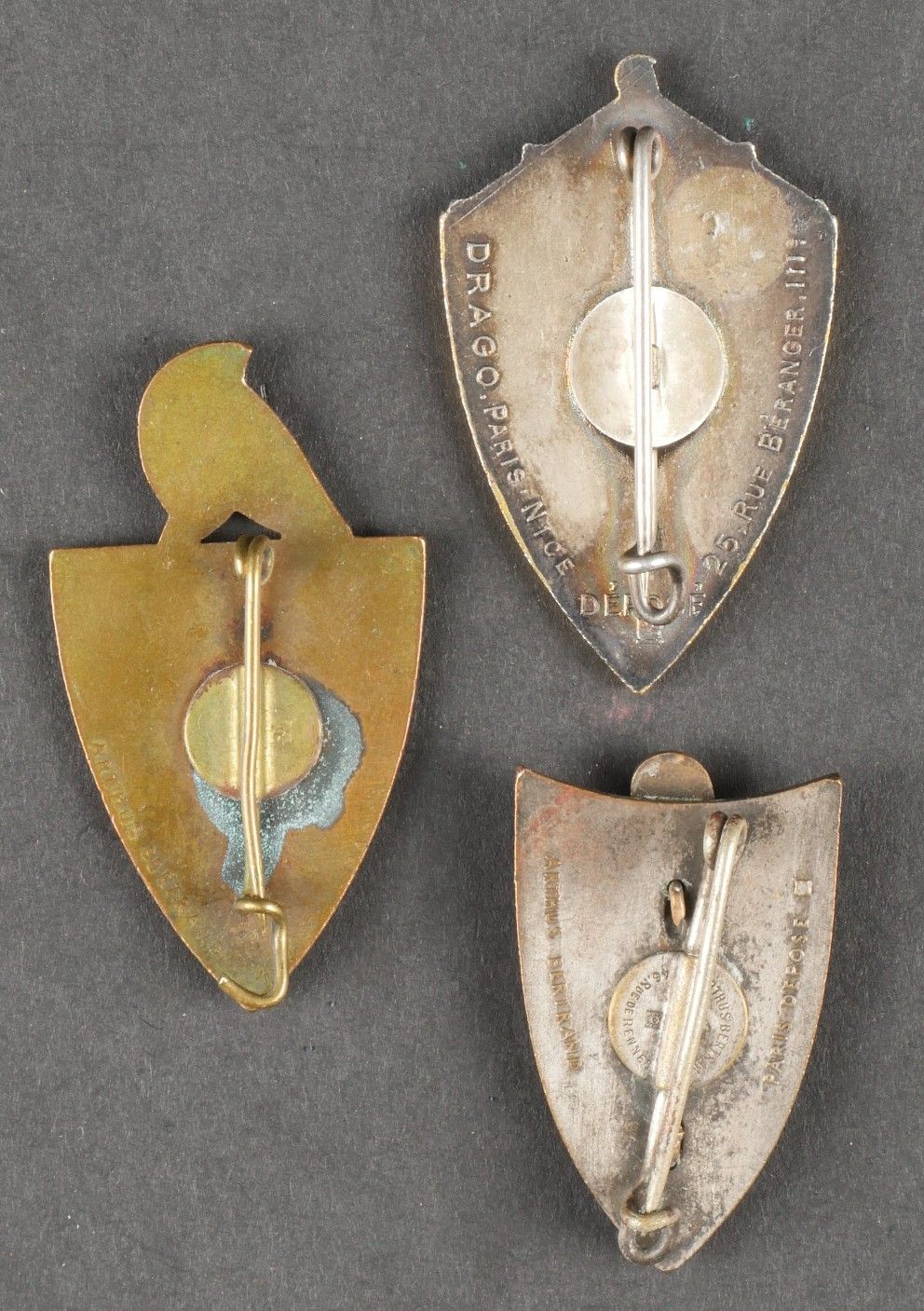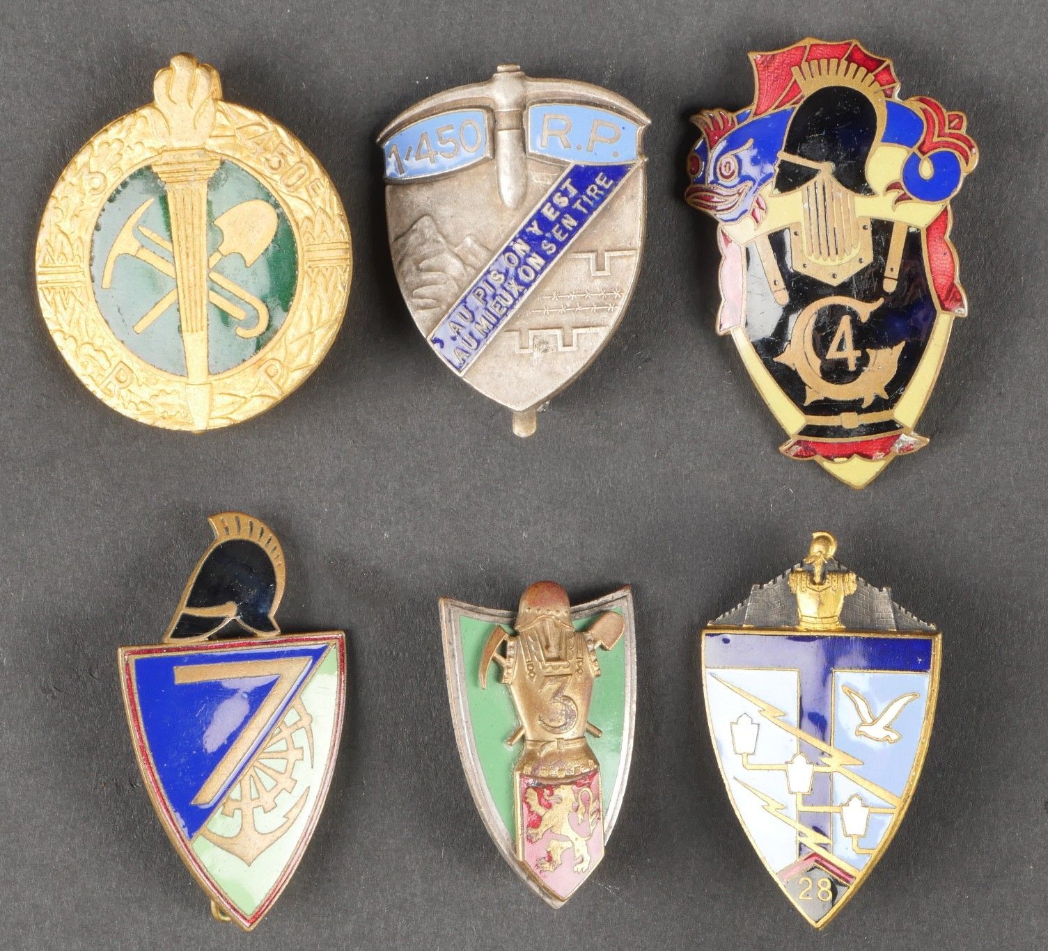 Set of engineer and pioneer badges. Comprising an enamelled 7th Engineers badge made by Arthus Bertrand, with punched bolero. A 4th Engineers badge with chips, made by Augis, attachment not in order. A 3rd Engineers badge in two parts made by Arthus Bertrand, address on bolero. A Drago Béranger 3rd Battalion 450th Pioneer Regiment badge. A Drago Béranger 1st battalion 450th pioneer badge. A Drago Béranger 28th Signal Regiment badge. Lot of engineer and pioneer insignia. Including a 7th Engineer enamel badge by Arthus Bertrand, a 4th Engineer badge with enamel losses by Augis, a 3rd Engineer twopiece badge by Arthus Bertrand, a 3rd Battalion 450th Pioneer Regiment badge by Drago Béranger, a 1st Battalion 450th Pioneer Regiment badge by Drago Béranger, and a 28th Transmission Regiment badge by Drago Béranger.