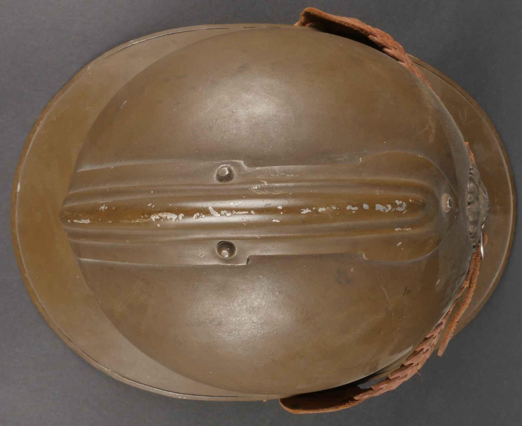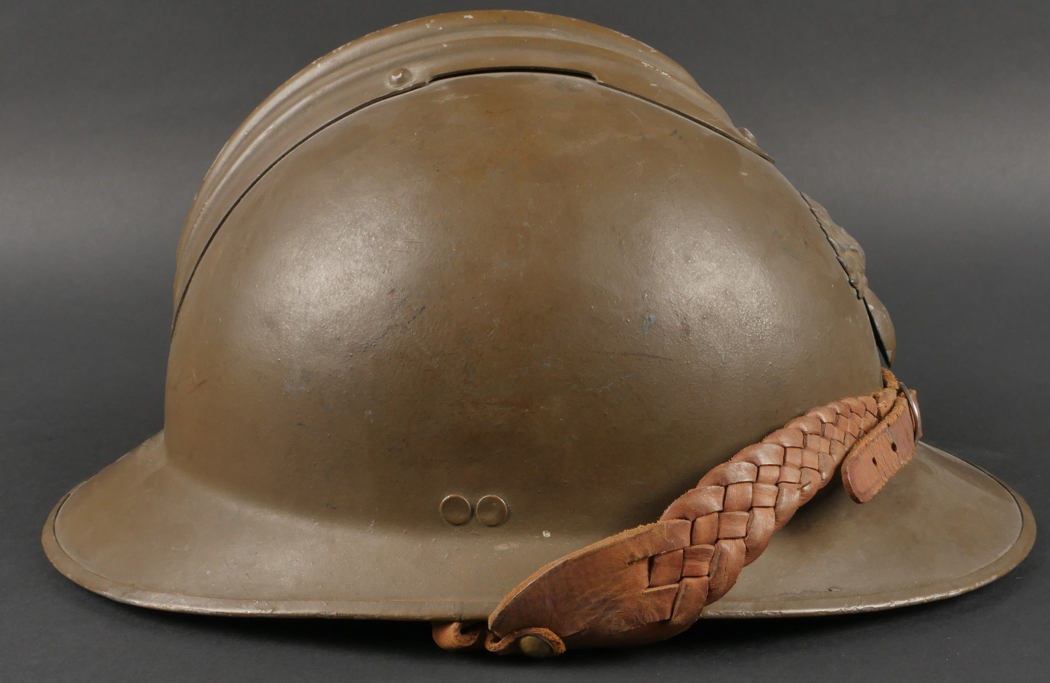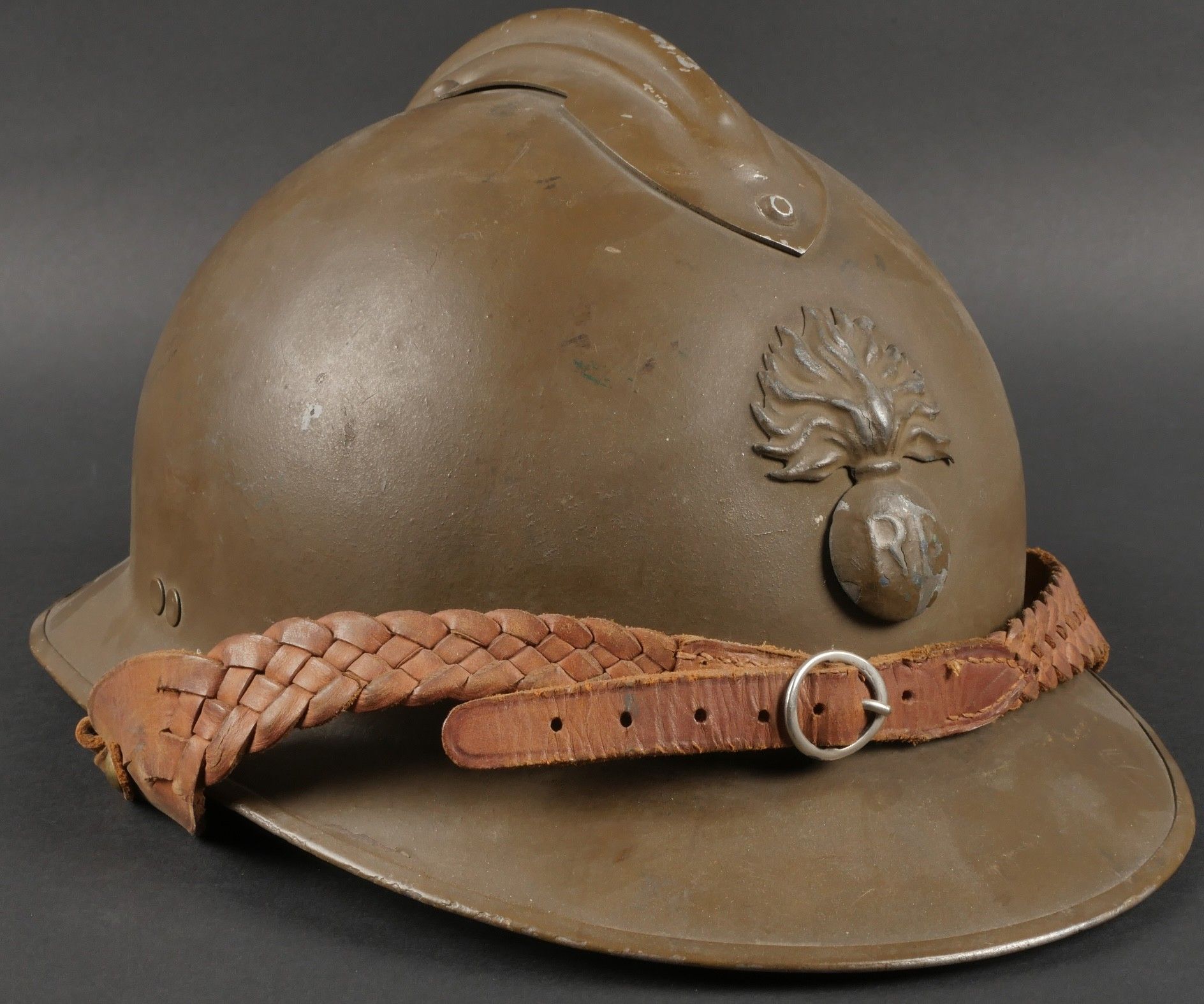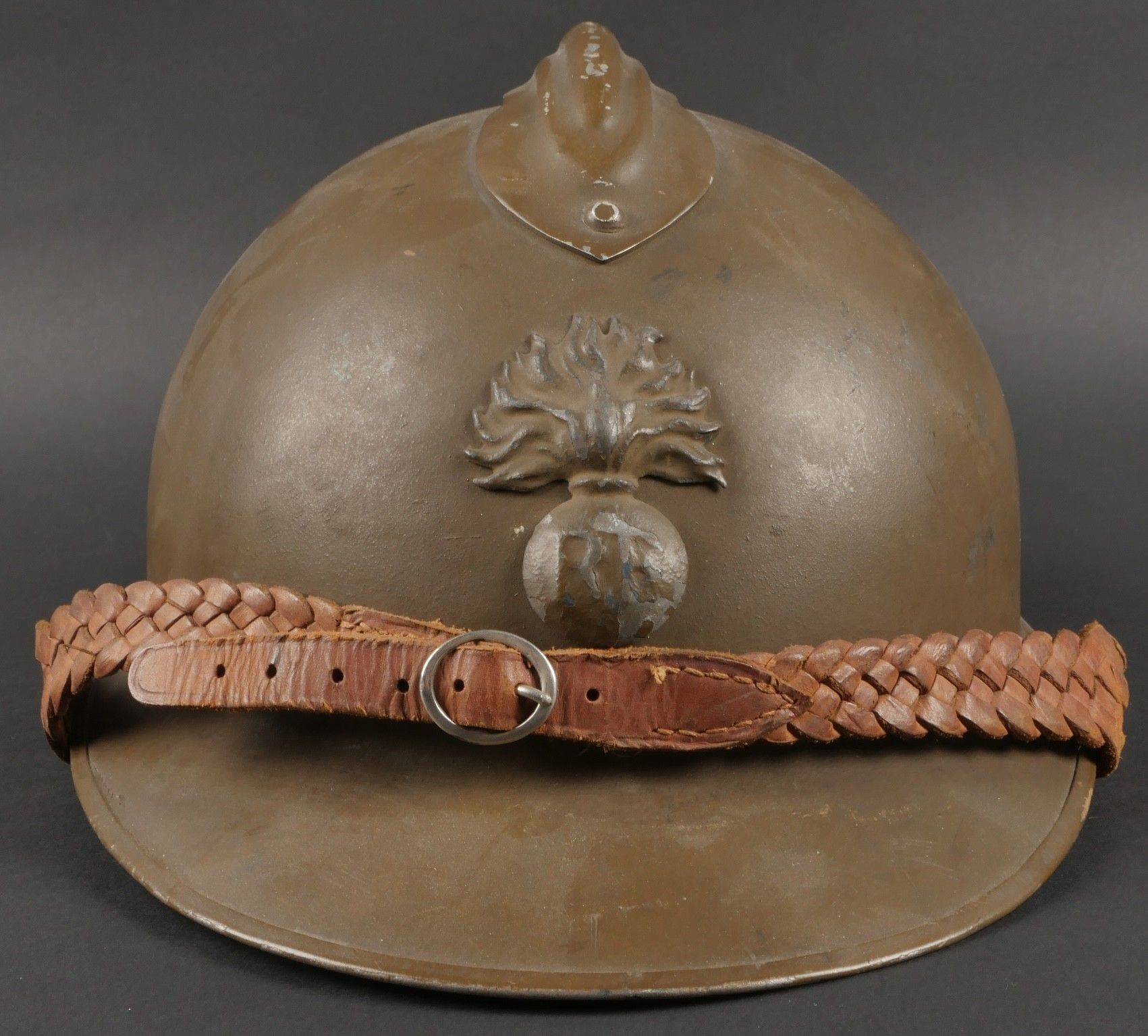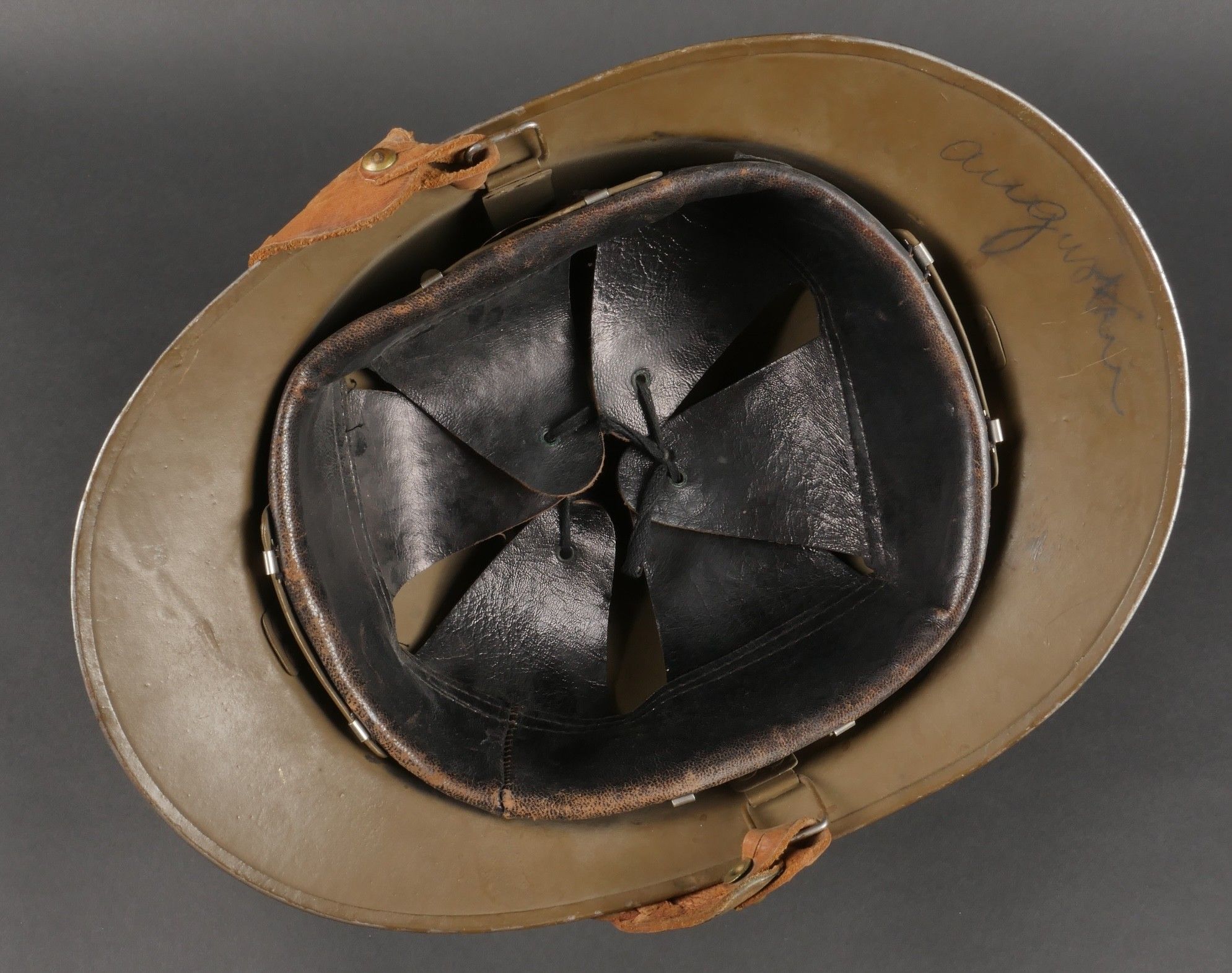 Adrian 1926 infantry officer helmet. Model 1926, 95% khaki paint, model 1915 infantry crest in aluminium with 85% paint. Officer-style leather chinstrap, leather cap with six wolf teeth held by eight clasps, one eyelet damaged. Made by Japy in size B, the officer inscribed his name in the Augustin nape of the neck. Adrian helmet 1926 infantry officer. Model 1926 with 95% of its khaki paint fitted with the 1915 infantry emblem. Aluminum comb retaining 85% of its original paint. Officer type leather chinstrap and sixtongue leather liner held by eight clips with one damaged eyelet. Manufactured by Japy, size B. The officer's name Augustin is inscribed inside the neck guard.