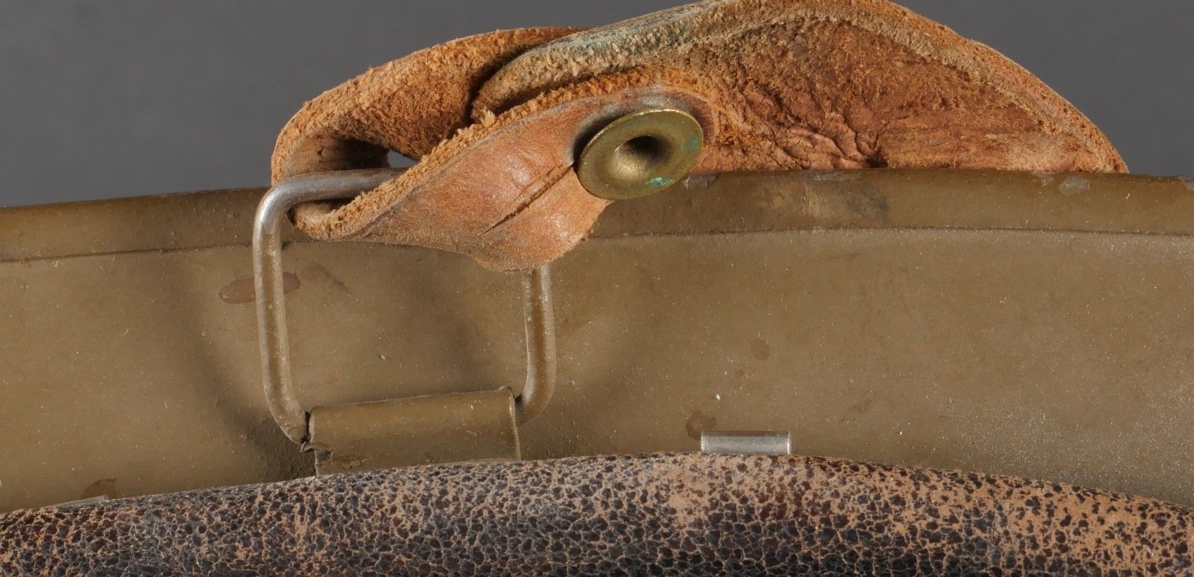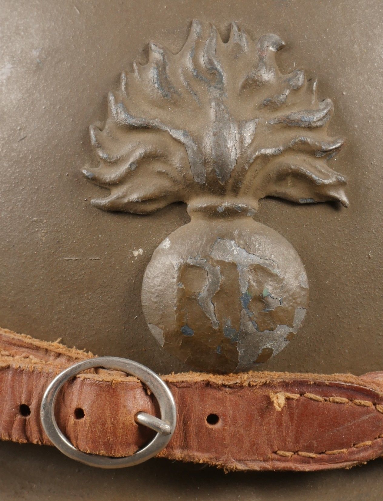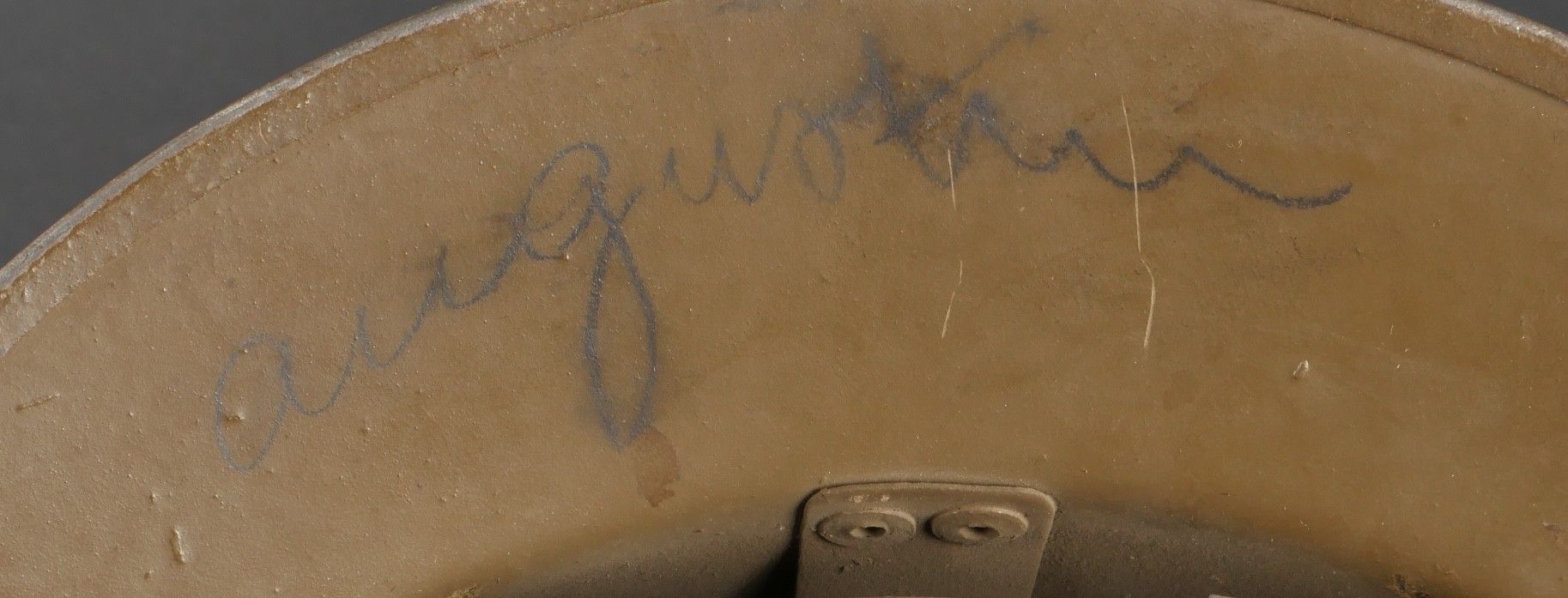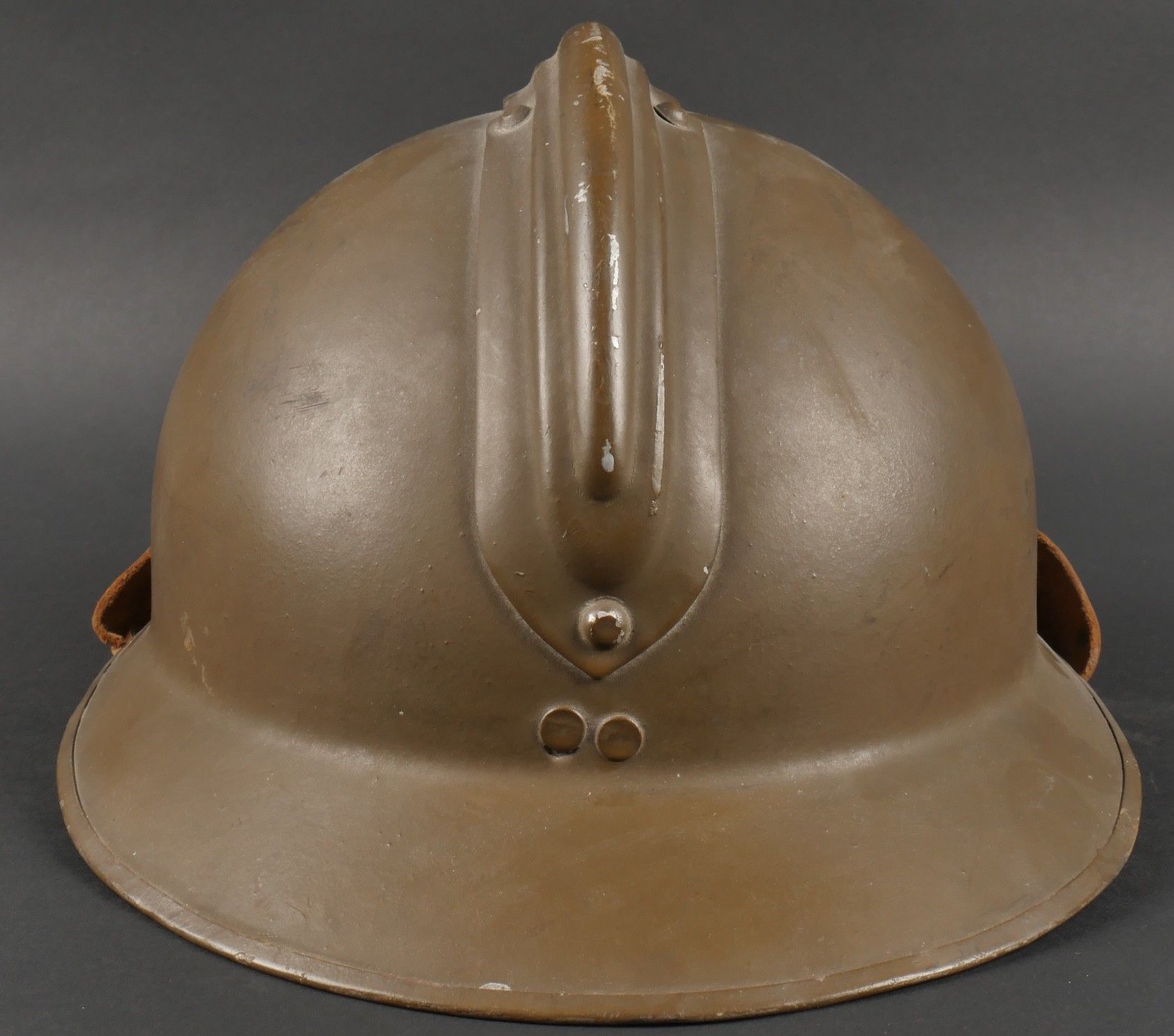 Adrian 1926 infantry officer helmet. Model 1926, 95% khaki paint, model 1915 infantry crest in aluminium with 85% paint. Officer-style leather chinstrap, leather cap with six wolf teeth held by eight clasps, one eyelet damaged. Made by Japy in size B, the officer inscribed his name in the Augustin nape of the neck. Adrian helmet 1926 infantry officer. Model 1926 with 95% of its khaki paint fitted with the 1915 infantry emblem. Aluminum comb retaining 85% of its original paint. Officer type leather chinstrap and sixtongue leather liner held by eight clips with one damaged eyelet. Manufactured by Japy, size B. The officer's name Augustin is inscribed inside the neck guard.