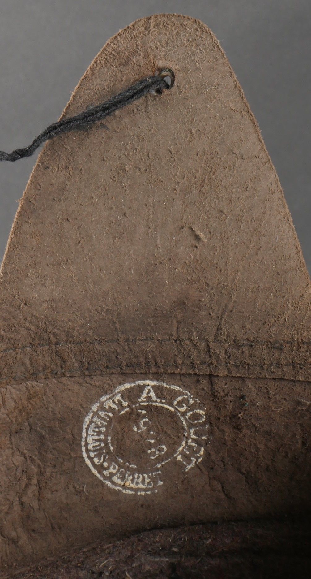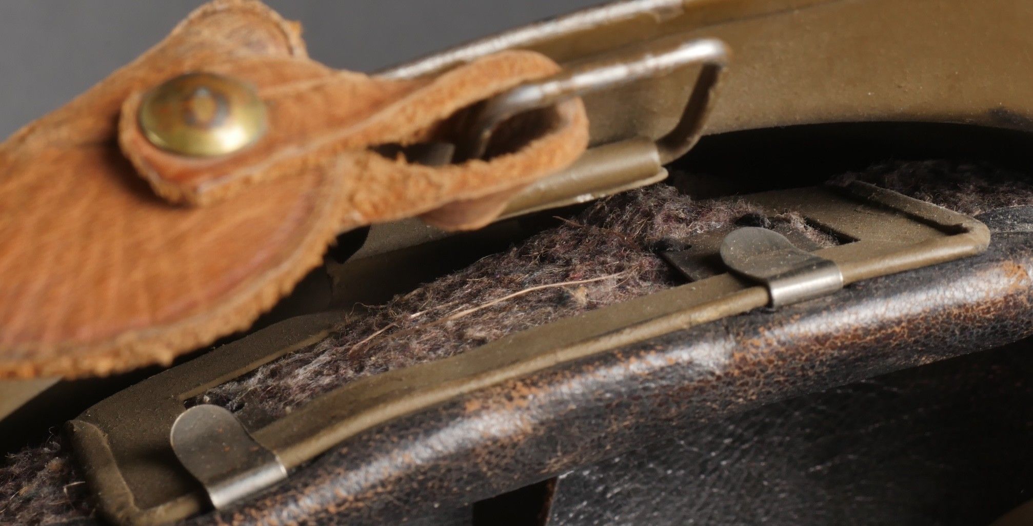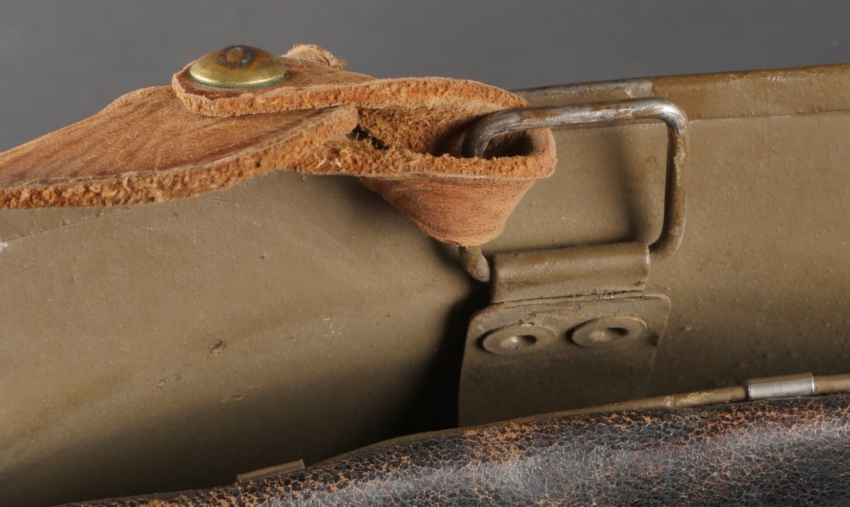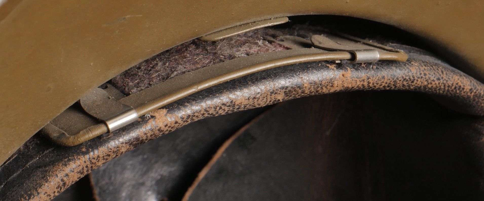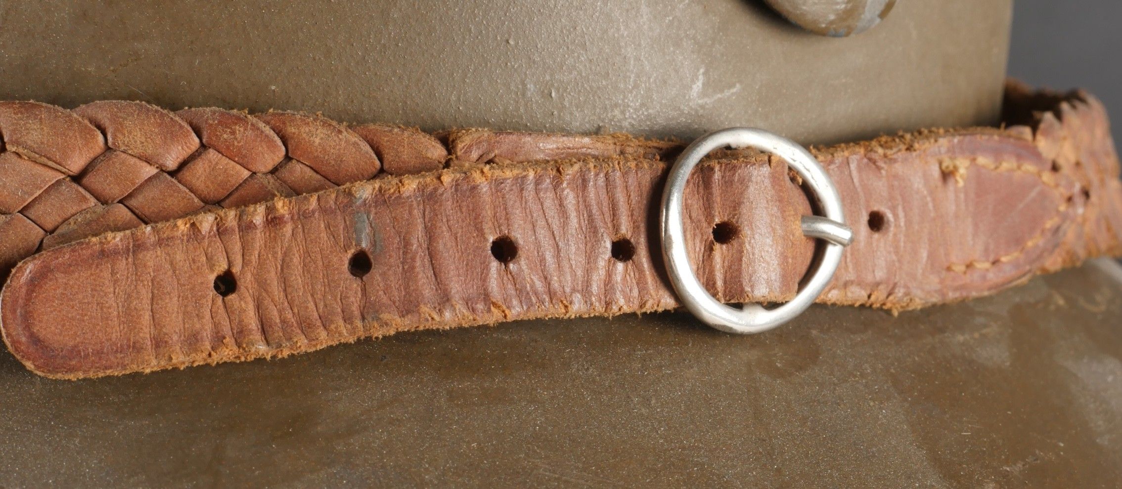 Adrian 1926 infantry officer helmet. Model 1926, 95% khaki paint, model 1915 infantry crest in aluminium with 85% paint. Officer-style leather chinstrap, leather cap with six wolf teeth held by eight clasps, one eyelet damaged. Made by Japy in size B, the officer inscribed his name in the Augustin nape of the neck. Adrian helmet 1926 infantry officer. Model 1926 with 95% of its khaki paint fitted with the 1915 infantry emblem. Aluminum comb retaining 85% of its original paint. Officer type leather chinstrap and sixtongue leather liner held by eight clips with one damaged eyelet. Manufactured by Japy, size B. The officer's name Augustin is inscribed inside the neck guard.