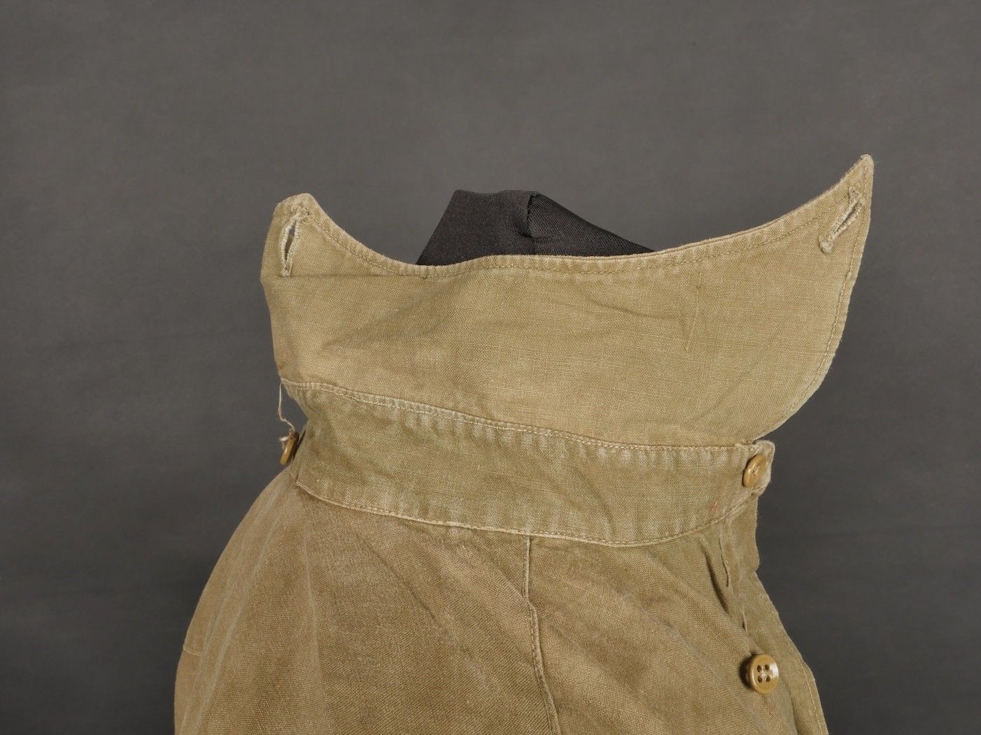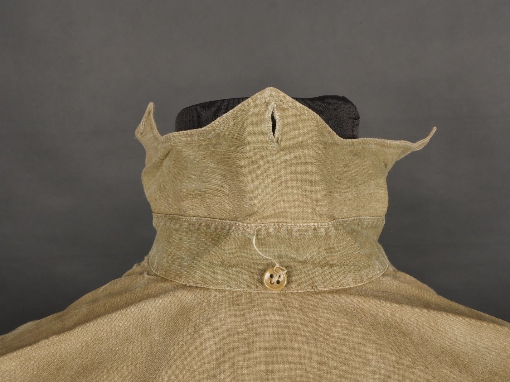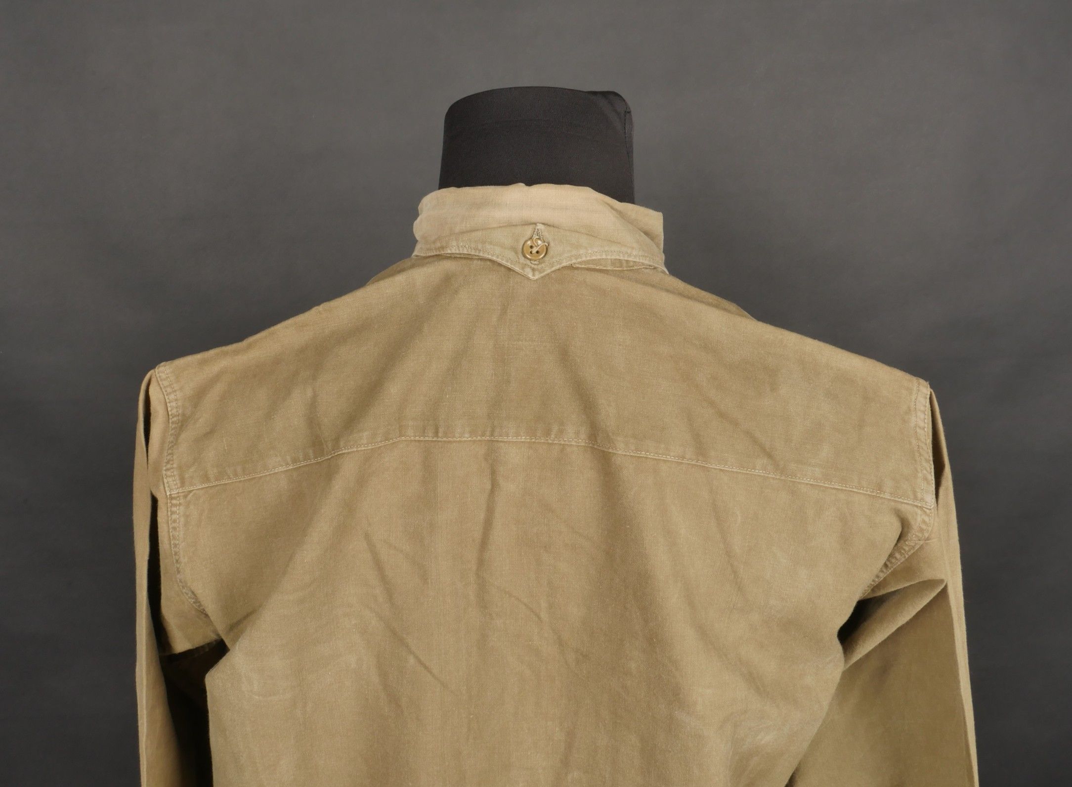 1935 shirt. Regulation model in khaki fabric fastened by three buttons, buttons on back of collar present. Original square of cloth sewn on the chest. Good mannequin size and overall good condition. 1935 shirt. Regulation model in khaki fabric closing with three buttons, rear collar buttons present. Original stitched cloth patch on the chest. Good mannequin size and overall good condition.