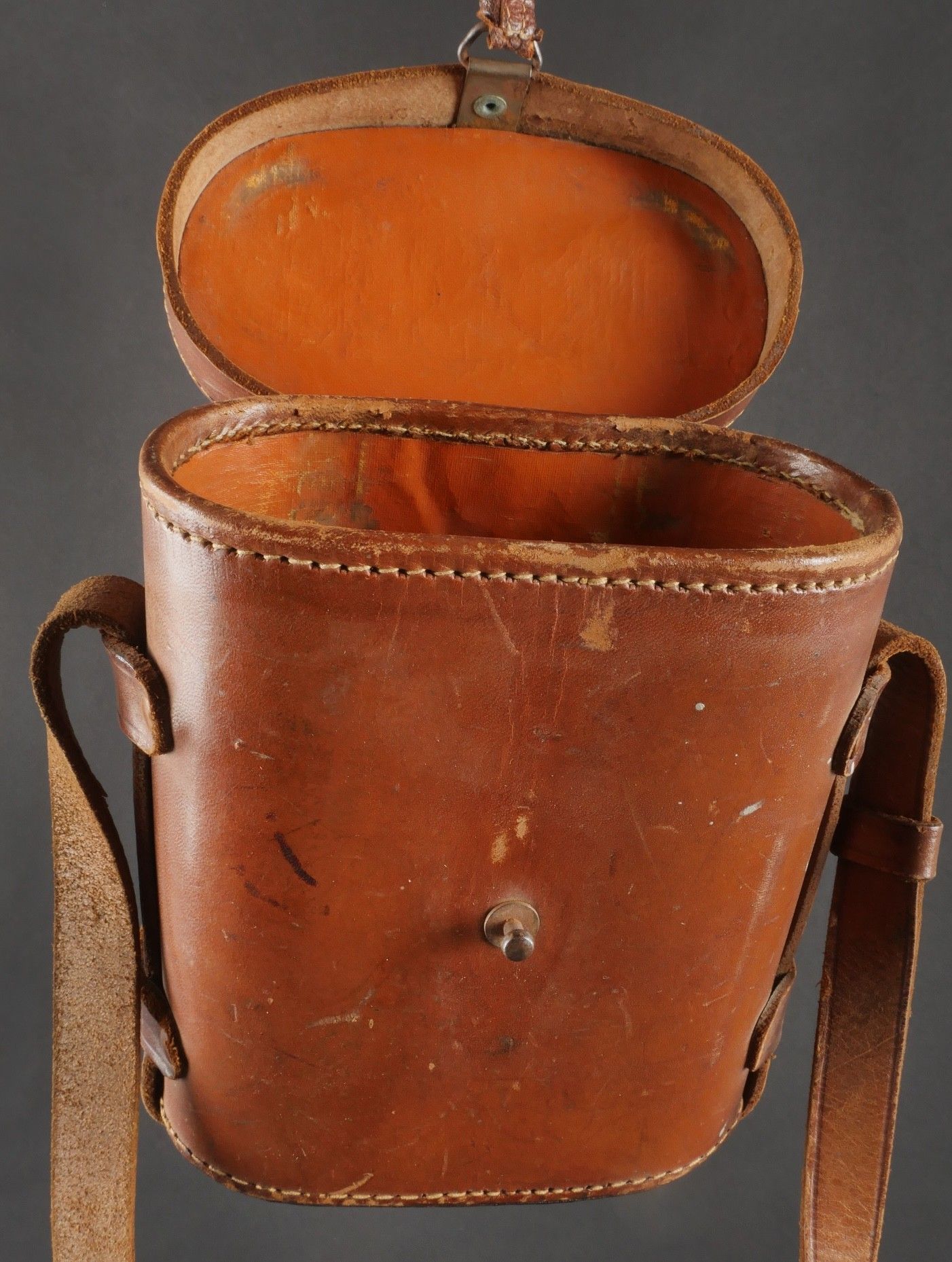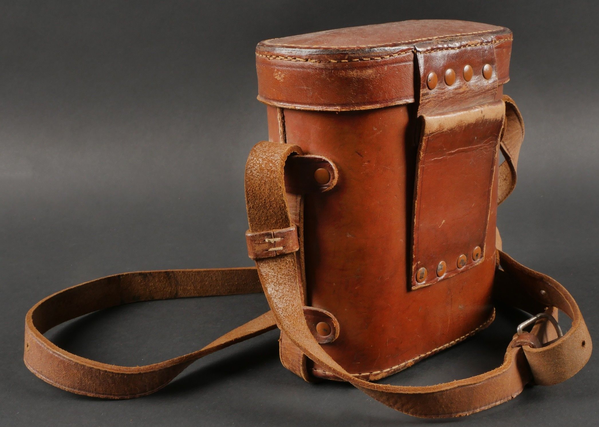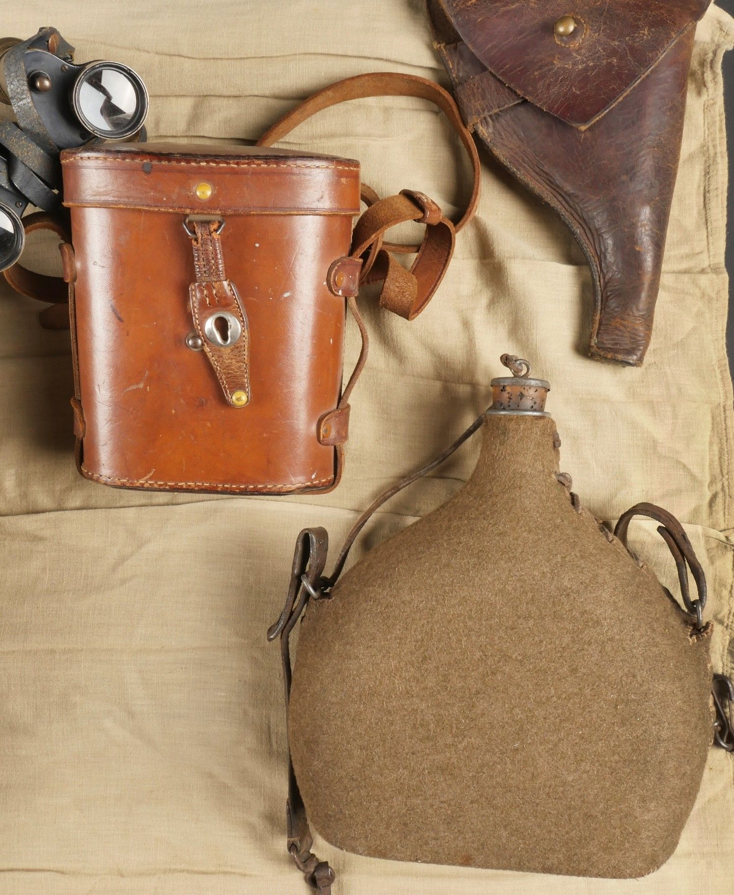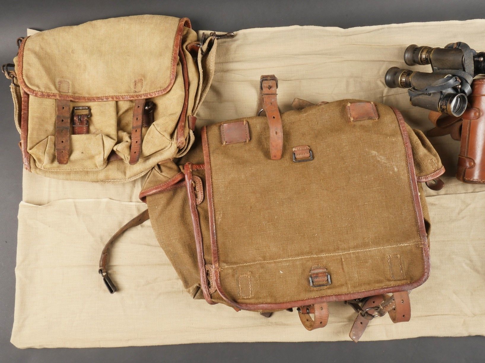 Lot of France 40 equipment comprising a 1935 model rucksack dated 1938, straps present with counter straps, name A.Pellerin. A model 1935 musette bag, illegible receipt stamp, illegible name on back, canvas strap present. A pair of Huet Decigrade binoculars, bakelite cups slightly damaged, optics blurred, with tan leather case and strap. A handmade tan leather revolver holster. A 1935 model canteen, khaki cloth cover, 1934 model strap. A khaki cotton chèche. Lot of France 40 equipment. Including a 1935 model backpack dated 1938 with straps and counter straps, named A. Pellerin. A 1935 model haversack with illegible acceptance stamp and name, strap present. A pair of binoculars by Huet Décigrade with slightly damaged bakelite eyecups, cloudy optics, housed in a fawn leather case with strap. A handcrafted fawn leather revolver holster. A 1935 model canteen with khaki cloth cover and 1934 model strap. A khaki cotton scarf.