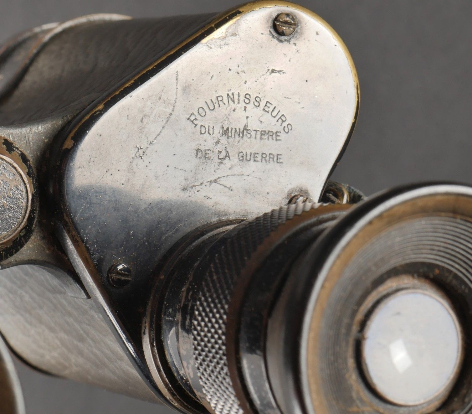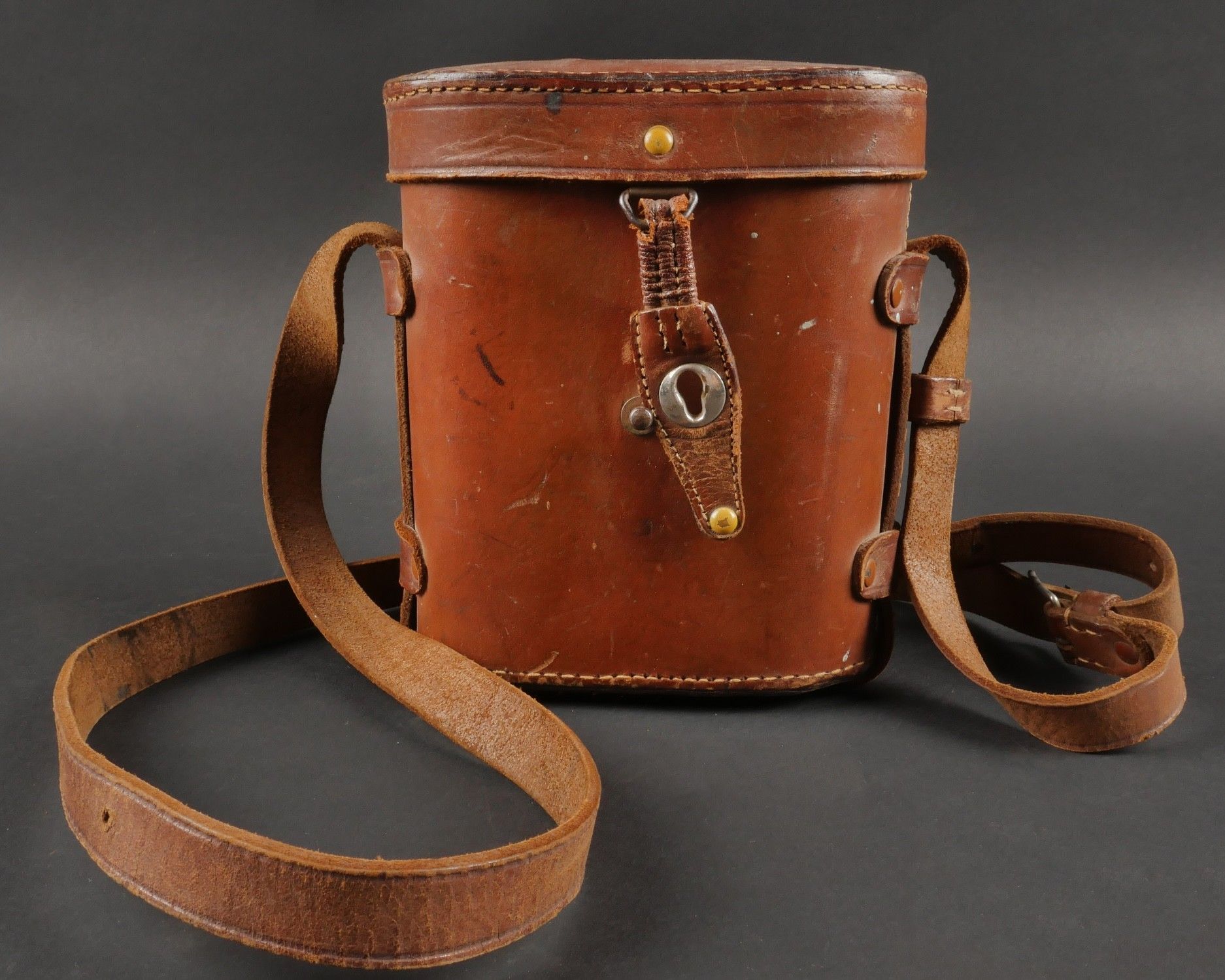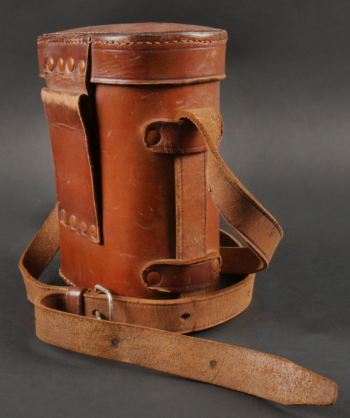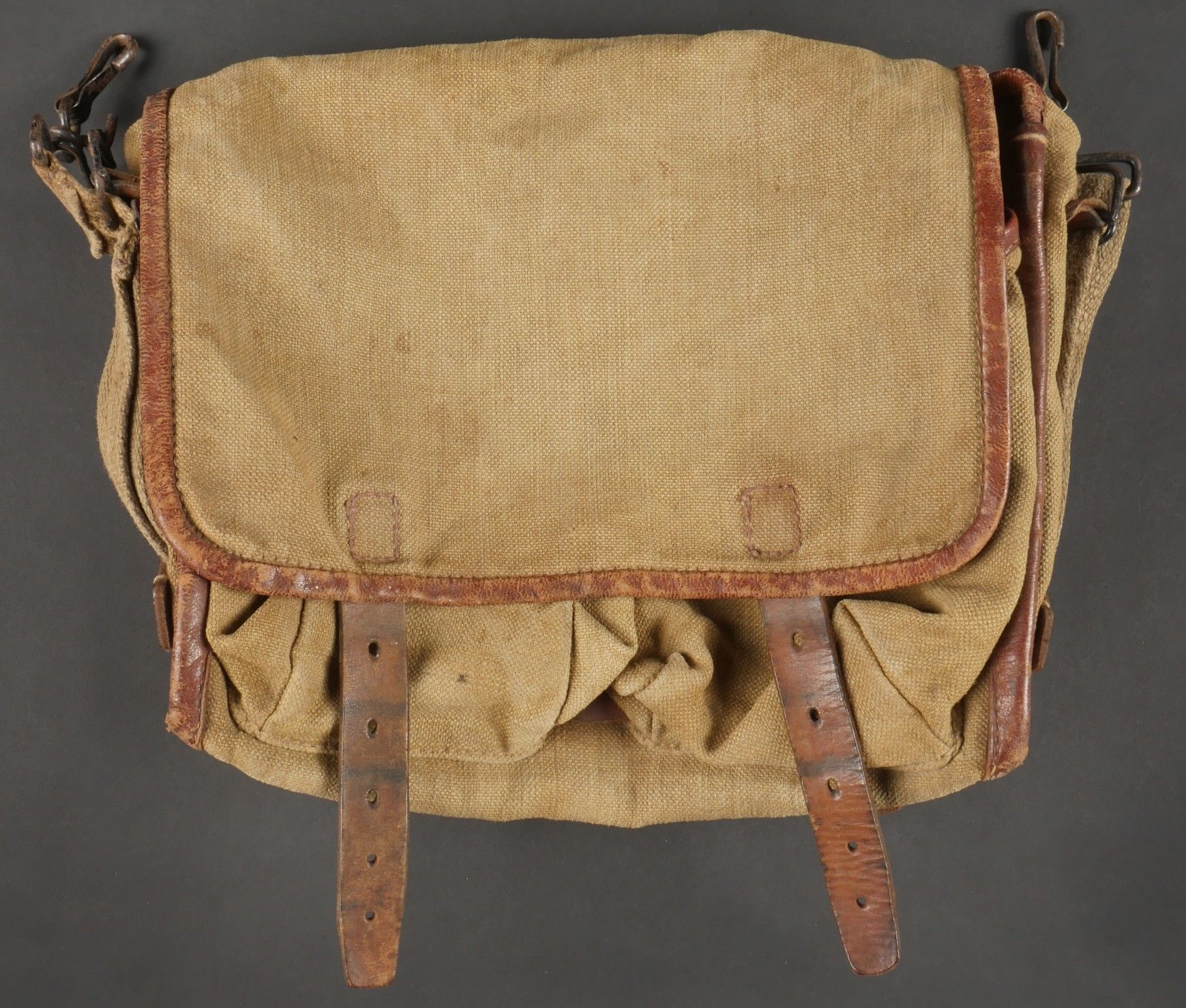Lot of France 40 equipment comprising a 1935 model rucksack dated 1938, straps present with counter straps, name A.Pellerin. A model 1935 musette bag, illegible receipt stamp, illegible name on back, canvas strap present. A pair of Huet Decigrade binoculars, bakelite cups slightly damaged, optics blurred, with tan leather case and strap. A handmade tan leather revolver holster. A 1935 model canteen, khaki cloth cover, 1934 model strap. A khaki cotton chèche. Lot of France 40 equipment. Including a 1935 model backpack dated 1938 with straps and counter straps, named A. Pellerin. A 1935 model haversack with illegible acceptance stamp and name, strap present. A pair of binoculars by Huet Décigrade with slightly damaged bakelite eyecups, cloudy optics, housed in a fawn leather case with strap. A handcrafted fawn leather revolver holster. A 1935 model canteen with khaki cloth cover and 1934 model strap. A khaki cotton scarf.