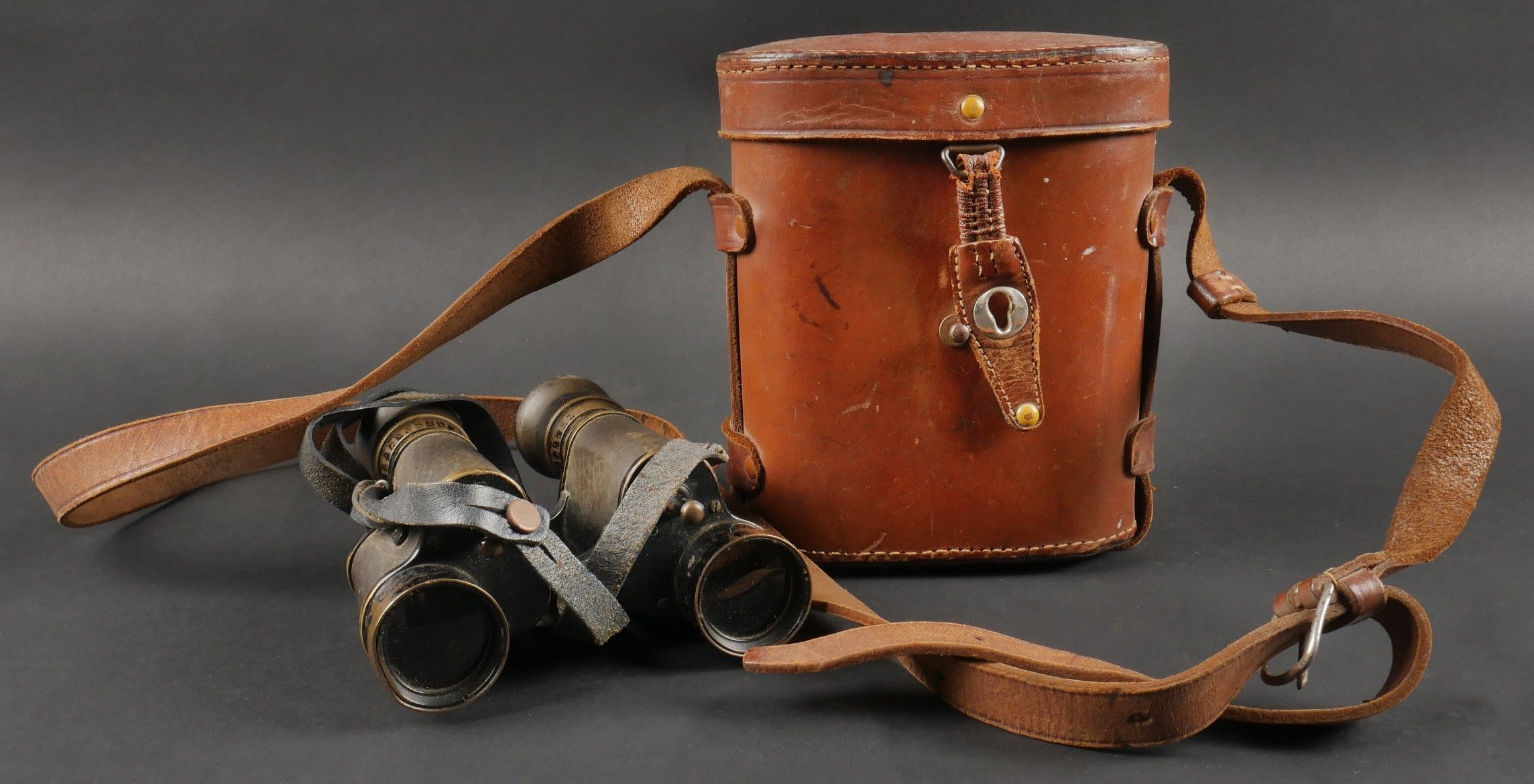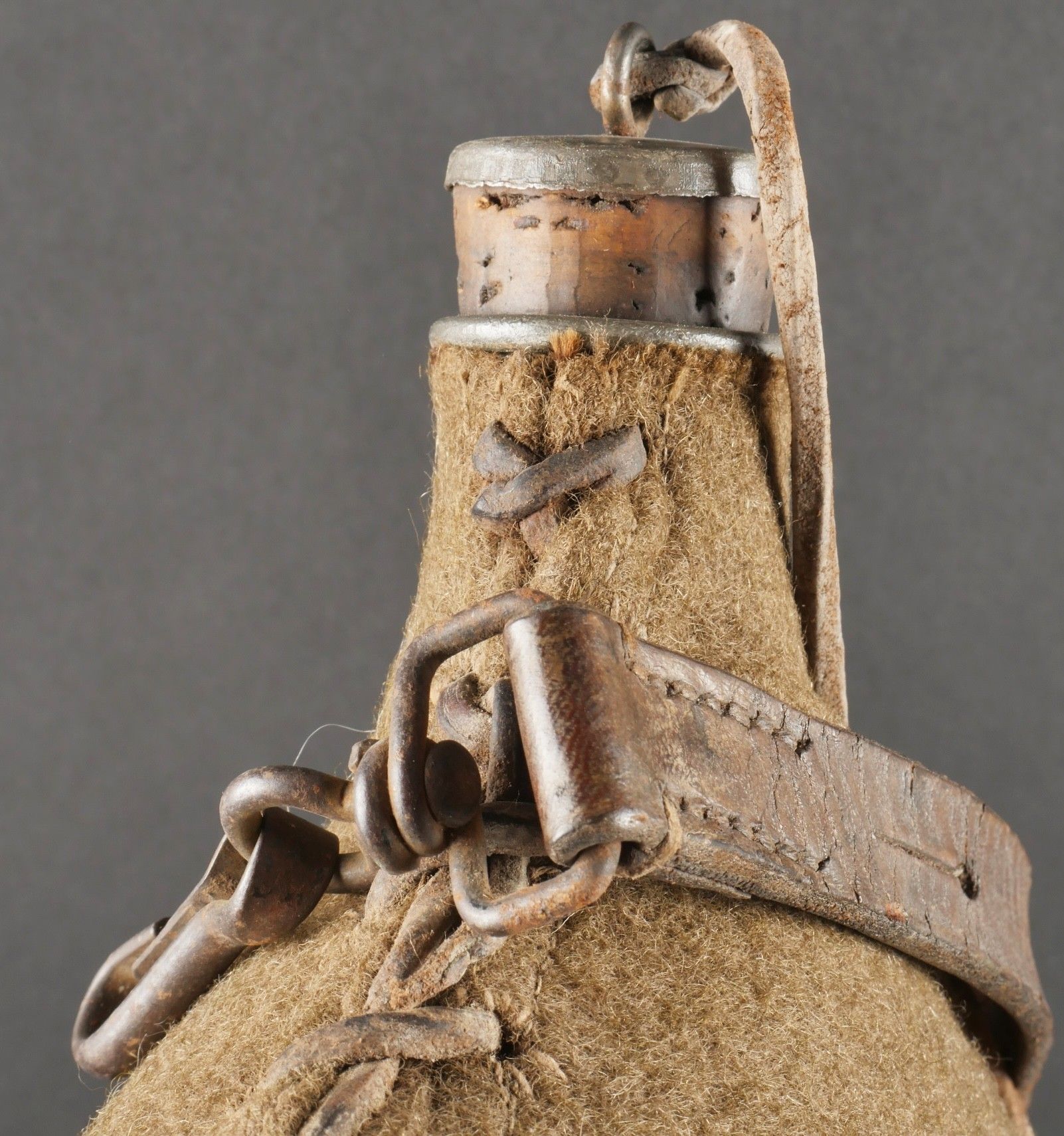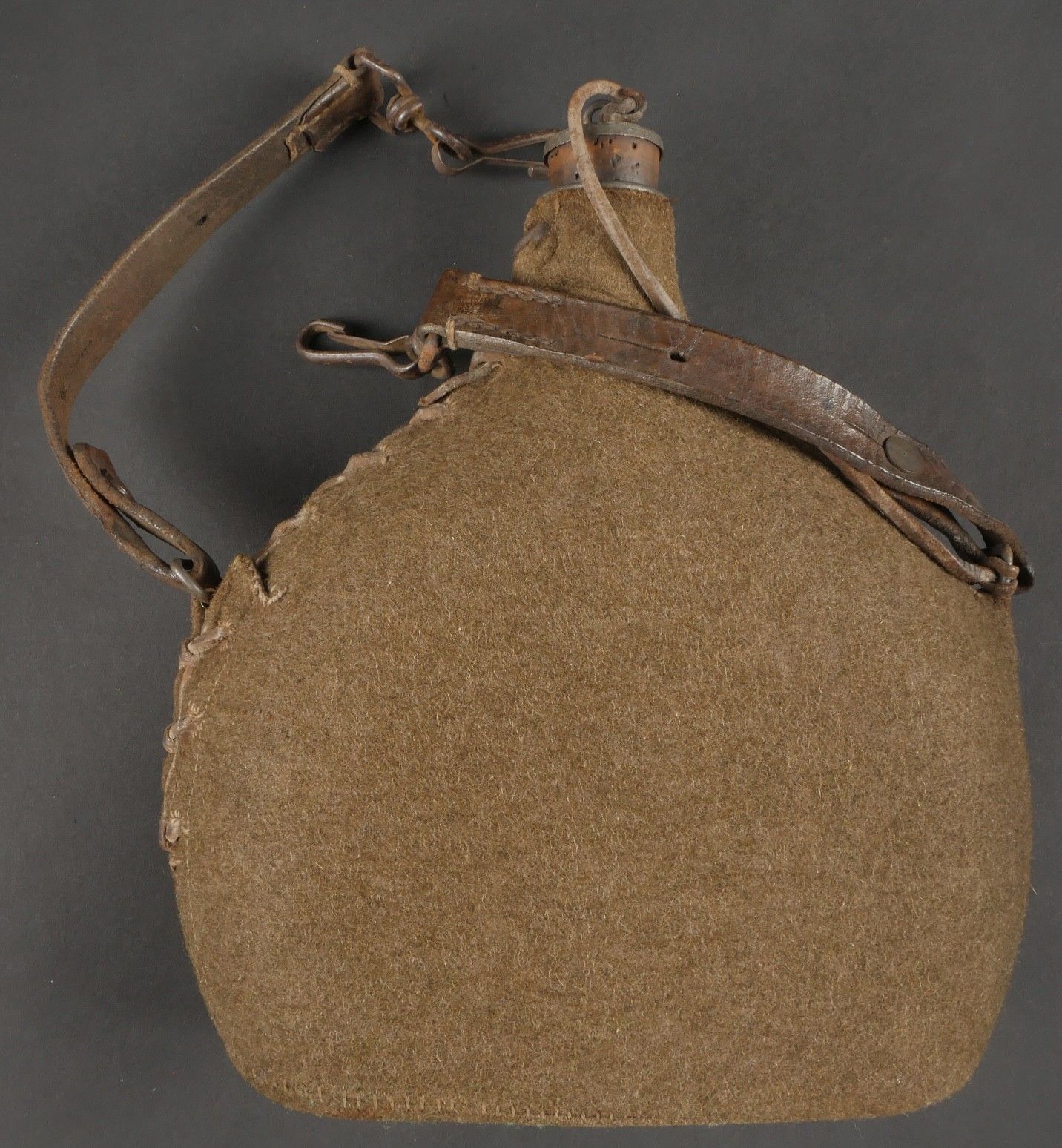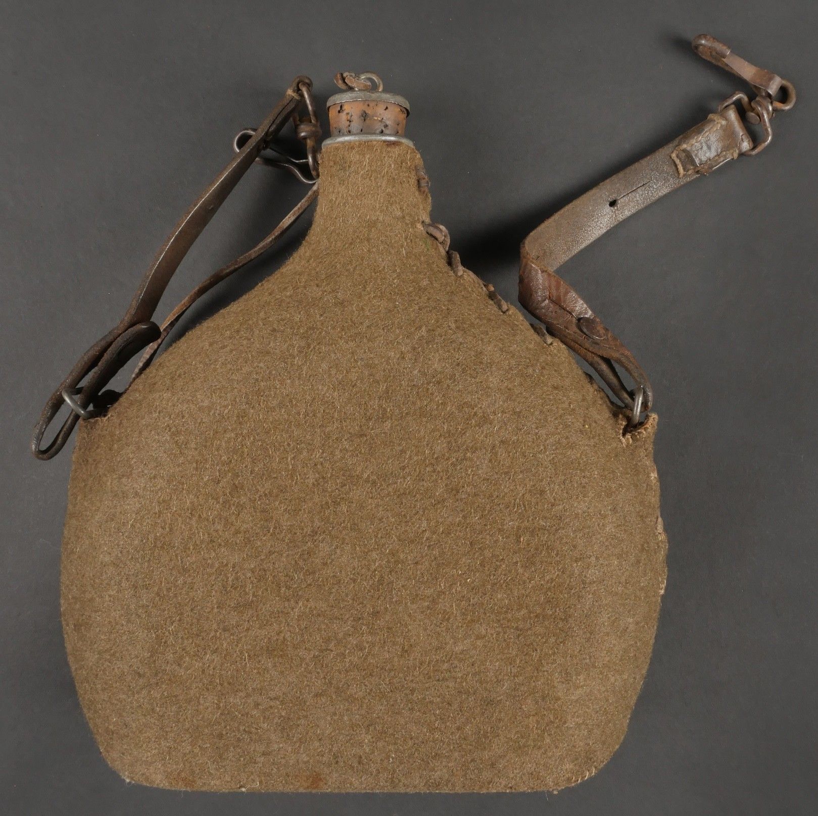 Lot of France 40 equipment comprising a 1935 model rucksack dated 1938, straps present with counter straps, name A.Pellerin. A model 1935 musette bag, illegible receipt stamp, illegible name on back, canvas strap present. A pair of Huet Decigrade binoculars, bakelite cups slightly damaged, optics blurred, with tan leather case and strap. A handmade tan leather revolver holster. A 1935 model canteen, khaki cloth cover, 1934 model strap. A khaki cotton chèche. Lot of France 40 equipment. Including a 1935 model backpack dated 1938 with straps and counter straps, named A. Pellerin. A 1935 model haversack with illegible acceptance stamp and name, strap present. A pair of binoculars by Huet Décigrade with slightly damaged bakelite eyecups, cloudy optics, housed in a fawn leather case with strap. A handcrafted fawn leather revolver holster. A 1935 model canteen with khaki cloth cover and 1934 model strap. A khaki cotton scarf.