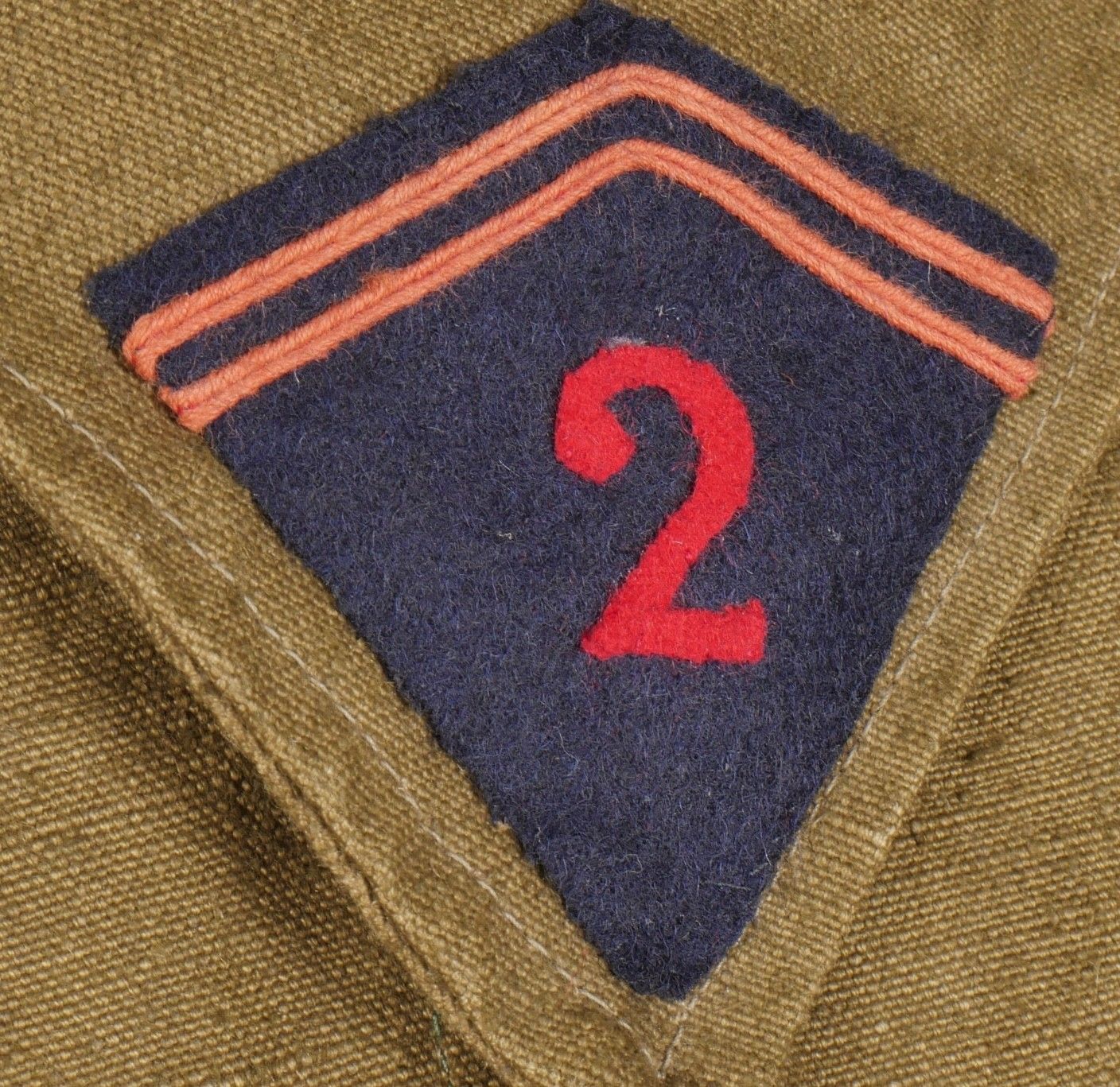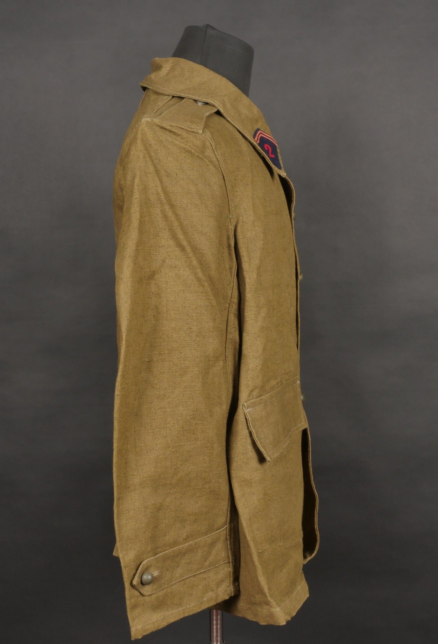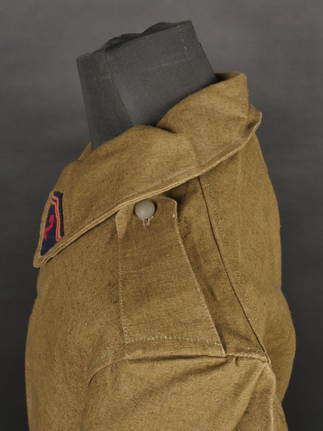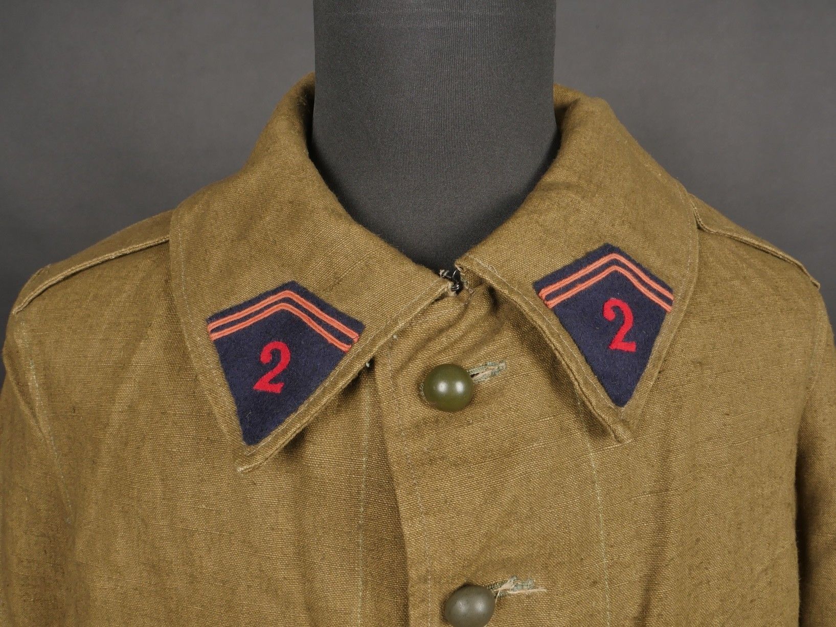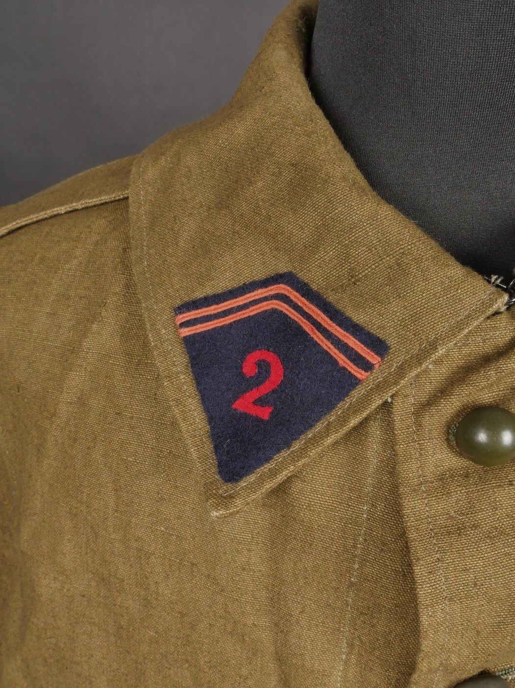 1935 2nd cuirassier jacket. Khaki canvas, fastened with five buttons. 2nd cuirassier troop collar tabs, khaki cotton lining marked size 2, date illegible. Belt tabs present. Condition new never issued. Tunic 1935 2nd cuirassier