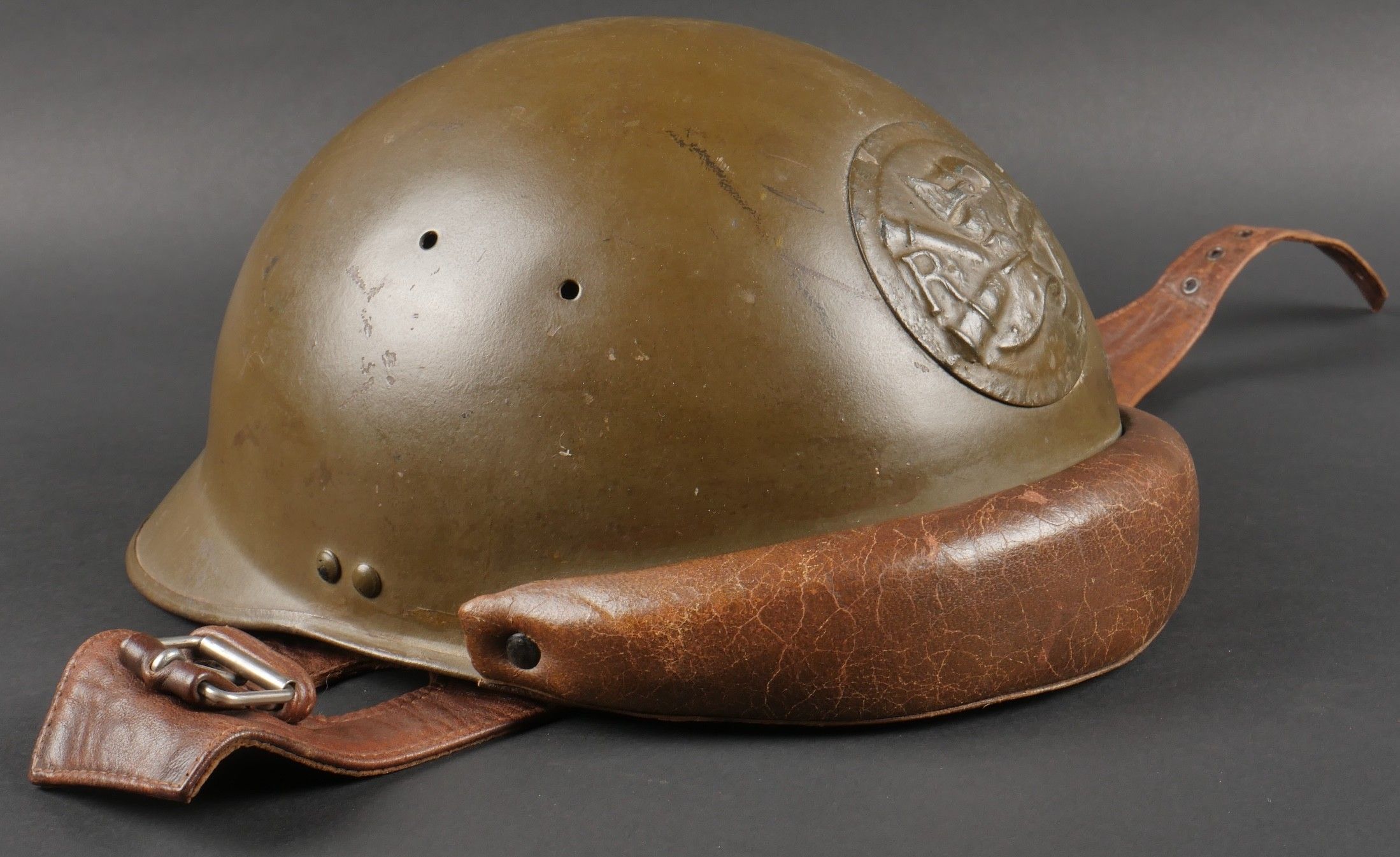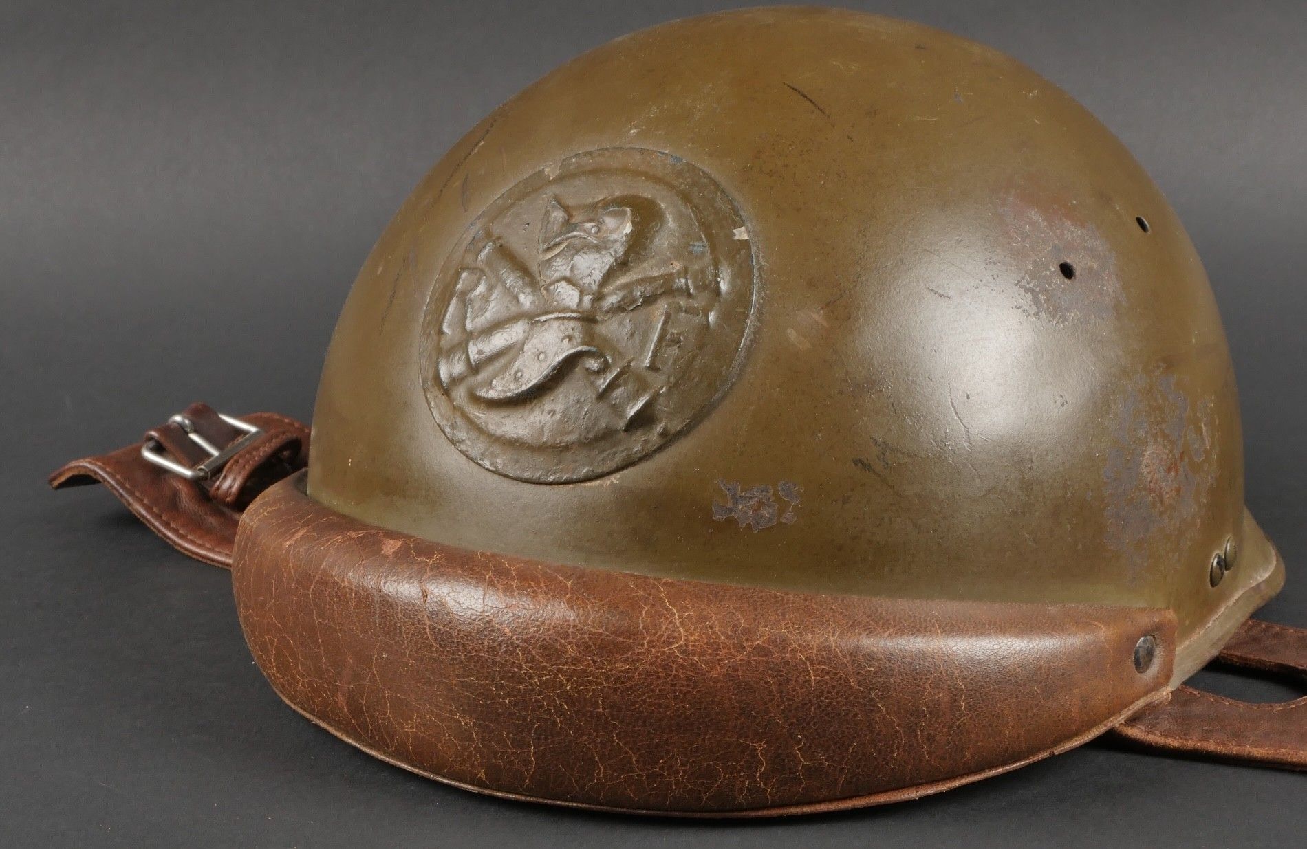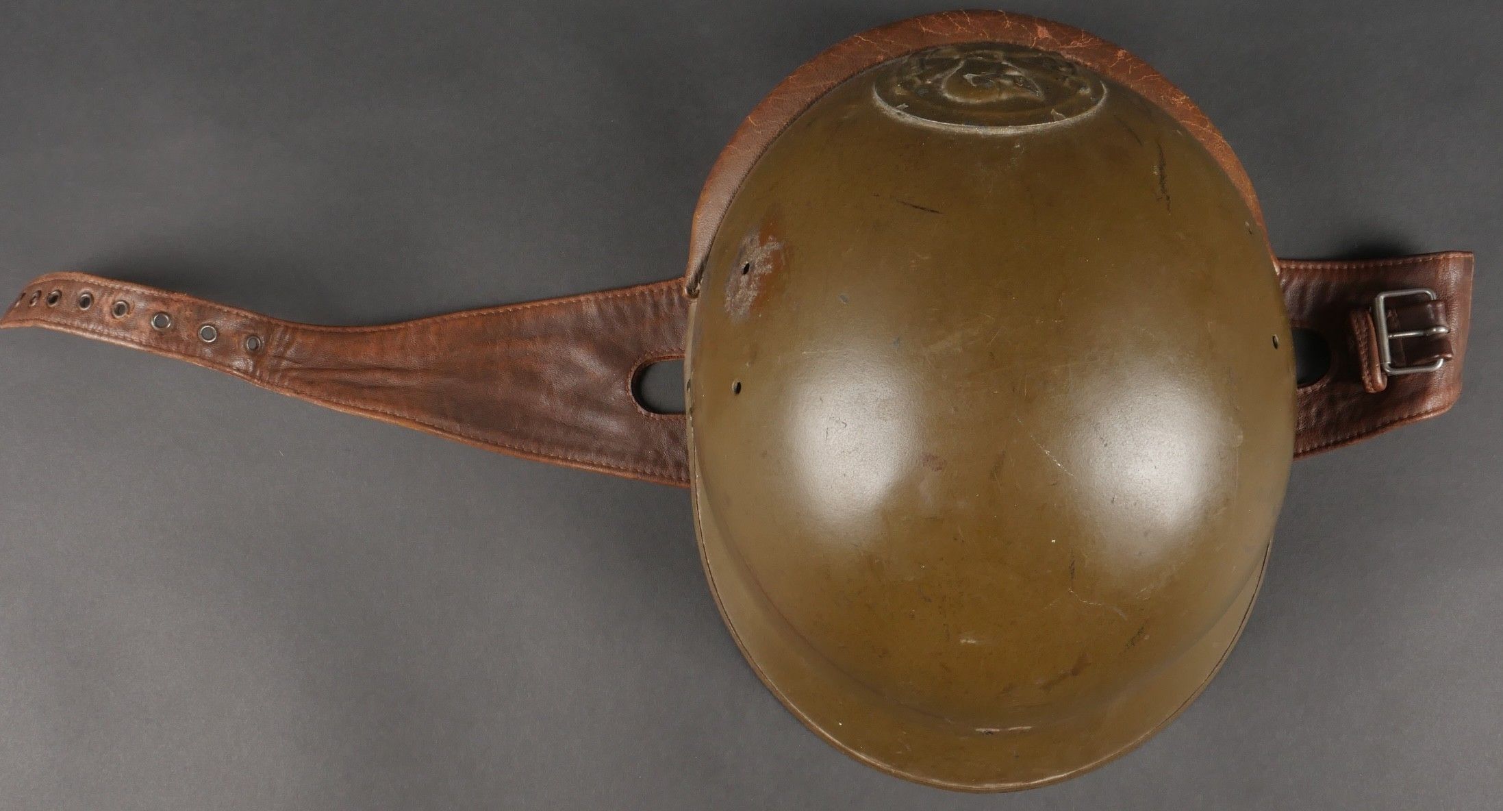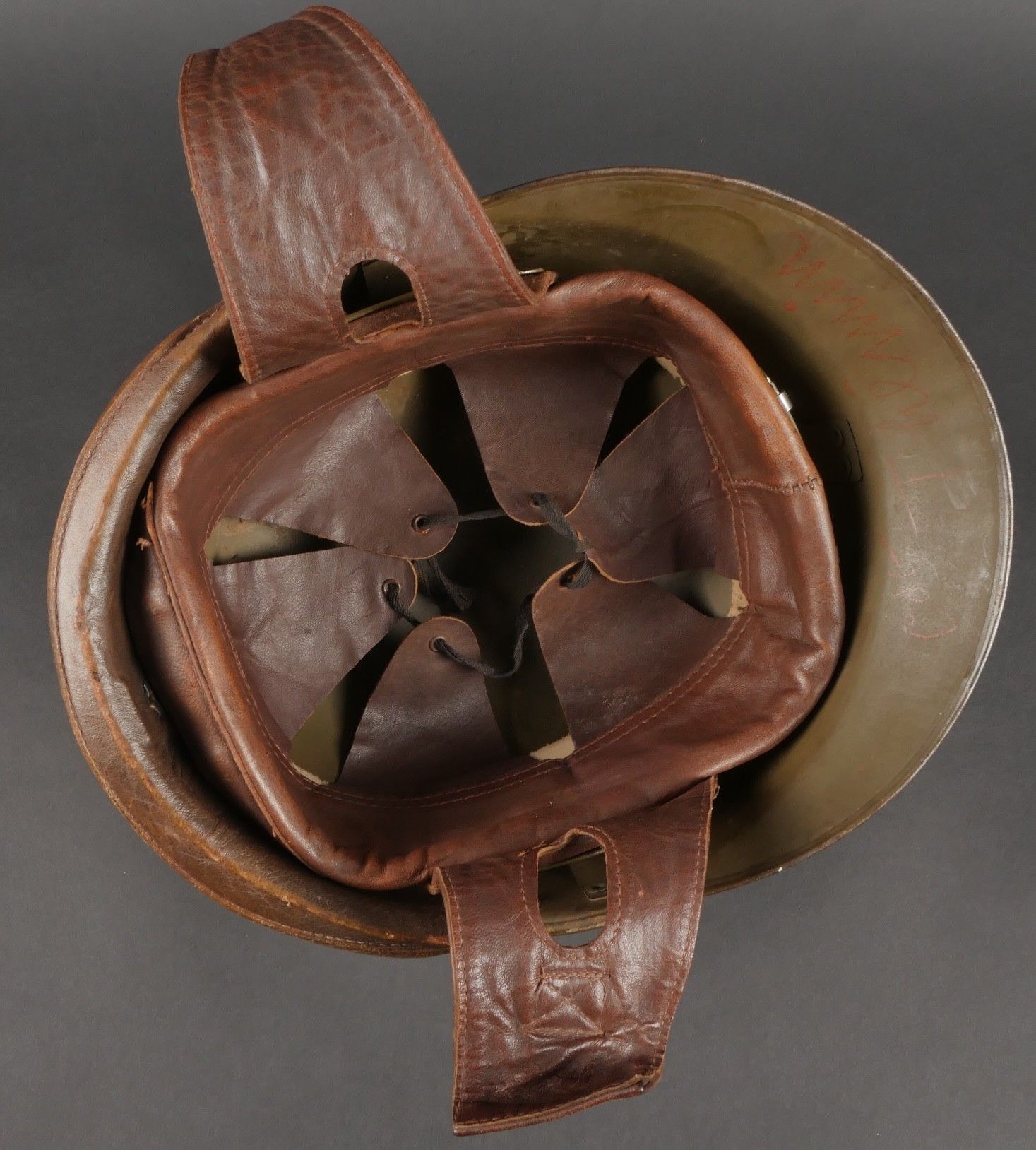 Combat tank helmet 193538. Metal shell, 95% factory khaki paint, 1937 model battle tank markings, tan leather front headband. Model-specific inner cap with six wolf teeth, leather lower flaps, headband bears date of manufacture 1938, size 57. The officer wearing this helmet inscribed his name on the back of the helmet, Commandant Thémin. There are a few traces of oxidation on the outside of the bomb. Tank crew helmet 193538. Metal shell with 95% of original factory khaki paint, fitted with 1937 armoured troops emblem and fawn leather front band. Interior liner specific to this model with six tongue segments and lower leather flaps, band dated 1938, size 57. The officer wearing this helmet inscribed his name Commandant Thémin inside the neck guard. A few oxidation traces visible on the outside of the shell.