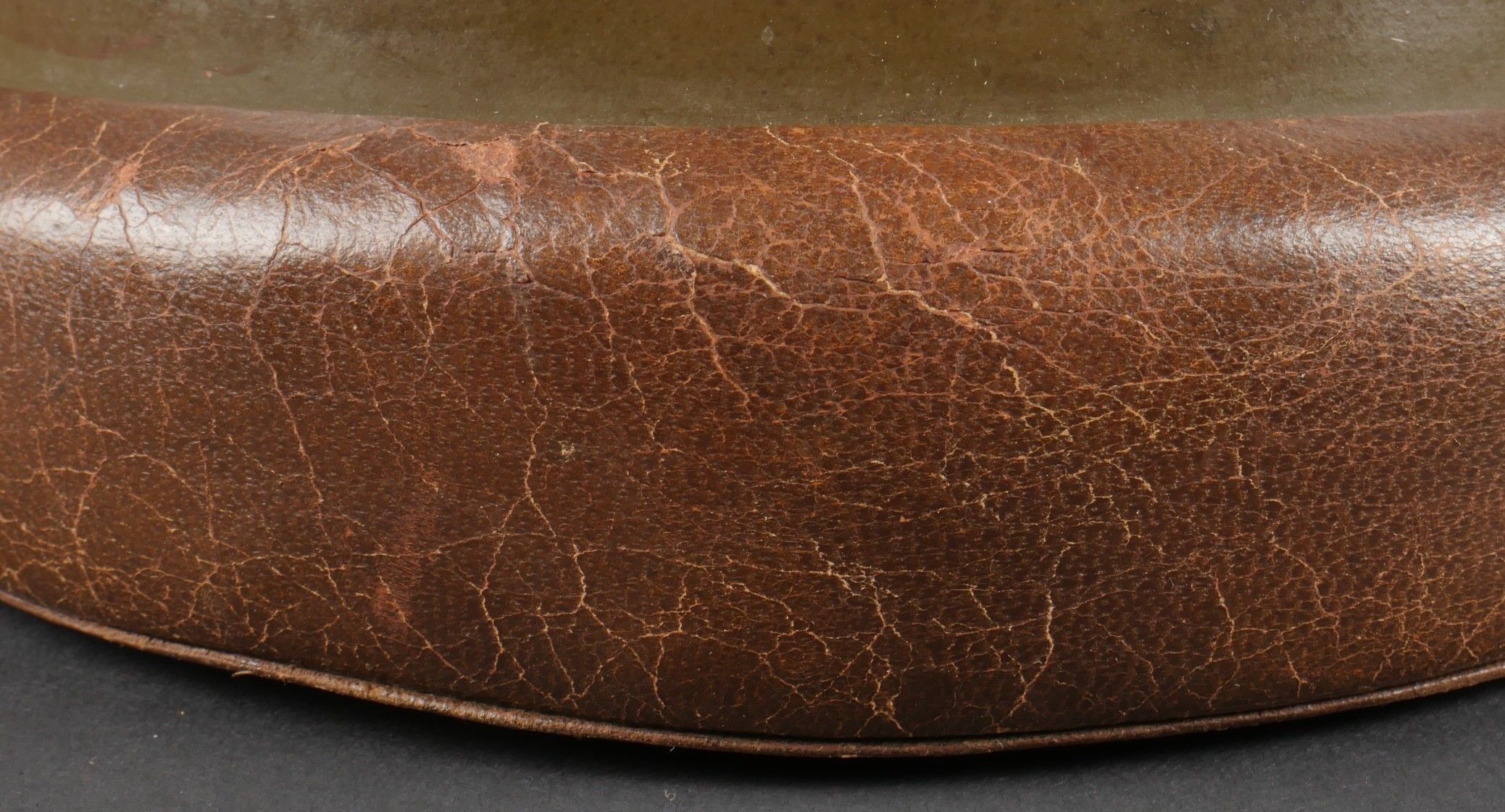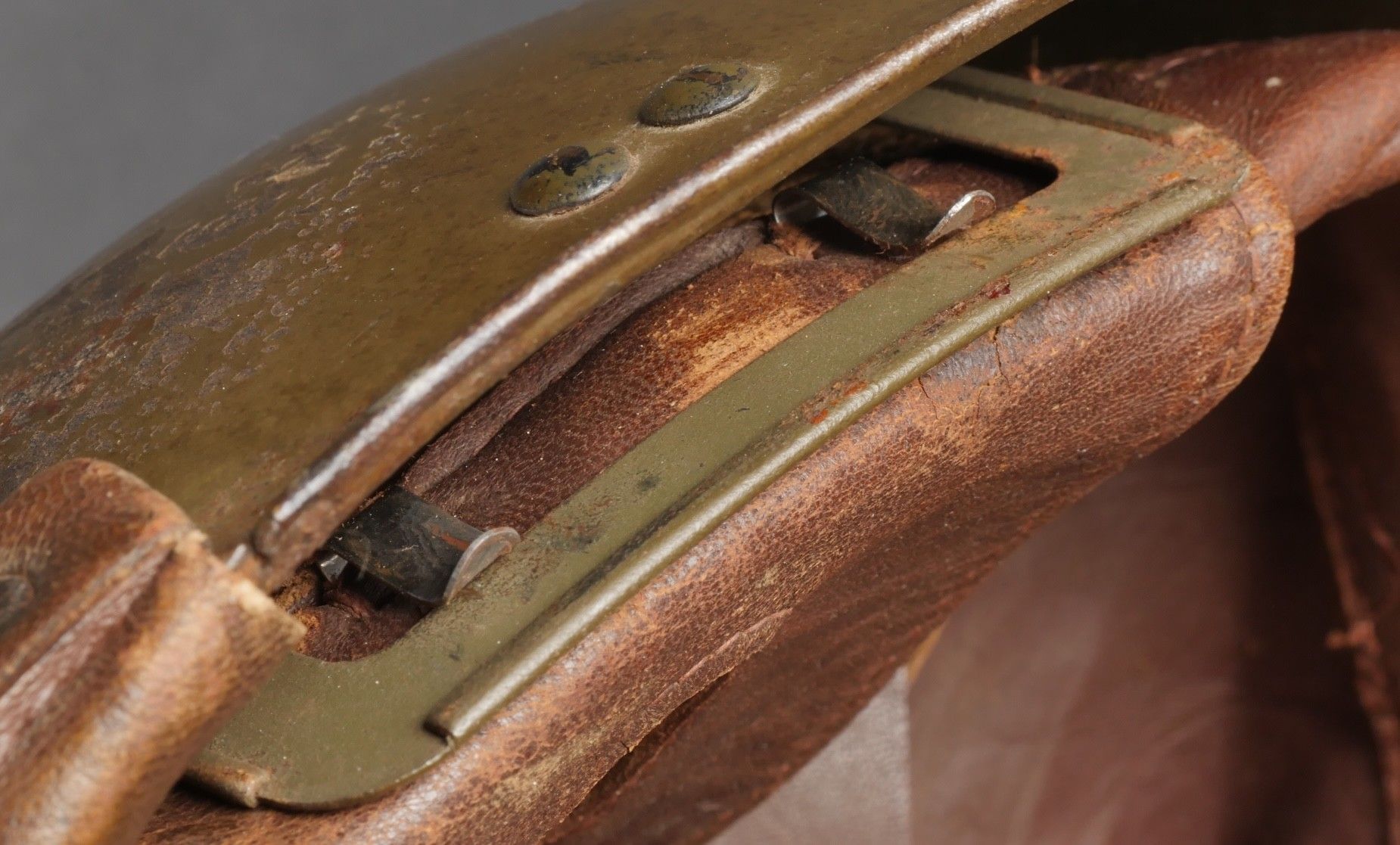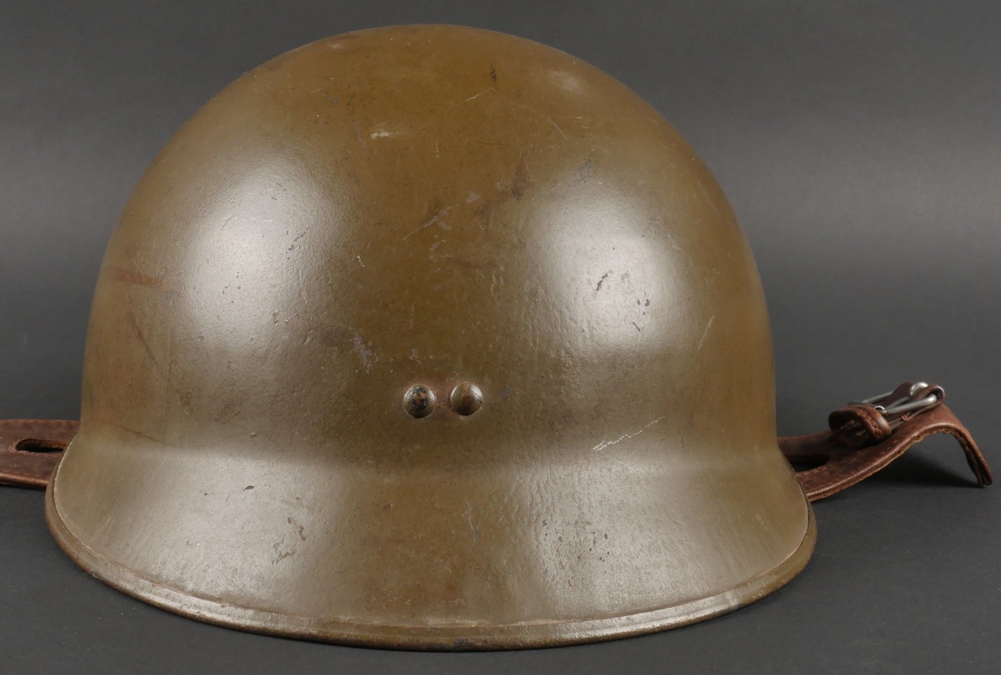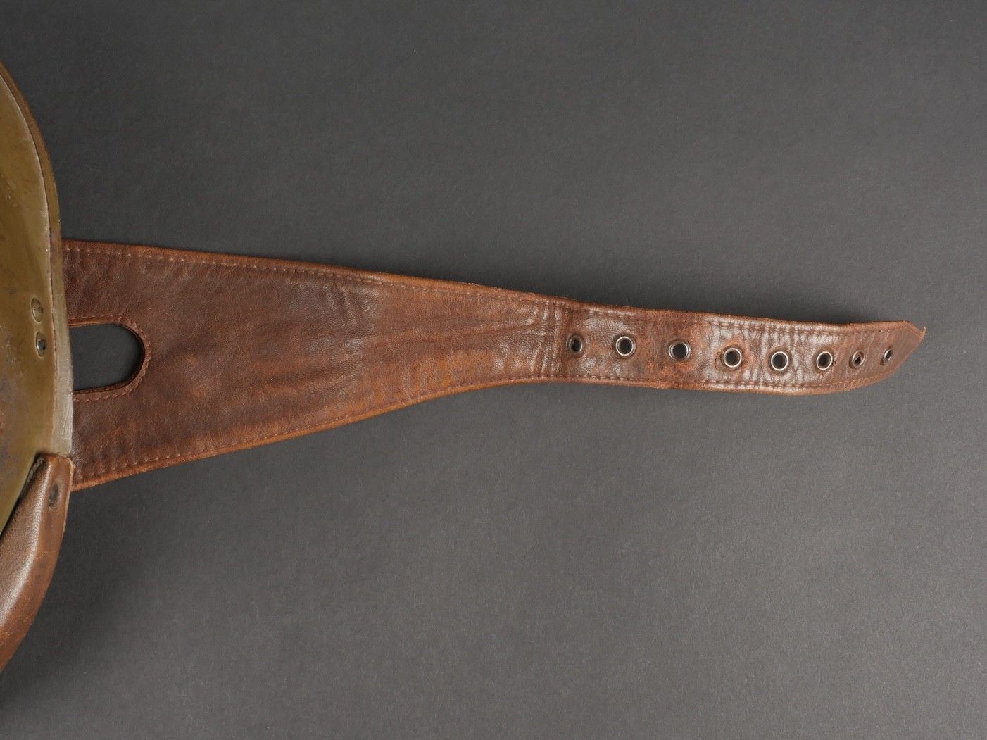Combat tank helmet 193538. Metal shell, 95% factory khaki paint, 1937 model battle tank markings, tan leather front headband. Model-specific inner cap with six wolf teeth, leather lower flaps, headband bears date of manufacture 1938, size 57. The officer wearing this helmet inscribed his name on the back of the helmet, Commandant Thémin. There are a few traces of oxidation on the outside of the bomb. Tank crew helmet 193538. Metal shell with 95% of original factory khaki paint, fitted with 1937 armoured troops emblem and fawn leather front band. Interior liner specific to this model with six tongue segments and lower leather flaps, band dated 1938, size 57. The officer wearing this helmet inscribed his name Commandant Thémin inside the neck guard. A few oxidation traces visible on the outside of the shell.