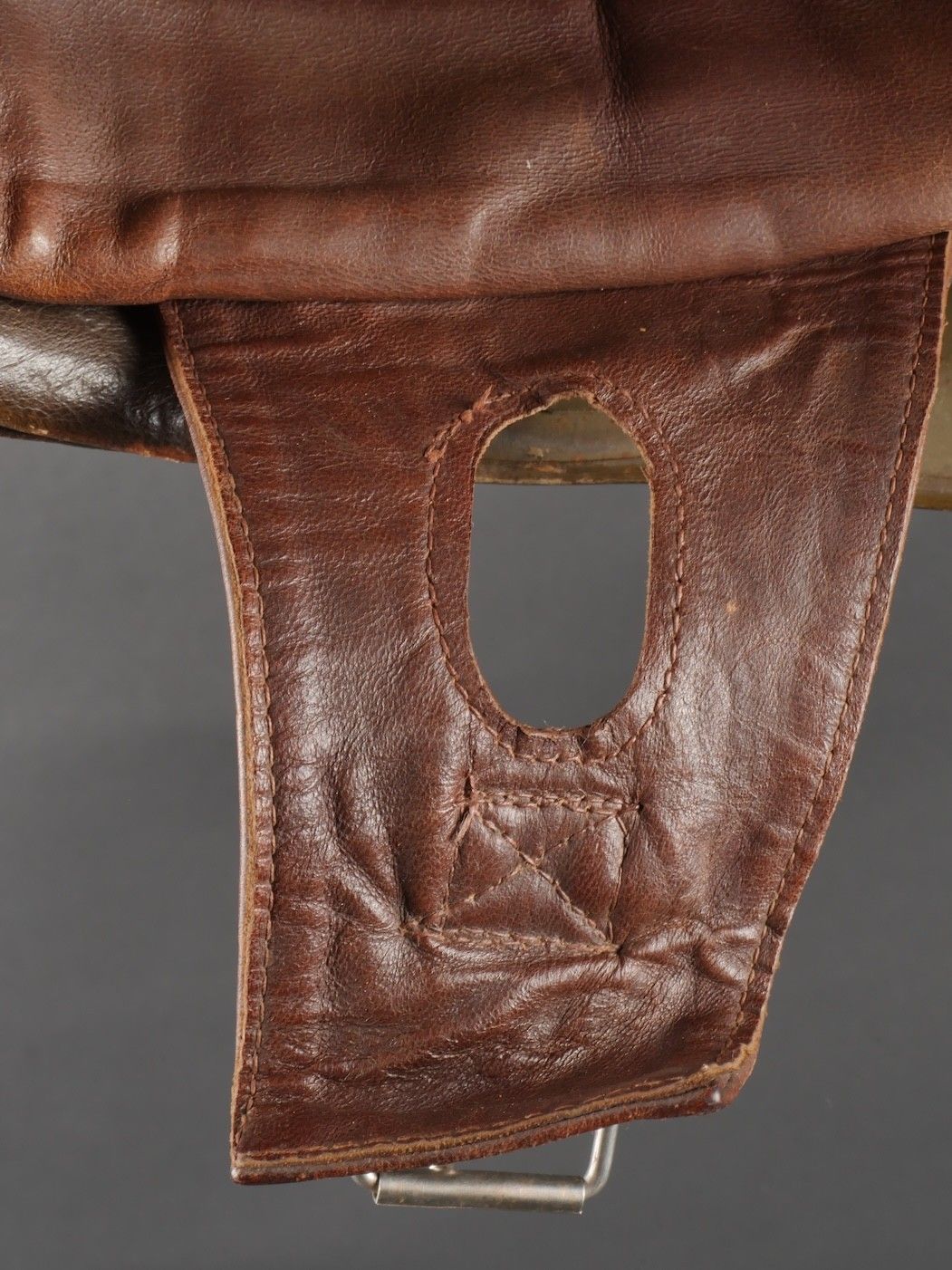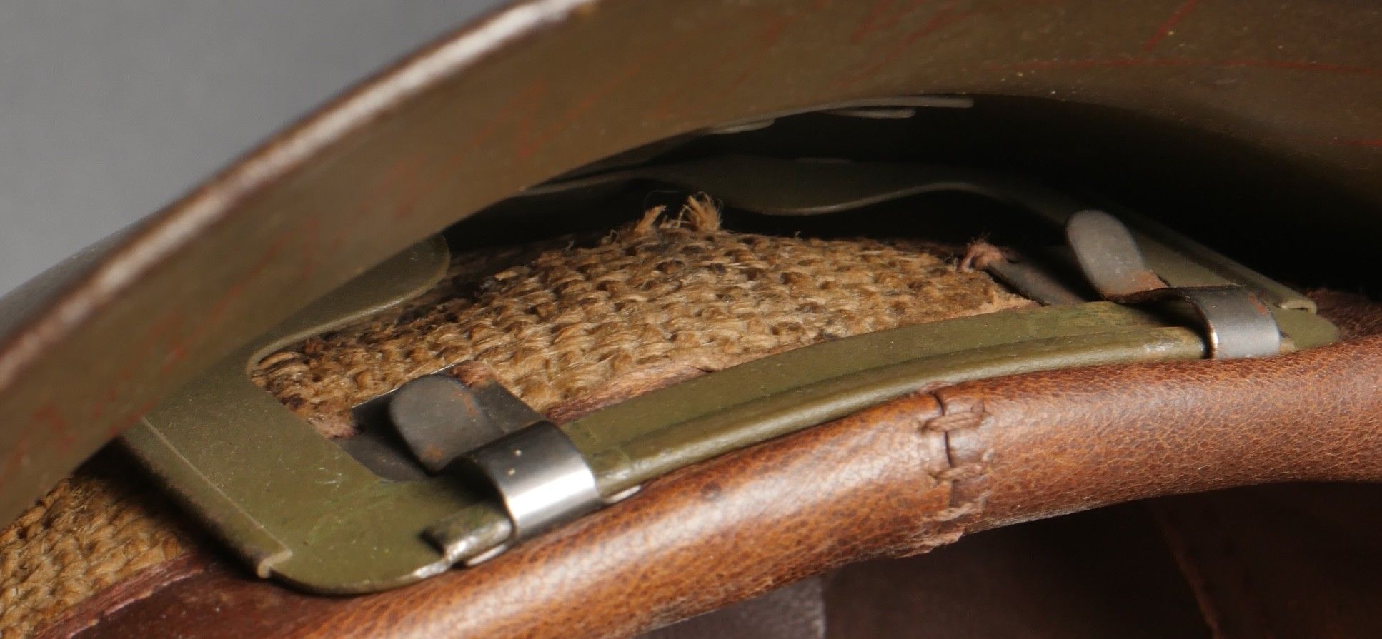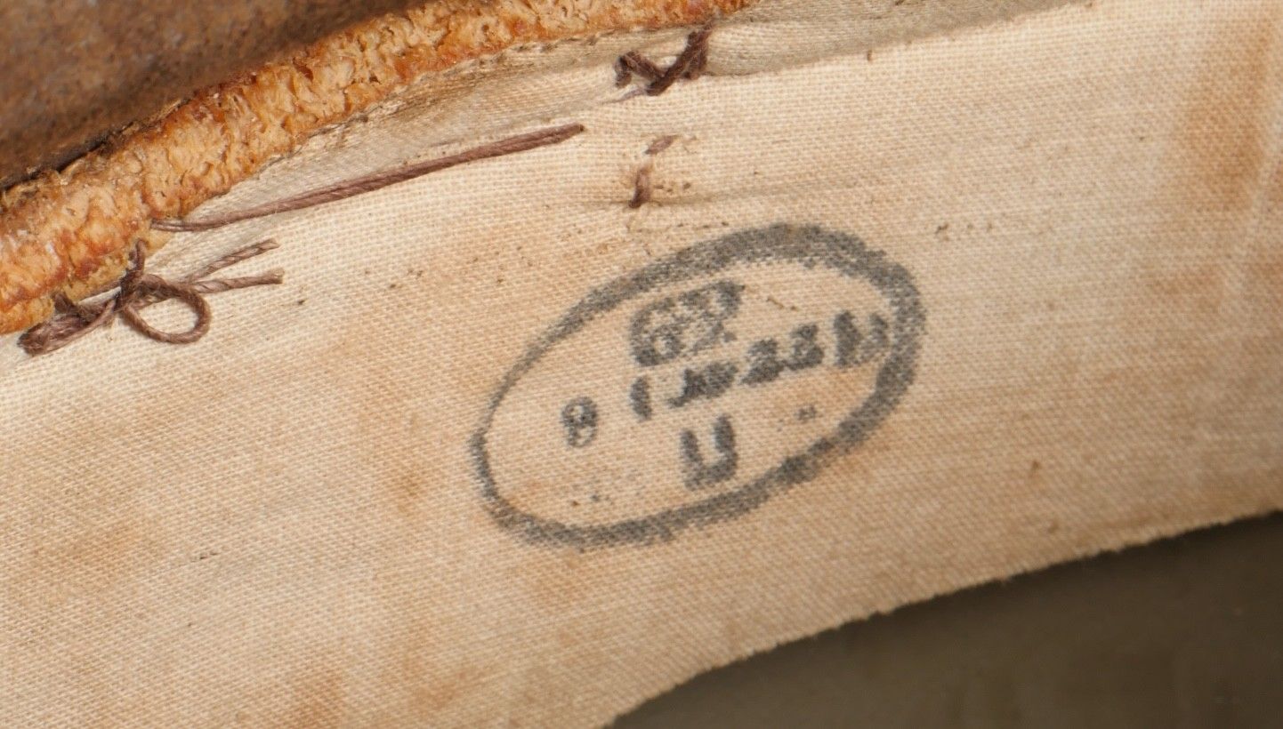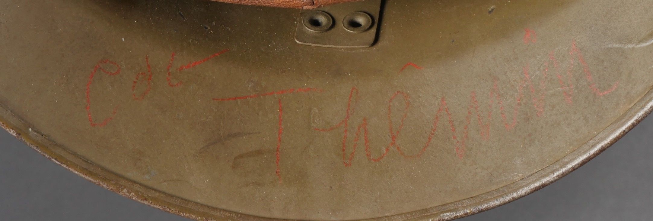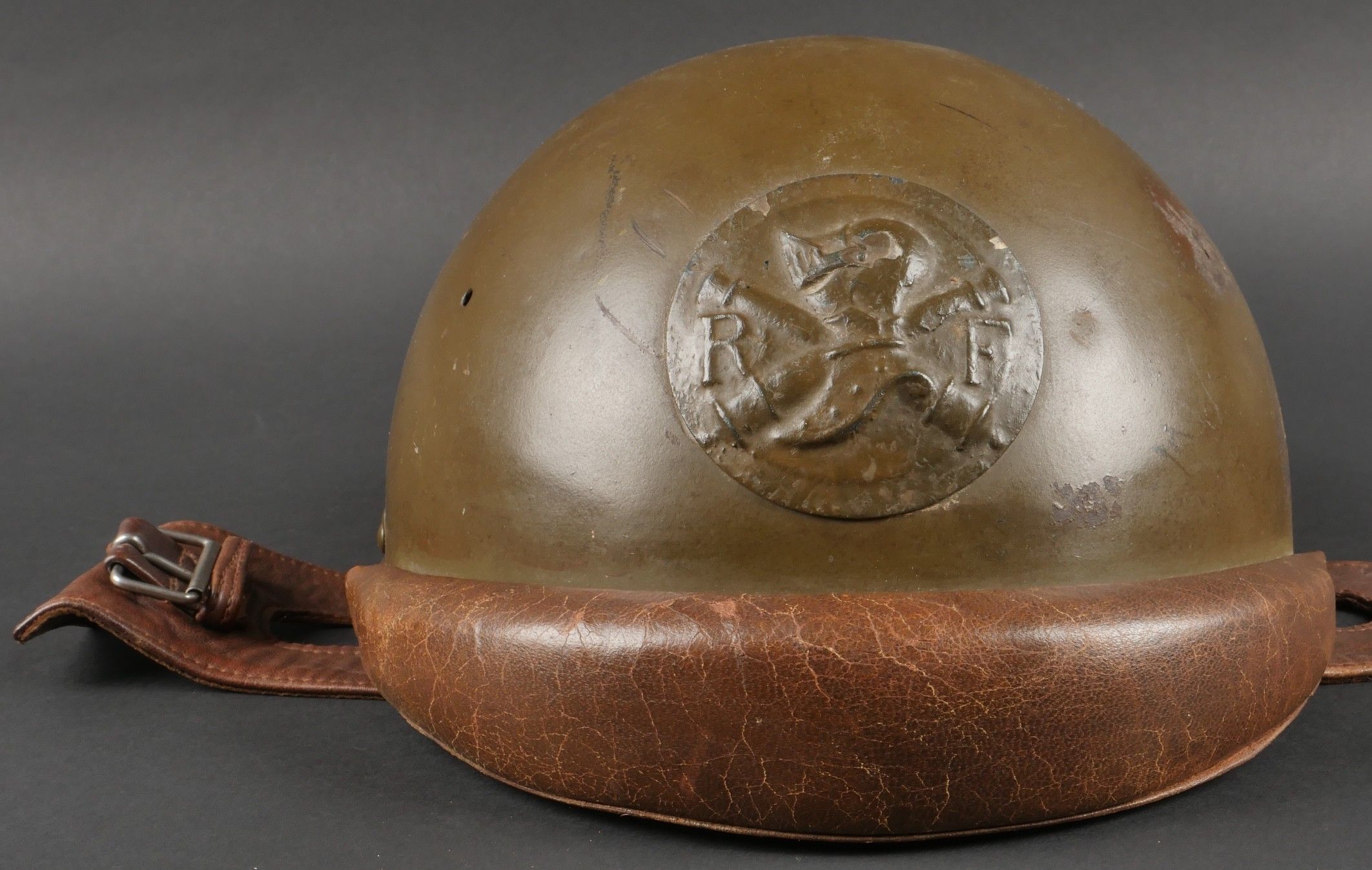 Combat tank helmet 193538. Metal shell, 95% factory khaki paint, 1937 model battle tank markings, tan leather front headband. Model-specific inner cap with six wolf teeth, leather lower flaps, headband bears date of manufacture 1938, size 57. The officer wearing this helmet inscribed his name on the back of the helmet, Commandant Thémin. There are a few traces of oxidation on the outside of the bomb. Tank crew helmet 193538. Metal shell with 95% of original factory khaki paint, fitted with 1937 armoured troops emblem and fawn leather front band. Interior liner specific to this model with six tongue segments and lower leather flaps, band dated 1938, size 57. The officer wearing this helmet inscribed his name Commandant Thémin inside the neck guard. A few oxidation traces visible on the outside of the shell.