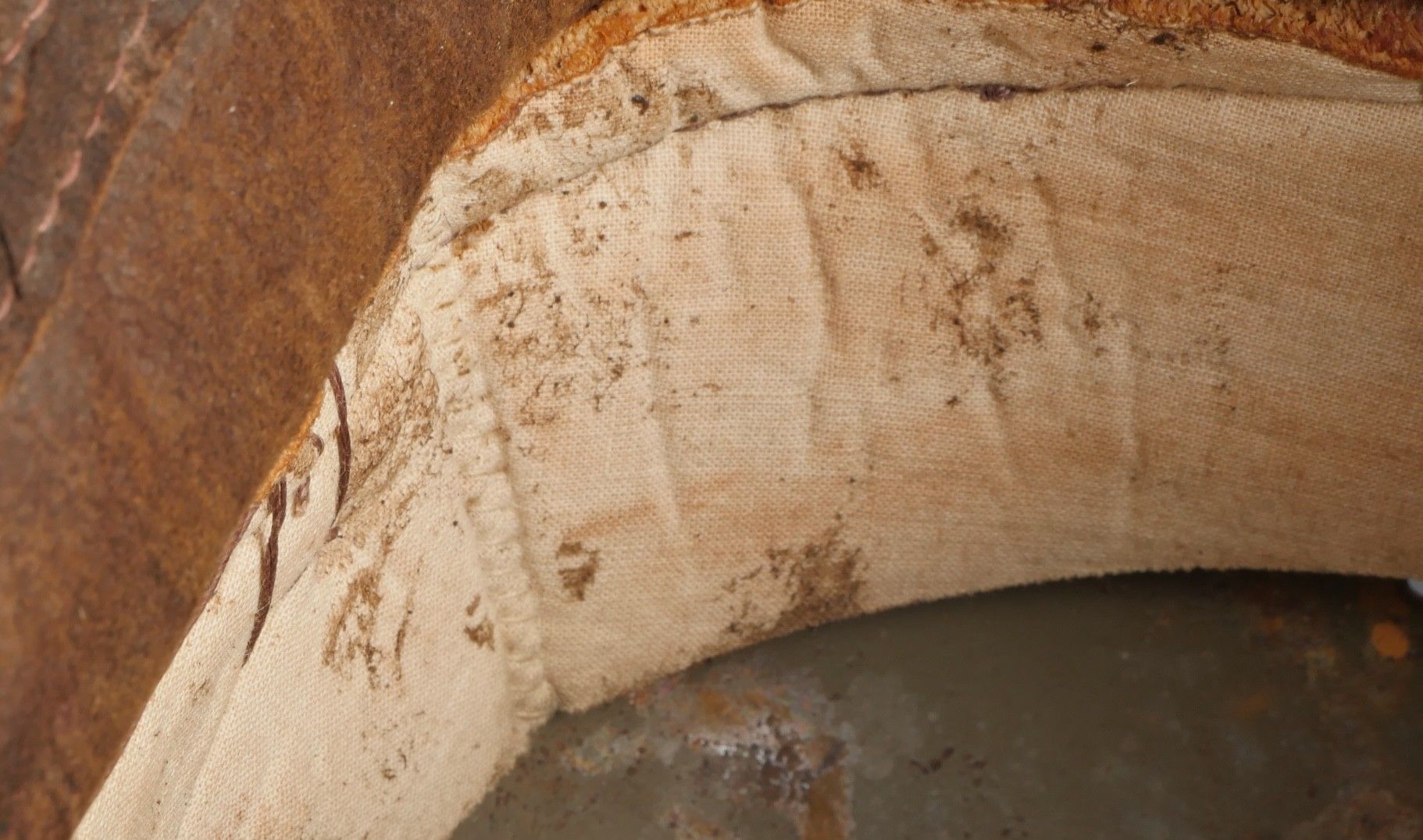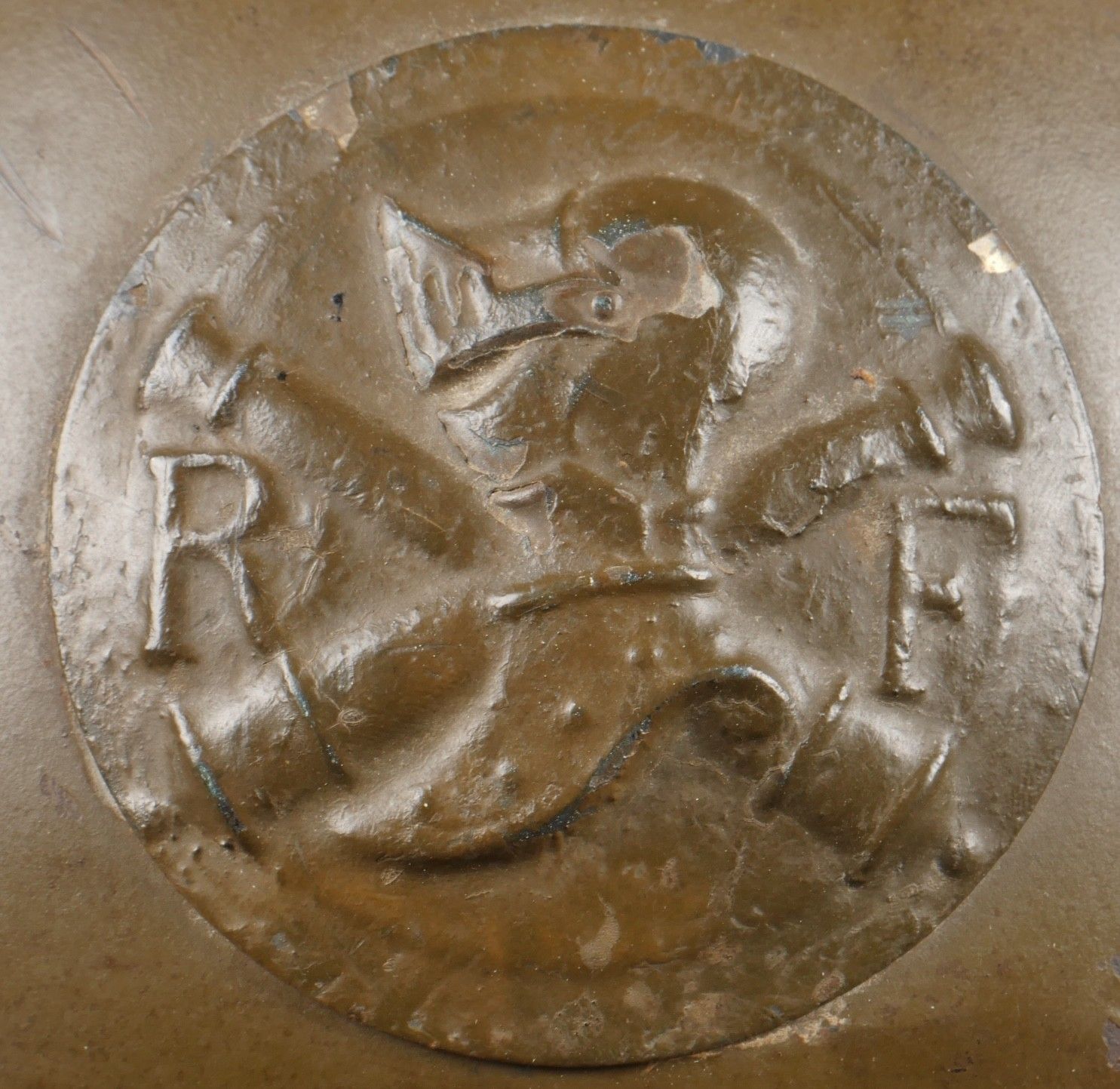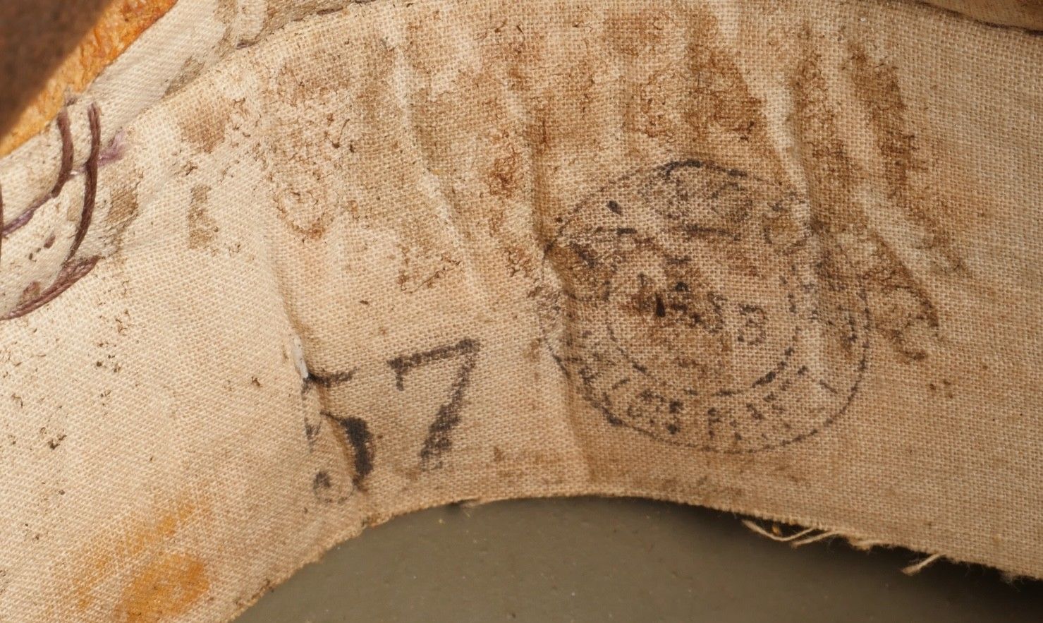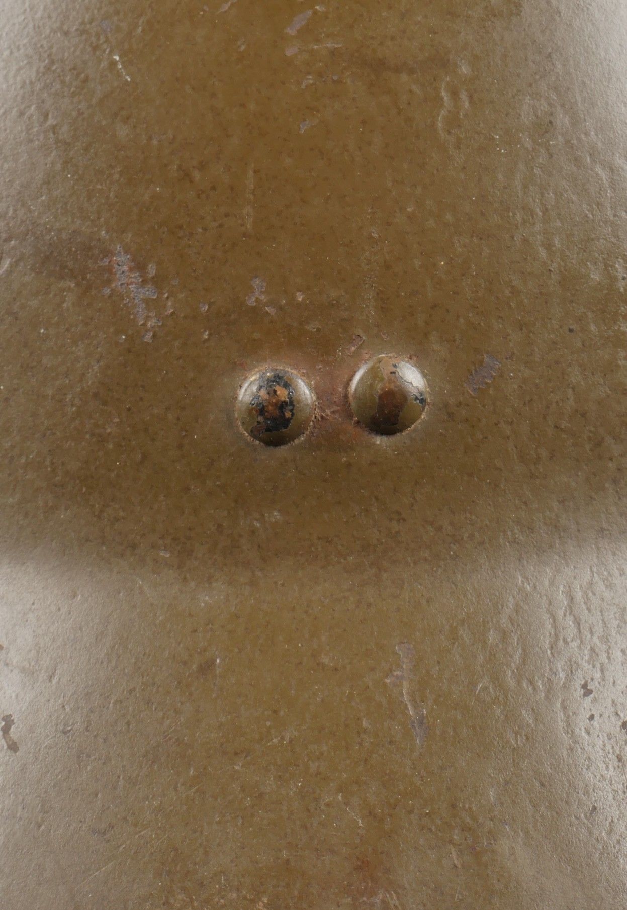 Combat tank helmet 193538. Metal shell, 95% factory khaki paint, 1937 model battle tank markings, tan leather front headband. Model-specific inner cap with six wolf teeth, leather lower flaps, headband bears date of manufacture 1938, size 57. The officer wearing this helmet inscribed his name on the back of the helmet, Commandant Thémin. There are a few traces of oxidation on the outside of the bomb. Tank crew helmet 193538. Metal shell with 95% of original factory khaki paint, fitted with 1937 armoured troops emblem and fawn leather front band. Interior liner specific to this model with six tongue segments and lower leather flaps, band dated 1938, size 57. The officer wearing this helmet inscribed his name Commandant Thémin inside the neck guard. A few oxidation traces visible on the outside of the shell.