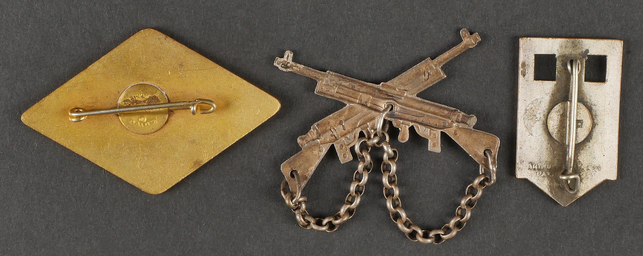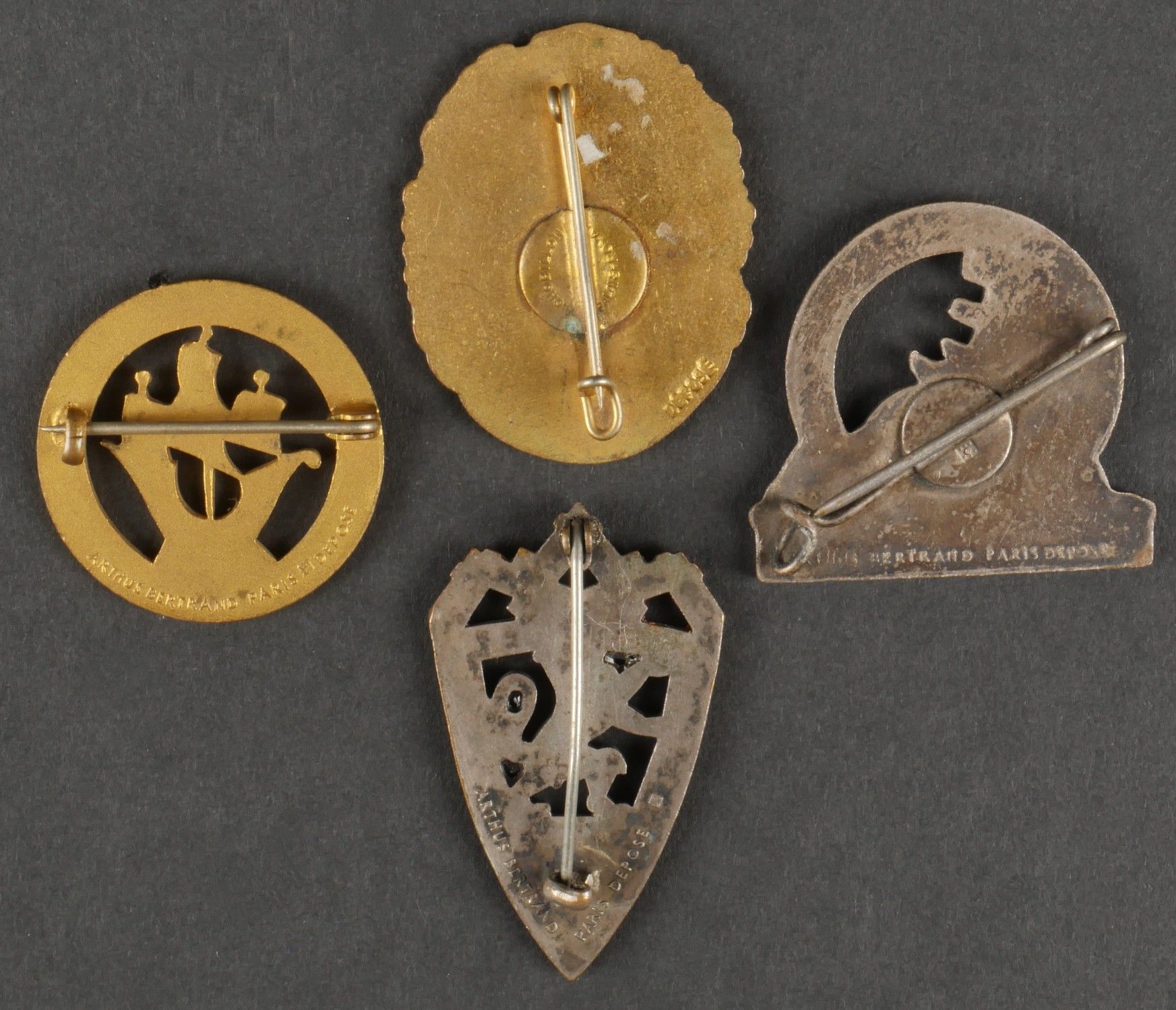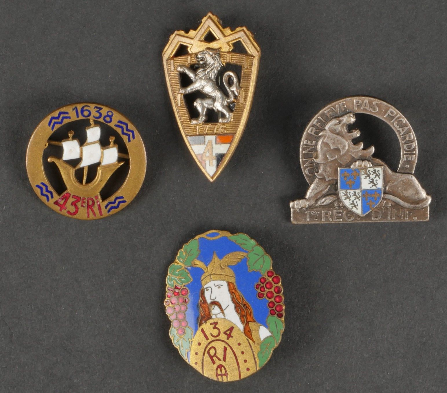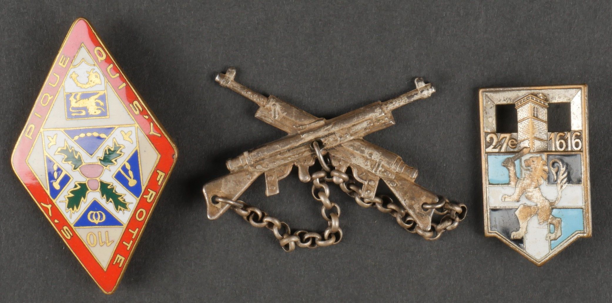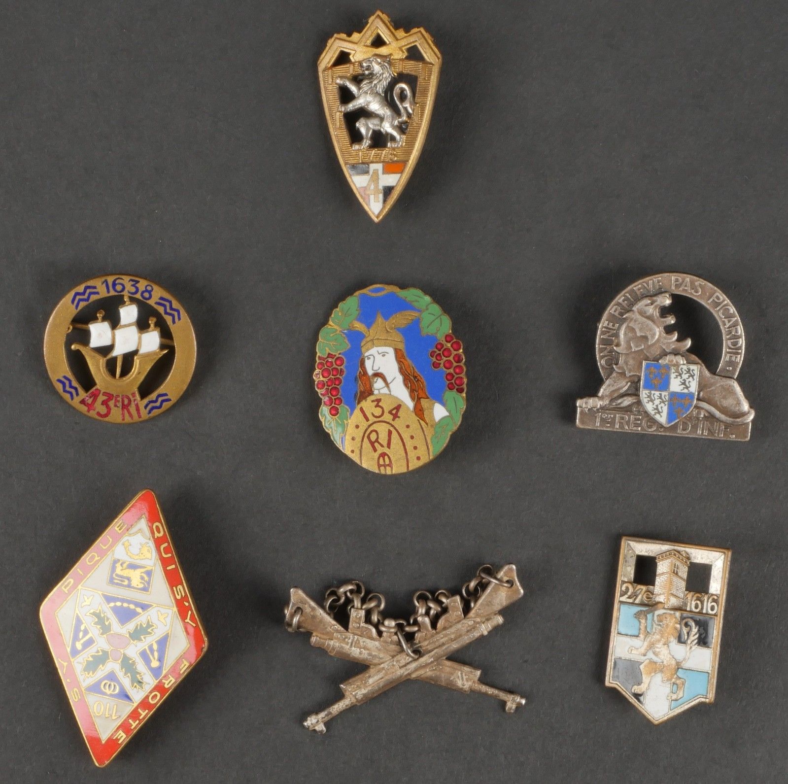 Lot of infantry badges. Comprising an unmarked 110th Infantry Regiment badge, Paris hallmark on bolero. A 134th RI badge, light hair, made by Chaubillon on a bolero. An Arthus Bertrand 1st Infantry Regiment badge. A 43rd Infantry Regiment badge made by Arthus Bertrand. A 4th Infantry Regiment badge made by Arthus Bertrand. A 27th Infantry Regiment badge made by Arthus Bertrand. A machine-gunner's patent. Lot of infantry insignia Including a 110th Infantry Regiment badge without maker's mark stamped Paris on the back plate a 134th Infantry Regiment badge with light hair design by Chaubillon a 1st Infantry Regiment badge by Arthus Bertrand a 43rd Infantry Regiment badge by Arthus Bertrand a 4th Infantry Regiment badge by Arthus Bertrand and a 27th Infantry Regiment badge by Arthus Bertrand together with a machine gunner qualification badge.