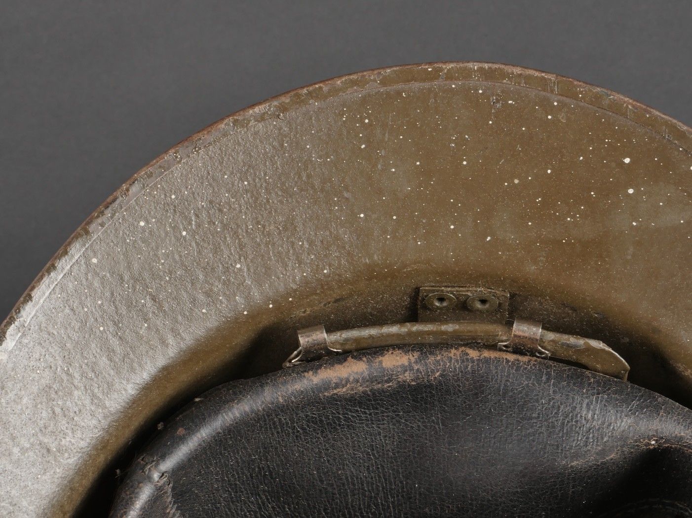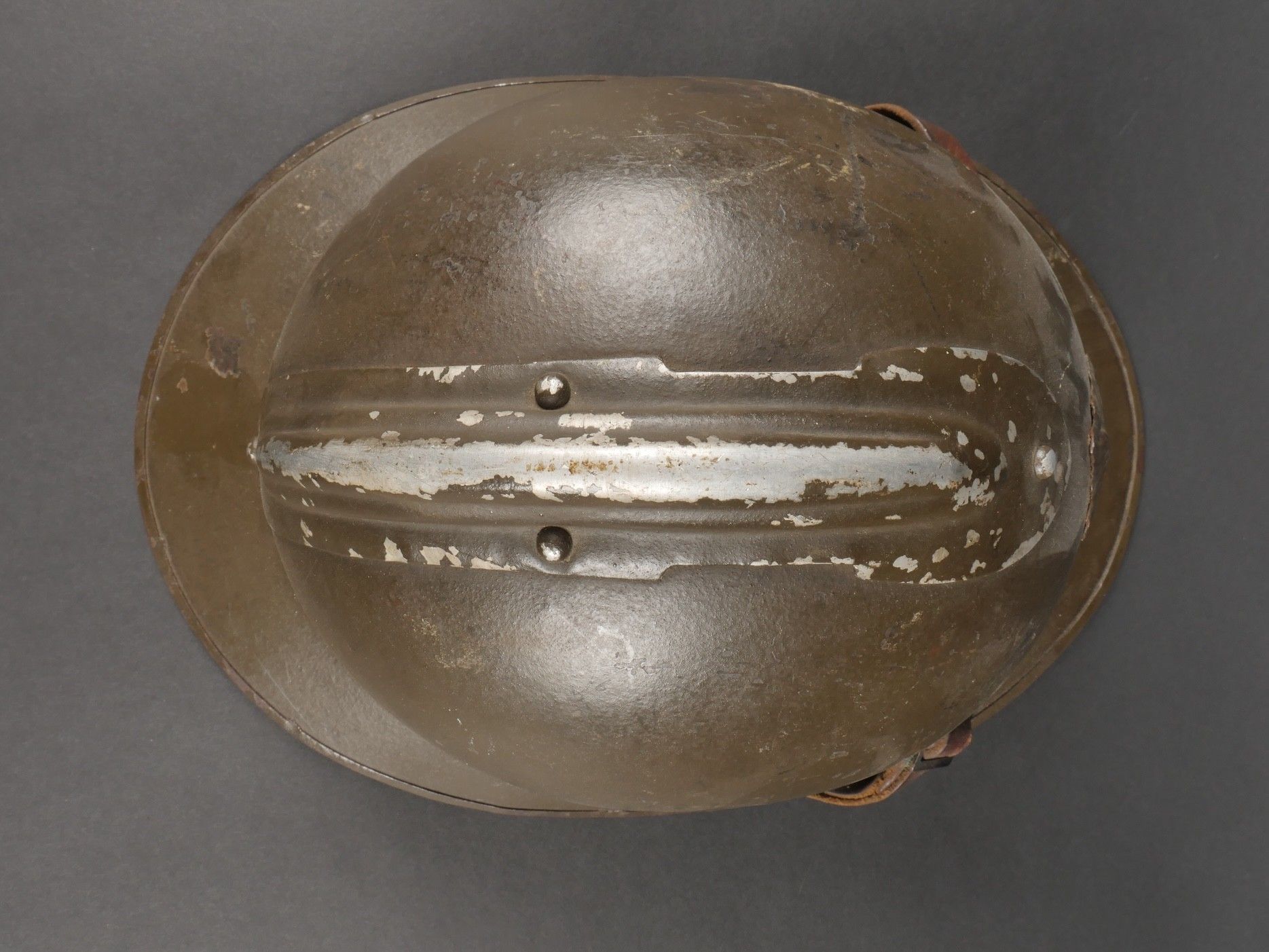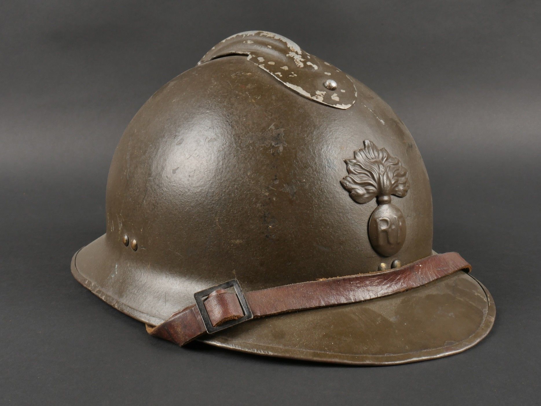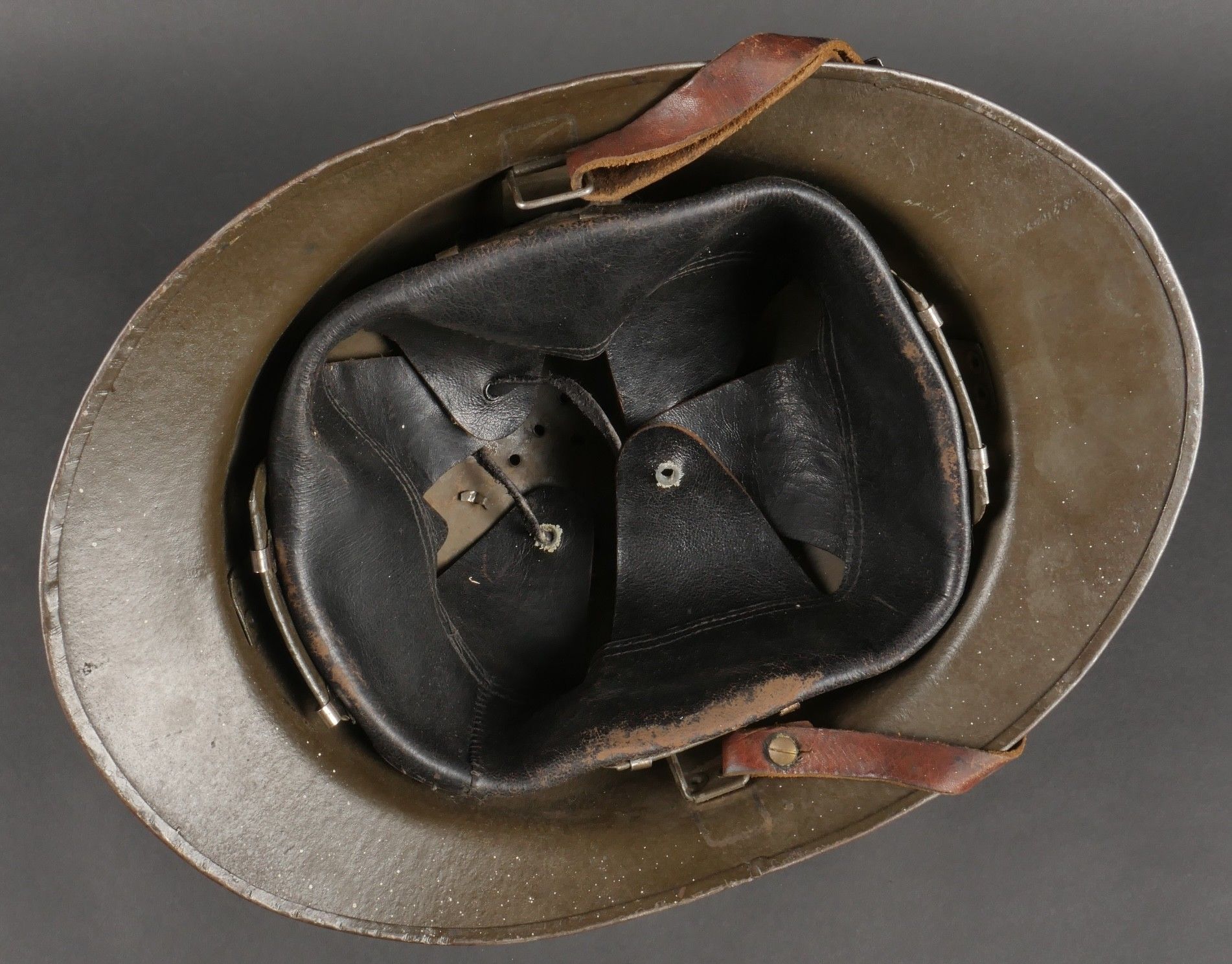 Adrian 1926 infantry helmet. Model 1926, 80% khaki paint, model 1915 infantry helmet. Aluminium crest with 70% paint. Leather chinstrap, leather cap with six wolf teeth held by eight clasps, eyelets oxidised and one missing. Adrian helmet 1926 infantry Model 1926 with 80% of its khaki paint fitted with the 1915 infantry emblem. Aluminum comb retaining 70% of its paint. Leather chinstrap and sixtongue leather liner held by eight clips, with oxidized eyelets and one missing.