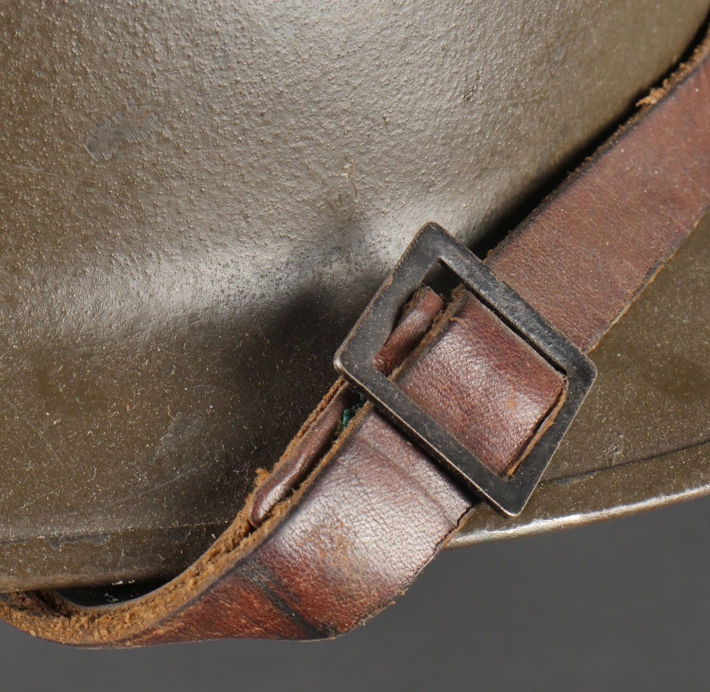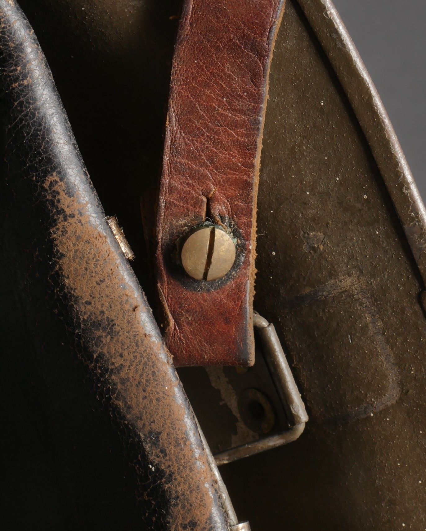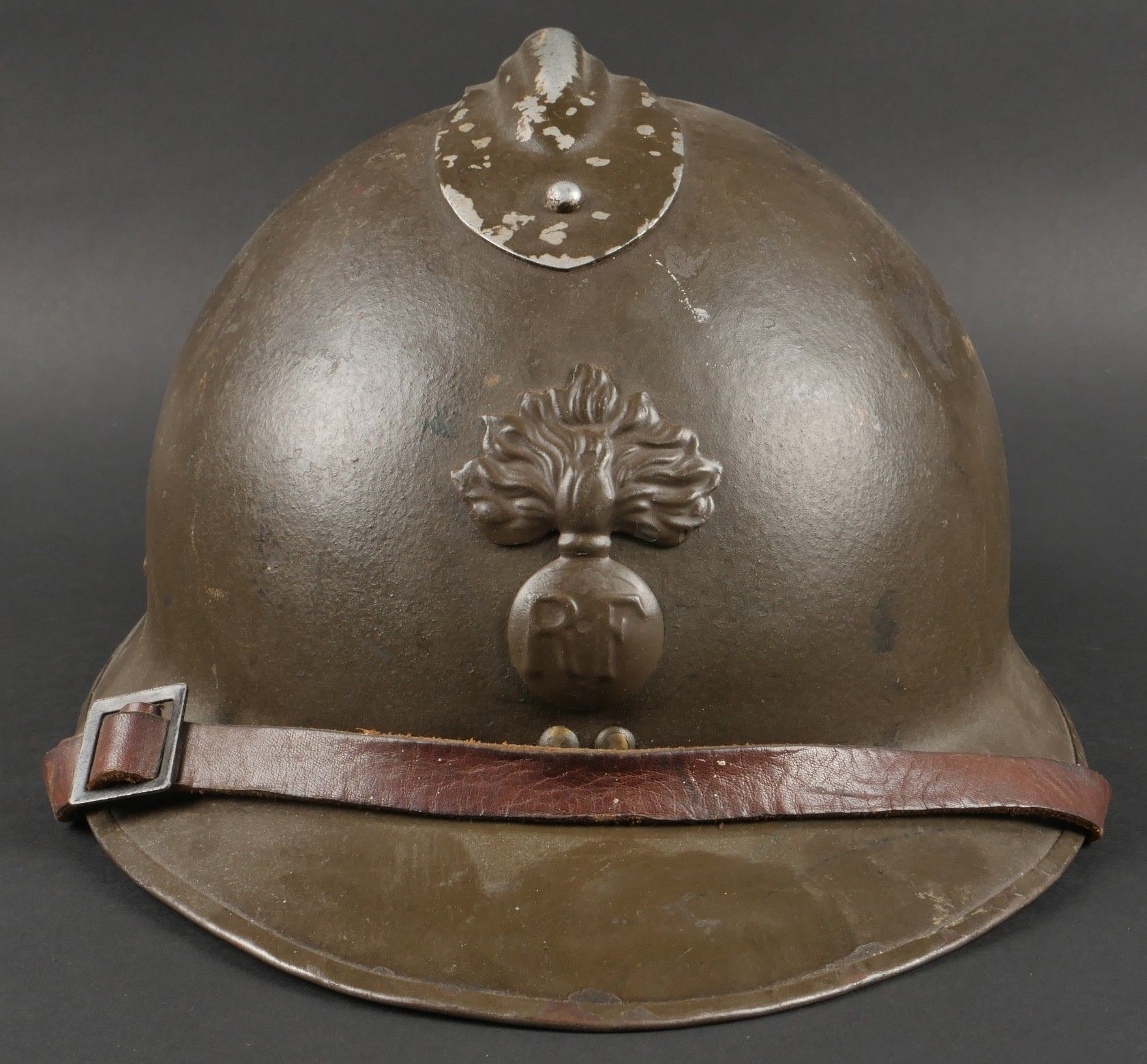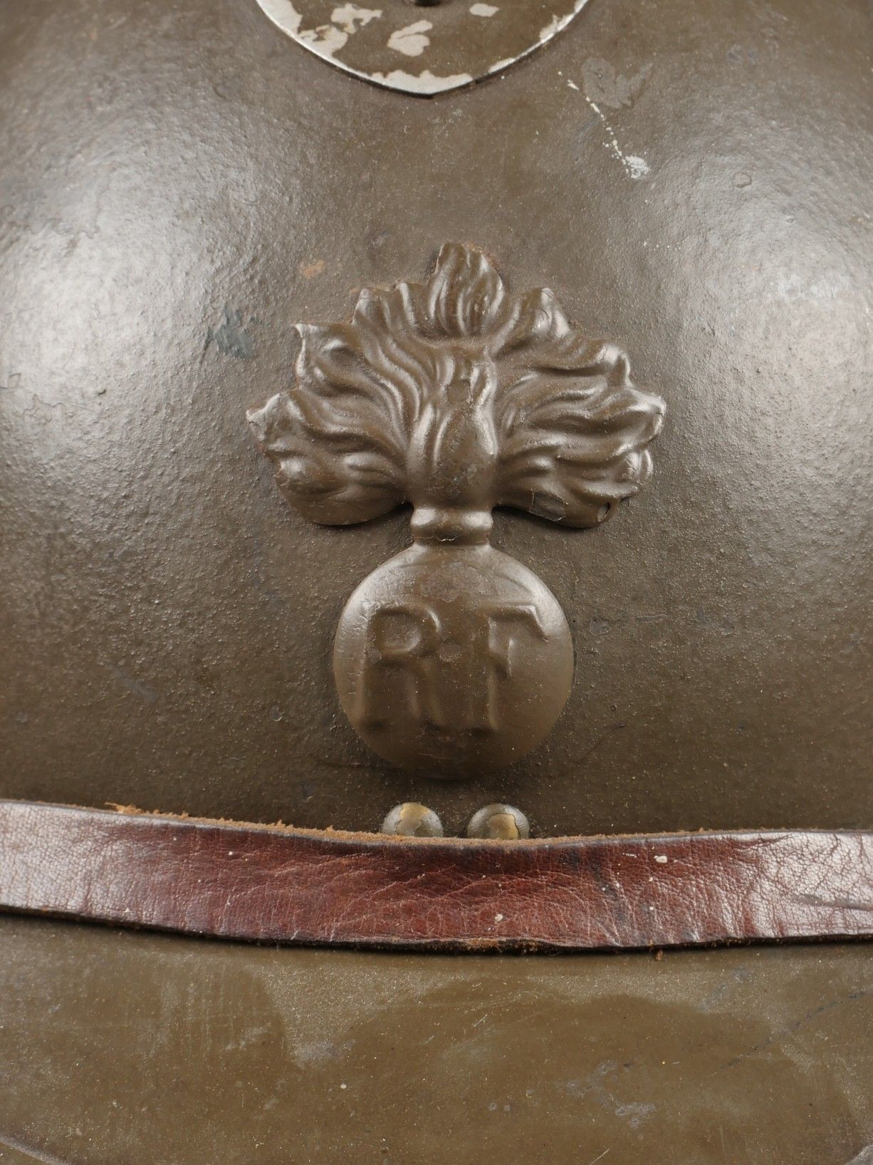 Adrian 1926 infantry helmet. Model 1926, 80% khaki paint, model 1915 infantry helmet. Aluminium crest with 70% paint. Leather chinstrap, leather cap with six wolf teeth held by eight clasps, eyelets oxidised and one missing. Adrian helmet 1926 infantry Model 1926 with 80% of its khaki paint fitted with the 1915 infantry emblem. Aluminum comb retaining 70% of its paint. Leather chinstrap and sixtongue leather liner held by eight clips, with oxidized eyelets and one missing.