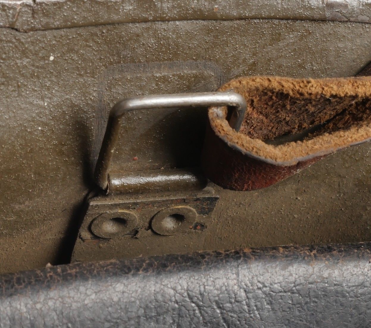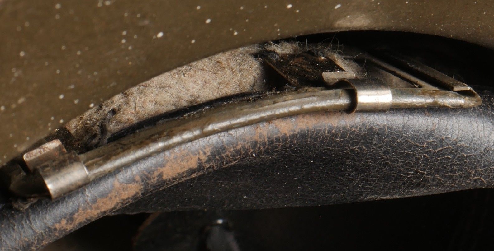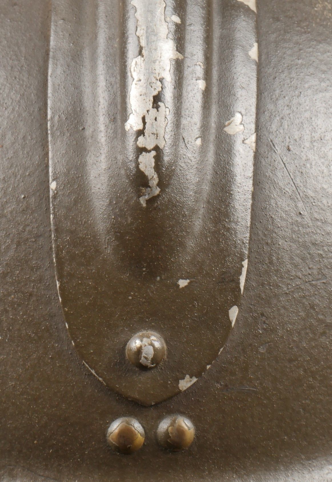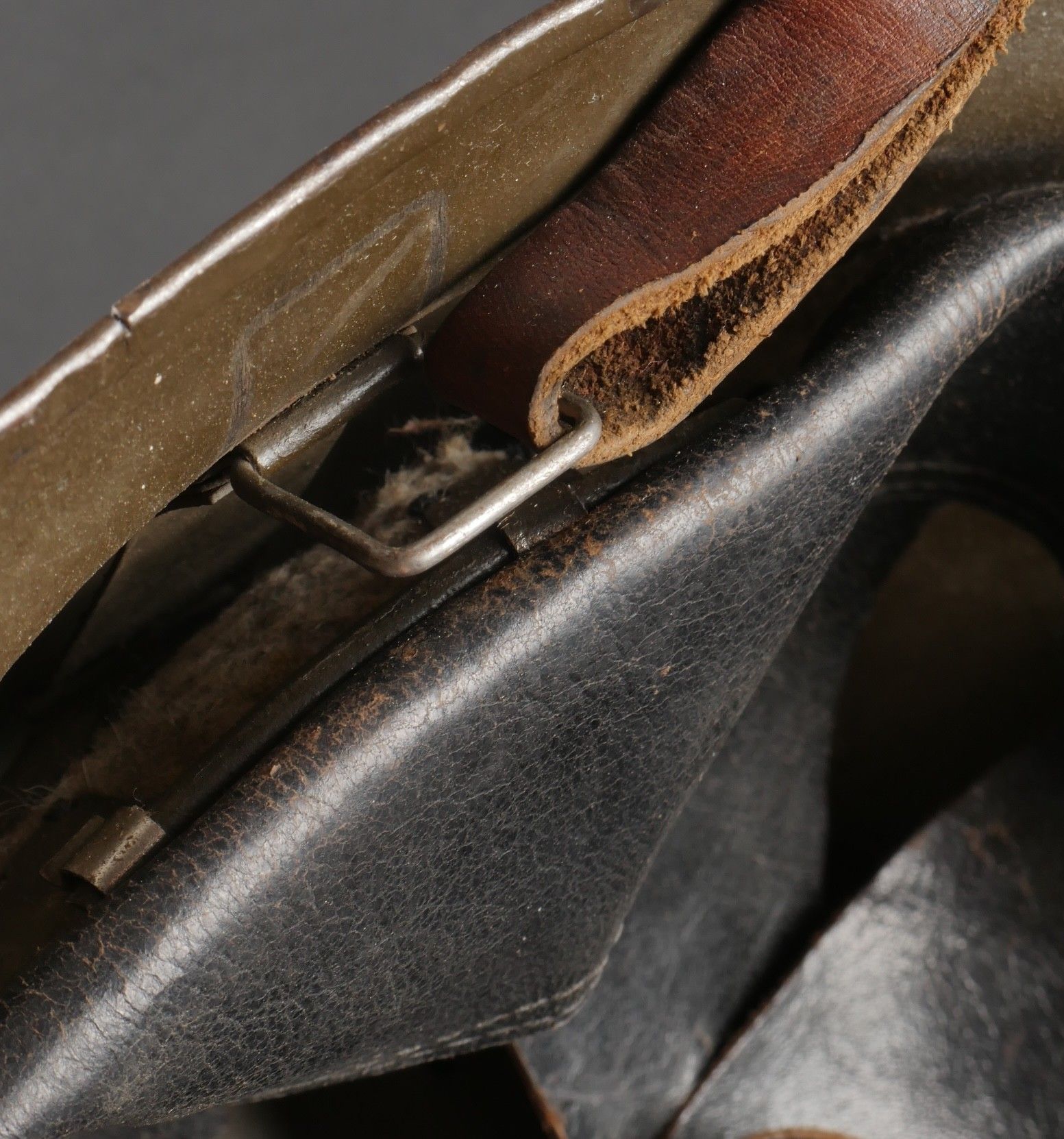 Adrian 1926 infantry helmet. Model 1926, 80% khaki paint, model 1915 infantry helmet. Aluminium crest with 70% paint. Leather chinstrap, leather cap with six wolf teeth held by eight clasps, eyelets oxidised and one missing. Adrian helmet 1926 infantry Model 1926 with 80% of its khaki paint fitted with the 1915 infantry emblem. Aluminum comb retaining 70% of its paint. Leather chinstrap and sixtongue leather liner held by eight clips, with oxidized eyelets and one missing.