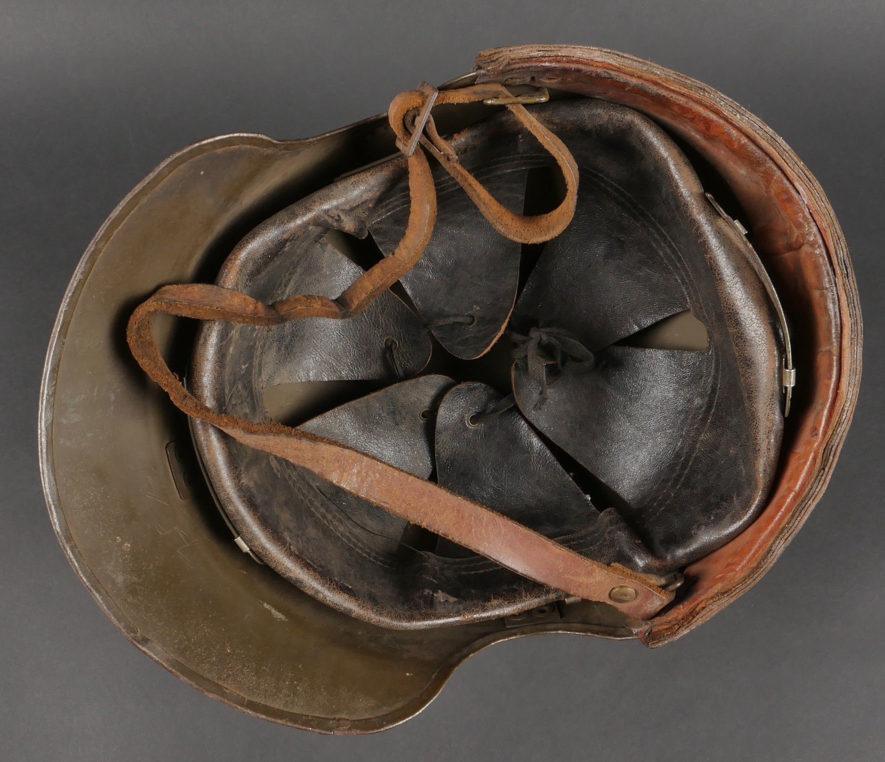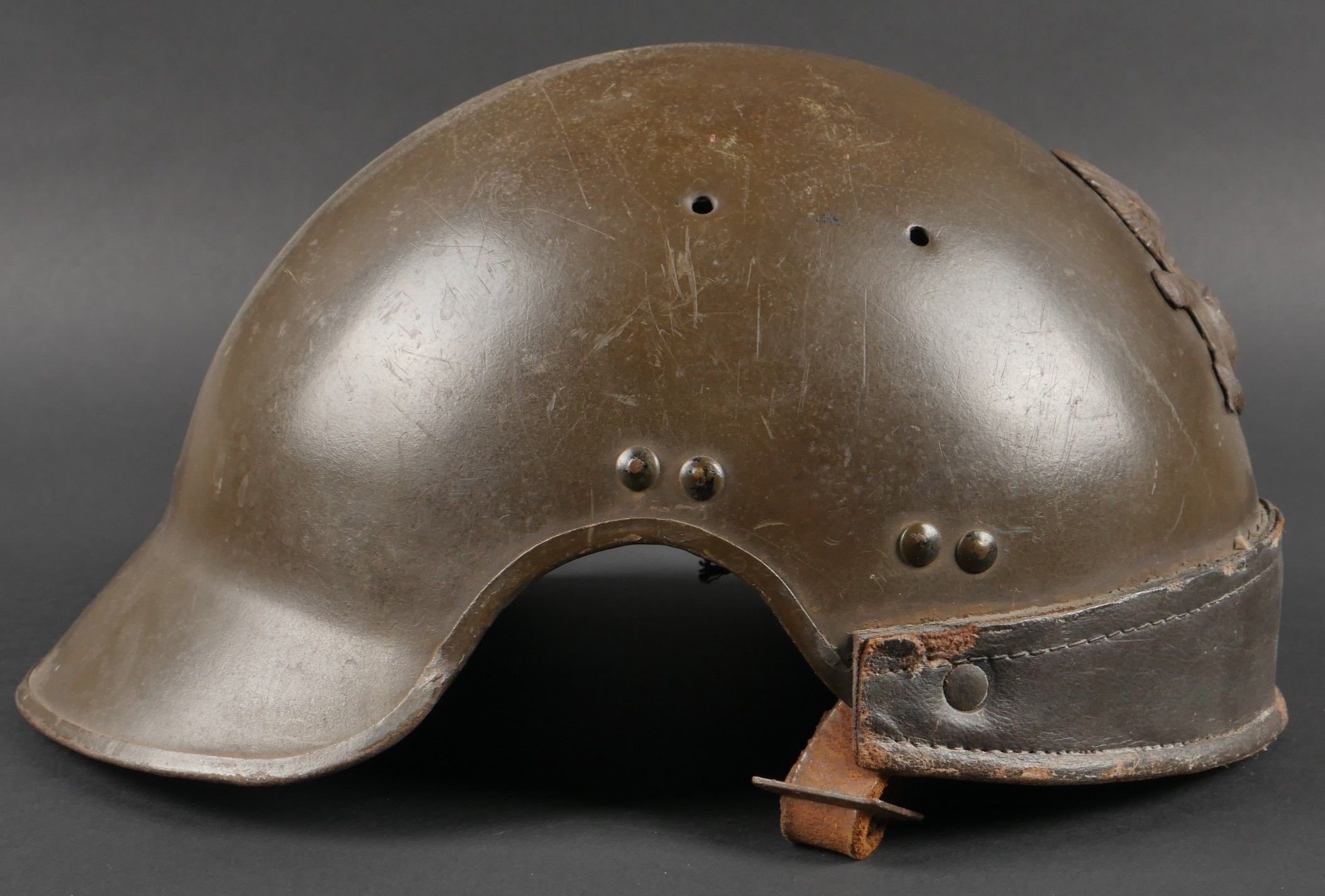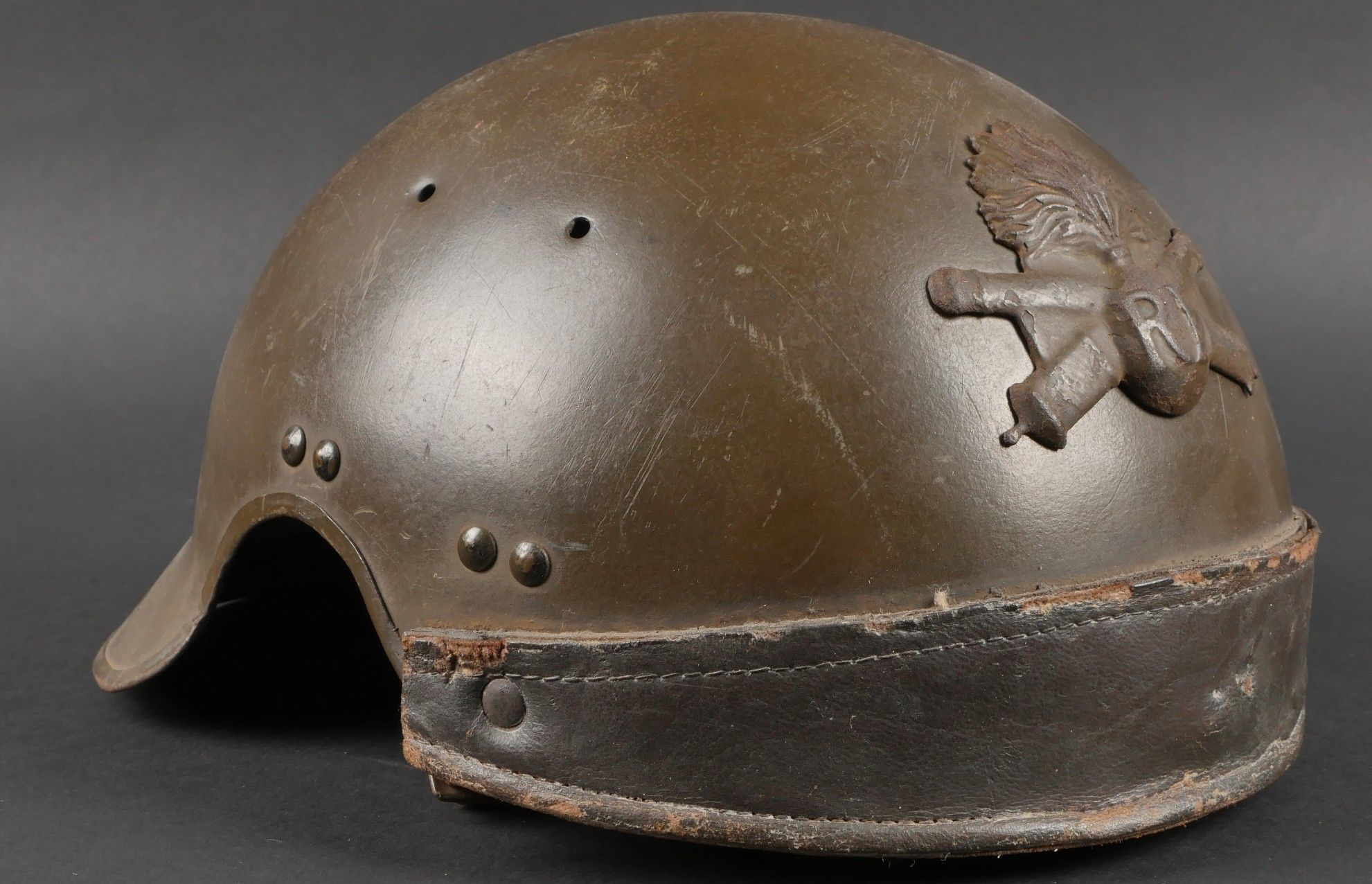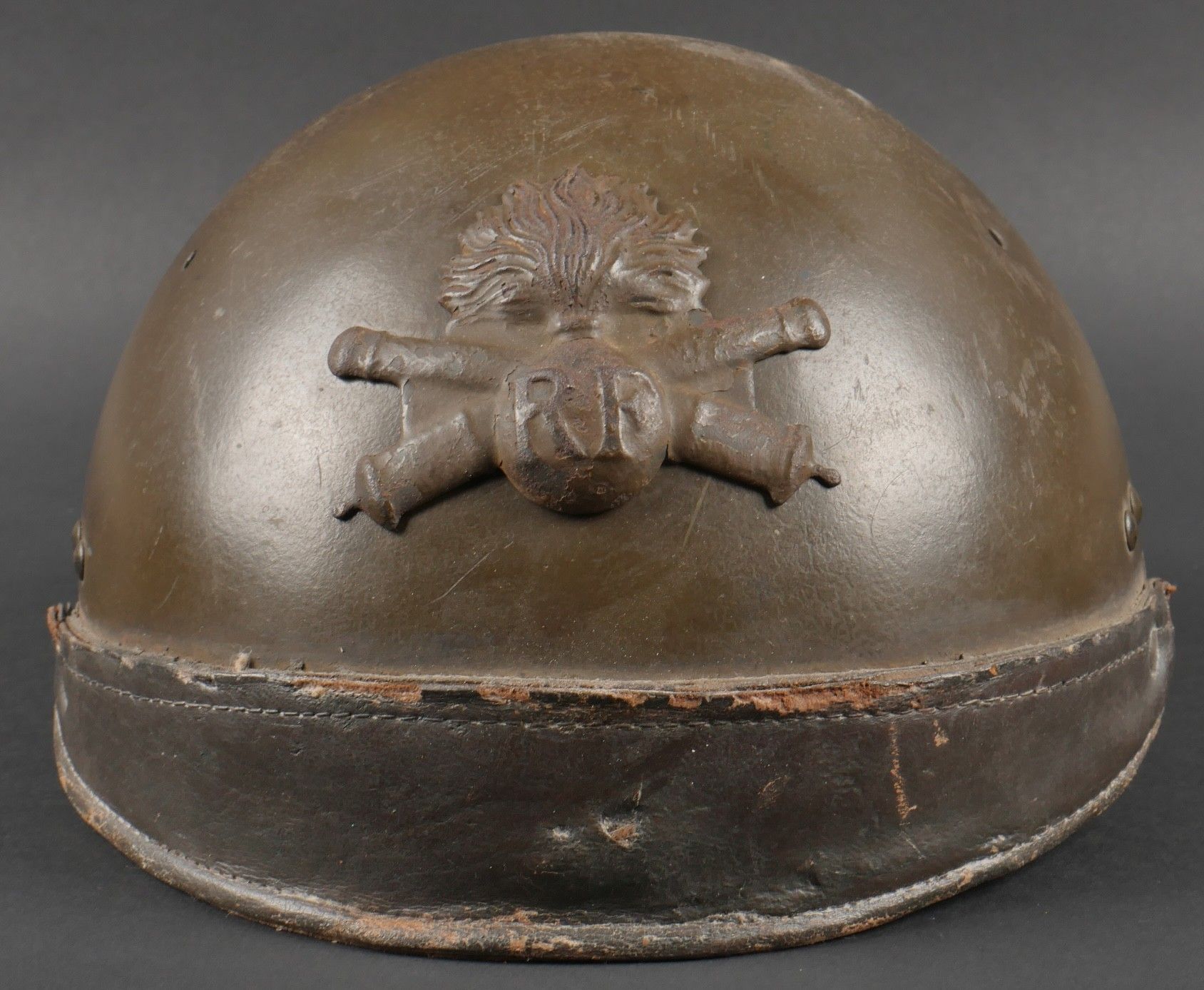 DCA helmet 1936. Anti-aircraft defence helmet in 90% khaki paint, model 1915 artillery attribute. Inner leather cap specific to the DCA model, six clasps, one of which is damaged. Sewn and riveted dark leather strap, Lum 38 manufacturer's stamp on bottom of bomb, original chinstrap. DCA helmet 1936 Antiaircraft defence helmet with 90% khaki paint and 1915 artillery emblem. Interior liner specific to the DCA model with six clips, one damaged. Leather edging sewn and riveted, bottom stamped with manufacturer Lum 38, original chinstrap.