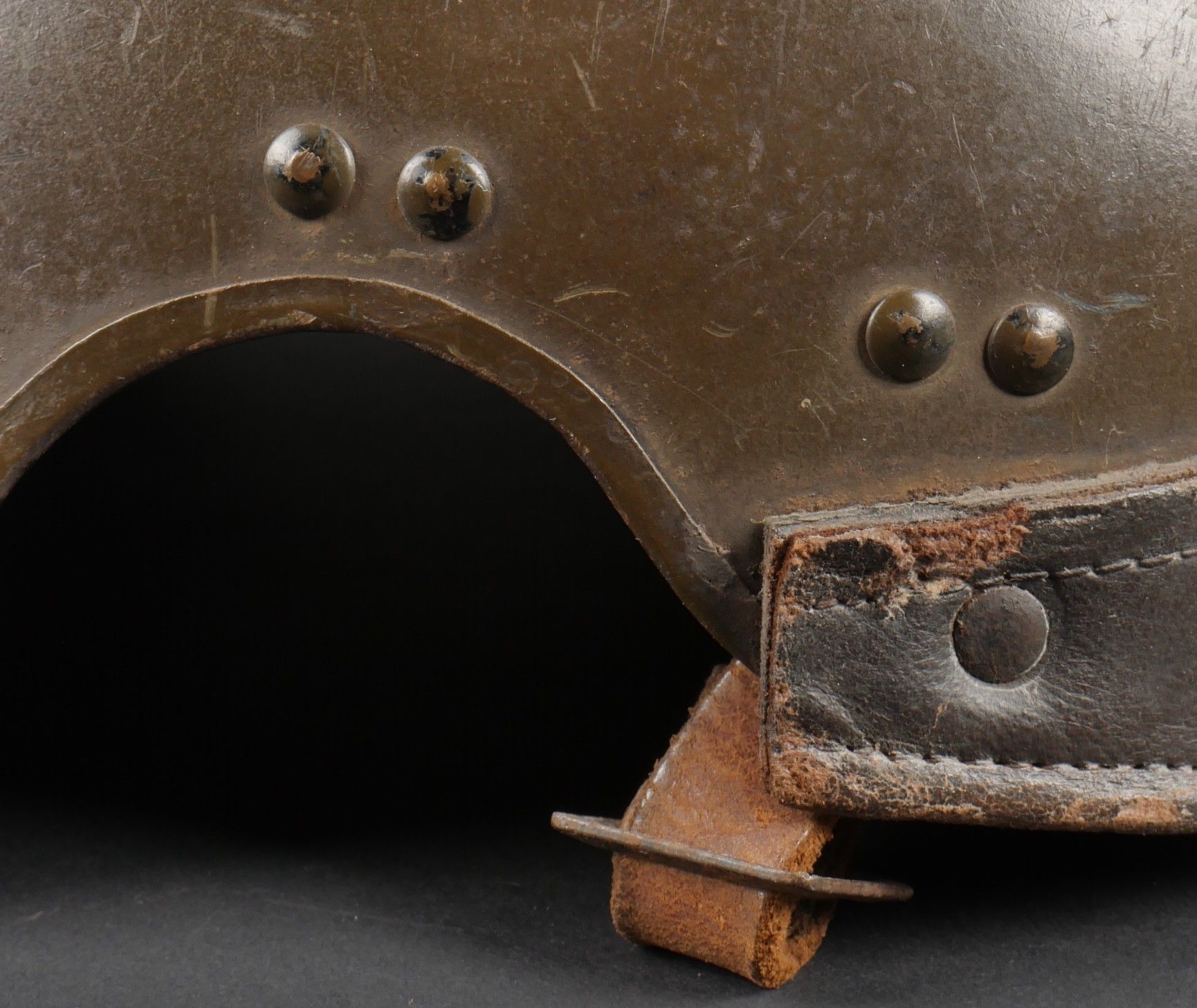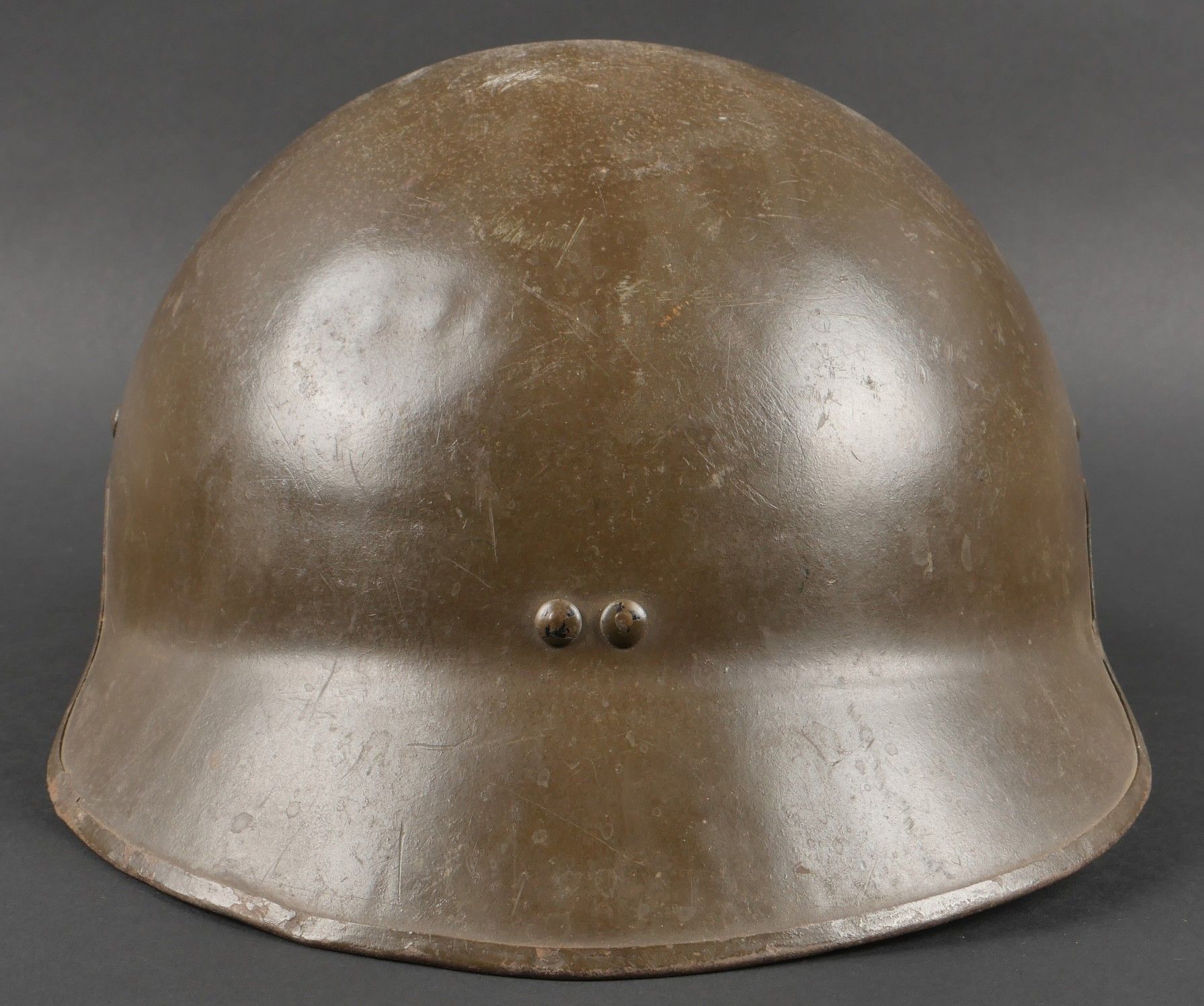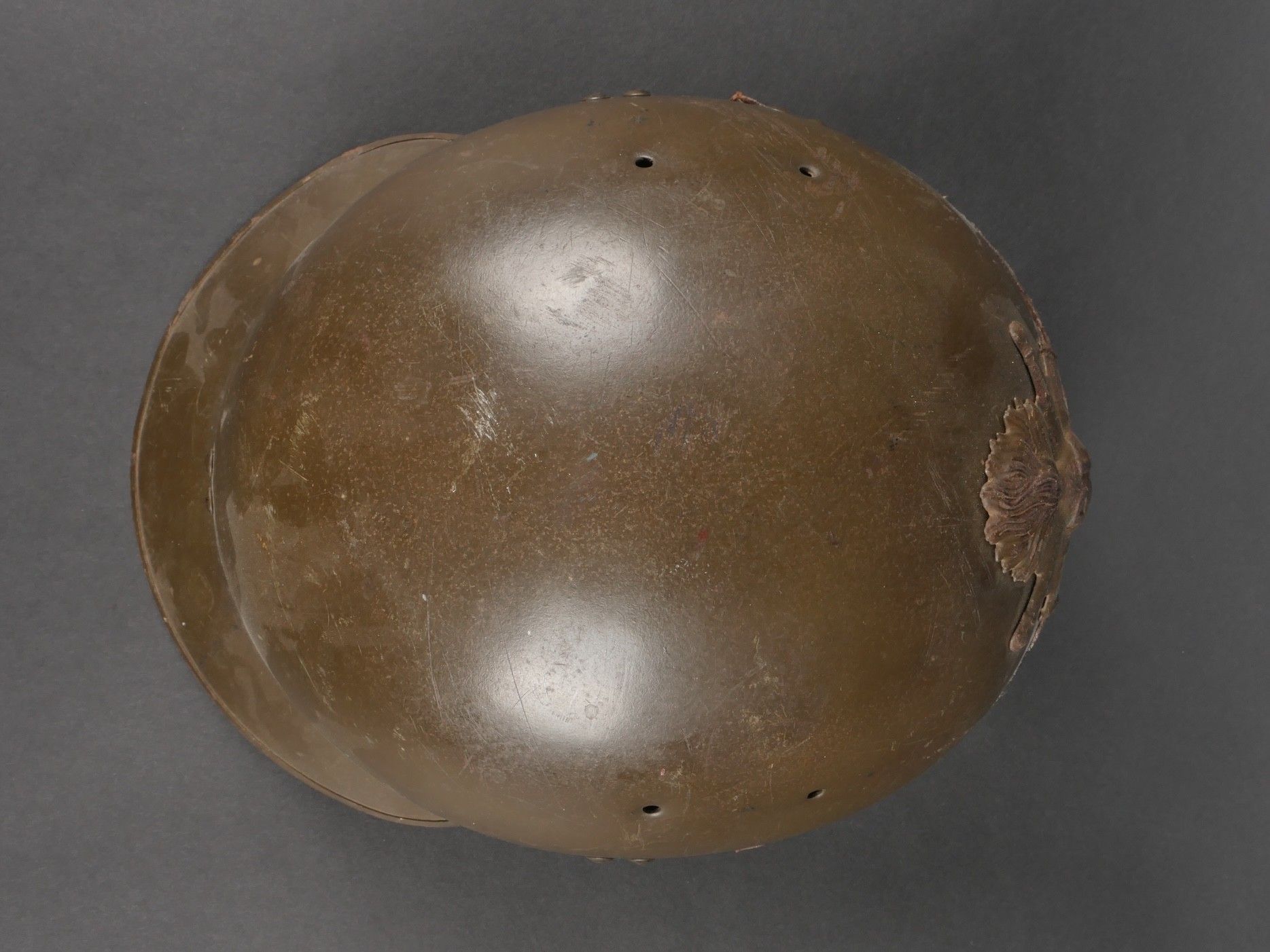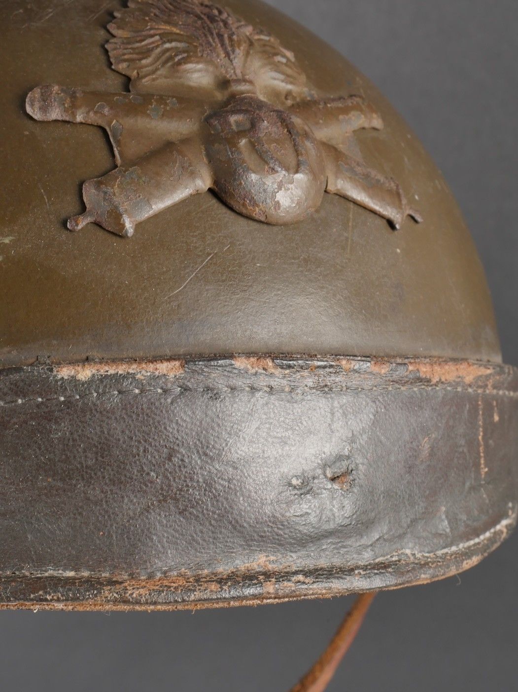 DCA helmet 1936. Anti-aircraft defence helmet in 90% khaki paint, model 1915 artillery attribute. Inner leather cap specific to the DCA model, six clasps, one of which is damaged. Sewn and riveted dark leather strap, Lum 38 manufacturer's stamp on bottom of bomb, original chinstrap. DCA helmet 1936 Antiaircraft defence helmet with 90% khaki paint and 1915 artillery emblem. Interior liner specific to the DCA model with six clips, one damaged. Leather edging sewn and riveted, bottom stamped with manufacturer Lum 38, original chinstrap.