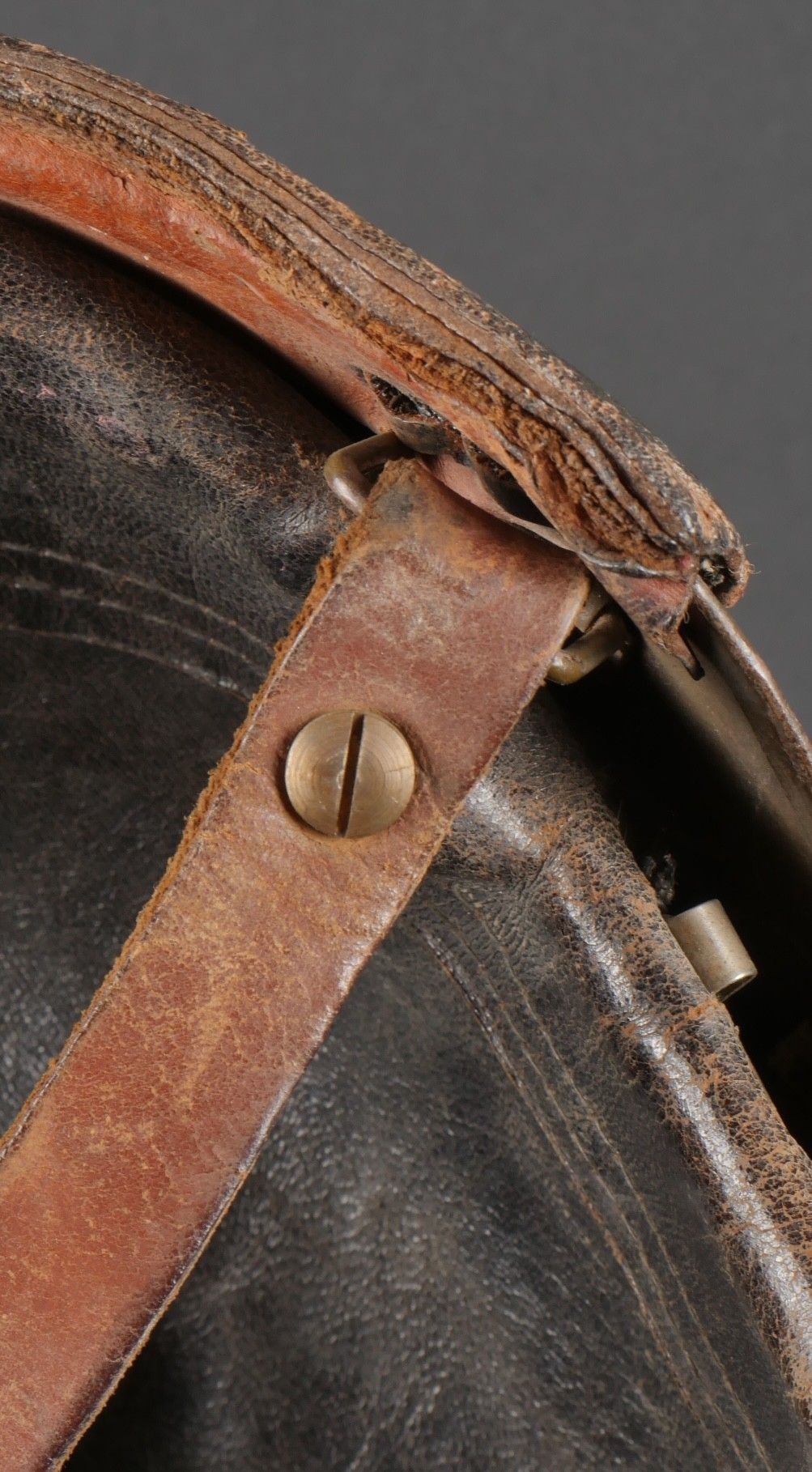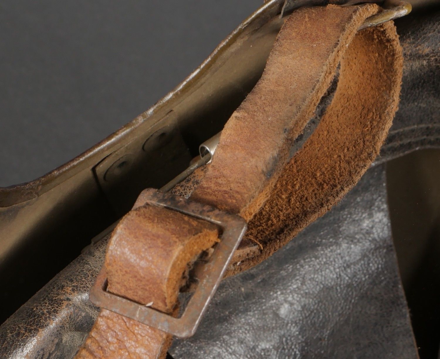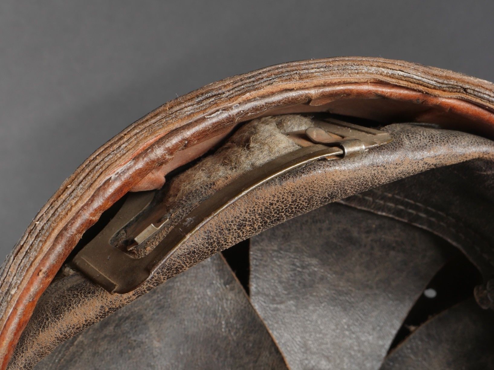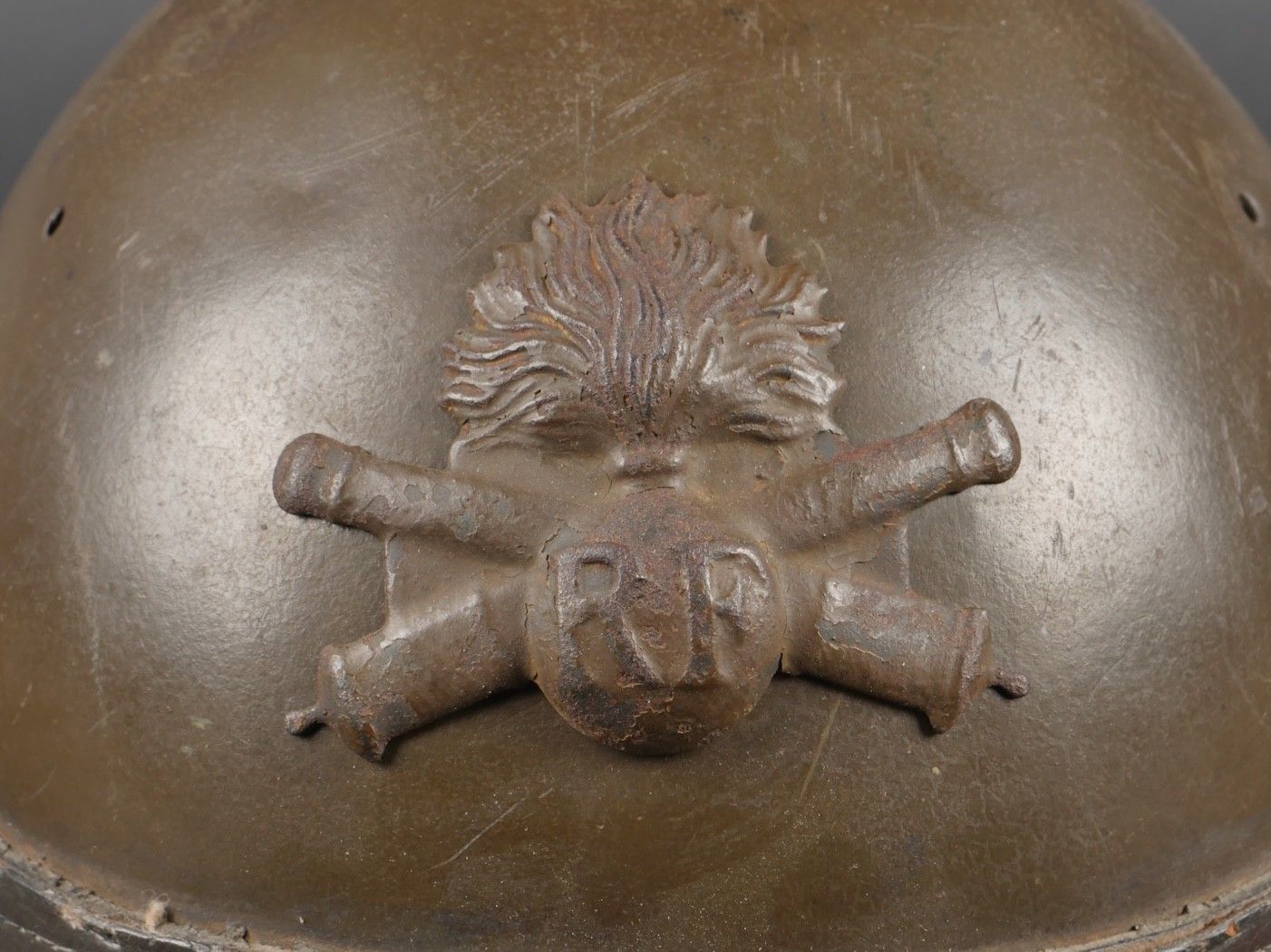 DCA helmet 1936. Anti-aircraft defence helmet in 90% khaki paint, model 1915 artillery attribute. Inner leather cap specific to the DCA model, six clasps, one of which is damaged. Sewn and riveted dark leather strap, Lum 38 manufacturer's stamp on bottom of bomb, original chinstrap. DCA helmet 1936 Antiaircraft defence helmet with 90% khaki paint and 1915 artillery emblem. Interior liner specific to the DCA model with six clips, one damaged. Leather edging sewn and riveted, bottom stamped with manufacturer Lum 38, original chinstrap.
