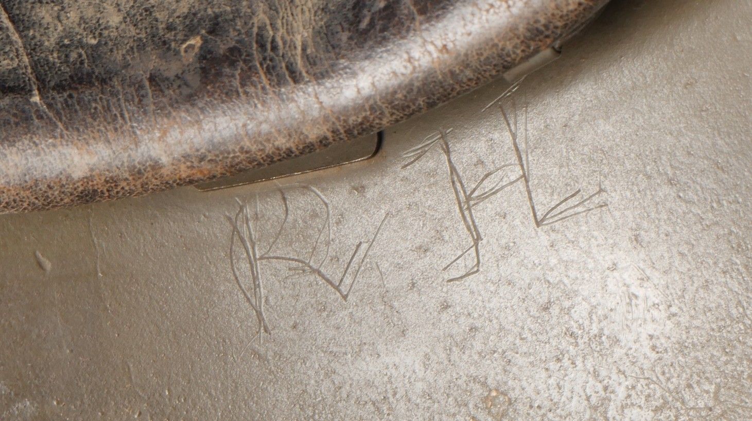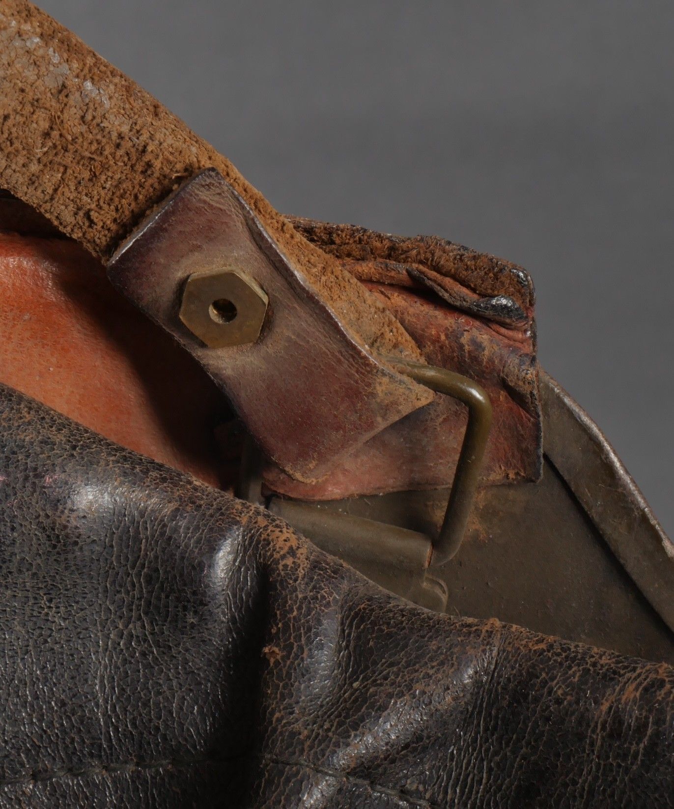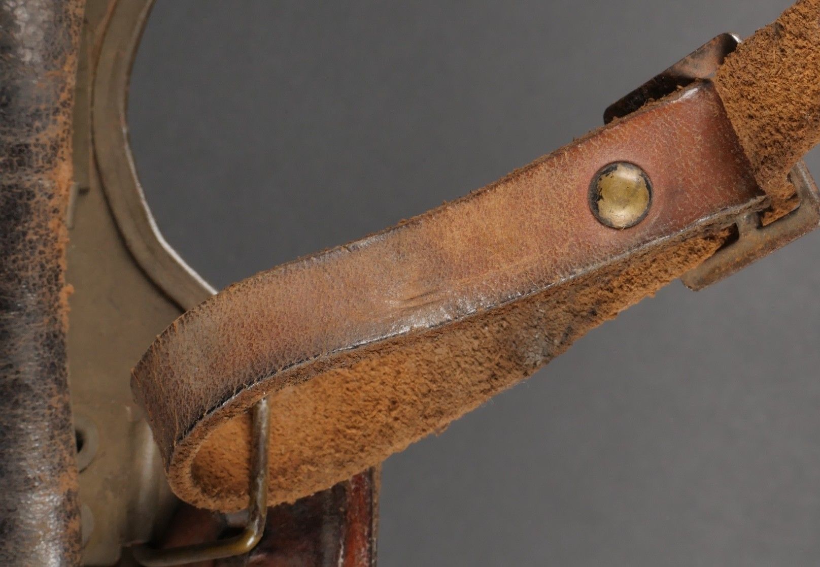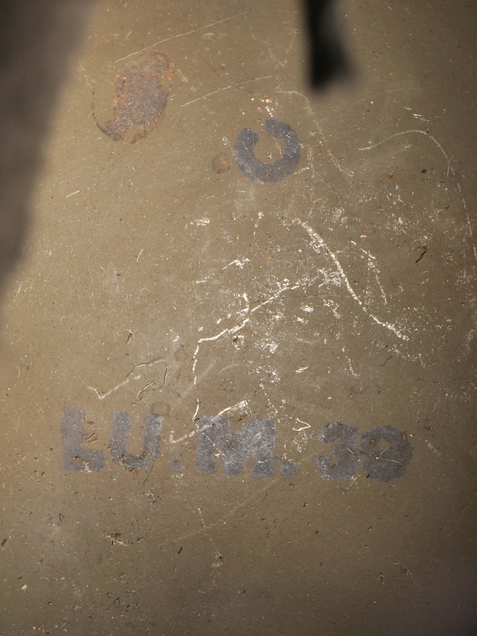 DCA helmet 1936. Anti-aircraft defence helmet in 90% khaki paint, model 1915 artillery attribute. Inner leather cap specific to the DCA model, six clasps, one of which is damaged. Sewn and riveted dark leather strap, Lum 38 manufacturer's stamp on bottom of bomb, original chinstrap. DCA helmet 1936 Antiaircraft defence helmet with 90% khaki paint and 1915 artillery emblem. Interior liner specific to the DCA model with six clips, one damaged. Leather edging sewn and riveted, bottom stamped with manufacturer Lum 38, original chinstrap.