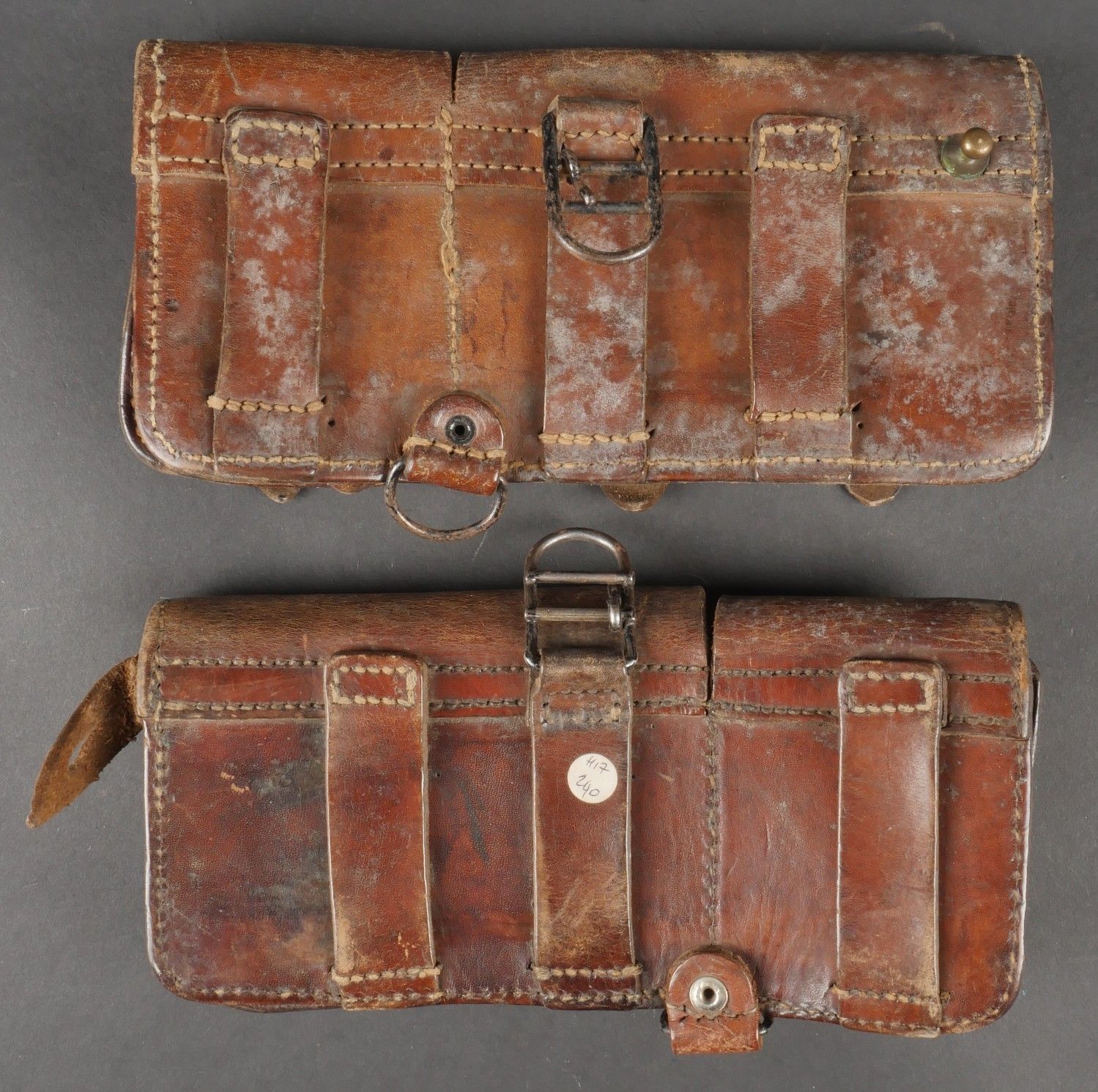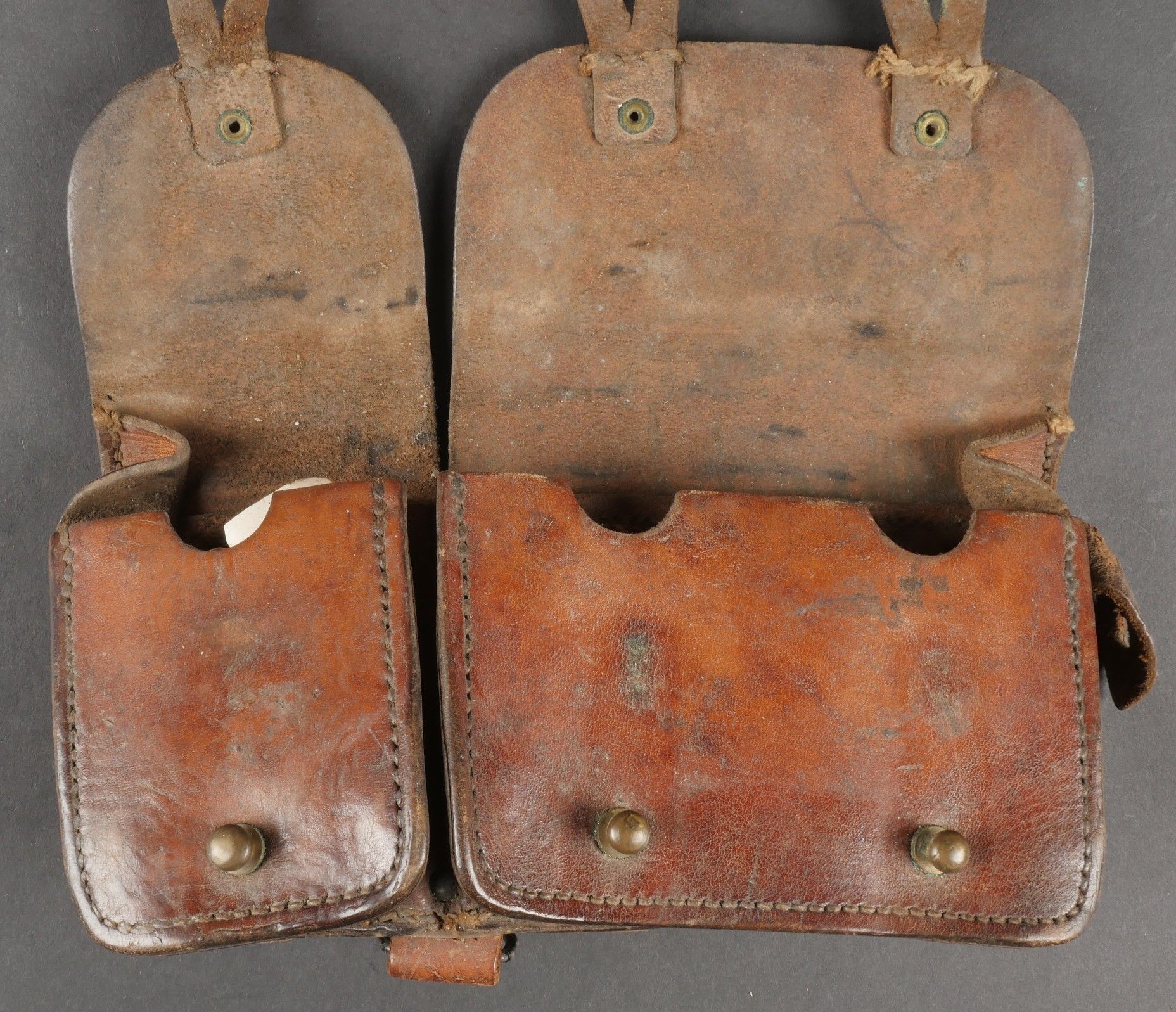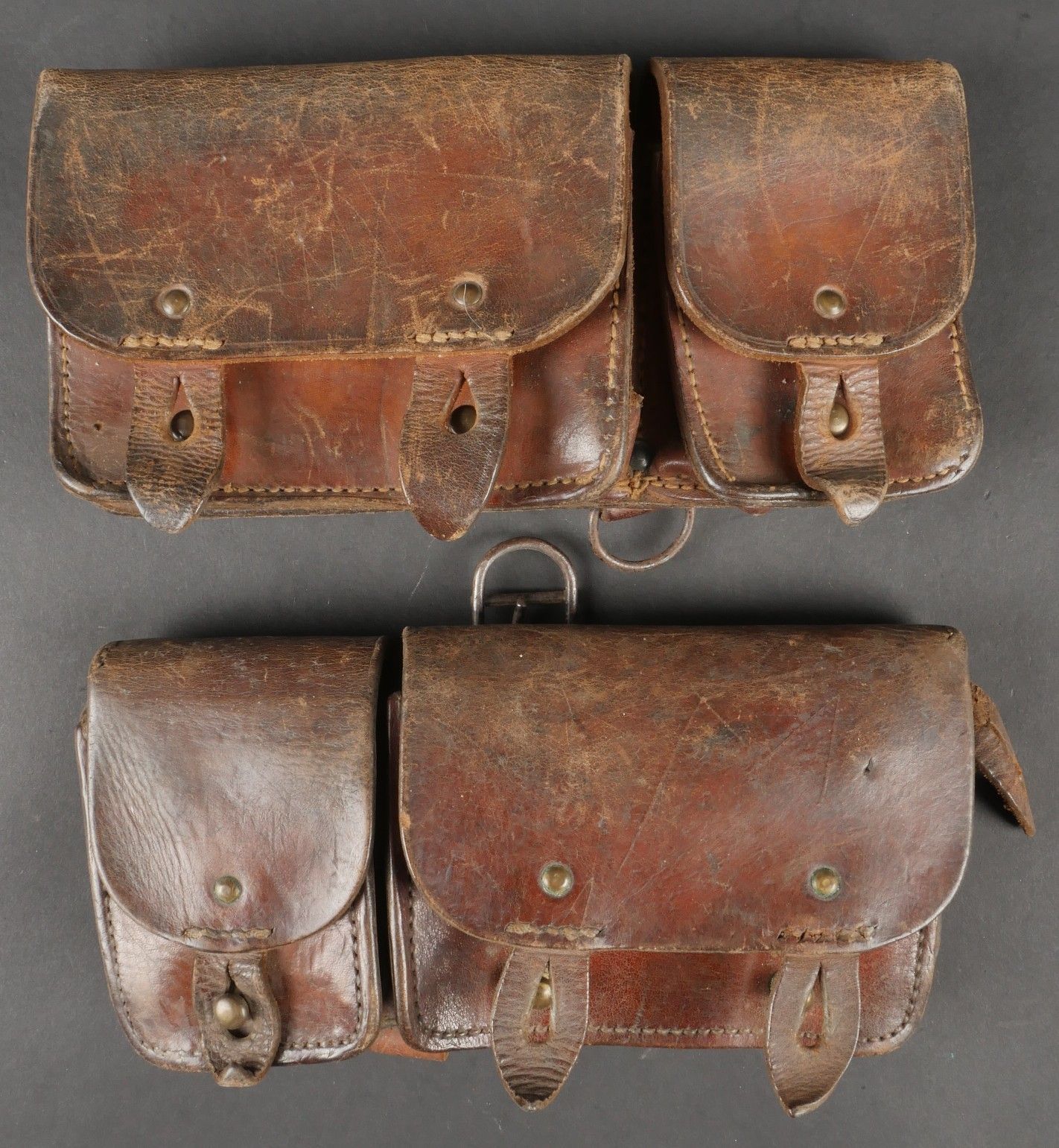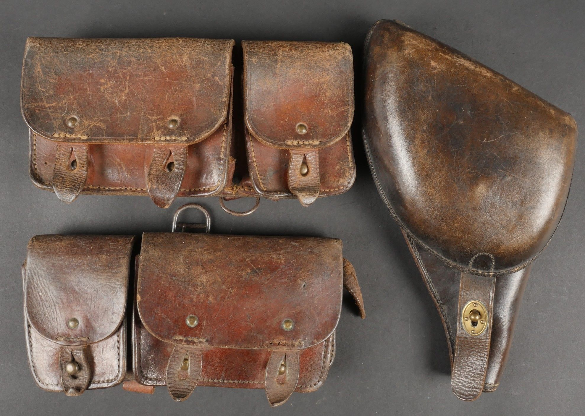 Lot of France 40 equipment comprising a pair of model 193537 cartridge belts, right side dated illegible, small leather tab present and later retaining ring, left side dated 1940, nipple present. A brown leather ham holster for an 1892 revolver dated 1904, cartridge cases still present. Lot of France 40 equipment Including a pair of cartridge pouches model 193537 right side illegible date small leather tab and rear retaining ring present left side dated 1940 stud present. Brown leather 1892 revolver holster dated 1904 with remaining cartridge loops.