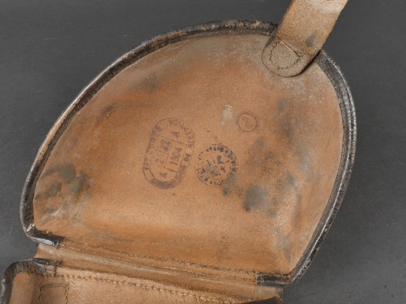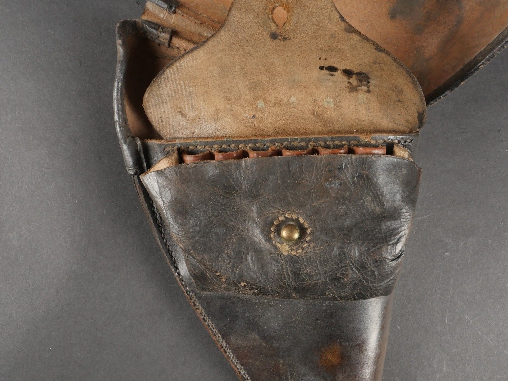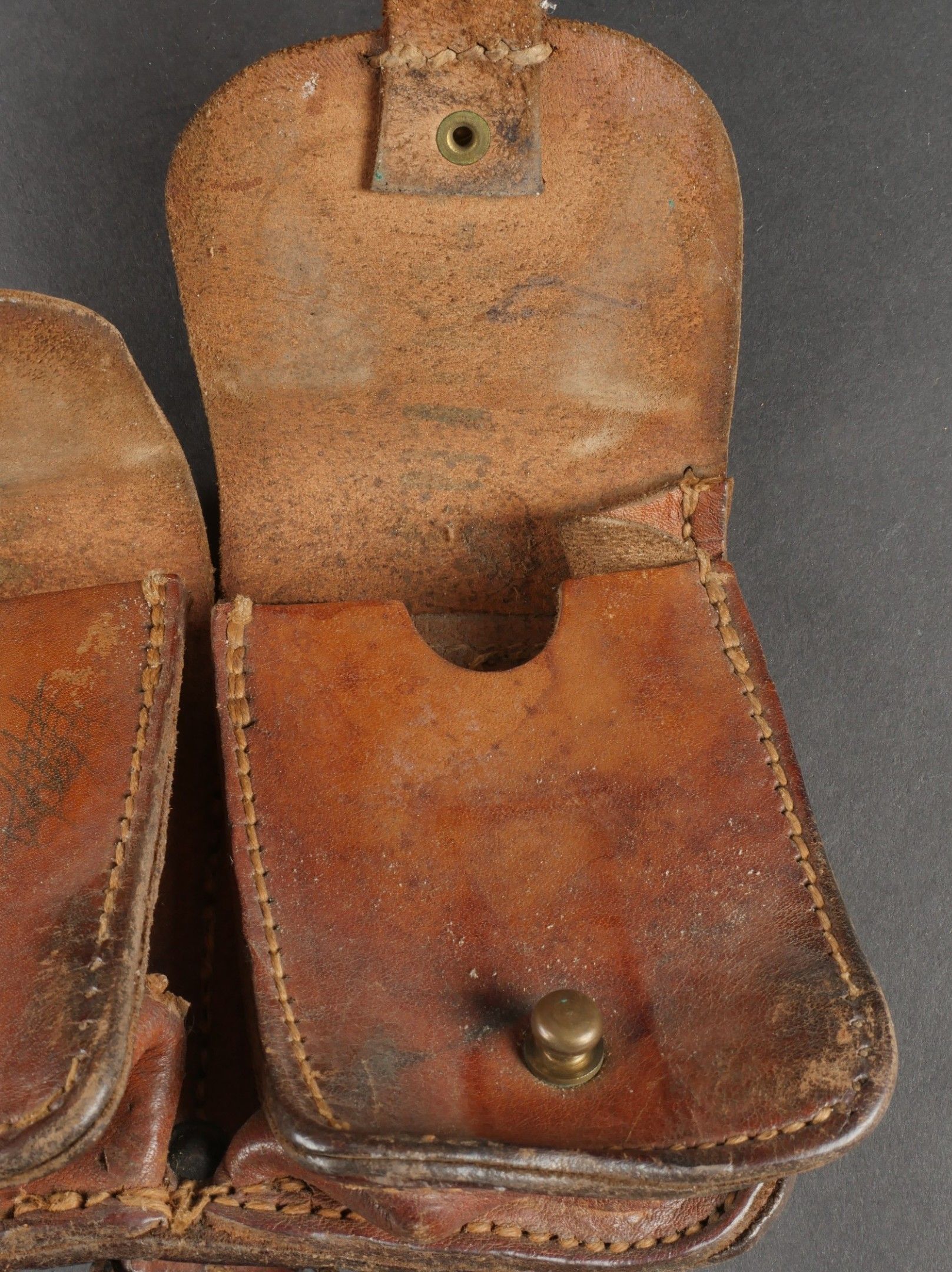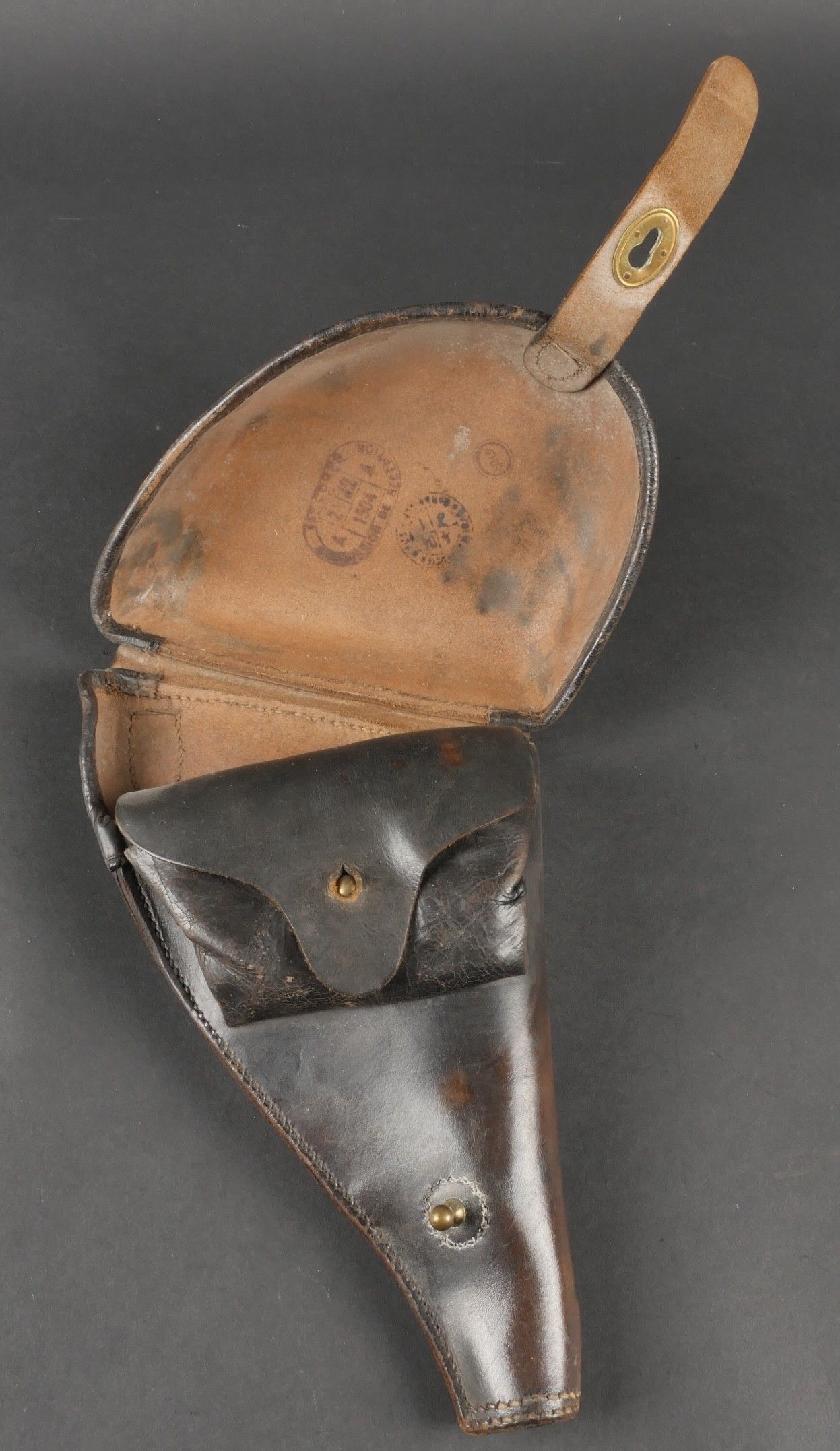 Lot of France 40 equipment comprising a pair of model 193537 cartridge belts, right side dated illegible, small leather tab present and later retaining ring, left side dated 1940, nipple present. A brown leather ham holster for an 1892 revolver dated 1904, cartridge cases still present. Lot of France 40 equipment Including a pair of cartridge pouches model 193537 right side illegible date small leather tab and rear retaining ring present left side dated 1940 stud present. Brown leather 1892 revolver holster dated 1904 with remaining cartridge loops.