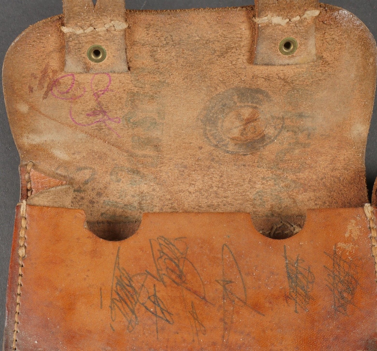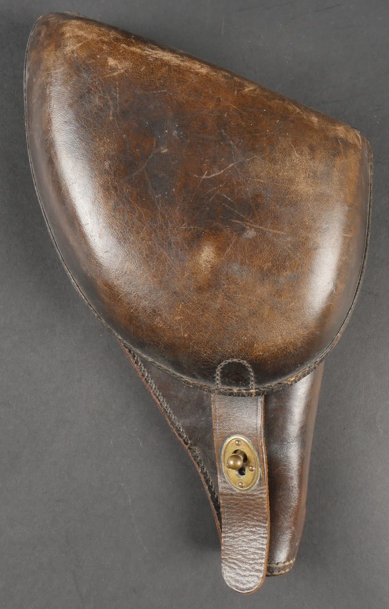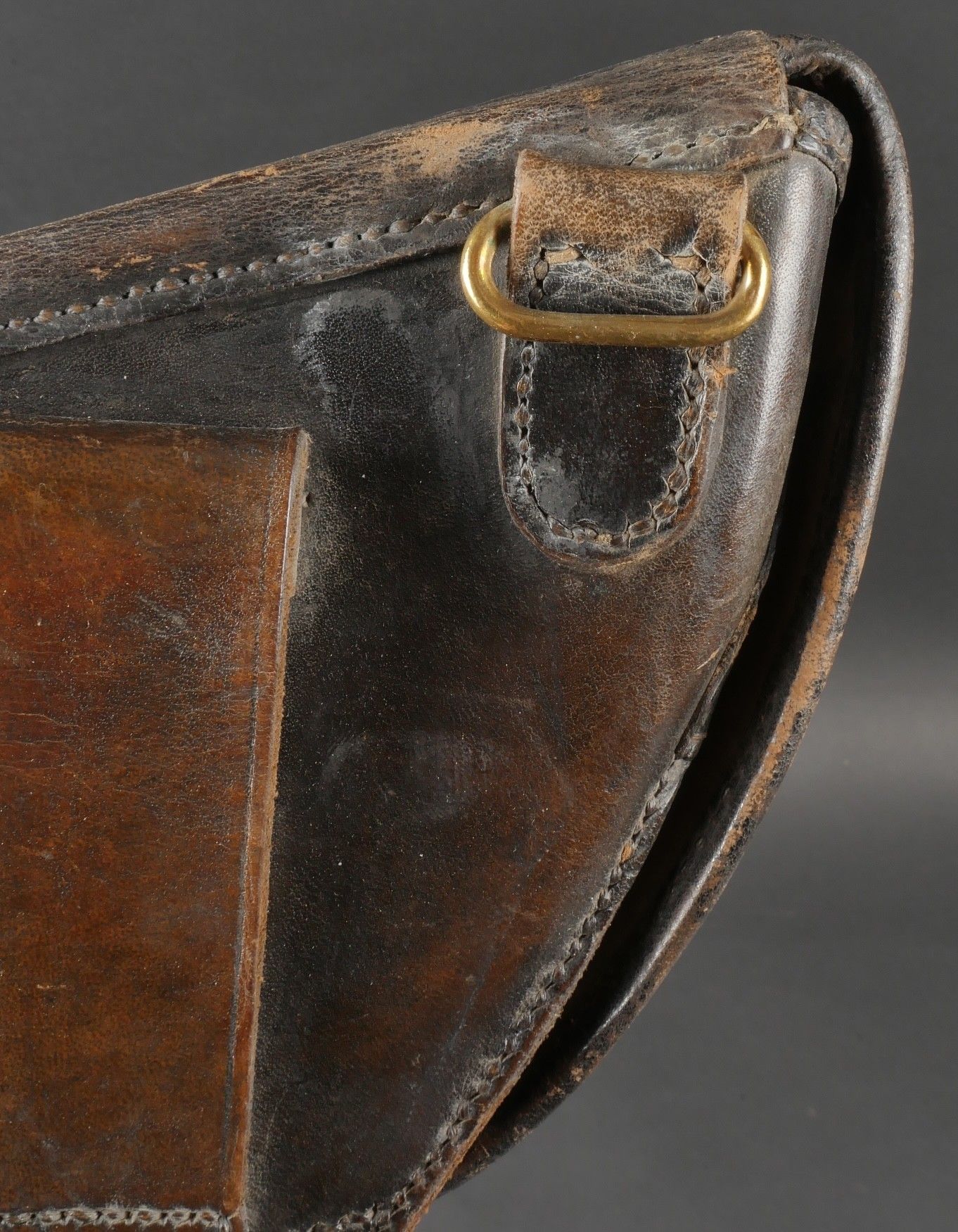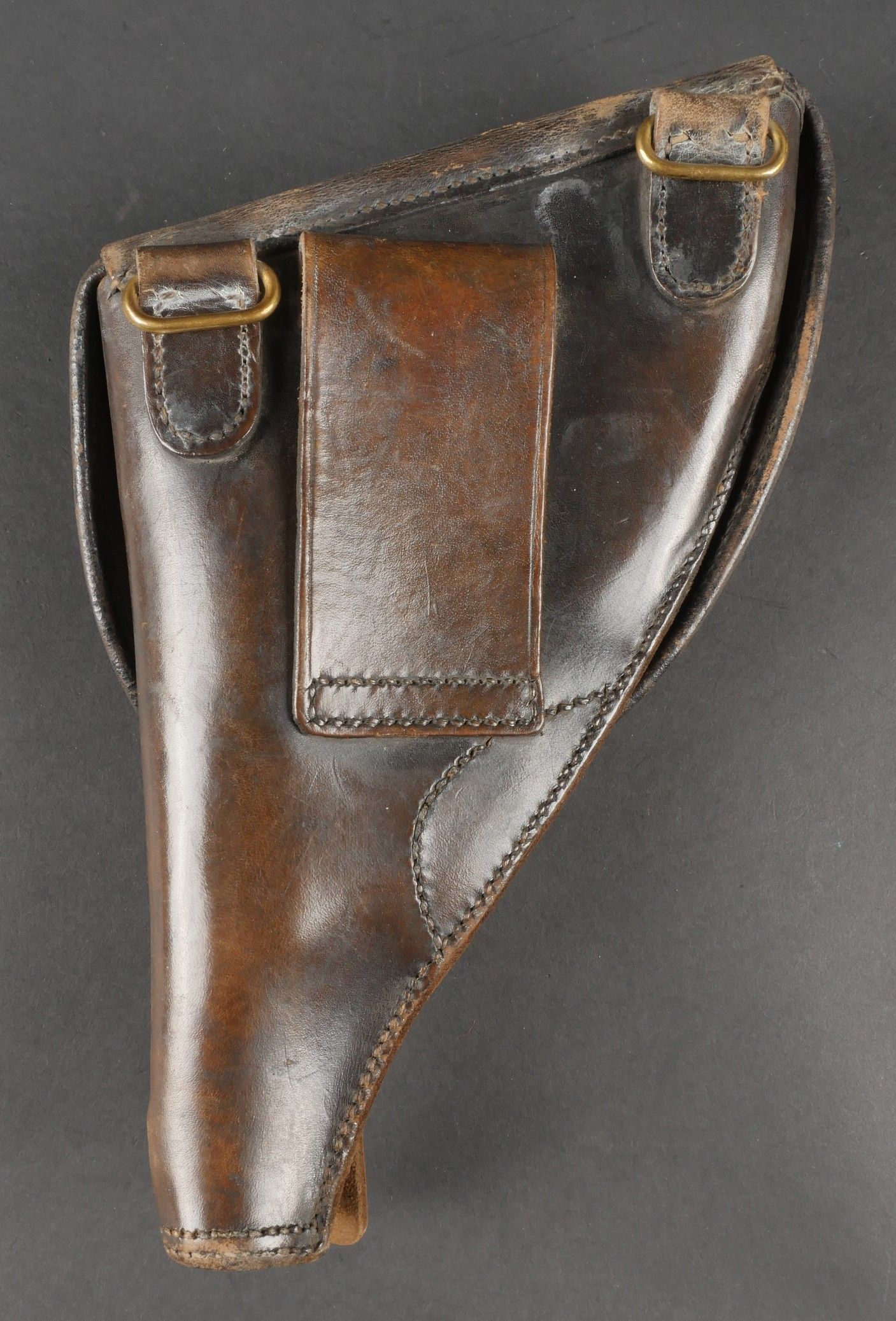 Lot of France 40 equipment comprising a pair of model 193537 cartridge belts, right side dated illegible, small leather tab present and later retaining ring, left side dated 1940, nipple present. A brown leather ham holster for an 1892 revolver dated 1904, cartridge cases still present. Lot of France 40 equipment Including a pair of cartridge pouches model 193537 right side illegible date small leather tab and rear retaining ring present left side dated 1940 stud present. Brown leather 1892 revolver holster dated 1904 with remaining cartridge loops.