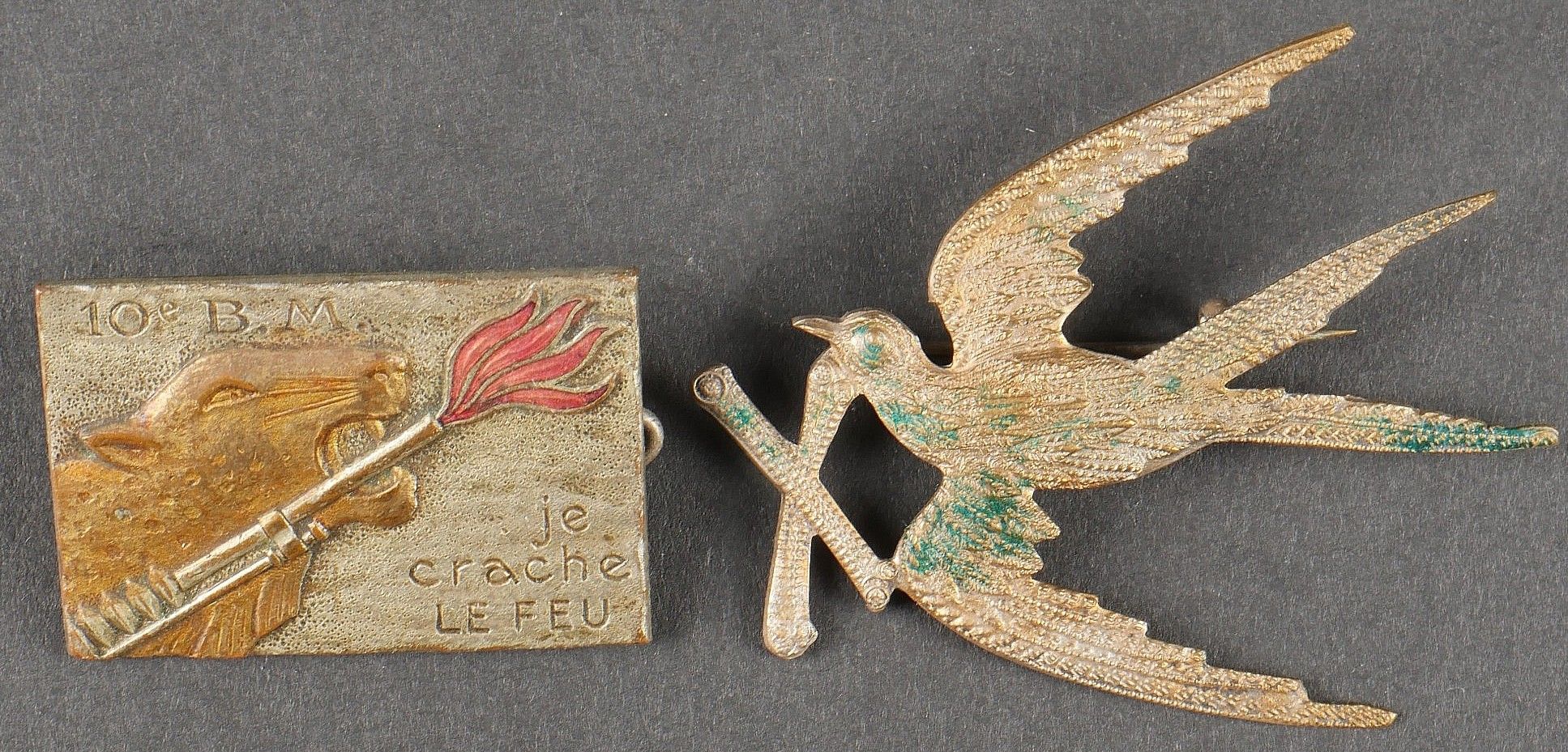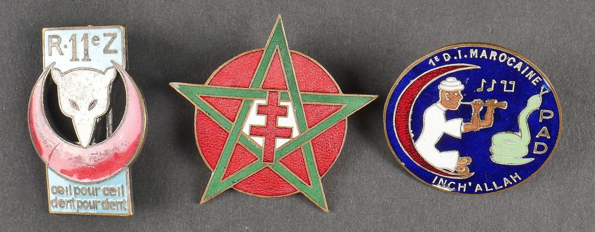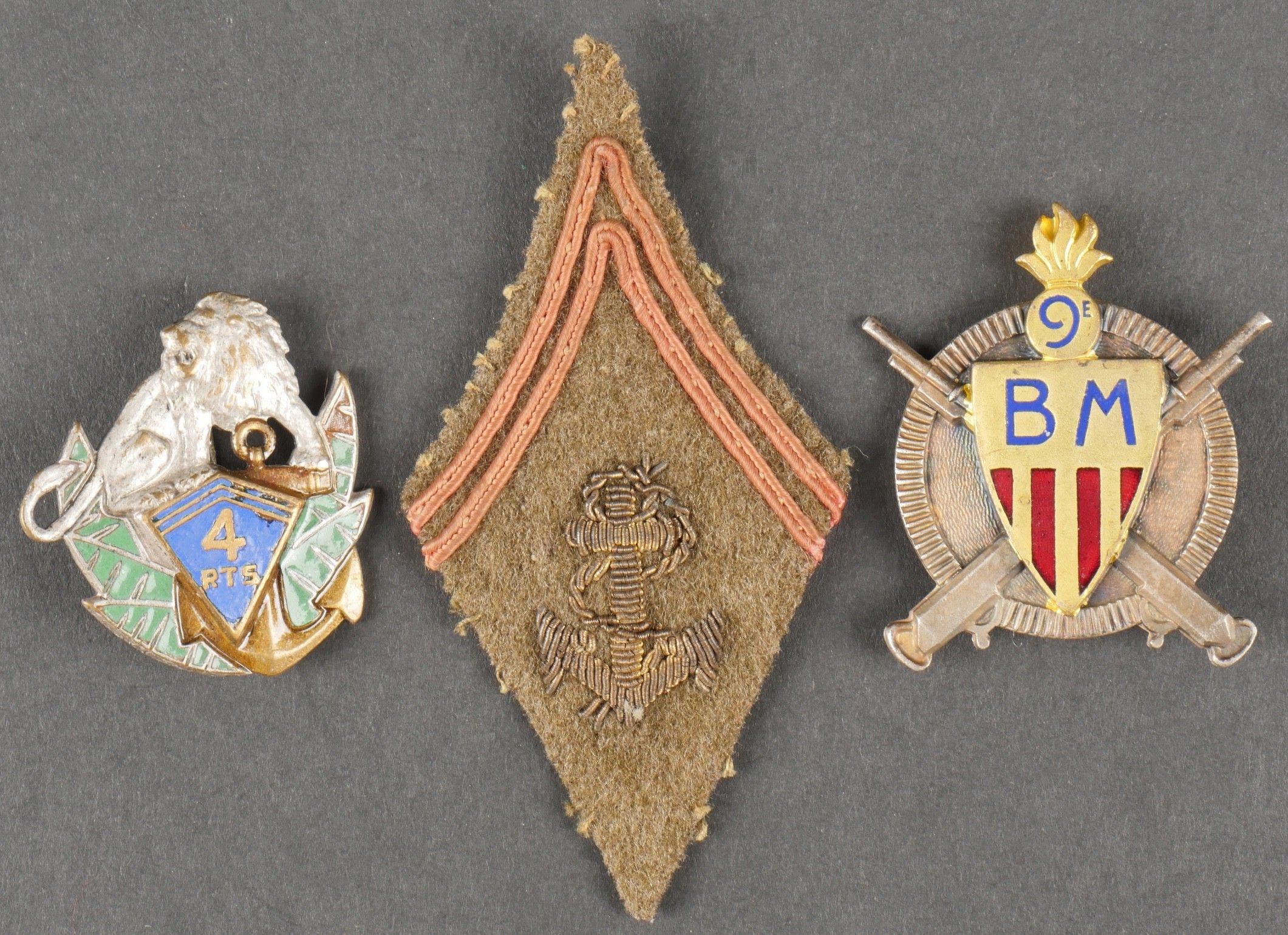 Lot of African Troops badges. Comprising a stamped brass badge of the 1st RTA. A Divisional Artillery Park 80 1st DIM badge, red crescent, screw fastening. A 4th RTS badge of Drago Béranger manufacture, screw fastening. A badge of the 11th Zouave made by Arthus Bertrand. A badge of the divisional sanitary group 80 1st DIM made by Fraisse Demey. A 9th Machine Gun Battalion badge made by Drago Béranger. A Drago Béranger 10th Machine Gun Battalion badge. A colonial infantry officer's collar. Lot of African troops insignia Including a 1st RTA badge in pressed brass, a divisional artillery park 80 1st DIM badge with red crescent and screw fastener, a 4th RTS badge by Drago Béranger with repaired attachment, an 11th Zouaves badge by Arthus Bertrand, a 80 1st DIM divisional medical group badge by Fraisse Demey, a 9th machinegun battalion badge by Drago Béranger, a 10th machinegun battalion badge by Drago Béranger, and a colonial infantry officer's collar patch.
