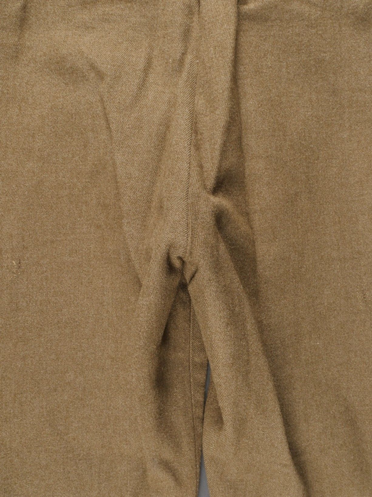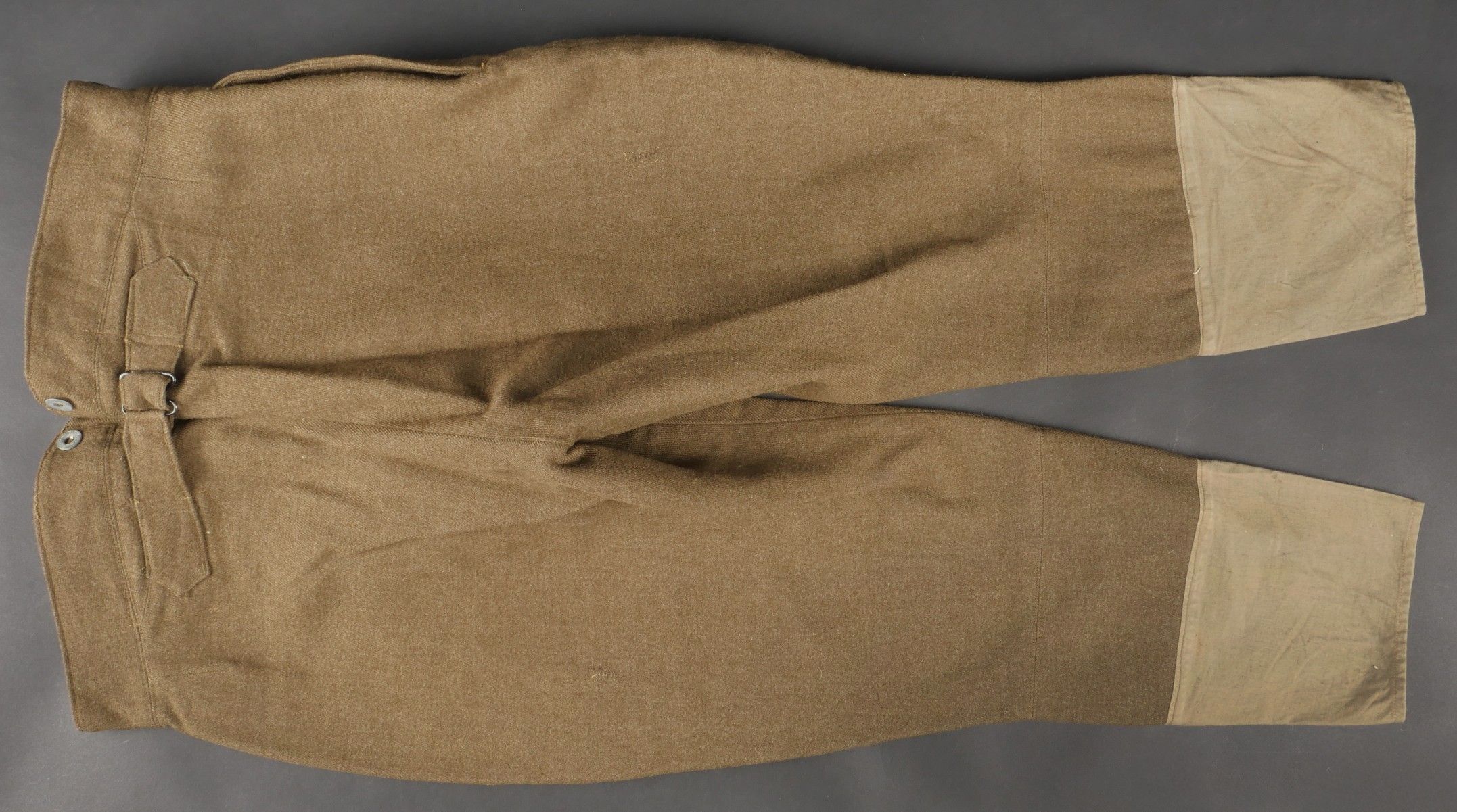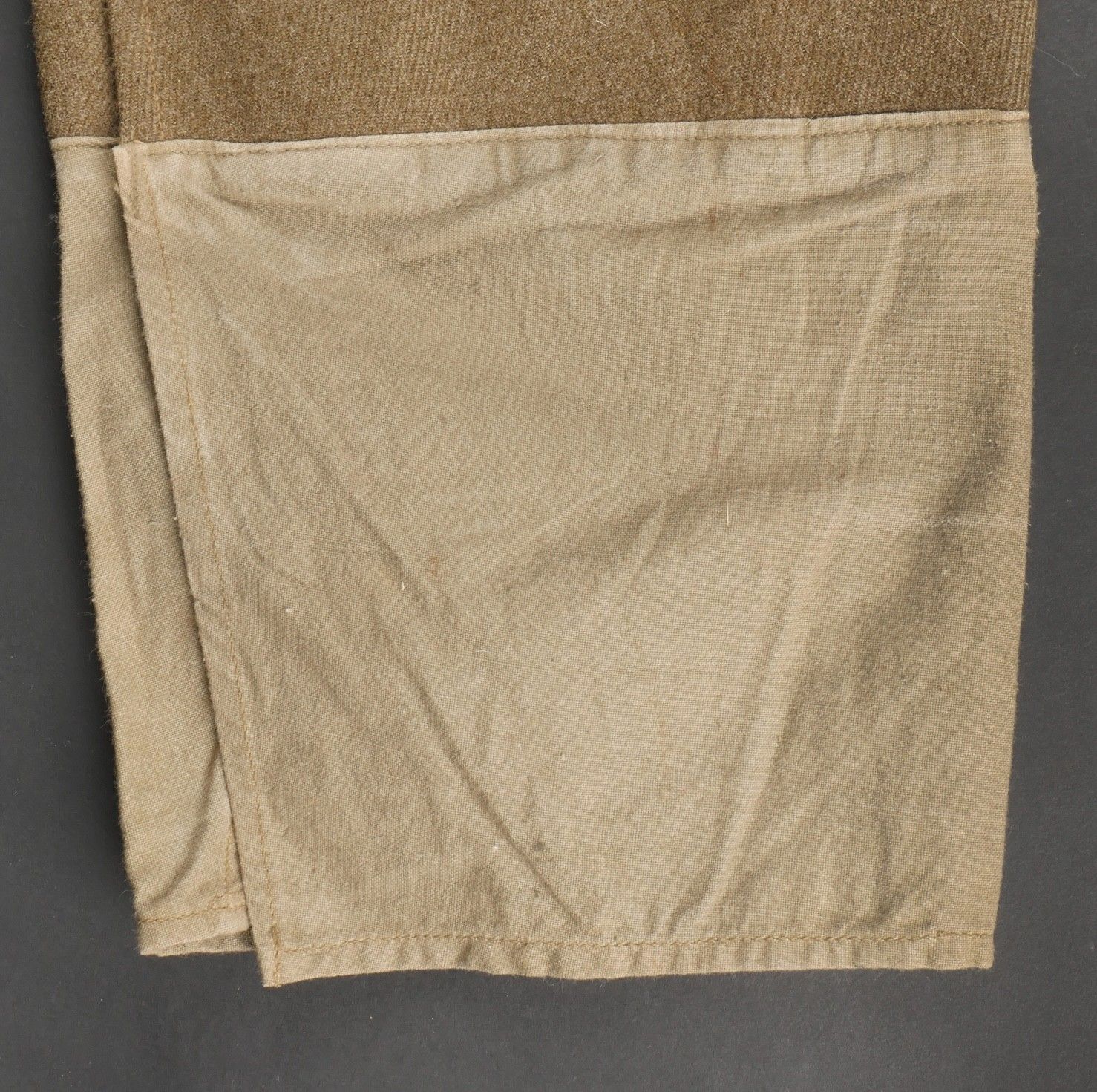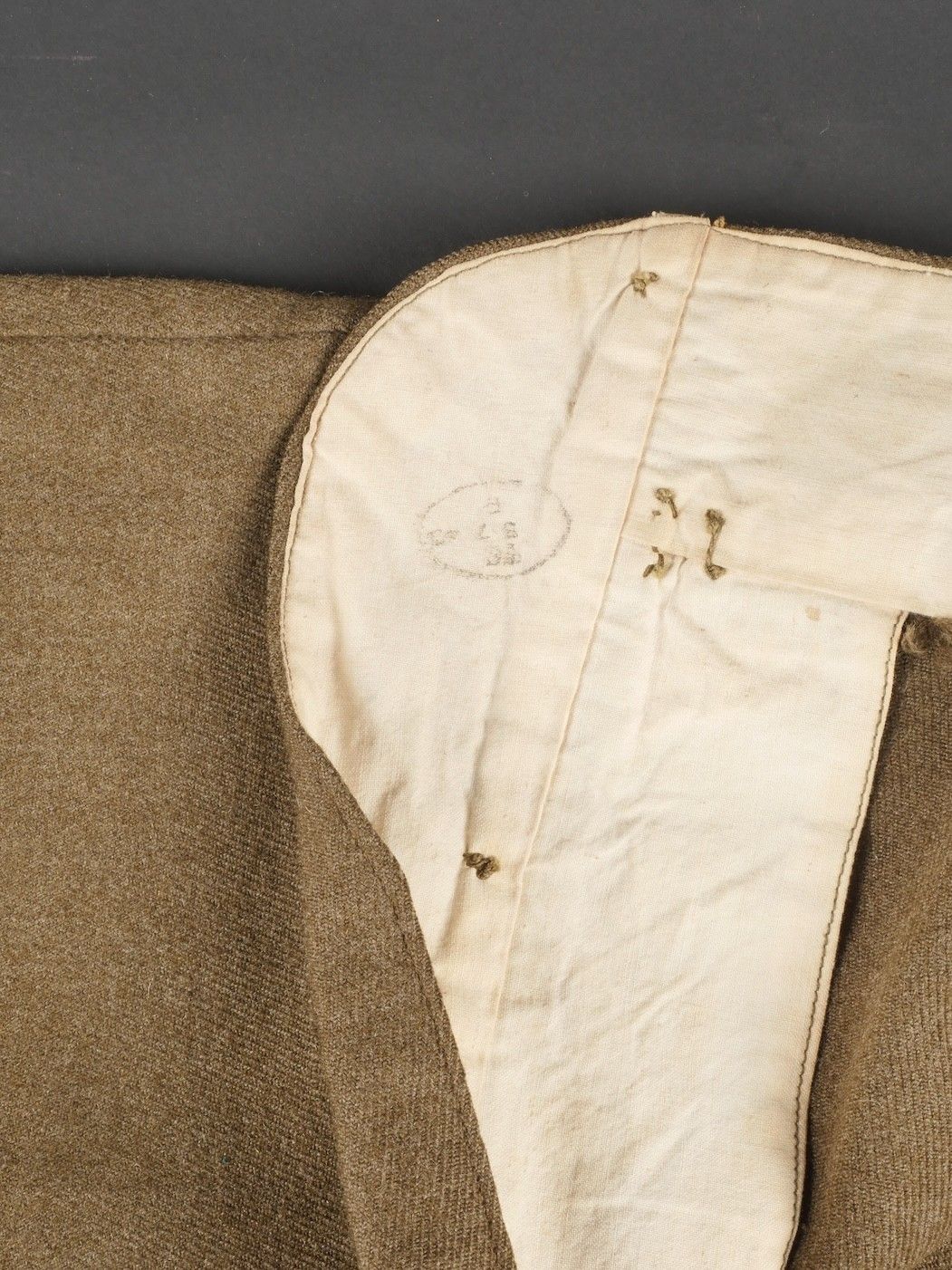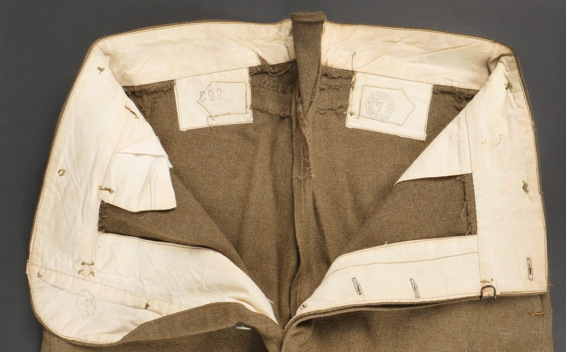 Colonial troops trousers 1922. Khaki combed cloth, fly with four buttons, khaki fabric cuffs. Some minor period repairs. Unbleached cotton lining with manufacturer's and size markings and date 240. Breeches 1922 colonial troops Fine khaki wool with buttoned fly of four buttons and khaki cloth cuffs. Minor period repairs. Unbleached cotton lining marked with size manufacturer and date 240.