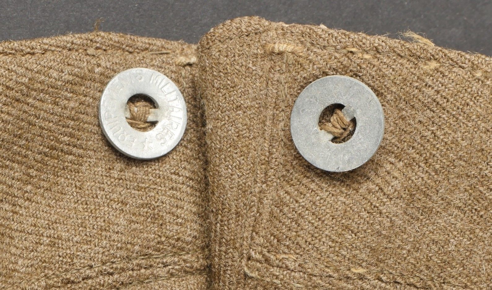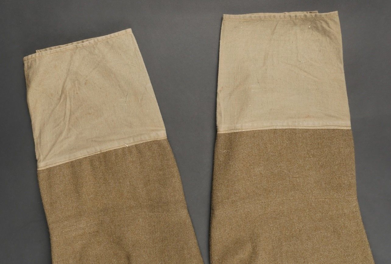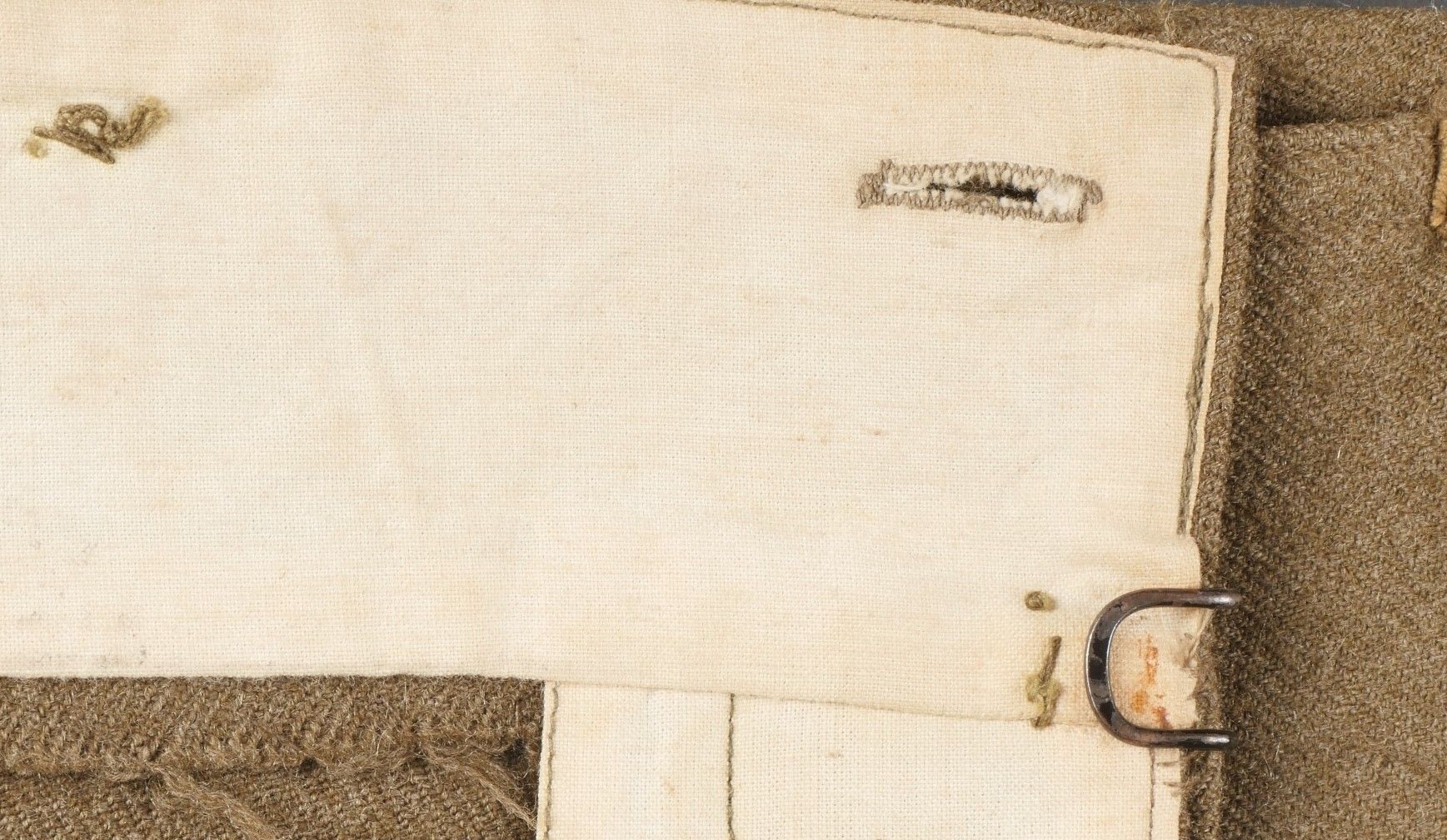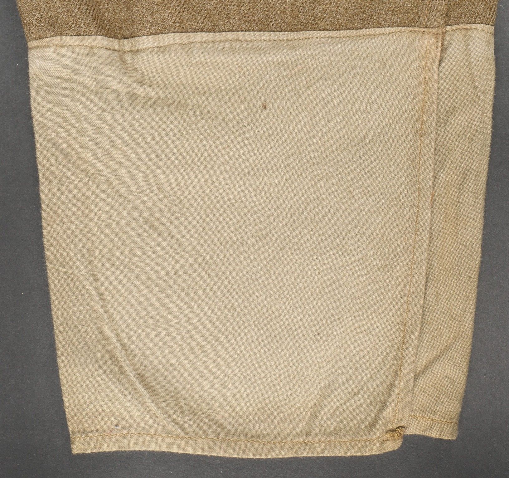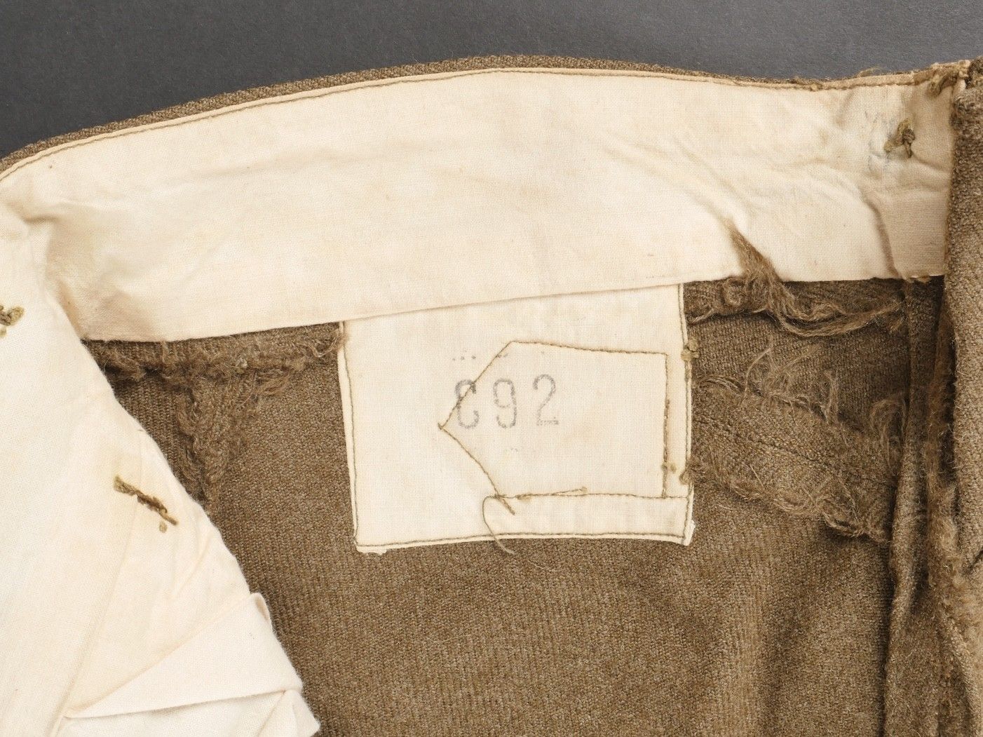 Colonial troops trousers 1922. Khaki combed cloth, fly with four buttons, khaki fabric cuffs. Some minor period repairs. Unbleached cotton lining with manufacturer's and size markings and date 240. Breeches 1922 colonial troops Fine khaki wool with buttoned fly of four buttons and khaki cloth cuffs. Minor period repairs. Unbleached cotton lining marked with size manufacturer and date 240.