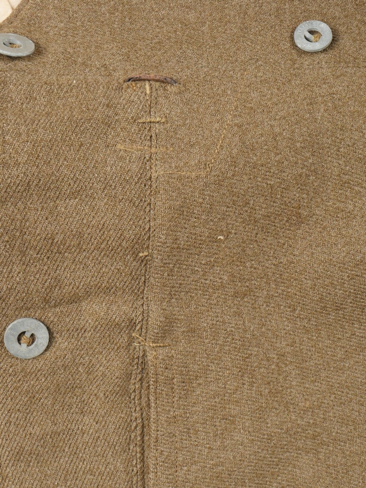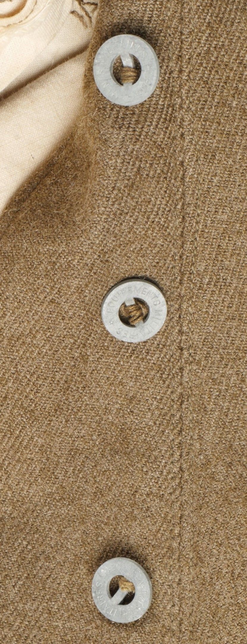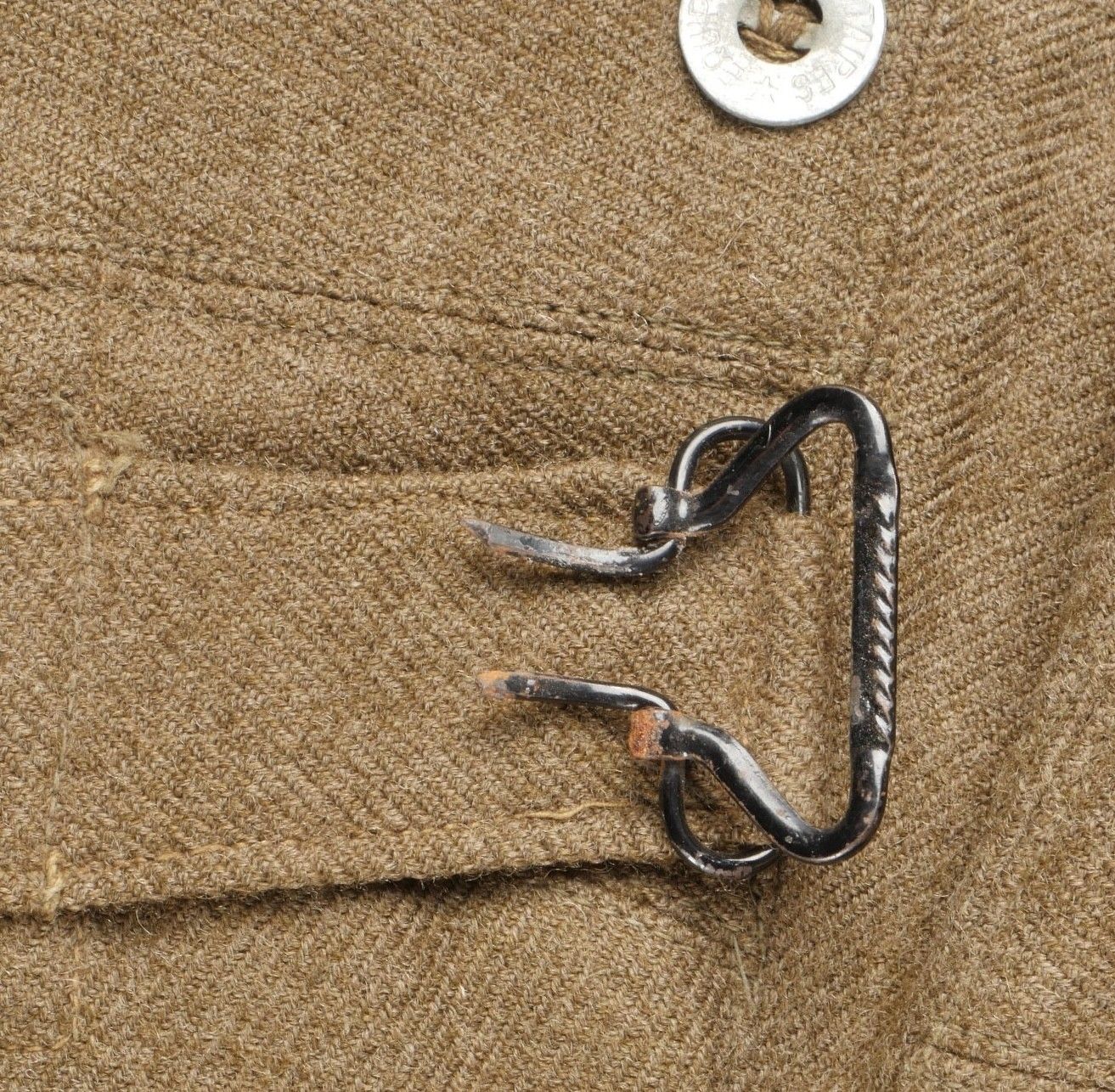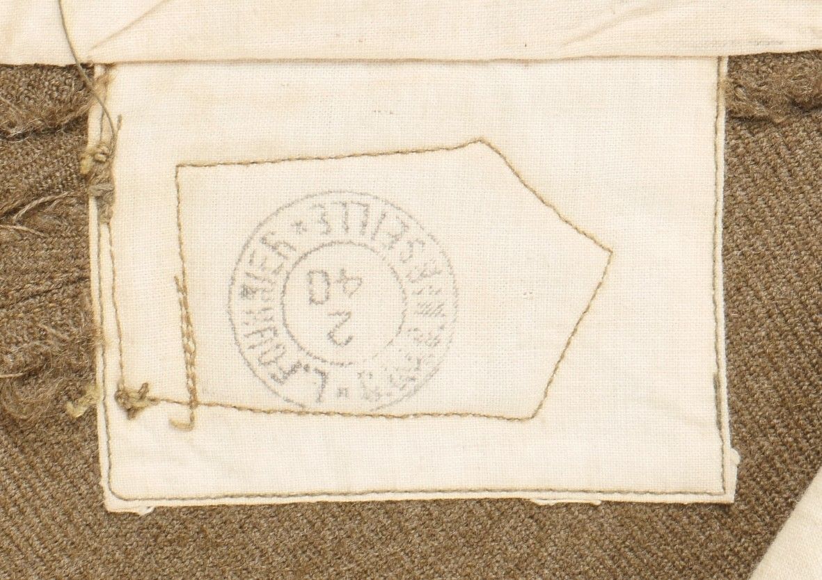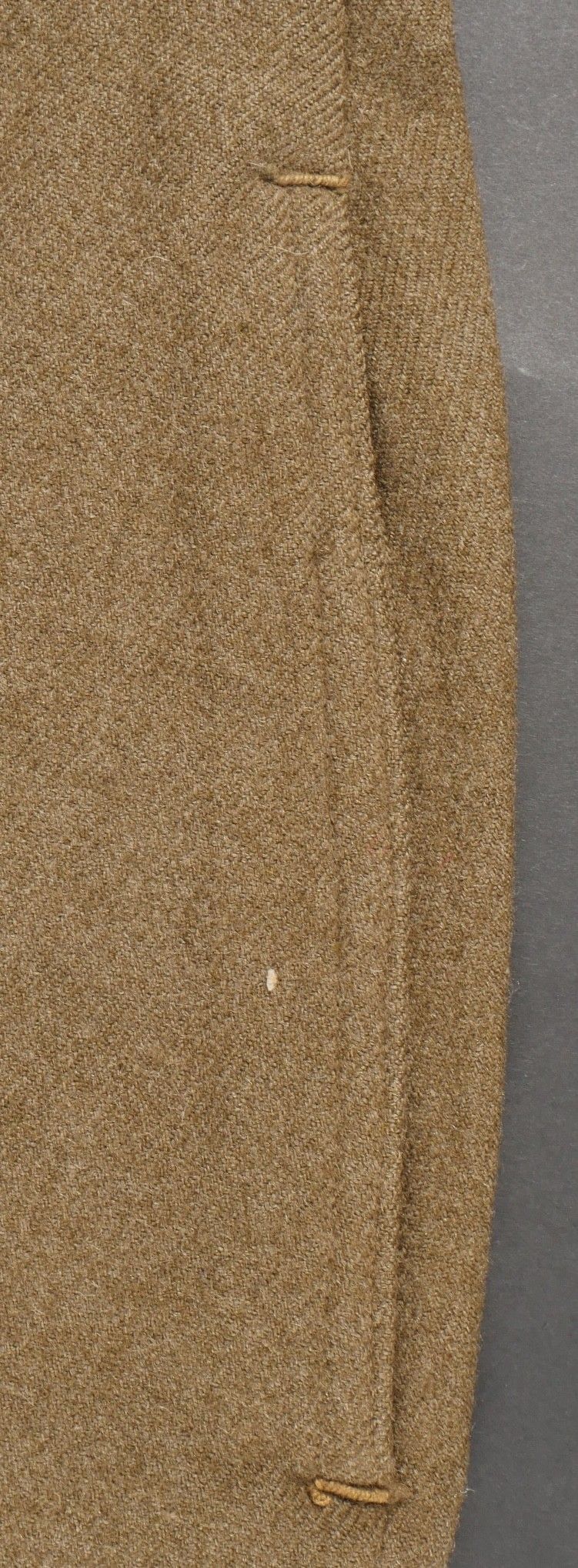 Colonial troops trousers 1922. Khaki combed cloth, fly with four buttons, khaki fabric cuffs. Some minor period repairs. Unbleached cotton lining with manufacturer's and size markings and date 240. Breeches 1922 colonial troops Fine khaki wool with buttoned fly of four buttons and khaki cloth cuffs. Minor period repairs. Unbleached cotton lining marked with size manufacturer and date 240.