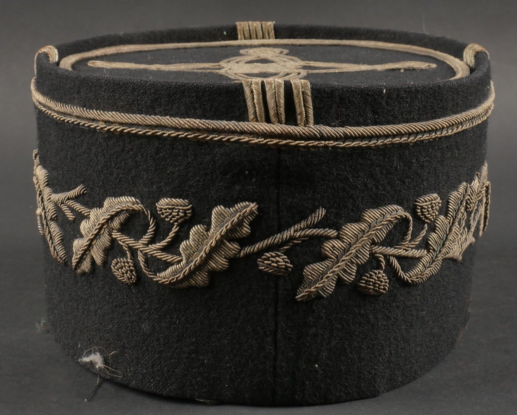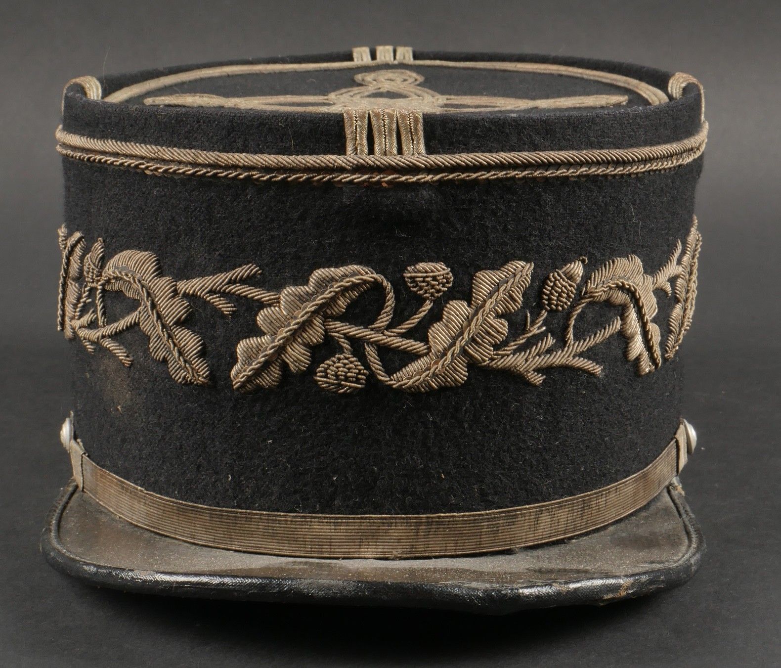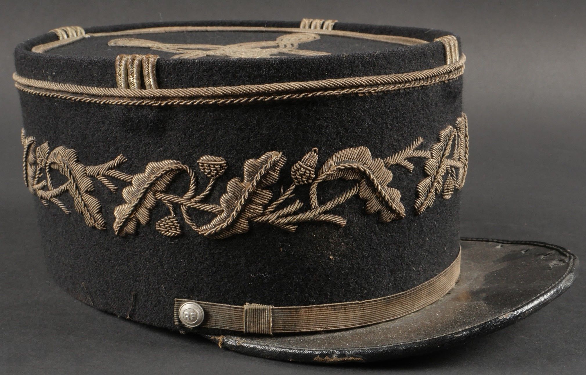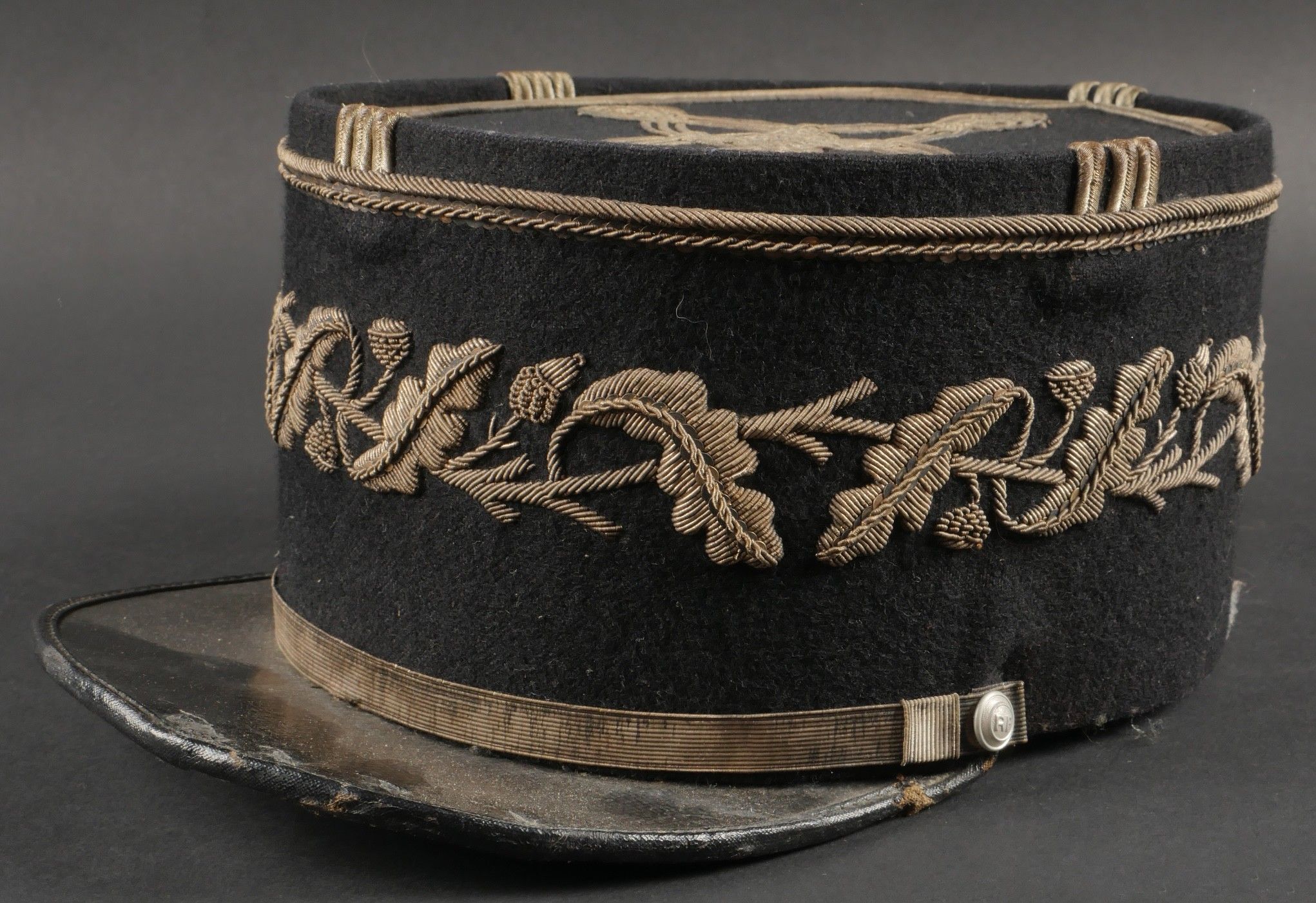 1931 police commissioner's kepi. Made of black cloth, braid and embroidery and silver trimmings with a single row of oak leaves. Three-strand Hungarian knot, small RF-stamped buttons. Leather visor with damaged leather rim at the end of the left side, leather headband missing. Képi 1931 police commissioner Made of black wool cloth with silver braid embroidery and trim forming a single row of oak leaves. Threestrand Hungarian knot small buttons stamped RF. Leather visor with leather edge damaged on the left tip missing leather sweatband.