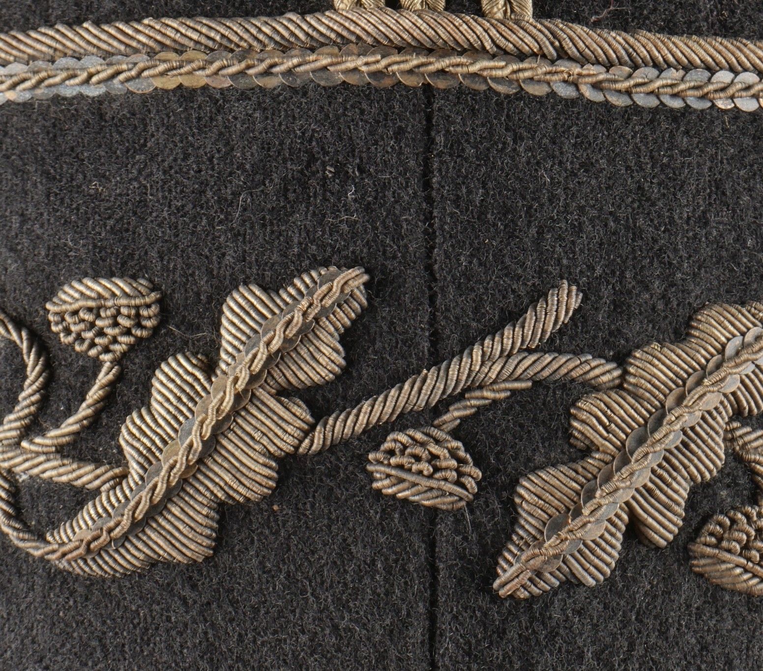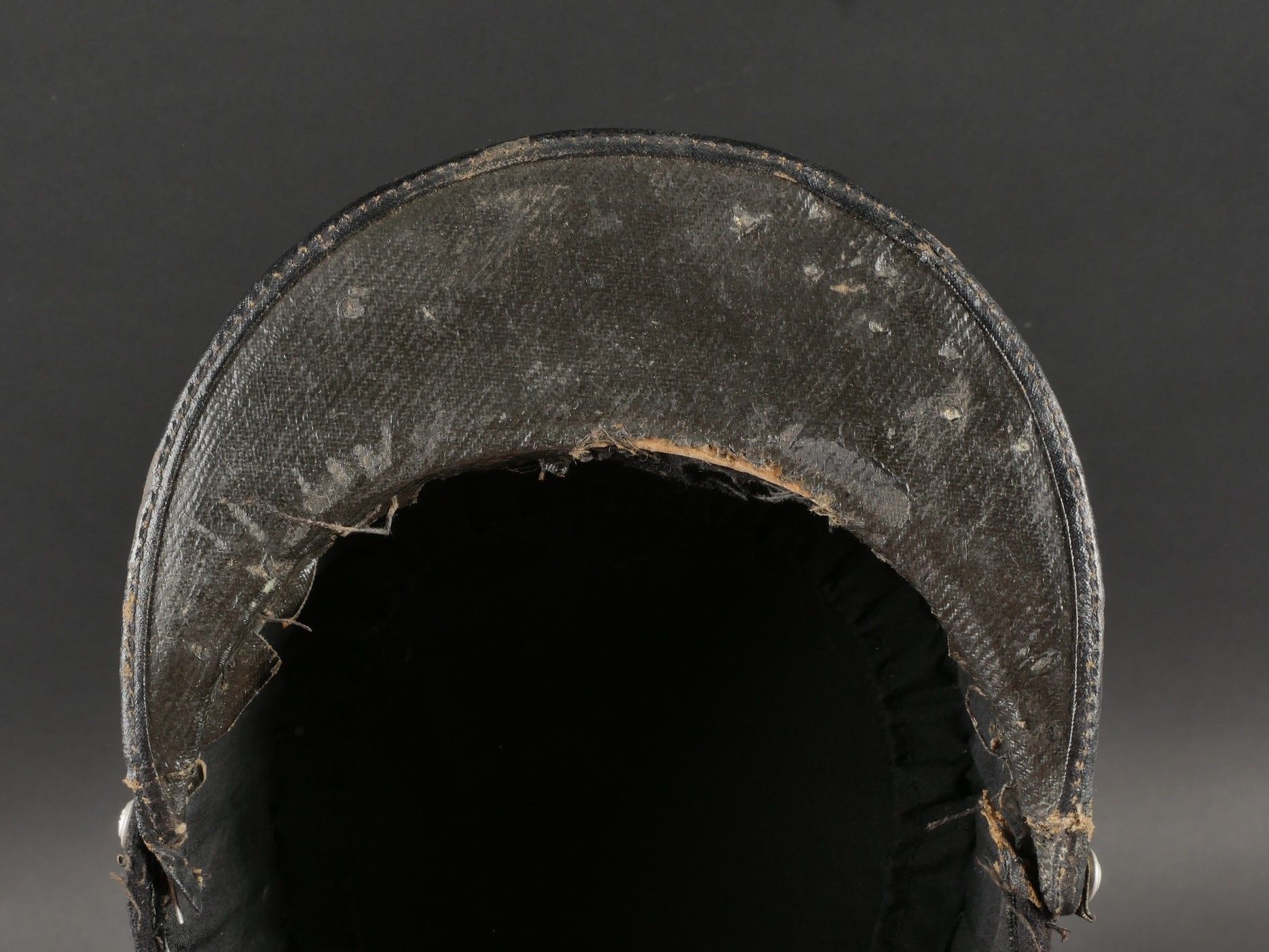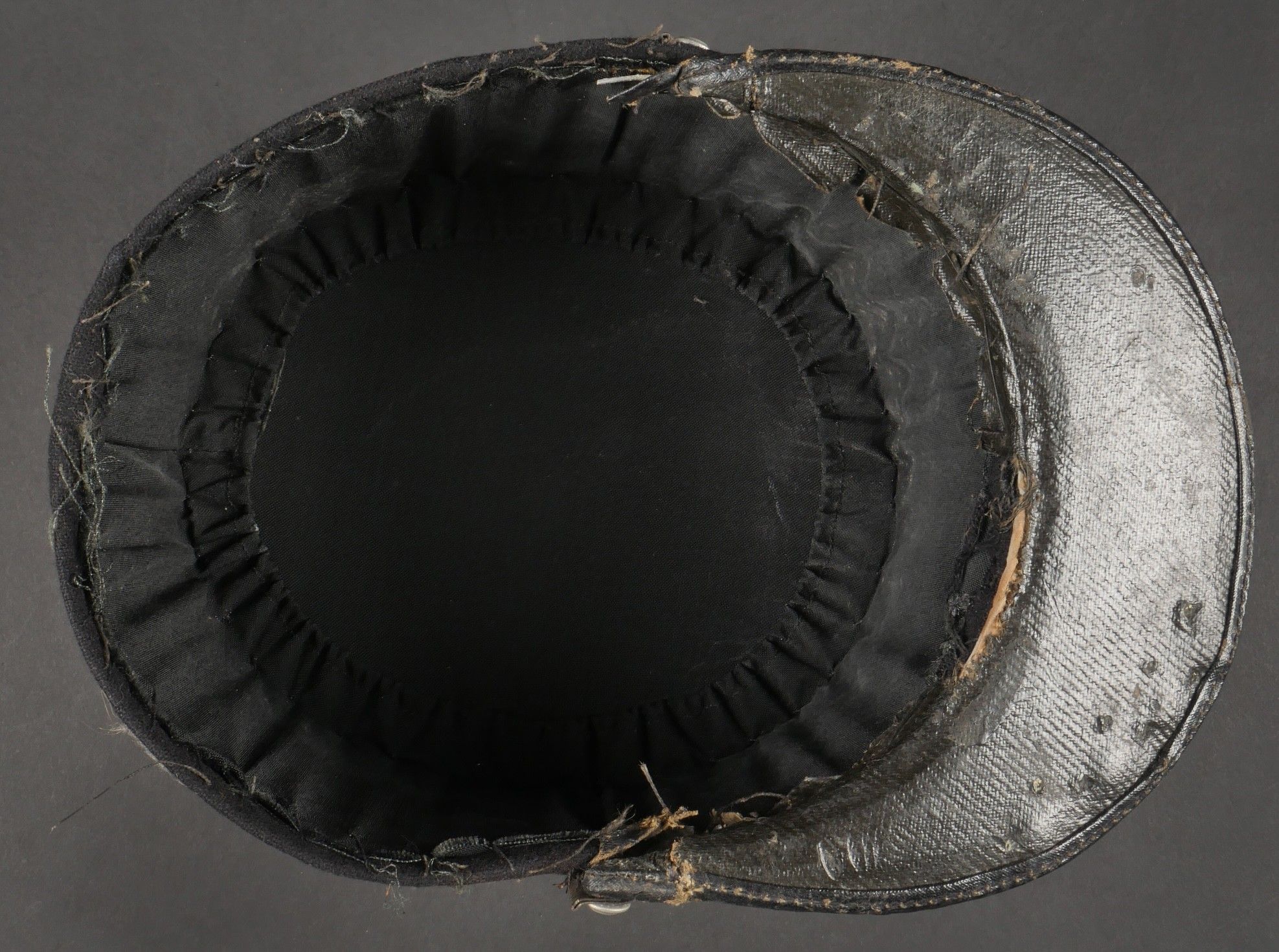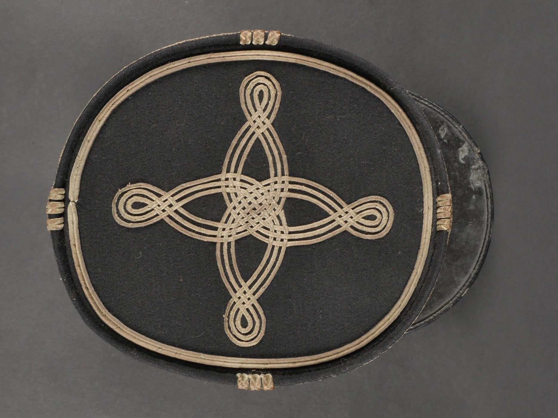 1931 police commissioner's kepi. Made of black cloth, braid and embroidery and silver trimmings with a single row of oak leaves. Three-strand Hungarian knot, small RF-stamped buttons. Leather visor with damaged leather rim at the end of the left side, leather headband missing. Képi 1931 police commissioner Made of black wool cloth with silver braid embroidery and trim forming a single row of oak leaves. Threestrand Hungarian knot small buttons stamped RF. Leather visor with leather edge damaged on the left tip missing leather sweatband.