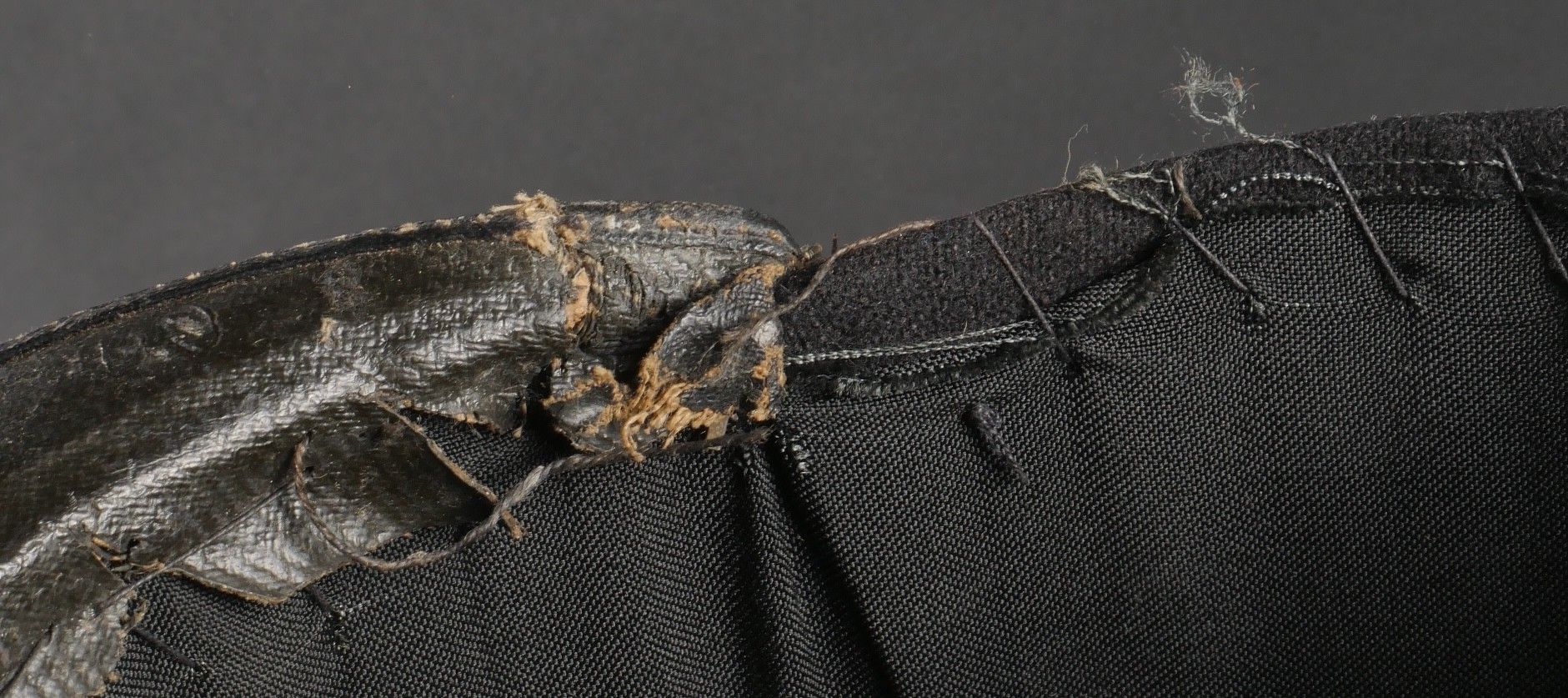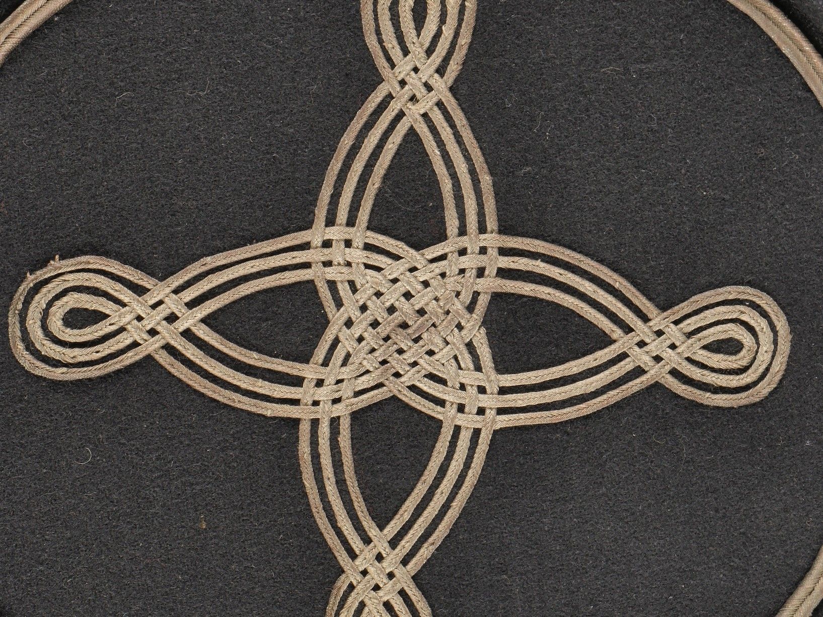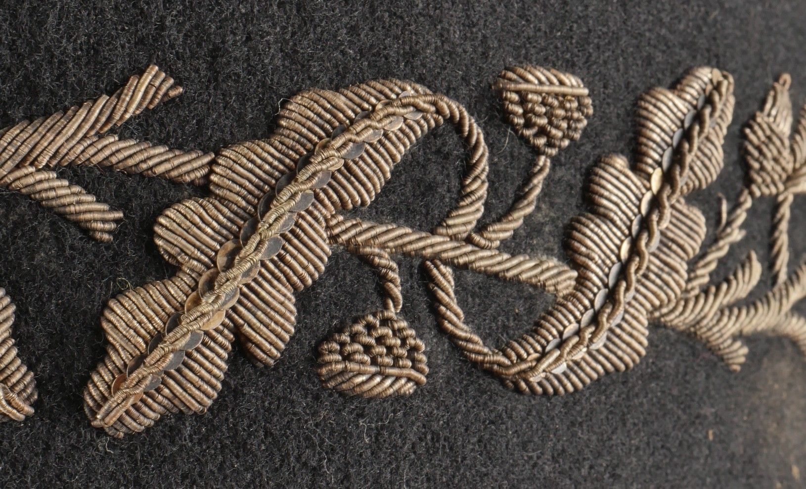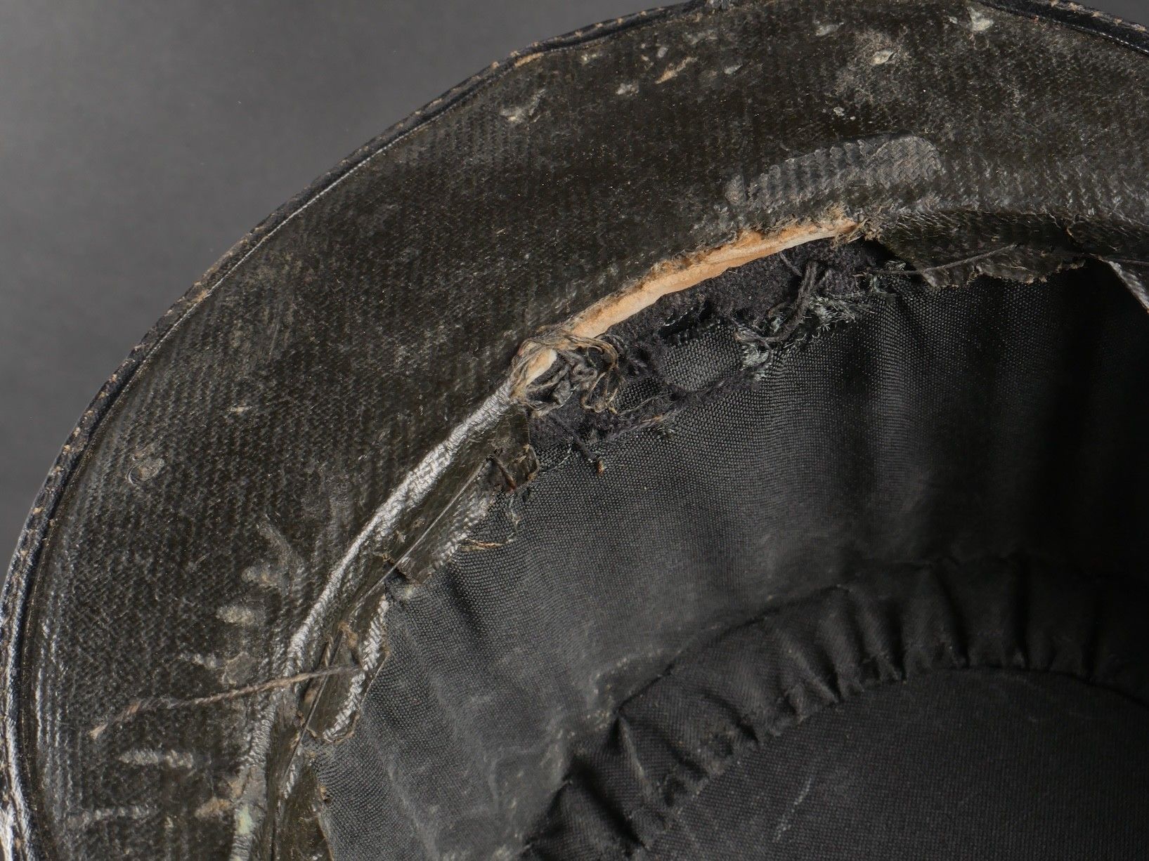1931 police commissioner's kepi. Made of black cloth, braid and embroidery and silver trimmings with a single row of oak leaves. Three-strand Hungarian knot, small RF-stamped buttons. Leather visor with damaged leather rim at the end of the left side, leather headband missing. Képi 1931 police commissioner Made of black wool cloth with silver braid embroidery and trim forming a single row of oak leaves. Threestrand Hungarian knot small buttons stamped RF. Leather visor with leather edge damaged on the left tip missing leather sweatband.