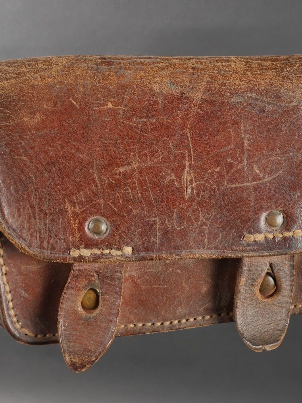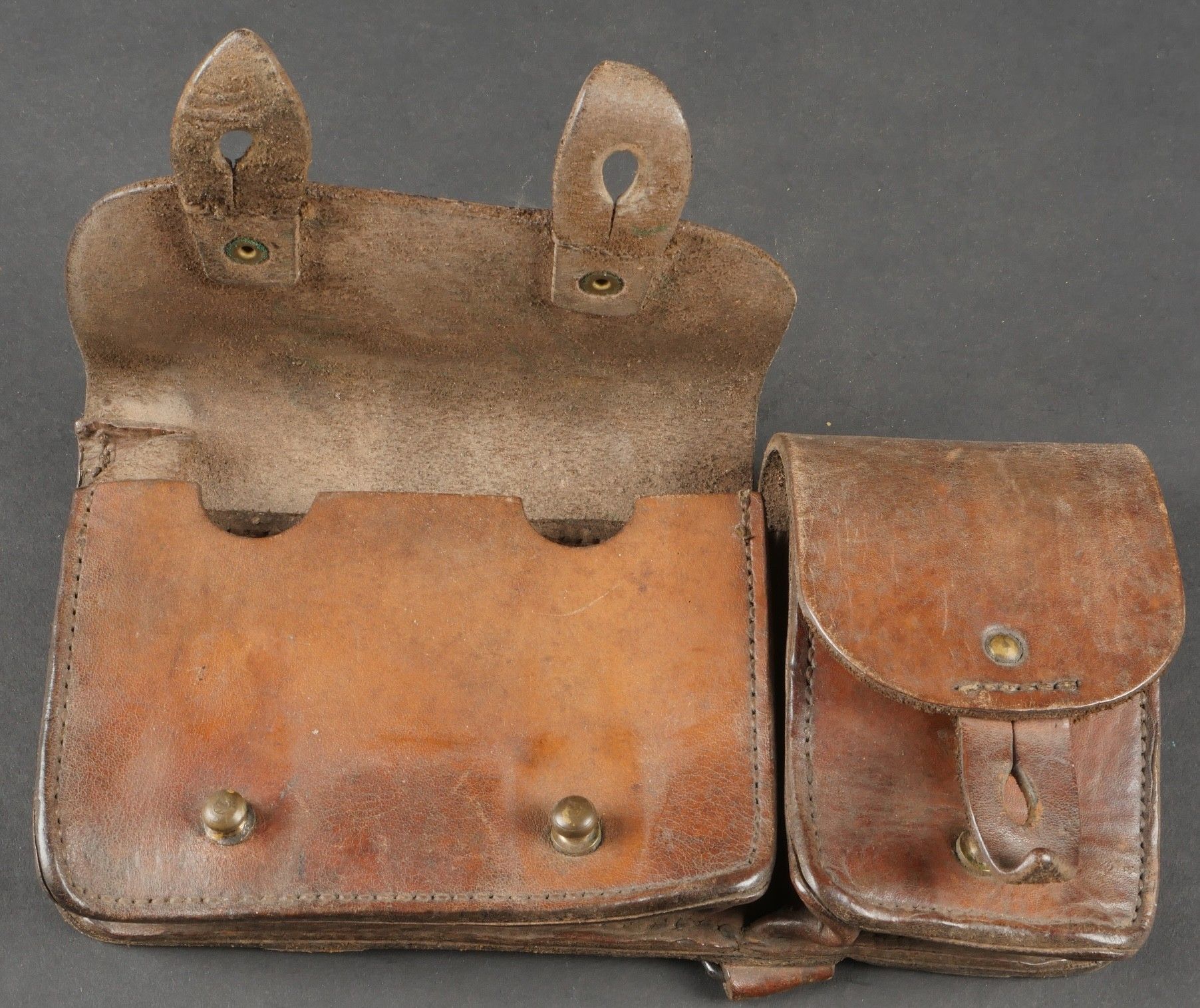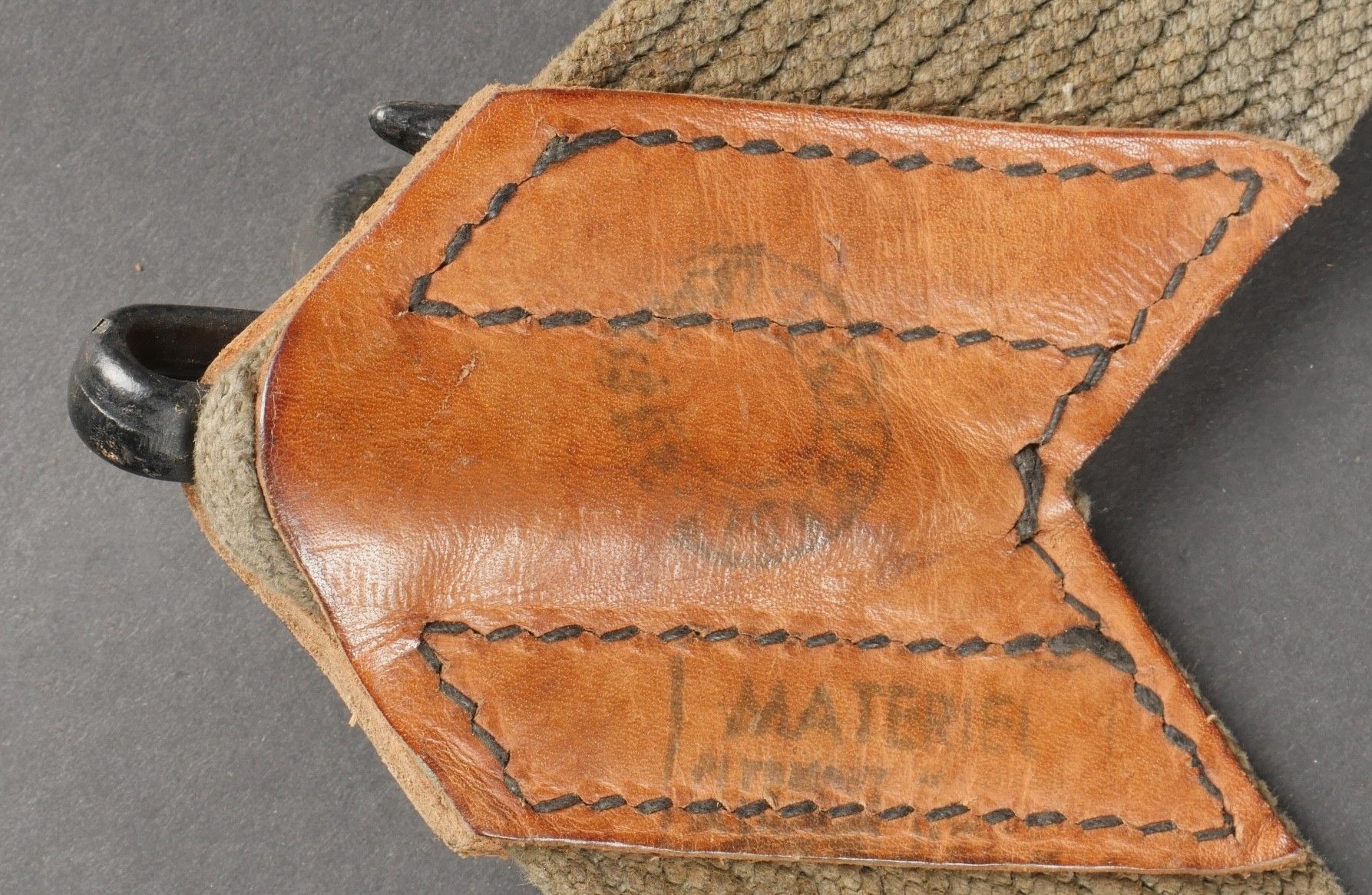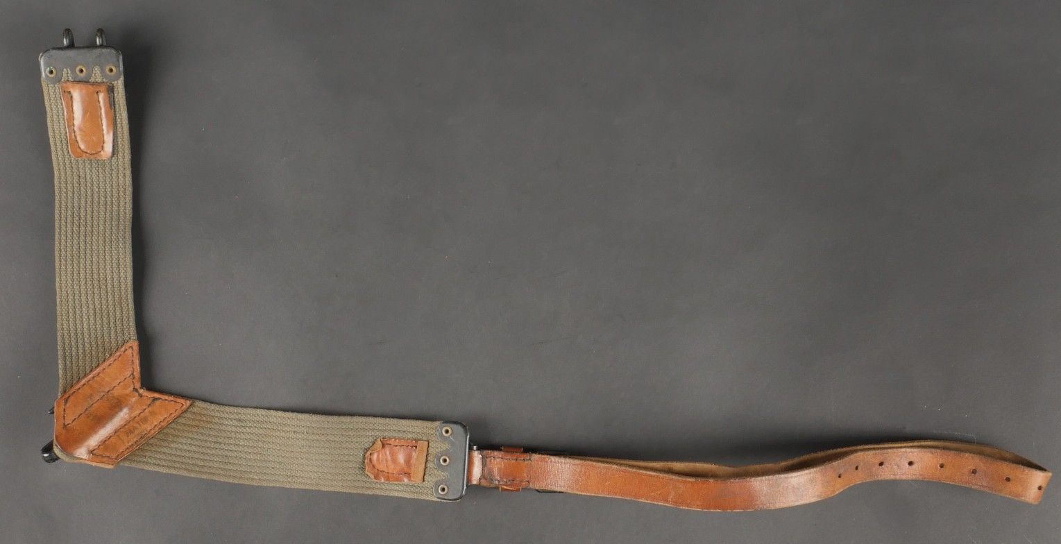 Lot of France 40 equipment. A pair of leather cartridge belts model 193537, right side illegibly marked, small original sewn holding tab, left side illegibly marked, complete with nipple. A 1903 belt dated 1930, one loop missing. A mortar base plate carrying system model 192731 81mm. A mortar level in its case. A 2429 case with oil cruet and two pin chasers. Lot of France 40 equipment A pair of leather cartridge pouches model 193537 right side with illegible marking small original retaining strap left side with illegible marking complete with stud. A 1903 belt dated 1930 with one loop missing. A base plate carrying system for 81 mm mortar model 192731 a mortar sight level in its case and a 2429 maintenance kit pouch with oil bottle and two pin punches.
